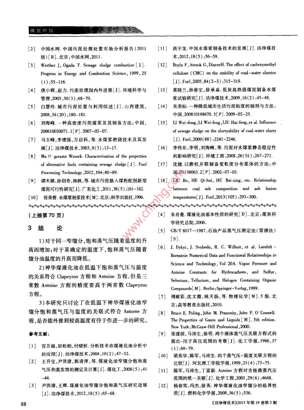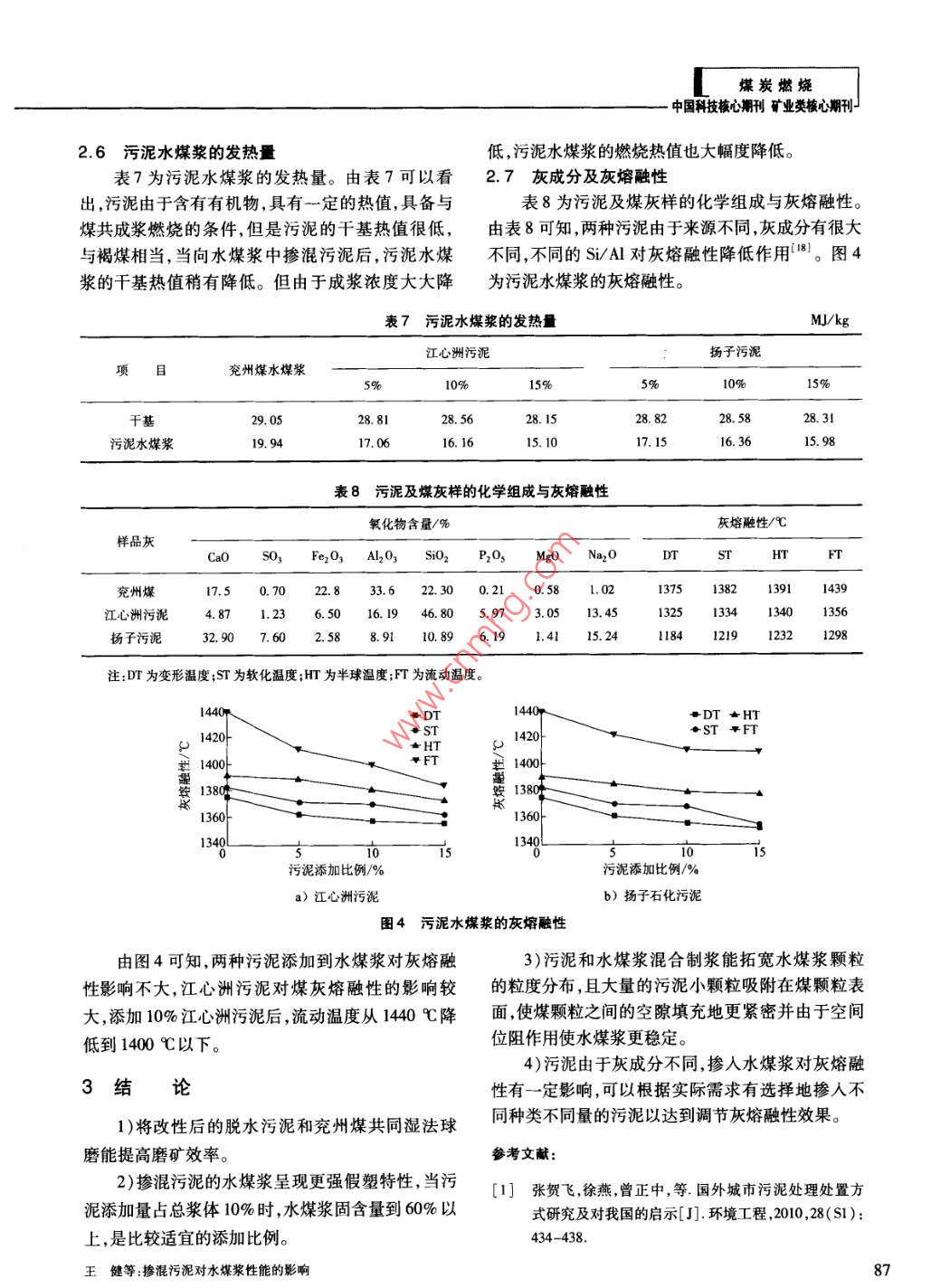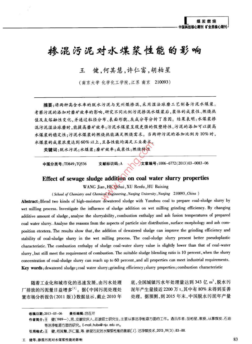 煤炭燃燒中國科技核心期刊礦業(yè)類核心期刊摻混污泥對(duì)水煤漿性能的影響王健,何其慧,許仁富,胡柏星(南京大學(xué)化學(xué)化工學(xué)院,江蘇南京210093)摘要:將兩種高含水率的脫水污泥與兗州煤摻混,采用濕法球磨工藝制備污泥水煤漿??疾煳勰嗟奶砑訉?duì)磨礦效率的影響,研究不同比例污泥摻混水煤漿后,漿體的成漿性、燃燒熱值及灰熔融性變化,并通過粒徑分布、表面形貌、灰成分等分析了原因。結(jié)果表明:水煤漿摻混污泥濕法球磨時(shí),能提高磨礦效率;污泥水煤漿呈現(xiàn)更強(qiáng)的假塑特性,污泥的添加可以提高水煤漿的穩(wěn)定性;污泥水煤漿的燃燒熱能滿足燃燒需求。當(dāng)兩種污泥的添加比例為10%時(shí),水煤漿的成漿濃度達(dá)到60%以上,且各性能均滿足工業(yè)要求關(guān)鍵詞:脫水污泥;水煤漿;磨礦效率;成漿性;燃燒特性中圖分類號(hào):TD849;TQ536文獻(xiàn)標(biāo)識(shí)碼:A文章編號(hào):1006-6772(2013)03-0083-06Effect of sewage sludge addition on coal water slurry propertiesWANG Jian, HE Qihui, XU Renfu, HU BaixingSchool of Chemistry and Chemical Engineering, Nanjing University, Nanying 210093, ChinaAbstract: Blend two kinds of high-moisture dewatered sludge with Yanzhou coal to prepare coal-sludge slurry bywet milling process. Investigate the influence of sludge addition on wet milling grinding efficiency. By changingadditive amount of sludge, analyse the slurryability, combustion enthalpy and ash fusion temperatures of preparedcoal water slurry. Analyse the reasons from the aspects of particle size distribution, surface morphology and ash com-position etcetera. The results show that, the addition of dewatered sludge can improve the grinding efficiency andstability of coal-sludge slurry in the wet milling process. The coal-sludge slurry present better pseudoplasticcharacteristic. The combustion enthalpy of sludge coal-water slurry value is slightly lower than that of coal-waterslurry, but still meet the requirement of combustion. The suitable sludge blending ratio is 10 percent, when the slurryconcentration of coal-sludge slurry can reach up to 60 percent, and all properties can meet industrial requirementsKey words: dewatered sludge; coal water slurry; grinding efficiency; slurry properties; combustion characteristic隨著工業(yè)化和城市化的迅速發(fā)展,由污水處理底,全國城鎮(zhèn)污水年處理量達(dá)到343億m3,脫水污廠排放的污泥量日益增多。據(jù)《中國污泥處理處泥年產(chǎn)生量接近2200萬t,其中有80%未得到妥善置市場(chǎng)分析報(bào)告(201版)》數(shù)據(jù)顯示,截止2010年處理。據(jù)預(yù)測(cè),到2015年末中國脫水污泥年產(chǎn)量收稿日期:2013-05-06責(zé)任編輯:宮在芹作者簡(jiǎn)介:王健(1989—),男,安徽安慶人,在讀碩士硏究生,主要從事潔凈能源方面的工作。通訊作者:胡柏星教授,從事煤炭、石油等潔凈能源方面的研究。Emil:hubx@nu. edu cn。引用格式:王健何其慧許仁富等擲彩污泥對(duì)水煤漿性能的影響[J潔凈煤技術(shù),2013,9(3):83-88王健等:摻混污泥對(duì)水煤漿性能的影響3將超過2600萬t2。污泥富集了污水中的污染物,證一定的燃燒熱值,滿足工業(yè)應(yīng)用的需求2含有大量的氮、磷等營養(yǎng)物質(zhì)及有機(jī)物、病毒微生本文研究了兩種具有代表性的脫水污泥與兗物、寄生蟲卵、重金屬等有毒有害物質(zhì),若不經(jīng)有效州煤摻混的成漿性,考察了污泥的添加對(duì)濕法球磨處理,將對(duì)環(huán)境產(chǎn)生嚴(yán)重危害。但污泥處理設(shè)施工藝磨礦效率的影響探討了添加不同比例污泥后建設(shè)嚴(yán)重滯后。常用的污泥處理方法有填埋、積肥水煤漿的成漿濃度、流變性及穩(wěn)定性的變化,測(cè)試和焚燒等,也有制肥、制作建筑材料、制混凝土輕質(zhì)了脫水污泥添加水煤漿后熱值及灰熔融性的變化。粒料及加入煤中摻混,利用成熟的氣流床氣化技術(shù)實(shí)現(xiàn)污泥與煤的共氣化等示范項(xiàng)目481。改善污泥1實(shí)驗(yàn)部分的流動(dòng)性,將其摻入水煤漿中,利用目前成熟的水1.1煤和污泥樣品煤漿制備、燃燒和氣化工藝,制備和使用污泥水煤實(shí)驗(yàn)用煤為兗州煤,脫水污泥采用2種具有代漿現(xiàn)已具備可行性9。表性的污泥——生活污水污泥和石化企業(yè)污泥,分水煤漿技術(shù)是20世紀(jì)70年代末發(fā)展起來的新別取自南京江心洲污水處理廠和揚(yáng)子石化污水處型煤基液態(tài)燃料,它在制備、燃燒、儲(chǔ)存、運(yùn)輸及污理廠。表1為煤和污泥的工業(yè)分析和元素分析(干染控制等方面有明顯優(yōu)勢(shì)10作為一種特殊的基)。由表1可以看出,實(shí)驗(yàn)采用的脫水污泥的含水煤漿,污泥水煤漿需具備良好的流動(dòng)性和穩(wěn)定水率仍很高,高達(dá)80%以上,污泥的灰分很高,而固性,以適應(yīng)水煤漿的生產(chǎn)、運(yùn)輸、貯存、燃燒和氣化定碳很低,兩種污泥均具有一定的熱值,因此可以等。同時(shí),污泥水煤漿的固含量要盡可能高,以保與煤摻混制漿以利用其熱量。表1煤和污泥的工業(yè)分析及元素分析工業(yè)分析/%元素分析%Qd/樣品H4)Na))a(0)(M·kg-1)兗州煤3.27.3558.6068.852.350.666610.12江心洲污泥84.58.4635.536.016.54揚(yáng)子污泥81.2043.4645.8410.701.9120.0212.891.2水煤漿樣品的制備1.3水煤漿的性能測(cè)試實(shí)驗(yàn)釆用萘磺酸鹽甲醛縮合物類(NSF,實(shí)驗(yàn)室漿體的粒徑分布,采用 Master sizer2000激光自制)分散劑,其用量為煤干基