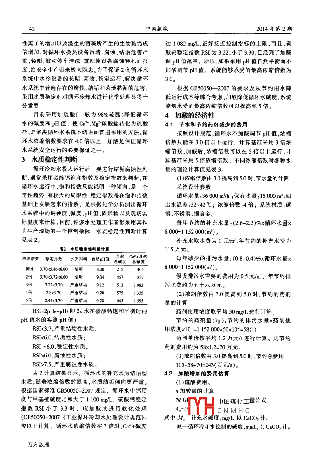 第2期中國(guó)氯堿No. 22014年2月China Chlor-AlkaliFeb,201441提高循環(huán)水濃縮倍數(shù)的方法史麗杰(內(nèi)蒙古億利化學(xué)工業(yè)有限公司,內(nèi)蒙古鄂爾多斯014300)摘要:內(nèi)蒙古億利化學(xué)工業(yè)有限公司循環(huán)水補(bǔ)充水水質(zhì)硬度、堿度高,在自然pH值運(yùn)行下,循環(huán)水濃縮倍數(shù)最高只能控制在2倍,為了節(jié)省水資源,該公司采用加硫酸調(diào)節(jié)循環(huán)水pH值的方法降低循環(huán)水堿度來(lái)提高循環(huán)水濃縮倍數(shù)。關(guān)鍵詞:循環(huán)水;堿度;濃縮倍數(shù);加硫酸中圖分類(lèi)號(hào):TQ085文獻(xiàn)標(biāo)識(shí)碼:B文章編號(hào):1009-1785(2014)02-0041-03Adding acid to improve the cyclesof concentration of circulating waterSHi Li-Jie(Inner Mongolia ELION Chemical Industry Co Ltd, Erdos 014300, China)Abstract: The circulating water to add water hardness and alkalinity is high in Inner Mongolia ELIONChemical Industry Co Ltd, in the natural ph value of operation, the cycles of concentration of circulatingwater can only be controlled at about 2 times, so it is necessary to reduce the circulating water alkalinity toimprove cycles of concentration of circulating water to save water resourcesKey words: circulating water, alkalinity, cycles of concentration; adding acid1循環(huán)水系統(tǒng)概況表1循環(huán)水水質(zhì)數(shù)據(jù)(不加酸)取樣時(shí)間:2011-12-24內(nèi)蒙古億利化學(xué)工業(yè)有限公司40萬(wàn) ta Pvc和單位36萬(wàn)ta燒堿,生產(chǎn)線配備2套獨(dú)立敞開(kāi)式循環(huán)冷項(xiàng)目補(bǔ)充水卻水系統(tǒng),總循環(huán)水量為36000m沿h,系統(tǒng)保有水電導(dǎo)率1173.2量約為一萬(wàn)八千立方米。其中Ⅰ#循環(huán)系統(tǒng)循環(huán)水NTU2.39量25500m3h,系統(tǒng)保有水量約為一萬(wàn)二千八百立6.03方米;Ⅱ循環(huán)系統(tǒng)循環(huán)水量為10500m/h,系統(tǒng)保有總堿度水量約為五千二百立方米。由于該公司循環(huán)水補(bǔ)水總硬度水源為黃河滲水,水質(zhì)(見(jiàn)表1)屬于高硬度和高堿度水質(zhì),鈣硬度大于180mg/L,總堿度大于200mg/L。這類(lèi)高硬度和高堿度水質(zhì)如果采用自然pH值運(yùn)行TFe工藝,循環(huán)水的濃縮倍數(shù)最高只能控制為2倍。2循環(huán)水加酸的必要性總磷中國(guó)煤化工未檢出如果提髙循環(huán)水濃縮倍數(shù),由于循環(huán)水堿度、硬YH度高,將導(dǎo)致水中成垢物質(zhì)沉積,水中溶解氧和腐蝕說(shuō)明:Ca2CNMHG磷、正磷、有機(jī)膦均以作者簡(jiǎn)介史麗杰,女,工程師現(xiàn)擔(dān)任內(nèi)蒙古億利化學(xué)工業(yè)有限公司聚氯乙烯廠工藝組組長(zhǎng)。中國(guó)氟堿2014年第2期性離子的增加以及滋生的菌藻所產(chǎn)生的生物黏泥成達(dá)1082mg,正好接近控制指標(biāo)的上限,而且,碳倍增加,對(duì)循環(huán)水換熱設(shè)備污堵、腐蝕、結(jié)垢危害嚴(yán)酸鈣穩(wěn)定指數(shù)RSI為322,小于330,已經(jīng)到了加酸重輕則被動(dòng)停車(chē)清洗,重則使設(shè)備腐蝕穿孔而報(bào)調(diào)pH值范圍。所以,如果采用pH值自然平衡而不廢,給安全生產(chǎn)帶來(lái)極大隱患。為了保證2套循環(huán)水加酸調(diào)節(jié)pH值,系統(tǒng)能夠承受的最高濃縮倍數(shù)為系統(tǒng)中水冷設(shè)備的長(zhǎng)期、高效、穩(wěn)定運(yùn)行,解決循環(huán)水系統(tǒng)中普遍存在的腐蝕、結(jié)垢和菌藻黏泥的危害,根據(jù)GB500502007的要求及從節(jié)約用水降釆用水質(zhì)穩(wěn)定劑對(duì)循環(huán)冷卻水進(jìn)行化學(xué)處理顯得十低運(yùn)行成本等綜合考慮,加酸降低循環(huán)水堿度,系統(tǒng)分重要。能夠承受的最高濃縮倍數(shù)可以提高到5倍。目前采用加硫酸(一般為98%硫酸)降低循環(huán)4加酸的經(jīng)濟(jì)性水的堿度和pH值、使Ca2、Mg2碳酸鹽轉(zhuǎn)化為硫酸41節(jié)水和節(jié)約藥劑減少的費(fèi)用鹽,是解決循環(huán)水系統(tǒng)不結(jié)垢而普遍采用的方法。循按照設(shè)計(jì)規(guī)范,循環(huán)水不加酸調(diào)節(jié)pH值,濃縮環(huán)水濃縮倍數(shù)要求在40倍以上,加酸是保證循環(huán)倍數(shù)只能在30倍以下運(yùn)行,計(jì)算基準(zhǔn)采用3倍濃水系統(tǒng)安全運(yùn)行的必要保證之縮倍數(shù),加酸后,濃縮倍數(shù)可以在5倍以上運(yùn)行,計(jì)3水質(zhì)穩(wěn)定性判斷算基準(zhǔn)采用5倍濃縮倍數(shù)。不同濃縮倍數(shù)時(shí)各種水循環(huán)冷卻水投入運(yùn)行后,要進(jìn)行結(jié)垢腐蝕性判量的理論計(jì)算值見(jiàn)表3斷,通常采用碳酸鈣飽和指數(shù)及穩(wěn)定指數(shù)來(lái)判斷。在(1)濃縮倍數(shù)由30提高到50時(shí),節(jié)水量的計(jì)算循環(huán)水運(yùn)行中,飽和指數(shù)只能說(shuō)明一種傾向,是一個(gè)系統(tǒng)設(shè)計(jì)參數(shù)定性趨勢(shì),有較大的局限性;穩(wěn)定指數(shù)是在飽和指數(shù)循環(huán)水量:36000mh;保有水量:15000m3;回基礎(chǔ)上發(fā)展起來(lái)的指數(shù),是根據(jù)化學(xué)分析測(cè)出循環(huán)出水溫差:32-42℃;濃縮倍數(shù):4倍;系統(tǒng)材質(zhì):碳水系統(tǒng)中的鈣硬度、堿度、pH值、固形物以及現(xiàn)場(chǎng)實(shí)鋼、不銹鋼銅合金際溫度來(lái)計(jì)算。目前,許多水處理工作者都采用其作每年節(jié)約的補(bǔ)充水量:(2.6-22)%x循環(huán)水量為生產(chǎn)現(xiàn)場(chǎng)的一個(gè)控制