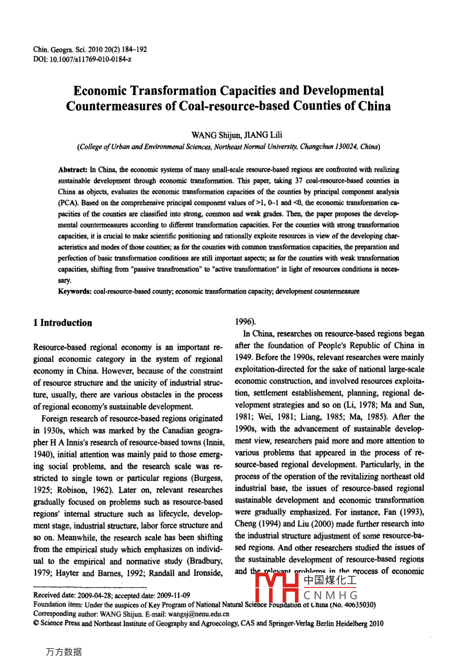 Chin Geogra. Sci. 2010 20(2)184-192DOL:101007/sl17690100184-zEconomic Transformation Capacities and DevelopmentalCountermeasures of Coal-resource-based Counties of ChinaWANG Shijun, JIANG LiliCollege of Urban and Environmenal Sciences, Northeast Normal University, Changchun 130024, China)Abstract: In China, the economic systems of many small-scale resource-based regions are confronted with realizingsustainable development through economic transformation. This paper, taking 37 coal-resource -based counties inChina as objects, evaluates the economic transformation capacities of the counties by principal component analysis(PCA). Based on the comprehensive principal component values of >l, 0-1 and <0, the economic transformation ca-pacities of the counties are classified into strong, common and weak grades. Then, the paper proposes the develop-mental countermeasures according to different transformation capacities. For the counties with strong transformationcapacities, it is crucial to make scientific positioning and rationally exploite resources in view of the developing characteristics and modes of those counties; as for the counties with common transformation capacities, the preparation andperfection of basic transformation conditions are still important aspects; as for the counties with weak transformationcapacities, shifting from"passive transfromation "to"active transformation"in light of resources conditions is neces-Keywords: coal-resource-based county; economic transformation capacity; development countermeasure1 Introduction1996In China, researches on resource-based regions beganResource-based regional economy is an important re- after the foundation of People's Republic of China ingional economic category in the system of regional 1949. Before the 1990s, relevant researches were mainlyeconomy in China. However, because of the constraint exploitation-directed for the sake of national large-scaleof resource structure and the unicity of industrial struc- economic construction, and involved resources exploitature,usually, there are various obstacles in the process tion, settlement establishement, planning, regional de-of regional economy' s sustainable development.velopment strategies and so on ( li, 1978; Ma and Sun,Foreign research of resource-based regions originated 1981; Wei, 1981; Liang, 1985; Ma, 1985 ).After thein 1930s, which was marked by the Canadian geogra- 1990s, with the advancement of sustainable develop-pher H A Innis's research of resource-based towns(Innis, ment view, researchers paid more and more attention to1940), initial attention was mainly paid to those emerg. various problems that appeared in the process of re-g social problems, and the research scale was re- source-based regional development. Particularly, in thestricted to single town or particular regions(Burgess, process of the operation of the revitalizing northeast1925: Robison, 1962). Later on, relevant researches industrial base, the issues of resource-based regionalgradually focused on problems such as resource-based sustainable development and economic transformationregions'internal structure such as lifecycle, develop- were gradually emphasized. For instance, Fan(1993),ment stage, industrial structure, labor force structure and Cheng(1994)and Liu(2000)made further research intoso on. Meanwhile, the research scale has been shifting the industrial structure adjustment of some resource-ba-from the empirical study which emphasizes on individ- sed regions. And other researchers studied the issues ofual to the empirical and normative study(Bradbury, the sustainable development of resource- based regions1979; Hayter and Barnes, 1992; Randall and Ironside, andleme in the nrocess of economic中國煤化工Received date: 2009-04-28: accepted date: 2009-11-09CNMHGFoundation item: Under the auspices of Key Program of National Natural Scienceon of China(No. 40635030)orresponding author: WANG Shijun. E-mail: wangs @nenu.edu.o Science Press and Northeast Institute of Geography and Agroecology, CAS and Springer-Verlag Berlin Heidelberg 2010Economic Transformation Capacities and Developmental Countermeasures of Coal-resource-based Counties of China 185transformation(Shen, 1998: Shen and Cheng, 1999; exploring a scientific way of sustainable development,Zhao, 1999; Zhou, 2000; Wang, 2003; Zang et al, 2006 which will be politically, economically as well asZhang et al., 2008)cially meaningful. For that reason, this paper will probeHowever, in previous researches the objects were into the economic development countermeasures fomainly large-scale regions such as provinces and cities. coal-resource-based counties in China through evaluat.Currently in China, not only medium and large regions, ing economic transformation capacitybut also a large number of resource-based small-scaleregions are faced with the problem of resource exhausi- 2 Data Sources and Methodstion and the task of ecomomic transformation, particilarly counties.2.1 Data sourcesCoal-resource-based counties in China have common The data used in this study were taken from chinaeconomic characteristics of counties on one hand, take Country Statistical Yearbook 2006 ( Department of Ruralcoal-resource-based industry as their leading industries Serves, National Bureau of Statistics, 2006), Chinaor pillar industries on the other hand. They are charac- Statistical Yearbook for Regional Economy 2006(De-terized by unitary industry and product, agglomerated partment of Comprehensive Statistics of National Bu-industry distribution and low ecomonic benefit. viewed reau of Staistics, 2007), China City Statistical Yearbookfrom the society, the urbanization in the counties is so 2006(Department of City Serveys, National Bureau offast that the urban-rural dualistic structure is obvious, Statistics, 2000), China Mining Yearbook 2006(Edito-the problems of economy, society and environment are rial Board of China Mining Yearbook, 2007), Tabulationserious because of unreasonable 