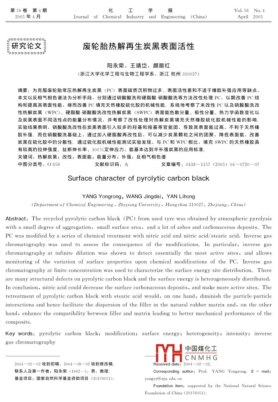 第56卷第4期化學(xué)報2005年4月Journal of Chemical Industry and Engineering ( China)ri2005研究論文廢輪胎熱解再生炭黑表面活性陽永榮,王靖岱,顏麗紅(浙江大學(xué)化學(xué)工程與生物工程學(xué)系,浙江杭州310027)摘要:為克服廢輪胎常壓熱解再生炭黑(pC)表面碳質(zhì)沉積物過多、表面活性差和不適于橡膠補(bǔ)強(qiáng)應(yīng)用等缺點本文以反相氣相色譜法為分析手段,分別通過硝酸酸洗和硬脂酸-硝酸酸洗等方法改性處理PC,以期改善PC結(jié)構(gòu)和提高其表面性能,繼而改善PC填充天然橡膠硫化膠的杋械性能.系統(tǒng)地考察了未改性PC以及硝酸酸洗改性熱解炭黑(WPC)、硬脂酸-硝酸酸洗改性熱解炭黑(swPC)表面能色散分量、極性分量、熱力學(xué)函數(shù)變化以及炭黑表面不同活性點的能量分布情況,并考察了改性處理對熱解炭黑墳充天然橡膠硫化膠機(jī)械性能旳影響實驗結(jié)果表明,硝酸酸洗改性在炭黑表面引入較多的羥基和羧基等官能團(tuán),導(dǎo)致其表面能過高,不利于天然橡膠補(bǔ)強(qiáng).而在硝酸酸洗基礎(chǔ)上,通過加入硬脂酸再改性后,可以減少炭黑顆粒之間的團(tuán)聚,降低表面能,改善炭黑在硫化膠中的分散性,通過硫化膠機(jī)械性能測試實驗發(fā)現(xiàn),與PC和wPC相比,填充swC的天然橡膠具有較高的拉伸強(qiáng)度、扯斷伸長率、300%定伸應(yīng)力,能基本達(dá)到半補(bǔ)強(qiáng)炭黑的應(yīng)用標(biāo)準(zhǔn)關(guān)鍵詞:熱解炭黑;改性;表面能;能量分布;補(bǔ)強(qiáng);反相氣相色譜中圖分類號:O658文獻(xiàn)標(biāo)識碼文章編號:0438-1157(2005)04-0720-07Surface character of pyrolytic carbon blackYANG Yongrong, WANG Jingdai, YAN Lihong(Department of Chemical Engineering, Zhejiang University, Hang chou 310027, Zhejiang, China)Abstract: The recycled pyrolytic carbon black (PC) from used tyre was obtained by atmospheric pyrolysiswith a small degree of aggregation, small surface area, and a lot of ashes and carbonaceous deposits. ThePC was modified by a series of chemical treatment with nitric acid and nitric acid/stearic acid. Inverse gase consequence OIrhromatography at infinite dilution was shown to detect essentially the most active sites, and allowsmonitoring of the variation of surface properties upon chemical modifications of the PC. Inverse gaschromatography at finite concentration was used to characterize the surface energy site distribution. Thereare many structural defects on pyrolytic carbon black and the surface energy is heterogeneously distributedIn conclusion, nitric acid could decrease the surface carbonaceous deposits, and make more active sites. thetreatment of pyrolytic carbon black with stearic acid would, on one hand, diminish the particle-particleinteractions and hence facilitate the dispersion of the filler in the natural rubber matrix and, on the otherhand, enhance the compatibility between filler and matrix leading to better mechanical performance of thecompositeKey words pyrolytic carbon black; modification; surface energy; heterogeneity; intensity; inversegas chromatograp中國煤化工CNMHG2004—02—02收到初稿,2004-08-02收到修改稿聯(lián)系人及第一作者:陽永榮(1962—),男,教Corresponding author: Prof. YANG Yongrong. E基金項目:國家自然科學(xué)基金資助項目(20176051)yangyiFoundation item: supported by the National NaturalFoundation of China(20176051)第4期陽永榮等:廢輪胎熱解再生炭黑表面活性721引言將30g常壓熱解炭黑與600ml硝酸溶液(25%mass)混合,在不斷攪拌的條件下,升溫至廢輪胎的利用越來越受到各國的關(guān)注,因為廢343K,恒溫2h.冷卻至室溫,水洗至濾液pH值輪胎是世界上最大的固體廢物來源之一,而廢輪胎≥5,將濾餅于378K下干燥至恒重?zé)峤馓幚砟軌驅(qū)崿F(xiàn)能源的最大回收和有價值產(chǎn)品的(2)硬脂酸-硝酸酸洗改性常壓熱解炭黑充分再利用,具有較高的經(jīng)濟(jì)效益和環(huán)境效益,它(SwPC)的制備代表了當(dāng)今廢舊輪胎處理的發(fā)展方向,但是熱解炭將2.5g硬脂酸溶于15ml的丙酮溶液中后,加黑由于表面碳質(zhì)沉積物過多,表面活性差的缺點,入100g預(yù)先在378K下干燥過的上述硝酸酸洗炭黑,使熱解炭黑的實際應(yīng)用受到很大限制.因此,研究不斷攪拌,在室溫下靜置24h,并于378K下干燥至者希望能以較低的成本改性熱解炭黑,使其性能與恒重.實驗中所用的三種炭黑性質(zhì)如表1所示商用炭黑相當(dāng),或使某些性能更優(yōu),或發(fā)現(xiàn)新的高Table 1 Character of three carbon black附加值,就可以使再生資源物盡其用,發(fā)揮最大的CarbonBETDBP×10-5lodine numbe再生價值.這一問題已經(jīng)引起了國內(nèi)外同行的極大/g·kg-1關(guān)注,并相應(yīng)開展了大量的研究工作100WPO42.85炭黑的表面活性通過與橡膠的物理化學(xué)作用影SWPC45.67響橡膠補(bǔ)強(qiáng),繼而影響到橡膠產(chǎn)品的彈性模量、拉伸強(qiáng)度和摩擦特性等.因此,對熱解炭黑表面活性Table 2 Character of differential probes的研究,特別是對其表面能以及熱解炭黑與橡膠分Boiling point Surface area Donor Acceptor(DN(AN)子相互作用時表面能變化的研究尤為重要.Darmpentanestadt等利用ESCA(電子光譜化學(xué)分析)和39n-heptane371.40.43SIMS(二次離子質(zhì)譜儀)考察了炭黑的表面化學(xué)-octane結(jié)構(gòu),發(fā)現(xiàn)廢輪胎裂解炭黑表面上沉積有碳質(zhì)沉積CHCI30.2822.6物,覆蓋了一定數(shù)量的表面活性位,影響了裂解炭350.117.1黑作為橡膠補(bǔ)強(qiáng)炭黑的使用性能. Shouli等利1.2探針分子用SAXS(小角Xray衍射),
