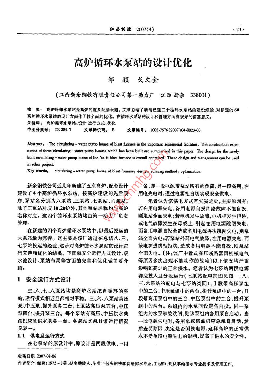 江西能縹2007(4)23高爐循環(huán)水泵站的設計優(yōu)化鄒穎戈文金(江西新余鋼鐵有限責任公司第一動力廠江西新余338001)摘要:高爐冷卻水泵站是高爐的重要配套設施。文章總結了新鋼已建三個循環(huán)水泵站的建設經(jīng)驗,對新建的6#高爐循環(huán)水泵站的設計方面作了較全面的優(yōu)化。在循環(huán)水泵站的設計和管理方面有很好的借鑒意義關鍵詞:高爐循環(huán)水泵站;設計運行方式;優(yōu)化中圖分類號:T284.7文獻標識碼:B文章編號:10057676(200)040303Abstract: The circulating-water pump house of blast fumace is the important accessorial facilities. The construction expe-rience of three circulating- water pump houses which has been built are summarized in this paper. The design for the newlybuilt circulating-water pump house of the No, 6 blast fumace is overall optimized. These design and management can be usedKey words: circulating-water pump house of blast fumace: desigthod; optimization新余鋼鐵公司近幾年新建了五座高爐配套設計備即一段電源帶泵站所有的負荷另一段備用,在建設了4個高爐循環(huán)水泵站。按高爐建設的先后順用電失電時,通過電源柜自切實現(xiàn)安全供電。序泵站名分別為八泵站、三泵站、七泵站、六泵站。筆者認為該供電方式有欠妥之處,主要原因有除了三泵站對應1#2#爐外,其他泵站名稱均與高爐若在用電源失電備用電源自投回路故障不能自投,名稱對應。這四個循環(huán)水泵站均由第一動力廠負責則泵站全面失電;若電機發(fā)生故障電機柜發(fā)生拒跳,管理或電氣故障發(fā)生在母線上,引起在用電源跳閘失電在新建的四個高爐循環(huán)水泵站中以最后投運的而備用電源自投會造成備用電源再次跳閘失電則泵六泵站最為完善。這主要是該廠通過在總結八站全面失電;若泵站外部電氣故障,在用電源失電,而七泵站投運的經(jīng)驗,逐步對高爐循環(huán)水泵站的設計進該電源進線柜拒跳,造成備用電源不能自投,則泵站行完善和優(yōu)化的結果。下面就安全運行方式設計、吸全面失電?!沧?該廠中置式高壓斷路器因機械電氣水池設計、泵站布局等方面的完善和優(yōu)化做簡要介等原因多次出現(xiàn)不能動作的故障〕以上情況均嚴重紹影響到高爐的正常供水。筆者認為七泵站兩段電源1安全運行方式設計都應投入且分段運行(七泵站配電簡圖見圖一,八、三、六泵站的配電與七泵站類同),I段帶高壓泵組三、六、七、八泵站均是高爐水系統(tǒng)自循環(huán)的泵中的二臺,中壓泵組中的兩臺提升泵組中的一臺;Ⅱ站,運行模式相近且都相對平穩(wěn)。三六、八泵站高壓段帶高壓泵組中的三臺,中壓泵組中的二臺,提升泵泵、中壓泵、提升泵各三臺,七泵站高壓泵五臺、中壓組中的兩臺。泵組內(nèi)的水泵間設定備自投。同一泵泵四臺、提升泵三臺。每個泵站有高壓、中壓供水柴組內(nèi)的水泵事故跳閘則該泵組內(nèi)備用泵自啟動。當油機應急供水泵各一臺。各泵站水泵日常運行情況一段電源失電時,備用泵或柴油機應急泵自啟動,然見表一。后查明原因決定是否倒換電源這樣高爐的正常供1.1供電及運行方式水不受單段電源失電的影響提高了供水的安全性。在七泵站的原設計中,原設計是兩段供電,一用收稿日期:20070806作者簡介:鄒穎(1972-)男湖南醴陵人,畢業(yè)于包頭鋼鐵學院給排水專業(yè),工程師現(xiàn)從事給排水專業(yè)技術及管理工作24江西能縹2007(4)研究探討2柴油機應急泵的運行方式進水,熱水由提升泵送冷卻塔回冷水池,熱水無法直接進入冷水池。若發(fā)生大面積停電,外部補充水供給在泵站的原設計中,柴油機應急泵啟動是在兩段不上,高爐雖有水塔和柴油機應急泵供水,但如果恢電源失電的情況下自啟動,為高爐提供保安用水。筆復供電的時間過長,則可能發(fā)生的情況是:高爐循環(huán)者認為宜根據(jù)每段電源所帶水泵臺數(shù)決定柴油機應水泵站從冷水池經(jīng)柴油機應急泵送出去的水從高爐急泵的啟動方式,即對八、三、六泵站而言高〔中〕壓回到熱水池不斷的溢出外排,外部又無大量的補水,柴油機應急泵的失電自啟動應與帶兩臺高[中〕壓電冷水池的水位急劇下降,造成最終的停泵。且在恢復機泵的電源進線柜實現(xiàn)失電連鎖啟動,當帶兩臺高壓供電后又不能迅速供水(因水泵此時無法排氣)。筆電機泵的電源失電,帶一臺高壓電機泵的電源上的水者認為應在冷、熱水池間增設連通管(見圖二中的方泵保持運行或者自啟動,同時高壓柴油機泵自啟動,式一)或連通孔(見圖二中的方式二),且是在最高運高爐的高壓供水保持恒定。中壓泵組類同。同理其行水位處連通。在全停電時,高爐回熱水池的冷卻水他泵站類同(示例如圖一的七泵站配電簡圖所示:七經(jīng)高位連通管或孔溢流至冷水池確保系統(tǒng)內(nèi)的水量泵站的中壓供水泵是二開二備中壓柴油機應急泵的不損失,備用泵也因水位恒定隨時可在恢復供電時具失電啟動可在I段,也可在Ⅱ段的進線柜實現(xiàn)失電連備啟動條件。鎖啟動。但高壓供水泵組是三開二備,高壓柴油機應母聯(lián)急水泵的失電啟動則應在Ⅱ段的進線柜實現(xiàn)失電的Ⅱ段PTI段進線連鎖啟動)。這樣擴大了柴油機應急泵的使用范圍,Ⅱ段進線I段PT柴油機應急泵既可在兩段電源失電自啟動,也可在單2#電容補償1#電容補償2#提升泵問】#提升泵段電源失電自啟動