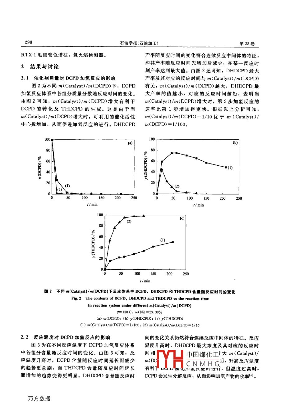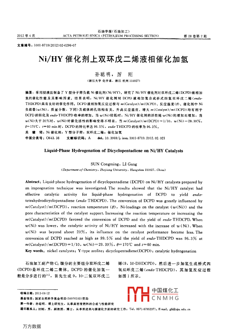 石油學(xué)報(bào)(石油加工)2012年4月ACTA PETROLEI SINICA (PETROLEUM PROCESSING SECTION)第28卷第2期文章編號(hào):1001-8719(2012)02-0296-07Ni/HY催化劑上雙環(huán)戊二烯液相催化加氫孫聰明,厲剛(浙江大學(xué)化學(xué)系,斷江杭州310027)摘要:采用浸漬法制備了Y型分子篩負(fù)載Ni催化劑(Ni/HY)。研究了Ni/HY催化劑對(duì)雙環(huán)戊二烯(DCPD)液相加氫的催化性能及其影響因素。結(jié)果表明,Ni/HY催化劑對(duì)DCPD液相加氫合成橋式四氫雙環(huán)戊二烯(endoTHDCPD)具有良好的催化作用。DCPD液相加氫反應(yīng)過(guò)程與m( Catalyst)/m(DCPD)、反應(yīng)溫度(8)、催化劑中Ni負(fù)載量(w(N),質(zhì)量分?jǐn)?shù),下同)及載體的孔結(jié)構(gòu)有關(guān)。升高反應(yīng)溫度、增大m( Catalyst)/m(DCPD)均有利于DCPD的轉(zhuǎn)化及 endo-THDCPD收率的增加。當(dāng)w(N)較低時(shí),Ni/HY催化劑的活性隨v(Ni)的增加而增加,當(dāng)w(Ni)大于20%時(shí),w(N)對(duì)催化活性的影響變得不明顯。當(dāng)m( Catalyst)/m(DCPD)=1/10,w(Ni)=29.39%,=170℃,t=60min時(shí),DCPD的轉(zhuǎn)化率達(dá)99.5%, endo-THDCPD的收率為96.3%關(guān)鍵詞:N催化劑;Y型分子篩;雙環(huán)戊二烯;催化加氫中圖分類號(hào):O643.38文獻(xiàn)標(biāo)識(shí)碼:Adoi:10.3969/j.issn.1001-8719.2012.02,021Liquid-Phase Hydrogenation of Dicyclopentadiene on Ni/HY CatalystsSUN Congming, LI Gang(Department of Chemistry, Zhejiang University, Hangshou 310027, China)Abstract: Liquid-phase hydrogenation of dicyclopentadiene(DCPD)on Ni/HY catalysts prepared byan impregnation technique was investigated. The results showed that the Ni/HY catalyst hadeffective catalytic activity for liquid-phase hydrogenation of dCpd to yield endo-tetrahydrodicyclopentadiene (endo- THDCPD). The conversion of DCpD was greatly influenced bym(Catalyst)/m(DCPD), reaction temperature (0), Ni-loadings on the catalyst (w(Ni))and thepore characteristics of the catalyst support. Increasing the reaction temperature or increasing them(Catalyst)/m(DCPD) favored the conversion of DCPD and the yield of endo-THDCPD. Whenw(Ni)was lower, the catalytic activity of Ni/hY increased with the increase of w(Ni). Whenw(Ni) was beyond about 20%, its influence on the catalyst performance becameconversion of DCPD reached as high as 99. 5% and the yield of endo-THDCPD wasm(Catalyst)/m(DCPD)=1/10, w(Ni)=29. 39%, 8=170C and t=60 minKey words: nickel catalysts; Y-type zeolite; dicyclopentadiene( DCPD); catalytic hydrogenation石油加工副產(chǎn)物Cs餾分的主要組分雙環(huán)戊二烯烯(9,10 DHDCPD),然后進(jìn)一步加氫生成橋式四(DCPD)是環(huán)戊二烯二聚體。DCPD的催化加氫一氫雙環(huán)戊二烯( endo-THDCPD),其加氫反應(yīng)過(guò)程般是分步進(jìn)行的,首先生成9,10-二氫雙環(huán)戊二如圖1所示。收稿日期:2011-04-12中國(guó)煤化工基盒項(xiàng)目:國(guó)家自然科學(xué)基金項(xiàng)目(50976103)資助CNMHG第一作者;孫聰明,碩土研究生,從事高密度燃料的合成與性能研究通訊聯(lián)系人:厲剛,男,副教授,博士,從事推進(jìn)劑與膜催化方面的研究工作;Tel:0571-87952371; E-mail: gli@icdu,cm第2期Ni/HY催化劑上雙環(huán)戊二烯液相催化加氫297CatalystH29.10.DHDCPDendo-THDCPD圖1雙環(huán)戊二烯催化加氫示意圖Fig 1 Schematic representation for hydrogenation of dicyclopentadieneendoTHDCPD是一種性能優(yōu)良的固體高密度國(guó)藥集團(tuán)化學(xué)試劑有限公司產(chǎn)品:NHY分子篩,燃料,另外也可以異構(gòu)化生成掛式四氫雙環(huán)戊二烯工業(yè)級(jí),上海欣年石化助劑有限公司產(chǎn)品;雙環(huán)( exo ThDCPD)(2或金剛烷, ero- THDCPD是一戊二烯(DCPD),工業(yè)級(jí),杭州楊利石化有限公司種性能優(yōu)良的液體高密度燃料,而金剛烷則是一種產(chǎn)品重要的精細(xì)化工原料。由此可見(jiàn),DCPD加氫是一1.2催化劑制備與表征個(gè)具有重要應(yīng)用價(jià)值的合成反應(yīng)采用浸漬法制備Ni/HY催化劑。將一定量的般采用金屬催化劑,包括貴金屬(或稀有金乙酸鎳溶于無(wú)水乙醇中,加入NH1Y分子篩,攪拌屬)和非貴金屬催化劑催化DCPD加氫反應(yīng)。貴金2h,旋蒸除去乙醇,得到綠色粉末。將綠色粉末在屬催化劑的催化活性往往大于非貴金屬的,如H2馬福爐中600℃焙燒4h,得灰色N/HY樣品,分壓為2。MPa、反應(yīng)溫度為150℃時(shí),以正已烷然后在450℃速率為30mL/min的H2流中活化為溶劑,金屬催化劑的催化活性按照元素從大到小2h,得到Ni/HY催化劑樣品。活化結(jié)束后,將的順序?yàn)?Os,Ru,Rbh,lr,Pd,Pt,N,Co,Ni/HY置于真空干燥箱中備用Cu,Fe。但由于貴金屬價(jià)格高昂、來(lái)源較少,應(yīng)采用日本 Rigaku d/ max-rA轉(zhuǎn)靶多晶X射線衍用受到一定限制。為了降低生產(chǎn)成本,工業(yè)上更青射儀(XRD)分析樣品物相(CuKa射線,管電壓睞價(jià)格低廉的非貴金屬作為加氫催化劑,其中N催40kV,管電流40mA,掃描步長(zhǎng)0.02°,速率化劑最受關(guān)注。 Raney N催化劑是目前唯一工業(yè)化0.2°/min)的DCPD加氫催化劑,但該催化劑使用壽命較短在 Micromeritics ASAP2020全自動(dòng)吸附儀上重復(fù)使用后活性迅速下降,不易再生使用。米鎮(zhèn)濤等發(fā)現(xiàn),Ni/yAl2O3催化劑對(duì)DCPD加氫反應(yīng)也用N2靜態(tài)(-196℃)吸附容量法表征載體孔結(jié)有較好的催化性能,但由于N前軀體NO與構(gòu).所有樣品分析前均在30℃抽真空條件下,預(yù)yAl2O3易發(fā)生相互作用生成NA2O4,因而催化活處理12b。分別用BET法計(jì)算比表面積(S),用性受到限制t-plot法計(jì)算外比表面積(S)