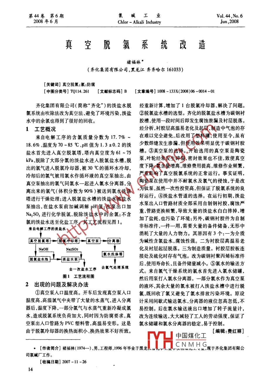第44卷第6期氯堿工業(yè)2008年6月Chlor-Alkali Industry真空脫氯系統(tǒng)改造褚福林(齊化集團(tuán)有限公司,黑龍江齊齊哈爾161033)[關(guān)鍵詞]真空脫氯;氯;防腐[中圖分類號(hào)]TQ114.261[文獻(xiàn)標(biāo)志碼]B[文章編號(hào)]1008-133X(2008)06-0014-01齊化集團(tuán)有限公司(簡稱“齊化”)的淡鹽水脫經(jīng)重新計(jì)算,增加了1臺(tái)脫氯冷卻器,解決了問題。氯系統(tǒng)由吹除法改為真空法,避免了環(huán)境污染淡鹽②脫氯鹽水槽的選型。齊化的脫氯鹽水槽為碳鋼襯水中的余氯也得到了很好的回收。膠槽,使用一段時(shí)間后即發(fā)生腐蝕泄漏及襯層脫落。1工藝概況經(jīng)分析,襯膠層高溫易老化及起層,制造中氣泡的存來自電解工序的含氯質(zhì)量分?jǐn)?shù)為17.7%~在難以完全避免后改用了塑料罐使用至今雖有186%、溫度為70-85℃、pH值為1.3±02的淡少數(shù)焊縫發(fā)生滲漏但使用效果明顯優(yōu)于碳鋼襯膠鹽水首先進(jìn)入真空脫氯塔,塔內(nèi)真空度為61-75槽。③真空泵的選擇。開始選用的真空泵是陶瓷kPa,脫除了大部分氯的淡鹽水進(jìn)入脫氯鹽水槽,脫泵葉輪經(jīng)常發(fā)生碎裂密封效果也不佳致使真空出的氯氣進(jìn)入脫氯冷卻器,被30℃的循環(huán)水冷卻,度下降氯含量增高,維修費(fèi)用提高,維修作業(yè)頻繁,冷卻后的氯氣被用氯水作循環(huán)液的真空泵抽出,由嚴(yán)重影響了真空脫氯系統(tǒng)的正常運(yùn)行。事實(shí)證明,真空泵抽出的氯氣同氯水一起進(jìn)入氯水分離器,分陶瓷泵在使用中并不耐氯水及氯氣的侵蝕于是改離出來的氯氣(體積分?jǐn)?shù)為90%)被送到氯水洗滌為鈦泵,雖然一次性投資高,但保證了脫氯系統(tǒng)的良塔進(jìn)行干燥處理;進(jìn)入脫氯鹽水槽的淡鹽水被鹽水好運(yùn)行。④淡鹽水管道的選擇。在運(yùn)行初期,淡鹽泵抽出,在鹽水泵前加堿調(diào)解pH值;在泵出口加水泵出人口管路材質(zhì)全部采用自制鋼襯膠腐蝕嚴(yán)Na2SO3進(jìn)行化學(xué)脫氯脫除淡鹽水中的余氯;不含重管路更換頻繁導(dǎo)致大量的淡鹽水白白排掉增氯的淡鹽水送至化鹽工序。其工藝流程見圖1。加了鹽耗,也污染了環(huán)境;另外,碳鋼襯膠件為自制來自電解工序的淡鹽水非標(biāo)準(zhǔn)件,一件一用,需要大量的備件儲(chǔ)備,無形中消耗了大量的人力物力。其原因有3個(gè):一為介質(zhì)真空脫氯塔一氯冷卻一[真空泵]一份離器為堿性含氯鹽水,腐蝕性強(qiáng)。二為襯膠層高溫易老化及襯層起層脫落。三為制造質(zhì)量。襯膠層膠板連氯水洗滌」氯鹽水池}淡鹽水泵接處及硫化時(shí)存有氣泡。改為碳鋼襯聚丙烯標(biāo)準(zhǔn)件后使用壽命長,且備件儲(chǔ)量減小。⑤氯水的輸送方去一次鹽水工序去氯氣處理系統(tǒng)式。來自氯氣干燥系統(tǒng)的氯水首先進(jìn)入氯水儲(chǔ)罐圖1工藝流程圖然后用泵打入氯水分離器。一部分氯水作為真空泵2出現(xiàn)的問題及解決辦法的液環(huán),其余大量的氯水被打入淡鹽水槽中進(jìn)行脫①真空泵入口溫度高。開車后發(fā)現(xiàn)真空泵入口氯,既回收了氯又避免了氯水排放污染環(huán)境。原設(shè)溫度高高溫氯氣中夾帶了大量的水蒸氣進(jìn)入分離計(jì)采用間歇式輸送氯水分離器的液位忽高忽低,不器后,溫度下降,一部分氯氣與水蒸氣重新冷凝成氯易控制。后在氯水輸送液出口增加了轉(zhuǎn)子流量計(jì),水,造成脫氯系統(tǒng)負(fù)荷加大,同時(shí)因?yàn)榉栏?真改為連續(xù)輸送,大大減輕了工人的勞動(dòng)強(qiáng)度,保證了空泵出入口管路為PvC塑料管,高溫易變形。這是氯水儲(chǔ)罐和氯水分離器的穩(wěn)定,易于控制。由于脫氯冷卻器的換熱面積小、換熱效果不好所致[編輯:費(fèi)紅麗]中國煤化工[作者簡介]褚福林(1974),男,工程師,199年畢業(yè)于黑龍言m和幾,立,現(xiàn)于齊化集團(tuán)有限公司氯堿廠工作。[收稿日期]2007-11-26
