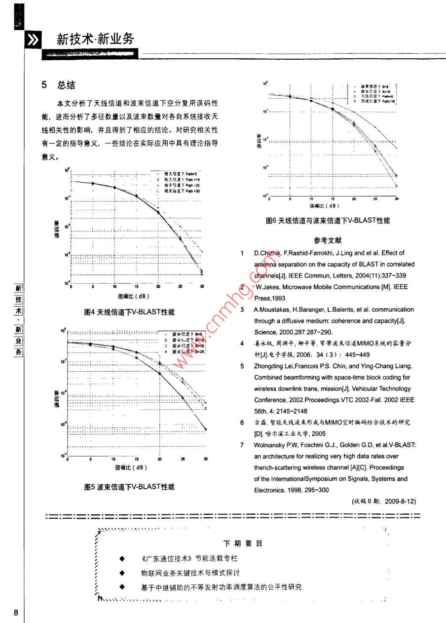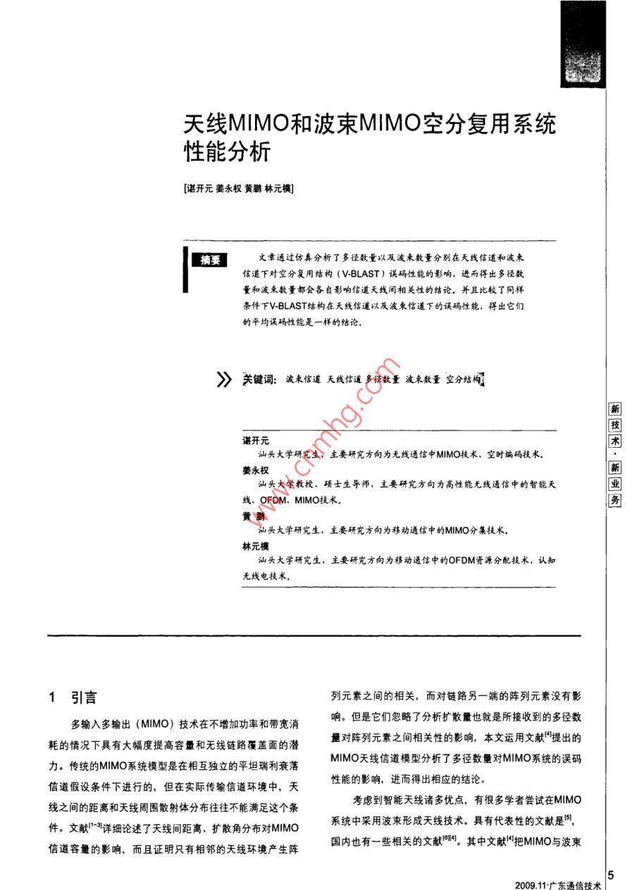 天線MMO和波束MMO空分復(fù)用系統(tǒng)性能分析[諶開元姜永權(quán)黃鵬林元模]L摘要文章通過仿真分析了多徑數(shù)量以及波東數(shù)量分別在天線信道和波來信道下對(duì)空分復(fù)用結(jié)枃( V-BLAST)誤碼性能的影響,進(jìn)而得出多徑數(shù)量和波束數(shù)量都會(huì)各自影響信道天線間相關(guān)性的結(jié)論.并且比較了同樣條件下 V-BLAST結(jié)構(gòu)在天線信道以及波柬信遒下的誤碼性能,得出它們的平均誤碼性能是一樣的結(jié)論關(guān)鍵詞:波來信道天線信道多徑數(shù)量波束數(shù)量空分結(jié)構(gòu)汕頭大學(xué)研究生,主要研究方向?yàn)闊o線通信中MMO技術(shù)、空時(shí)編碼技術(shù)姜永權(quán)汕頭大學(xué)教授、碩士生導(dǎo)師,主要研究方向?yàn)楦咝阅軣o線通信中的智能天線、OFDM、MMO技術(shù)黃爵汕頭大學(xué)研究生,主要研究方向?yàn)橐苿?dòng)通信中的MMO分集技術(shù)林元模汕頭大學(xué)研究生,主要研究方向?yàn)橐苿?dòng)通信中的OFDM資源分配技術(shù),認(rèn)知無線電技術(shù)1引言列元素之間的相關(guān),而對(duì)鏈路另一端的陣列元素沒有影多翰入多輸出(MMo)技術(shù)在不增加功率和帶寬消響。但是它們忽略了分析擴(kuò)散量也就是所接收到的多徑數(shù)耗的情況下具有大幅度提高容量和無線鏈路覆蓋面的潛量對(duì)陣列元素之間相關(guān)性的影響,本文運(yùn)用文獻(xiàn)提出的力。傳統(tǒng)的MMO系統(tǒng)模型是在相互獨(dú)立的平坦瑞利衰落MMO天線信道模型分析了多徑數(shù)量對(duì)M|MO系統(tǒng)的誤碼信道假設(shè)條件下進(jìn)行的,但在實(shí)際傳輸信道環(huán)境中,天性能的影響,進(jìn)而得出相應(yīng)的結(jié)論。線之間的距離和天線周圍散射體分布往往不能滿足這個(gè)條考慮到智能天線諸多優(yōu)點(diǎn),有很多學(xué)者嘗試在MMO件。文獻(xiàn)詳細(xì)論述了天線間距離、擴(kuò)散角分布對(duì)MM系統(tǒng)中采用波束形成天線技術(shù)。具有代表性的文獻(xiàn)是信道容量的影響,而且證明只有相鄰的天線環(huán)境產(chǎn)生陣國內(nèi)也有一些相關(guān)的文獻(xiàn),其中文獻(xiàn)把MMO與波束》新技術(shù)新業(yè)務(wù)形成結(jié)合的系統(tǒng)稱為波束MMO系統(tǒng)和而把傳統(tǒng)的MMO上式中:=avq",k=1,2,…K,而稱為天線MMO系統(tǒng),并且對(duì)兩種信道的容量進(jìn)行了分析,表明波束信道具有更大的容量潛力,可惜的是沒有w(0p)=e/(x/4)dcose對(duì)它們進(jìn)行空分復(fù)用誤碼性能分析,本文繼續(xù)了這樣的工2r/ANd cesc(2r/M)m-or/A)d cos((2x/MXM-l)-il作,得出了波束信道盡管比天線信道具有更大的容量潛力,但是平均誤碼性能卻沒有提高其中a表示第k發(fā)射天線的第p個(gè)AOA多徑分量到接收天線的空間傳輸復(fù)系數(shù),w()為7對(duì)應(yīng)的Mx12天線MMO信道與波束MMO信道模型陣列方向響應(yīng)矢量其中λ、d分別為射頻載波的波長和本文所要研究的MMO信道只是在接收端存在相關(guān)接收天線間的距離。性,為了構(gòu)造起滿足這樣條件的物理信道模型。本文依據(jù)把k、v(O)代入到(2),那么天線MMO信道每一波達(dá)角(AOA分量在MM接收天線間引起的響應(yīng)是強(qiáng)的沖激響應(yīng)矩陣為相關(guān)的,但隨著AOA數(shù)量和擴(kuò)散量的增大,MMO空間信道間的相關(guān)性將減弱這一事實(shí),采用文獻(xiàn)提出的模型H∑[av(e)av()…av(e)…以叫對(duì)于傳統(tǒng)的天線MMO信道模型,系統(tǒng)框圖如圖1所示。用Kx1列矢量對(duì)于波束MMO信道模型,圖2給出了系統(tǒng)框圖。在波束信道MMO系統(tǒng)中,波束空吋編碼器空時(shí)譯碼器空時(shí)編碼器波束形成空時(shí)譯碼器圖1天線MMO系統(tǒng)圖2波束MMO系統(tǒng)框圖[Sx」表示每個(gè)符號(hào)周期內(nèi)的形成產(chǎn)生的陣列方向圖的數(shù)量用B表示,則波束信道發(fā)射信號(hào),M×1列矢量y=y1y2y,丁表MMo系統(tǒng)可獲得B個(gè)波束的B路多輸出信號(hào),用Bxl矩示接收僖號(hào),N(m)=[n2…n,]表示接收噪陣[…回表示B個(gè)波束信道聲列矢量,其中上標(biāo)7表示矩陣的轉(zhuǎn)置運(yùn)算。當(dāng)所有可分輸出信號(hào)構(gòu)成的列矢量。z[小]可以從辨的信道延時(shí)擴(kuò)展均不超過一個(gè)調(diào)制符號(hào)持續(xù)期,天線信z[=w"y{b=1,2…,B得到。其中W為道M|MO系統(tǒng)的多輸出信號(hào)y可用下式表示第b波束(陣列方向圖)的Mx1權(quán)系數(shù)列矢量,上標(biāo)H表y=√EHs+N(n)示矩陣的共軛轉(zhuǎn)置運(yùn)算。由B個(gè)列矢量形b,其中MxK矩陣H為信道沖激響應(yīng)矩陣。用波達(dá)b=1,2,…,B構(gòu)成的MxB波束信道權(quán)系數(shù)矩陣角度(AOA)對(duì)多徑分量進(jìn)行劃分,設(shè)可分辨的獨(dú)立WAOA的數(shù)量為P表示,則則多波束信道輸出信號(hào)構(gòu)成的列矢量z[n]=W"[n]=WHs/]+WN[] (5)天線MMO和波束MMO空分復(fù)用系統(tǒng)性能分析其中,第b波束信道的輸出信號(hào)SB=sp+E-H:Nz[小]=wy[小]=wB[小+wN[](6)那么由式(5)我們得到波束信道的沖激響應(yīng)矩陣[eaei)=.[HH"]NJE[HH."]H=WH所以在波束信道中第k數(shù)據(jù)流的信噪比(7)式(2rl2)ycos(2r/R)0-△6/2B(2b+1)Ye(11)age)(2*/)cos(2x/R)r-A0/2B(26+1))可知yk=yk,所以它們的總的平均誤碼率將會(huì)相(2r/)ycos(2r/RNR-1)-△6/2B(2b+1)等3 V-BLAST復(fù)用結(jié)構(gòu)和迫零(zF接收機(jī)4系統(tǒng)性能分析和仿真結(jié)果V-BL