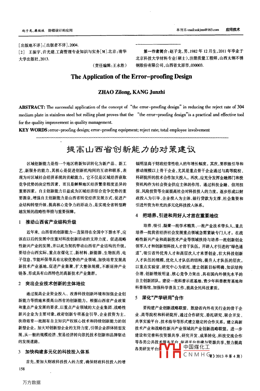 山西科技SHANXI SCIENCE AND TECHNOLOGY2014年第29卷第1期文章編號:1004-6429(2014)01-015603收稿日期:2013-08-21防錯設計的應用趙子龍,康俊枝山西太鋼不銹鋼股份有限公司,山西太原,030003)摘要:通過分析“防錯設計”理念在某公司不銹熱軋廠“降低不銹熱軋廠304中板廢品率”中的成功應用,得出“防錯設計”在質量管理中是一種實用效果非常明顯的質量改進工具。關鍵詞:防錯設計;防錯裝置;廢品率;全員參與中圖分類號:F2732文獻標識碼:A1問題的提出學衡量。在鋼鐵產品的整個生產流程中,從采礦、煉焦燒結、煉鐵煉鋼熱軋冷軋檢化驗、發(fā)運、中儲、交付顧客這么多生產流美國質量管理專家克勞斯比在他的開山之作《質量免費一確程中要想各個企業(yè)的每個工序都做到“零缺陷”似乎是不可能定質量的藝術》中,確立了“第一次就把事情做對”和“零缺陷”的的,世界上也沒有一個企業(yè)真正做到“零缺陷”。但為什么美國的理論但如何才能做到第一次就把事情做對”和“零缺陷”呢?“零飛機和電腦日本的電子產品和汽車意大利的服裝設計和皮具,缺陷”理論的四項基本原則為:明確要求、儆好預防、一次做對、科法國的香水德國的高檔汽車、工程設備和啤酒舉世聞名,成為世完全愈合,且能防御風吹斷時就可將地膜解去。在成活后注意抹去砧木的新芽促進接穗生長。接穗成活后,生長較快結合部位3結語不牢固易斷需及時進行短接,當接穗長至30cm時,應及時進行隨著人民生活水平的提高,對環(huán)境建設的要求也日益重視綁扶,以防被風吹斷。傳統(tǒng)綠化樹種的單一單調已滿足不了人們的需要。金葉白蠟以表1嫁接金葉白蠟的生長過程金色的葉片、優(yōu)美的樹形在園林綠化中起到很好的觀賞效果,可嫁接時間8天□15天_20天25天50天]群植、對植、孤植和密植,在太原地區(qū)可作為鄉(xiāng)土樹種來培養(yǎng)使生長出現(xiàn)愈合,愈合增大,接穗長成大部分修剪徒長金葉白蠟滿足任何季節(jié)園林綠化的需要。清況極個別部分長出新葉20cm,解塑可去袋留30cm長參考文獻頂出小芽3-4片料繩煉苗子的枝解地[1]孫輝金葉白蠟栽培和園林管護[J現(xiàn)代園藝,2011(11)28病蟲害的預防及防治[2]李潔茹.金葉白蠟園林大苗培育技術[J.中國園藝文摘,我們遵循“治早、治小治了”的原則。接穗初期長出的嫩芽2011(10):127-128宜受蚜蟲的危害,應噴施1001500倍3%啶蟲脒乳油藥液,有[3]玉潔,龐曼,董倩,等金葉白蠟快繁體系建立研究[河北良好的防治效果。如果嚴重發(fā)生卷葉時,就需要用剪子把產卵枝林果研究,2012,27(2):152-15(責任編輯:張瑛)梢及危害梢剪除在太原市植物研究中心的圃地內實驗研究證明,嫁接技術第一作者簡介:張莉,女,1980年8月生,2010年畢業(yè)于使金葉白蠟到達成品合格苗的時間短,嫁接的繁殖方法最快,成北京林業(yè)大學,助理工程師,太原市園林植物研究中心,山西省活率高,母本的優(yōu)良性狀保持得最好。太原市,030041Grafting Propagation and Management Technology of Gold-leaf FraxinusZHANG Li, QU RuitaoABSTRACT: Gold-leaf fraxinus is a variant of fraxinus linn, and also is a colored-leaf tree with some ormamental valueThis paper introduces emphatically the grafting propagation TechnologyH中國煤化工 lent of gold-eaffraxinus and its application in the gardenCNMHGKEY WORDS: gold-leaf fraxinus; grafting propagation; maintenance and management趙子龍,康俊枝防錯設計的應用本刊E- mail: sxkjzzs(@163com應用技術界的品牌?為什么“零缺陷”理論會受到這些國家如此的重視?改進(見表1)。2防錯設計介紹表1四盤剪改進措施項目改善方案完成日期擔當眾所皆知,二次世界大戰(zhàn)后美國在經(jīng)濟和產品質量各方面是世界強國、日本是戰(zhàn)敗國但為什么日本從一個資源缺乏的島剪刃交接每班圓盤剪切人員接班后首先對剪刃國,在短短的幾十年內經(jīng)濟飛速發(fā)展進入發(fā)達國家的行列甚至班管理進行檢查,并做好記錄。發(fā)現(xiàn)剪刃鈍|2012-11甲化,立即更換在產品質量方面超過了美國。原因可能是多方面的,但日本在防每爐鋼剪鋼前和剪完后都對剪刃裝配錯設計方面所做的貢獻是不可小視的?!胺厘e設計”是由日本人新鄉(xiāng)重夫最早提出,其主要目的在于預防生產中出現(xiàn)的可能失刃調意/情況進行確認發(fā)現(xiàn)剪刃間隙不合時,2012-11乙通知調度及時協(xié)調,不得在剪刃間隙誤,并避免由于失誤而產生的質量問題。它與“零缺陷”理論四項不合時剪鋼。完善圓盤剪操作規(guī)程基本原則中的“做好預防”相輔相成的,正是由于每項工作都做剪刃更換將經(jīng)過車削的剪刃更換到上剪刃進行到了提前預防才生產出近乎零缺陷的產品,才使日本的電子產使用,下剪刃采用新剪刃品和汽車舉世聞名,成為世界的品牌。防錯設計的內容包括兩個33對爐低輥壓坑的改進設計基本方面:一是檢測出現(xiàn)的差錯;二是防錯裝置。檢測差錯包括3通過分析爐底輥壓坑運行流程,從完善爐底輥打磨制度種形式:一是后繼檢測即下一道工序的生產者檢查上一道工序打磨效果檢驗?;€的清潔生產拋丸機刮板更換等方面進行的質量問題并立即反饋給上一道工序的生產者,讓其停止生產了改進(見表2),取得了明顯的改進效果糾正錯誤;二是自我檢測,即生產者檢查自身的錯誤;三是預防表2爐底輥壓坑改進措施性檢測,即在錯誤未發(fā)生之前發(fā)現(xiàn)它并采取相應