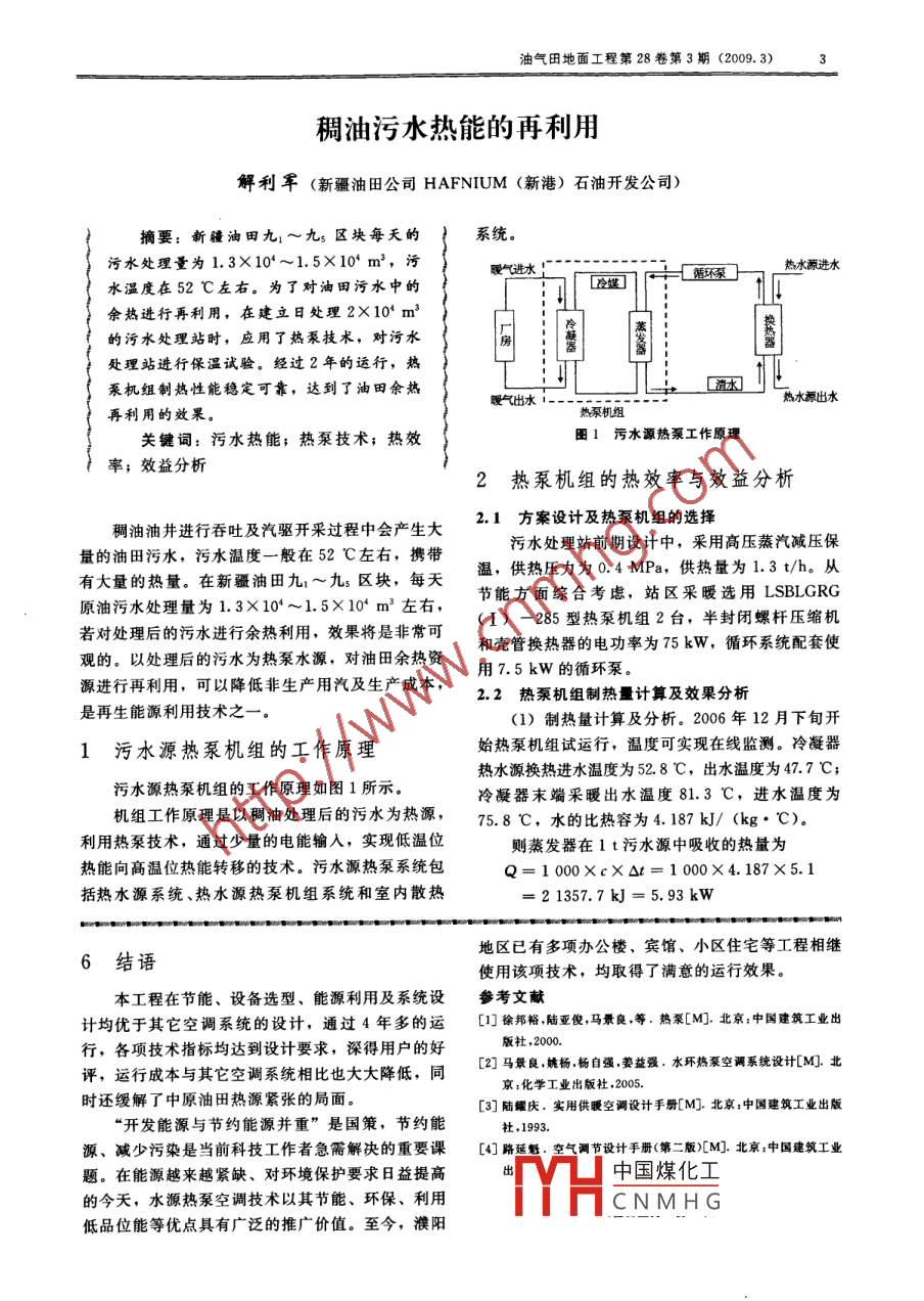 油氣田地面工程第28卷第3期(2009. 3)3稠油污水熱能的再利用解利軍(新疆油田公司HAFNIUM (新港)石油開發(fā)公司)摘要:新疆油田九:~九s區(qū)塊每天的系統(tǒng)。污水處理量為1.3X10*~1.5X10* m',污暖氣進水熱水源進水水溫度在52 C左右。為了對油田污水中的余熱進行再利用,在建立日處理2X10* m'的污水處理站時,應用了熱泵技術,對污水.房處理站進行保溫試驗。經過2年的運行,熱泵機組制熱性能穩(wěn)定可靠,達到了油田余熱曖氣出水.熱水源出水再利用的效果。熱泵機組關鍵詞:污水熱能;熱泵技術;熱效團1污水源熱泵工作原理率;效益分析2熱泵機組的熱效率與效益分析稠油油井進行吞吐及汽驅開采過程中會產生大2.1方 案設計及熱泵機組的選擇量的油田污水,污水溫度- -般在52 C左右,攜帶污水處理站前期設計中,采用高壓蒸汽減壓保有大量的熱量。在新疆油田九~九s區(qū)塊,每天溫,供熱壓力為0.4 MPa,供熱量為1.3 t/h.從原油污水處理量為1.3X10*~1.5X10* m3左右,節(jié)能方面綜合考慮,站區(qū)采暖選用LSBLGRG若對處理后的污水進行余熱利用,效果將是非???I) -285型熱泵機組2臺,半封閉螺桿壓縮機觀的。以處理后的污水為熱泵水源,對油田余熱資和殼管換熱器的電功率為75kW,循環(huán)系統(tǒng)配套使源進行再利用,可以降低非生產用汽及生產成本,2.2熱泵機組制熱量 計算及效果分析用7.5 kW的循環(huán)泵。是再生能源利用技術之一-。(1) 制熱量計算及分析。2006年12月下旬開1污水源熱泵機組的工作原理始熱泵機組試運行,溫度可實現(xiàn)在線監(jiān)測。冷凝器熱水源換熱進水溫度為52.8 C,出水溫度為47.7 C;污水源熱泵機組的工作原理如圖1所示。冷凝器末端采暖出水溫度81.3 C,進水溫度為機組工作原理是以稠油處理后的污水為熱源,75.8 C,水的比熱容為4.187 kJ/ (kg* "C)。利用熱泵技術,通過少量的電能輸入,實現(xiàn)低溫位則蒸發(fā)器在1t污水源中吸收的熱量為熱能向高溫位熱能轉移的技術。污水源熱泵系統(tǒng)包Q= 1 000XcX△t= 1 000X4.187X5.1括熱水源系統(tǒng)、熱水源熱泵機組系統(tǒng)和室內散熱=2 1357.7kJ = 5.93 kW地區(qū)已有多項辦公樓、賓館、小區(qū)住宅等工程相繼6結語使用該項技術,均取得了滿意的運行效果。本工程在節(jié)能、設備選型、能源利用及系統(tǒng)設參考文獻計均優(yōu)于其它空調系統(tǒng)的設計,通過4年多的運[1]徐邦裕,陸亞俊,馬景良,等.熱泵[M].北京:中國建筑工業(yè)出行,各項技術指標均達到設計要求,深得用戶的好[2]馬景良,姚楊,楊自強,姜益強。水環(huán)熱泵空調系統(tǒng)設計[M].北版社2000.評,運行成本與其它空調系統(tǒng)相比也大大降低,同京:化學工業(yè)出版杜.2005.時還緩解了中原油田熱源緊張的局面。[3]陸耀慶.實用供暖空調設計手冊[M].北京:中國建筑工業(yè)出版“開發(fā)能源與節(jié)約能源并重”是國策,節(jié)約能社.1993.源、減少污染是當前科技工作者急需解決的重要課[4]路延魁??諝庹{節(jié)設計手冊(第二版)[M].北京:中國建筑工業(yè)題。在能源越來越緊缺、對環(huán)境保護要求日益提高中國煤化工的今天,水源熱泵空調技術以其節(jié)能、環(huán)保、利用CNMH G低品位能等優(yōu)點具有廣泛的推廣價值.至今,濮陽油氣田地面工程第28卷第3期(2009. 3)每小時吸收的熱量為272.78kW.有富余。冷凝器釋放到末端用于采暖熱水(1 t)中的熱量為表1熱泵的年運行費用Q≈1 000XcXOt= 1 000X4.187 X5.5頁目數(shù)量成本費/萬元=23028.5kJ=6.4kW電費0.44元/kW.h 1 臺熱泵和1臺循環(huán)泵1折舊費采暖系統(tǒng)水流量為46 m*/h,則每小時末端采維修費初期投資X11.8%2. 358暖系統(tǒng)熱水提取的熱量為294.4 kW??傆?2. 058熱泵機組末端循環(huán)進、出水溫度差一直保持在.3應用熱泵技術的優(yōu)點5 C以上,每小時耗電量和制熱量比為1 : 3.9,通常在1 :3.5左右。利用油田污水余熱換熱效果明顯、應用熱泵技術進行保溫與其它的保溫方式相經濟,且末端采暖系統(tǒng)熱水溫度在80 C左右,符合比,具有以下幾方面的優(yōu)點:采曖系統(tǒng)水溫要求。(1)在稠油油田保溫采用熱泵技術,利用油田(2)室內換熱系統(tǒng)。站區(qū)各房間采暖片均采用污水所含余熱與用蒸汽保溫相比,達到了油田保溫GZ4- B/H1-P型標準鋼柱散熱片,每塊散熱裝置的目的和效果,降低了生產成本。由22片散熱片組成,每片的標準散熱量為106 W,(2)由于稠油處理后的污水量在1.3X 10*~根據房間采暖負荷設計耗熱量,再根據溫度要求安.1.5X10' m'/d,溫度較高,回用鍋爐的溫度-般裝散熱裝置量。在45 C左右,大部分熱量白白浪費,熱泵技術的(3)污水源熱量損耗情況。在二級過濾器供排應用,無疑是對油田余熱資源的再利用。至軟化水站母管線上裝分支線水量供熱泵來換熱,(3)熱泵機組運行中,無任何污染排放物,具壓力為0. 35 MPa,每小時的流量為100 m* ,每天的有環(huán)保效果。與蒸汽保溫相比,熱泵保溫室內空氣流量為2 400 m2 ,污水處理站每天的處理量為1.3中千、濕度能保持相對的平衡,利于員工的健康。X10* m'.經計算和測試,總水量溫度下降1 C左4污水源熱泵應用前景右,對于回用油田鍋爐無影響。2.3 效益分析.熱泵技術的研究及應用在國內已進行多年,在(1)效益計算。設計站區(qū)熱負荷為390.94kW,油田領域,特別是稠油油田,熱污水資源豐富,推蒸汽供熱量為1.3 m/h.蒸汽的價格為80元/m2,廣應用熱泵技術具有較大的潛力。電價0.4