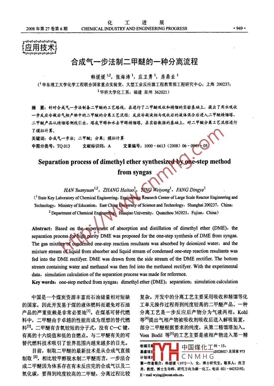 化工進(jìn)展2008年第27卷第6期CHEMICAL INDUSTRY AND ENGINEERING PROGRESS應(yīng)用技術(shù)合成氣一步法制二甲醚的一種分離流程韓媛媛1,張海濤’,應(yīng)衛(wèi)勇,房鼎業(yè)1(華東理工大學(xué)化學(xué)工程聯(lián)合國家重點(diǎn)實(shí)驗(yàn)室,大型工業(yè)反應(yīng)器工程教育部工程研究中心,上海200372華僑大學(xué)化工系,福建泉州362021)摘要:針對(duì)合成氣一步法制備二甲醚的工藝略線,在進(jìn)行了二甲醚吸收和精餾的實(shí)驗(yàn)基礎(chǔ)上,提出了用水吸收一步反應(yīng)冷凝后氣相產(chǎn)物中的二甲醚的分離工藝流程:反應(yīng)冷凝液相與吸收后的液體混合后進(jìn)入二甲醚精餾塔二甲醚產(chǎn)品從精餾塔側(cè)線引岀,塔底甲醇和水去甲醇精餾塔.在實(shí)驗(yàn)教據(jù)的基礎(chǔ)上,對(duì)二甲醚分離工藝流程進(jìn)行了模擬計(jì)算關(guān)鍵詞:合成氣一步法;二甲醚;分離;模擬計(jì)算中圖分類號(hào):TQ013文獻(xiàn)標(biāo)識(shí)碼:A文章編號(hào):1000-6613(2008)06-0949-05eparation process of dimethyl ether synthesized by one-step methodfrrom syngasHAN Yuanyuan 2, ZHANG Haitao, YING Weiyong, FANG Dingye( State Key Laboratory of Chemical Engineering, Engineering Research Center of Large Scale Reactor Engineering andTechnology, Ministry of Education, East China University of Science and Technology, Shanghai 200237, China;Department of Chemical Engineering, Huaqiao University, Quanzhou 362021, Fujian, China)Abstract: Based on the experiment of absorption and distillation of dimethyl ether (DME), theseparation process for high purity dMe was proposed for the one-step synthesis of DME from syngasThe gas mixture of condensedstep reaction resultants was absorbed by deionized water, and themixture stream of liquid from absorber and liquid stream of condensed one-step reaction resultants wasfed into the DME rectifyer. DMe was drawn from the side stream of the DME rectifier. The bottomstream containing water and methanol was then fed into the methanol rectifyer. with the experimentaldata, simulation calculation of the separation process was made for referenceKey words: one-step methed from syngas; dimethyl ether(DME); separation; simulation calculation中國是一個(gè)煤炭資源豐富而石油儲(chǔ)量相對(duì)短缺復(fù)雜。開發(fā)中的分離工藝主要采用吸收和精餾等化的國家,因此開發(fā)基于煤的液體燃料而避免對(duì)石油工單元操作過程得到純度較高的二甲醚產(chǎn)品。一種產(chǎn)品的嚴(yán)重依賴是非常必要地叫。在煤基可替代燃分離工藝是一步反應(yīng)后產(chǎn)物分為氣液兩相。Kohl料中,二甲醚由于卓越的性能而成為理想的替代燃等提出氣相產(chǎn)物被吸收劑吸收后送入解吸裝置料2。二甲醚有含氧較短的分子式,沒有CC鍵,部分二甲醚根據(jù)要求的純度,從第二精餾塔加入。有高的十六烷值和低的自燃點(diǎn)。與二甲醚有關(guān)的可 Voss Bodi等的工藝主要是液相產(chǎn)物進(jìn)入第一精替代燃料技術(shù)吸引了世界范圍內(nèi)越來越多的目光。收稿日其目前,制取二甲醚的最新技術(shù)是從合成氣直接菡建項(xiàng)中國煤化工01E02B02)及國家973制取,相比較甲醇脫水制二甲醚而言,一步法合計(jì)劃項(xiàng)目CNMHG成二甲醚因?yàn)轶w系存在有未反應(yīng)完的合成氣以及二第一作者簡介:韓媛媛(1972-),女,博士研究生。聯(lián)系人:應(yīng)衛(wèi)勇,教授,博士生導(dǎo)師,研究方向?yàn)樘家换?。電?1-6425219氧化碳,要得到純度較高的二甲醚,分離過程比較E- mail wing @ecusteducT化工進(jìn)展2008年第27卷餾塔,塔釜餾分進(jìn)入第二精餾塔,塔頂?shù)募状颊魵獠加?個(gè)可裝熱電偶的開口和5個(gè)液相取樣裝置,引入清洗系統(tǒng)來洗滌氣相產(chǎn)物,將反應(yīng)產(chǎn)物與從第見圖1。分別對(duì)應(yīng)6個(gè)溫度樣品點(diǎn)和5個(gè)組分樣品精餾塔頂?shù)玫降酿s分混合,即為燃料級(jí)二甲醚。點(diǎn)。精餾塔外部用保溫材料保溫,再沸器采用電加Sosa等的工藝是液相產(chǎn)物通過二步精餾,氣相產(chǎn)熱并裝有調(diào)節(jié)器,塔頂氣相出口裝有背壓閥,采用物與閃蒸氣一起被吸收劑洗滌除去其中的二甲醚, Agilent6820色譜儀分析氣相及液相組成。原料液經(jīng)含有二甲醚的吸收劑被送入第一個(gè)精餾塔。唐宏青計(jì)量泵從塔中部加入,調(diào)整加熱釜熱量,控制背壓等的分離流程與Kohl等相類似。Peng等提出的閥和冷凝器液相流率,使精餾過程在一定的操作壓一步反應(yīng)后分離二甲醚的改進(jìn)工藝是在洗滌塔中用力下穩(wěn)態(tài)運(yùn)行。溶劑洗滌包括二甲醚、甲醇、二氧化碳以及未反應(yīng)的合成氣混合物,回收洗滌后的洗滌液,進(jìn)行多步處理。另外的分離工藝是一步反應(yīng)混合物直接用溶劑進(jìn)行洗滌吸收,洗滌液送去精餾以獲得二甲醚產(chǎn)塔頂氣相物流品,董岱峰例、鄭丹星、田原宇等作了相關(guān)研/·塔頂液相物流究和報(bào)道。此外,美國 Air products公司2和日本NKK公司①成功地開發(fā)了用漿態(tài)床反應(yīng)器由合成氣一步法合成二甲醚的新工藝國內(nèi)研究的重點(diǎn)在催化劑和反應(yīng)器結(jié)構(gòu)方面,有關(guān)流程的研究很少。本文作者在對(duì)合成氣一步法生產(chǎn)二甲醚冷凝后氣相產(chǎn)物進(jìn)行吸收分離實(shí)驗(yàn)研究的基礎(chǔ)上1,對(duì)含二甲醚、二氧化碳、甲醇和水的進(jìn)料物流四組分溶液進(jìn)行精餾實(shí)驗(yàn)
