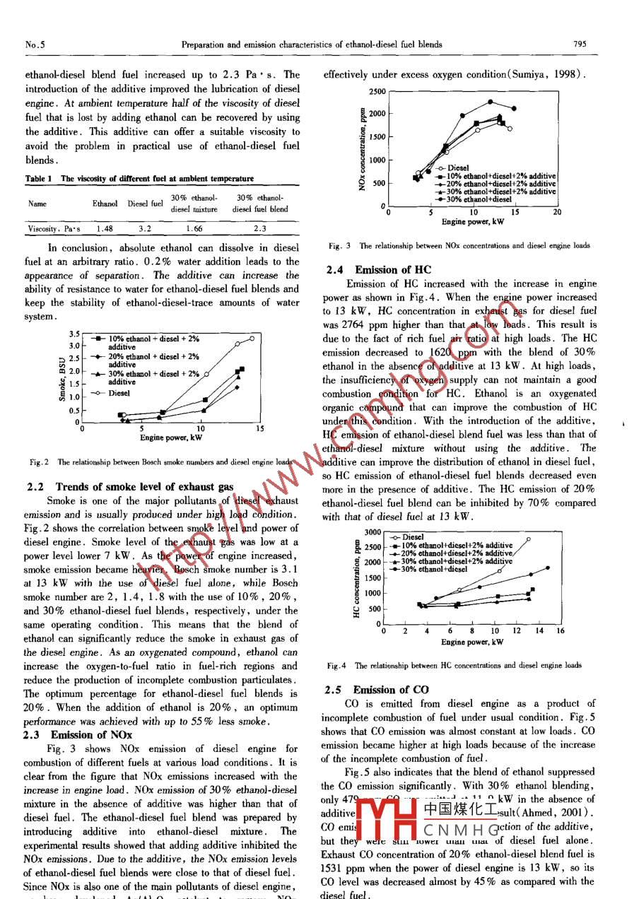 Journal of Enuironmental Sciences Vol 16, No 5, Pp. 793--796 2004Article nl:1001-0742(2004)050793-04CLC number: x511 Document code: APreparation and emission characteristics of ethanol-diesel fuel blendsZHANG Run-duo, HE Hong", SHI Xiao-yan, ZHANG Chang-bin, HE Bang-quan,WANG Jian-xin(1. Research Center for Eco-Environmental Sciences, Chinese Academy of Sciences, Beijing 100085, China. E-mail: honghe mail rcees ac cn;2. State Key Laboratory of Automotive Safety and Energy, Tsinghua University, Beijing 100084, China)Abstract: The preparation of ethanol-diesel fuel blends and their emission characteristics were investigated. Results showed the absoluteethanol can dissolve in diesel fuel at an arbitrary ratio and a small quantity of water (0. 2% )addition can lead to the phase separation ofblends. An organic additive was synthesized and it can develop the ability of resistance to water and maintain the stability of ethanol-diesel-trace amounts of water system The emission characteristics of 10%, 20%, and 30% ethanol-diesel fuel blends, with or without additiveswere compared with those of diesel fuel in a direct injection( Di)diesel engine. The experimental results indicated that the blend of ethanolwith diesel fuel significantly reduced the concentrations of smoke hydrocarbon( HC), and carbon monoxide( CO)in exhaust gas. Using20% ethanol-diesel fuel blend with the additive of 2% of the total volume, the optimum mixing ratio was achieved at which the benchdiesel engine testing showed a significant decrease in exhaust gas. Bosch smoke number was reduced by 5596, HC emission by 70%0and CO emission by 45 %, at 13 kW/1540 r/min. However, ethanol-diesel fuel blends produced a few ppm acetaldehydes and moreethanol in exhaust gasKeywords: ethanol-diesel fuel blends: preparation; emission; acetaldehyde; ethanolIntroduction(Ajav, 1999 )also found that the COreduced by 36.8%,56.5%,58.8%, and 62.5% by theMotor vehicles have an important impact on air quality, use of 5%,10%6, 15%,anehich affects both human health and the environment. respectively, as compared to using diesel fuel alone. Inlegislations were introduced to limit the emission previous work( ajav, 1998; 1999; 2000; Noguchi, 1996;of CO, HC, nitrogen oxides( NOx), and smoke from vehicles Ahmed, 2001; Satge de Caro, 1997; 2001), the correlation(Ertl, 1999). The diesel engine has the advantage of lower between ethanol-diesel blends and exhaust emissions fromconsumption of fuel and lower emission of CO, carbon dioxide diesel engine had been researched for the case of regulated( Co,)and HC than usual gasoline engine. However, diesel pollutants(smoke, HC, NOx, CO). However, exhaust gasengine emits a large amount of smoke and NOx compared to contains other specific pollutants such as acetaldehydethe gasoline engine equipped with a three-way catalyst. It is ethanol that have not been thoroughly investigated soa suitable way to solve this problem by partially replacing New analytical method should be set up to determinediesel fuel by ethanol( Abu-Qudais, 2000; Ajav, 1998; amounts of acetaldehyde and ethanol in exhaust gas1999; 2000; Wang, 2002; Noguchi, 1996; Ahmed, 2001; Moreover, ethanol is a substance with polar molecules withSatge de Caro, 1997; 2001; Zervas, 2001; 2002; Reddy, properties similar to water and far away from diesel fuel. It is1999). Because replacing diesel fuel entirely by ethanolnecessary to introduce additive into ethanol-diesel blends torather difficult, researchers focus on particular substitute for stabilize the mixture in the presence of water and ensure thediesel fuel which consist of diesel fuel, ethanol and certain homogeneity and compatibility of blends under all conditionsdditivesThe influences of newly introduced additives on the emissionThe most common methods for achieving ethanol characteristics of ethanol-diesel fuel blends have not beenalternative fuel are ethanol fumigation( Abu-Qudais, 2000; well established. A study was, therefore, undertakenAjav, 1998), dual injection( Wang, 2002; Noguchithe objective of finding out the optimum method to par1996), ethanol-diesel fuel blend( Abu-Qudais, 2000; Ajavreplace diesel by ethanol with or without additive1999; 2000; Ahmed, 2001), and ethanol-diesel fuel comparing the emissions of various pollutants from dieselemulsion( Satge de Caro, 1997: 2001). An advantage of engine using ethanol-diesel fuel blends with or withoutethanol-diesel fuel blending is that no major component additive and diesel fuel alone. Considering the new organicchanges are required for its use. Small adjustments to the compound pollutants brought by blending ethanol with dieselinjection timing and fuel delivery may be necessary tofuel, the emissions of acetaldehyde and unbumed ethanolfull power( Eugene, 1984). M. Abu-Qubesides the emissions of regular pollutants( NOx, HC, COQudais, 2000 )studied the impact of ethanol-diesandblending on the performance and emissions of a single中國煤化工1M:cylinder diesel engine. He pointed out that the optimumCNMHGthanol percentage for ethanol-diesel fuel blends was 15 %, 1.1 athis produced a reduction of 32 in smoke level. Ajav elAdditive is mainly produced from oleic acid, polyvinylitem: The Knowledge Innovation Project of the Chinese Academy of Sciences( No. KZCX3-SW-430): the Chinese Academy of Sciences Program for AttractingOverseas Professionals; Corresponding author794ZHANG Run-duo et alVol. 16alcohol and lecithin. Oleic acid, polyvinyl alcohol, xyleand tetrabutyl phthalate were mixed together in the ratio of 2 Results and discussion15: 5: 3: 1. After stirring completely, this mixture was pourinto a rotary evaporator and evaporated at 70 C for 10 h under 2.1 Ethanol-diesel fuel blendsvacuum condition. 2% lecithin in the volume of preparedthanol is a hydrophilic organic compound containingmixture was added and mixed continuously, and then a hydroxyl functional group and can dissolve in water. Dieselyellow and viscousadditive was preparedfuel is a sort of prod
