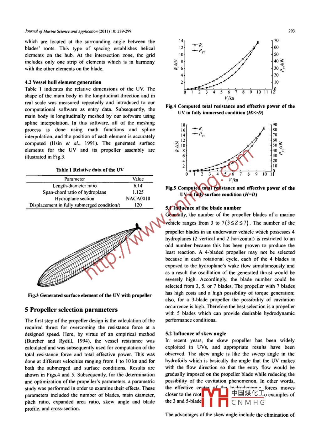 J. Marine Sci. Appl. (2011) 10: 289-299DOL: 1.007511804-011-1071-4Numerical Analysis of the High Skew Propeller of anUnderwater VehicleHassan Ghasseni' and Parviz GhadimiDepartment of Marine Technology, Amirkabir University of Technology, Tehran 15875-4413. lranAbstract: A numerical analysis based on the boundary element method (BEM) was presented for thehydrodynamic performance of a high skew propeller (HSP) which is employed by an underwater vehicle (UV).Since UVs operate at two different working conditions (surface and submerged conditions), the design of sucha propeller is a cumbersome task. This is primarily due to the fact that the resistance forces as well as the vesselefficiency under these conditions are significantly different. Therefore, some factors are necessary for thedesign of the optimum propeller to utilize the power at the mentioned conditions. The design objectives of theoptimum propeller are to obtain the highest possible thrust, minimum torque, and efficiency. In the currentstudy, a 5-bladed HSP was chosen for running the UV. This propeller operated at the stem of the UV hull wherethe inflow velocity to the propeller was non-uniform. Some parameters of the propeller were predicted basedon the UV geometrical hull and operating conditions. The computed results include the pressure distributionand the hydrodynamic characteristics of the HSP in open water conditions, and comparison of these resultswith those of the experimental data indicates good agreement. The propeiler eficiency for both submerged andsurface conditions was found to be 67% and 64%, respectively, which compared to conventional propellers isasignificantly higher eficiency.Keywords: boundary element method (BEM); hydrodynamic analysis; high skew propeller; surface andsubmerged conditionsArticle ID: 1671-9433(2011)03-0289-111 Introductionhighly imperative. Prediction or calculation of theperformance of the marine propellers which operate in aPropellers operate at the stem of marine vehicles (such as non-uniform flow field is a very important matter forUVs) to generate thrust and drive them in the designedhydrodynamic specialists and designers because theseforward speed. The flow entering the propeller is .calculations and predictions play important roles innon-uniform and unsteady due to the existence ofachieving the favorable design speed of the vessels. Theboundary layer and the interaction of other devices such asmost important criteria for the propeller selection are thethe hull and the hydroplanes. The hydroplanes are installedmaximum required thrust and efficiency, minimum torque,at the hull's sterm and beside the propeller in the form of aand least negative pressure coefficient to avoid or mitigateplus mark (two vertical and two horizontal). The inflowcavitation (Breslin and Andersen, 1994; Carlton, 2006;wake into the propeller is influenced by the bhydroplanes.Burcher and Rydill, 1994).Therefore,the interaction of the propeller and thehydroplane is important and an integral part of the propellerBEM is an appropriate numerical scheme and a powerfuldesign. Here, two significant effects should be noted; onetool for hydrodynamic analysis of the propellers, and manybeing the choice of the propeller's blade number and theresearchers have thus far obtained acceptable results usingother is the sterm wake flow field of the vessel that mostlythis method. Hsin et al. (1991) employed a panel method fordepends on the hull form which mandates every vessel to the analysis of HSP. Kinnas and Hsin (1992) applied BEMadopt its own special wake flow. Another essentialfor the analysis of unsteady flow around the extremeparameter in the design of a UV propeller is the measure ofpropeller geometry. Kim et al. (2009), through the usage ofits capability in preventing or diminishing the cavitation andthe panel method and by refining the geometry of avibration in order to make the UV undetectable. One lastpropeller through modification of the blade sections, alignedparameter to be considered is the fact that the production ofwith surface streamlines and used this model to performthe high skew angle of the propeller is strongly affected bynumerical simulations and open water tests while reportingthe appropriateness of the design of a UV propeller. In viewan increase in propeller efficiency. On the other band,of all the cited key factors, to achieve a better hydrodynamicBenini (2004)中國(guó)煤化工tion.of theperformance, the efcient design of the propeller becomescombined mor, for light andmoderately loaYHCNMHGitsrelevanceto;Received date: 201 1-02-09.the design and analysis procedure.*Corresponding author Email: gasemi@aut.ac.ir◎Harbin Engincring University and Springer-Verlag Berlin Heidelberg 2011.29Hassan Ghasseni, et al. Numerical Analysis of the High Skew Propeller ofan Underwater VehicleIn this numerical scheme, in contrast with some other2 Mathematical formulationsmethods (finite difference, finite element, or finite volume),element generation is carried out at the boundary of theConsider the closed region V with boundary S and the unitbody which leads to the reduction of computing time andvector of n normal to S as depicted in Fig.1. Boundary Scosts. Application of this method is not limited to the fieldsof the flow region includes the surface of the body Sp , theof hydrodynamics and fluid mechanics, but it is also utilizedsurface of the wake Sw , and the outer control surface Soin other fields of engineering such as structural mechanics,that surround the surfaces of the body and the trailing vortexdynamics, and vibration. In recent years, this method hasbeen repeatedly used as a computational tool for thesurface.hydrodynamic analysis of the vessels and is quite capable ofperforming flow analysis around any shape of the body asseen in Felice et al. (2009), Andersen and Kappel (2009).BEM is also considered to be an acceptable and appropriate↑tool for the design and analysis of the lifting surfaces suchSwas hy