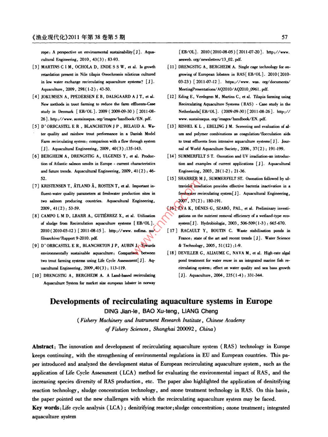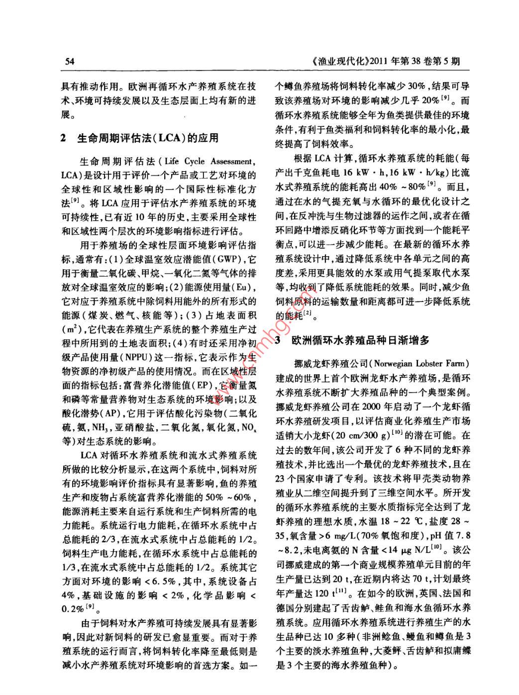 《漁業(yè)現(xiàn)代化》2011年第38卷第5期53歐洲循環(huán)水養(yǎng)殖系統(tǒng)研究進(jìn)展丁建樂(lè),鮑旭騰,梁澄(中國(guó)水產(chǎn)科學(xué)研究院漁業(yè)機(jī)械儀器研究所,上海200092)摘要:歐洲循環(huán)水養(yǎng)殖系統(tǒng)技術(shù)隨著歐盟和歐洲各國(guó)環(huán)保法規(guī)的加強(qiáng)而不斷創(chuàng)新和發(fā)展。本文對(duì)歐洲正在使用生命周期法對(duì)循環(huán)水養(yǎng)殖進(jìn)行環(huán)境影響評(píng)估的狀況,以及歐洲應(yīng)用獨(dú)特的循環(huán)水養(yǎng)殖系統(tǒng)技術(shù)增加了養(yǎng)殖的品種進(jìn)行了介紹和分析。并著重介紹了歐洲循環(huán)水養(yǎng)殖系統(tǒng)新技術(shù)的應(yīng)用及其發(fā)展?fàn)顩r,特別闡述了脫硝反應(yīng)技術(shù)、淤泥濃縮技術(shù)和臭氧技術(shù)等新技術(shù)在循環(huán)水養(yǎng)殖系統(tǒng)的應(yīng)用情況。在此基礎(chǔ)上,指出了循環(huán)水養(yǎng)殖可能面臨的新挑戰(zhàn)。關(guān)鍵詞:循環(huán)水養(yǎng)殖系統(tǒng);生命周期評(píng)估法;脫硝反應(yīng)器;淤泥濃縮;臭氧處理;歐洲水產(chǎn)養(yǎng)殖中圖分類號(hào):S969.38文獻(xiàn)標(biāo)識(shí)碼:A文章編號(hào):10079580(2011)055305的換水量約為9000L5。1概述據(jù)報(bào)道,歐洲水產(chǎn)孵化生產(chǎn)也正轉(zhuǎn)向使用循環(huán)水養(yǎng)殖系統(tǒng)( Recirculating Aquaculture循環(huán)水養(yǎng)殖系統(tǒng)。在法羅群島,00年以后,大System,RAS)是一種將系統(tǒng)中的水經(jīng)過(guò)處理后重西洋二齡鮭魚已全部從流水式養(yǎng)殖生產(chǎn)轉(zhuǎn)向循環(huán)都是為了在滿足養(yǎng)殖系統(tǒng)對(duì)廢物控制要求的前提b生產(chǎn)其養(yǎng)成尺寸也從流水式養(yǎng)殖系統(tǒng)中復(fù)使用的養(yǎng)殖系統(tǒng)。系統(tǒng)中的每一步水處理水養(yǎng)~70g增加到循環(huán)水養(yǎng)殖系統(tǒng)中的140下,減少系統(tǒng)的水交換量。按不同的水交換率分108這種轉(zhuǎn)向的原因來(lái)自于:(1)預(yù)計(jì)未來(lái)可類養(yǎng)殖系統(tǒng)又可分為流水式( low through)養(yǎng)殖能存在水源短缺,用水質(zhì)量會(huì)有所降低,以及水的系統(tǒng)(每投喂1kg飼料換水量>50m3)、水再利季節(jié)性溫差大等因素;(2)用循環(huán)系統(tǒng)生產(chǎn)的二用(re-ue)養(yǎng)殖系統(tǒng)(每投喂1kg飼料換水量1齡鮭魚質(zhì)量更佳(轉(zhuǎn)到海中養(yǎng)殖后生長(zhǎng)和存活情50m3)和傳統(tǒng)型循環(huán)水養(yǎng)殖系統(tǒng)(每投喂1kg況好)切。在挪威,采用循環(huán)水養(yǎng)殖系統(tǒng)生產(chǎn)的二齡鮭魚預(yù)計(jì)將達(dá)8500萬(wàn)尾1。飼料換水量01~1.0m3),以及下一代( next gen目前,采用循環(huán)水養(yǎng)殖系統(tǒng)的歐洲國(guó)家越來(lái)eration))或創(chuàng)新型( Innovative)循環(huán)水養(yǎng)殖系統(tǒng)越多。但總體而言,與網(wǎng)箱養(yǎng)殖、流水式養(yǎng)殖或池(每投喂1kg飼料換水量<01m3)2)。塘養(yǎng)殖等養(yǎng)殖方式相比,循環(huán)水養(yǎng)殖系統(tǒng)在歐洲歐洲建立起循環(huán)水養(yǎng)殖生產(chǎn)技術(shù)的國(guó)家主要的應(yīng)用仍顯緩慢。循環(huán)水養(yǎng)殖方式對(duì)養(yǎng)殖生產(chǎn)的是荷蘭和丹麥。在荷蘭,幾乎全封閉的、典型的室貢獻(xiàn)份額仍只占小部分。原因之一是建設(shè)循環(huán)水內(nèi)循環(huán)水養(yǎng)殖系統(tǒng)(每投喂1kg飼料每天換水30養(yǎng)殖系統(tǒng)需要高昂的初期資金投入;另一重要原300L),主要用于生產(chǎn)淡水品種的非洲鯰魚因是如何控制系統(tǒng)中魚類疾病的爆發(fā)。和鰻魚;丹麥則是室外的半封閉式的循環(huán)水養(yǎng)殖隨著歐洲各國(guó)環(huán)保法規(guī)的愈加嚴(yán)厲,歐盟水系統(tǒng),主要用于鱒魚的養(yǎng)成生產(chǎn),投喂千克飼料的管理法令的頒布實(shí)施歐洲循環(huán)水養(yǎng)殖系統(tǒng)的研換水量約3900L,是傳統(tǒng)鱒魚養(yǎng)殖換水率的1/發(fā)和應(yīng)用也得到了很好的創(chuàng)新和發(fā)展。盡管歐盟134。而在法國(guó),按照丹麥模式循環(huán)水養(yǎng)殖系統(tǒng)水管理法令并沒(méi)有直接涉及水產(chǎn)養(yǎng)殖業(yè)的條款建造運(yùn)行的一個(gè)鱒魚養(yǎng)殖場(chǎng),投喂千克飼料每天但它對(duì)促進(jìn)環(huán)境友好型水產(chǎn)養(yǎng)殖生產(chǎn)系統(tǒng)的發(fā)展收稿日期:20110821修回日期:201109-10基金項(xiàng)目:國(guó)家鲆鰈類產(chǎn)業(yè)技術(shù)體系( nyhyzx50)作者簡(jiǎn)介:丁建樂(lè)(1963-)男,工程師,主要從事漁業(yè)裝備信息研究。E-mail;dingjian@fmin.ac.cn《漁業(yè)現(xiàn)代化》2011年第38卷第5期具有推動(dòng)作用。歐洲再循環(huán)水產(chǎn)養(yǎng)殖系統(tǒng)在技個(gè)鱒魚養(yǎng)殖場(chǎng)將飼料轉(zhuǎn)化率減少30%,結(jié)果可導(dǎo)術(shù)、環(huán)境可持續(xù)發(fā)展以及生態(tài)層面上均有新的進(jìn)致該養(yǎng)殖場(chǎng)對(duì)環(huán)境的影響減少幾乎20%9。而展循環(huán)水養(yǎng)殖系統(tǒng)能夠全年為魚類提供最佳的環(huán)境2生命周期評(píng)估法(LCA)的應(yīng)用條件,有利于魚類福利和飼料轉(zhuǎn)化率的最小化,最終提高了飼料效率。生命周期評(píng)估法( Life Cycle Assessment,根據(jù)LCA計(jì)算,循環(huán)水養(yǎng)殖系統(tǒng)的耗能(每LCA)是設(shè)計(jì)用于評(p