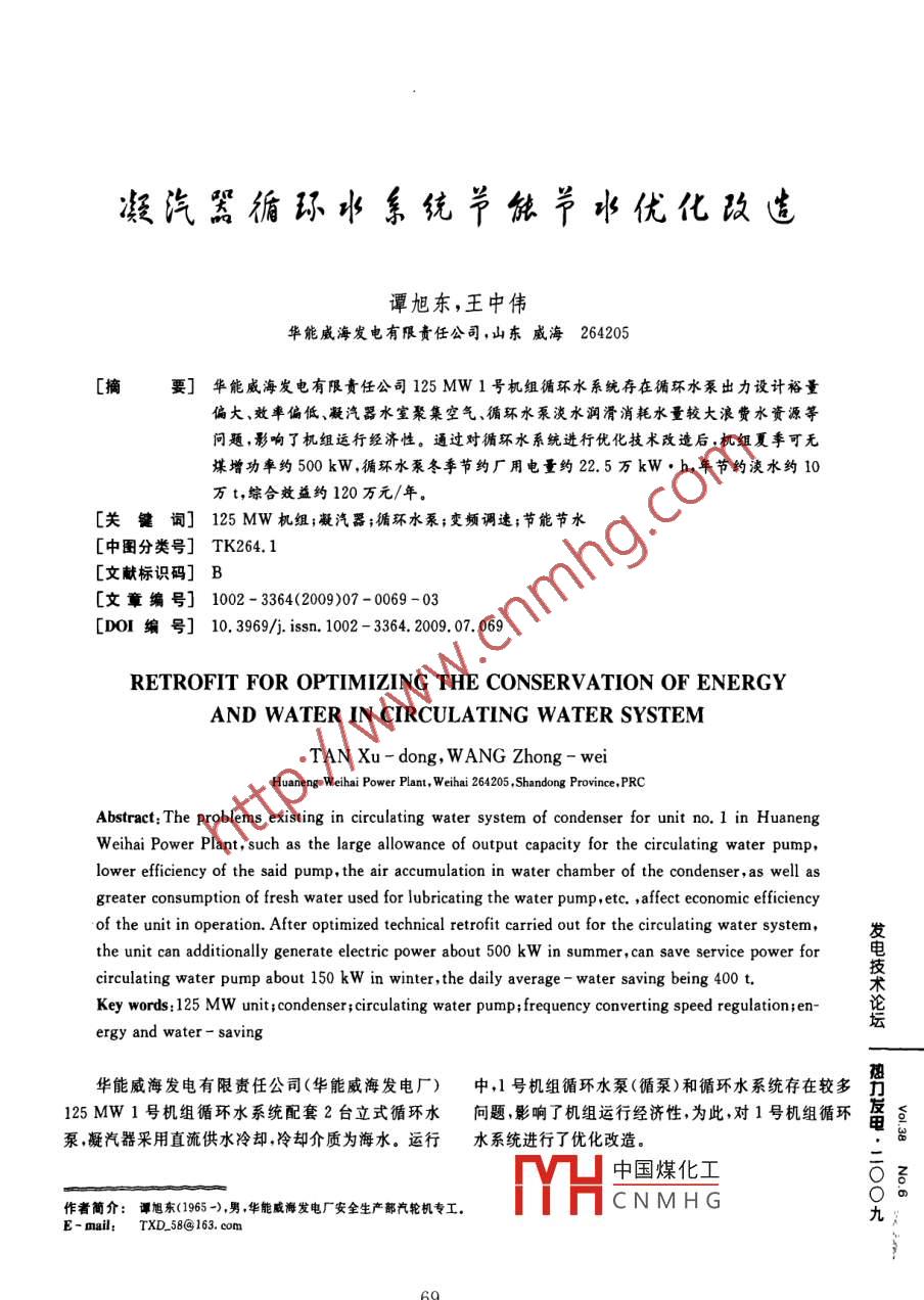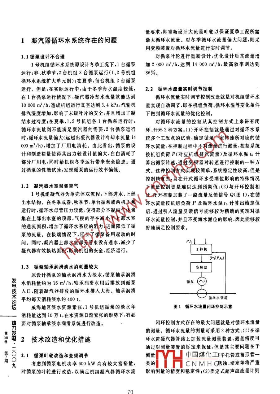 凝汽器循環(huán)水系統(tǒng)節(jié)能節(jié)水優(yōu)化改遣譚旭東,王中偉華能威海發(fā)電有限責(zé)任公司,山東威海264205[摘要]華能威海發(fā)電有限責(zé)任公司 125 MW 1號機(jī)組循環(huán)水系統(tǒng)存在循環(huán)水泵出力設(shè)計裕量偏大、效率偏低、凝汽器水室聚集空氣、循環(huán)水泵淡水潤滑消耗水量較大浪費(fèi)水資源等問題,影響了機(jī)組運(yùn)行經(jīng)濟(jì)性。通過對循環(huán)水系統(tǒng)進(jìn)行優(yōu)化技術(shù)改造后,機(jī)組夏季可無煤增功率約500 kW,循環(huán)水泵冬季節(jié)約廠用電量約22.5萬kW●h,年節(jié)約淡水約10萬t,綜合效益約120萬元/年。[關(guān)鍵詞] 125 MW機(jī)組;凝汽器;循環(huán)水泵;變頻調(diào)速;節(jié)能節(jié)水[中圖分類號] TK264.1[文獻(xiàn)標(biāo)識碼] B[文章編號] 1002 - 3364(2009)07 - 0069 - 03[D0I編號10. 3969/j. issn. 1002 - 3364.2009. 07. 069RETROFIT FOR OPTIMIZING THE CONSERVATION OF ENERGYAND WATER IN CIRCULATING WATER SYSTEMTAN Xu - dong, W ANG Zhong - weiHuaneng Weihai Power Plant, Weihai 264205 ,Shandong Province,PRC ;Abstract: The problems existing in circulating water system of condenser for unit no. 1 in HuanengWeihai Power Plant, such as the large allowance of output capacity for the circulating water pump,lower efficiency of the said pump, the air accumulation in water chamber of the condenser,as well asgreater consumption of fresh water used for lubricating the water pump , etc. ,affect economic efficiencyof the unit in operation. After optimized technical retrofit carried out for the circulating water system,發(fā)the unit can additionally generate electric power about 500 kW in summer, can save service power for電circulating water pump about 150 kW in winter , the daily average - water saving being 400 t.Key words:125 MW unit ; condenser ;circulating water pump; frequency converting speed regulation;en-診ergy and water - saving華能威海發(fā)電有限責(zé)任公司(華能威海發(fā)電廠)中,1 號機(jī)組循環(huán)水泵(循泵)和循環(huán)水系統(tǒng)存在較多恐125MW1號機(jī)組循環(huán)水系統(tǒng)配套2臺立式循環(huán)水.問題,影響了機(jī)組運(yùn)行經(jīng)濟(jì)性,為此,對1號機(jī)組循環(huán)備查泵,凝汽器采用直流供水冷卻,冷卻介質(zhì)為海水。運(yùn)行水 系統(tǒng)進(jìn)行了優(yōu)化改造。中國煤化工作者簡介:譚旭東(1965 -),男,華能威海發(fā)電廠安全生產(chǎn)部汽輪機(jī)專工。YHCNMHG九;E- mail;TXD_ 58@ 163. com69量要求,即重新設(shè)計大流量葉輪以保證夏季工況所需1凝汽器循環(huán)水系統(tǒng)存在的問題最大循環(huán)水流量。對冬季循環(huán)水流量偏大問題,則采用變頻裝置對循環(huán)水流量進(jìn)行實時調(diào)節(jié)。1.1循泵設(shè)計不合理對循泵葉輪進(jìn)行重新設(shè)計,優(yōu)化設(shè)計后其流量增.1號機(jī)組循環(huán)水系統(tǒng)原設(shè)計冬季工況下,1臺循泵加2 000 m'/h,達(dá)到14 000 m*/h,最高效率則達(dá)到運(yùn)行;春、秋季節(jié),2臺機(jī)組3臺循泵運(yùn)行(1.2號機(jī)組36%。循環(huán)水系統(tǒng)擴(kuò)大單元制);在夏季,每臺機(jī)組2臺循泵運(yùn)行。但是,在實際運(yùn)行中,由于冬季海水溫度較低,2.2循環(huán)水流實時調(diào)節(jié)控制在1臺循泵運(yùn)行情況下,凝汽器冷卻水流量就能達(dá)到循環(huán)水流量實時調(diào)節(jié)控制改造就是對機(jī)組循環(huán)水10 000 m3 /h,造成機(jī)組運(yùn)行真空達(dá)到3. 4 kPa,汽輪機(jī)量實現(xiàn)自動調(diào)節(jié),即在機(jī)組負(fù)荷、循環(huán)水溫等變化條件排汽濕度增加,影響了末級葉片的安全,并且增加了凝下做到循環(huán)水流量的優(yōu)化控制。結(jié)水過冷度;在夏季,1.2號機(jī)組各1臺循泵運(yùn)行時,對循環(huán)水流量的控制從其控制方式上來講有閉循環(huán)水流量則不能滿足凝汽器的需要,2臺循泵運(yùn)行環(huán)、開環(huán)2種方案:(1)開環(huán)控制就是通過對循環(huán)水系時,循環(huán)水流量偏大(遠(yuǎn)超出凝汽器設(shè)計冷卻水流量14統(tǒng)多個工況點的試驗,確定循泵一定轉(zhuǎn)速所對應(yīng)的循000 m*/h),增加了廠用電消耗。由此看出,循泵的設(shè)環(huán)水流量,在控制過程中不對流量進(jìn)行測量,控制系統(tǒng)計和制造裕量使得其出力較設(shè)計值偏大,白白消耗了按機(jī)組負(fù)荷P(對應(yīng)機(jī)組排汽流量)及循環(huán)水溫to計部分廠用電,同時給機(jī)組冬季運(yùn)行帶來安全隱患。通算出循泵轉(zhuǎn)速,通過變頻器對轉(zhuǎn)速進(jìn)行控制的一種方過循泵的性能試驗,發(fā)現(xiàn)循泵的運(yùn)行效率偏低。式。這種控制方式實現(xiàn)較簡單,系統(tǒng)穩(wěn)定性較高,但是控制精度差,且在開式循環(huán)水受潮位影響的特殊情況1.2 凝汽器水室聚集空氣下流量控制更是難以達(dá)到預(yù)期值;(2)與開環(huán)控制相1號機(jī)組凝汽器為單殼體雙流程,下部進(jìn)水、上部.比,閉環(huán)控制加裝了一路流量反饋信號Q(圖1),在循.出水結(jié)構(gòu)。在冬季或春、秋季節(jié),單臺循泵或兩機(jī)3泵環(huán)水流量按機(jī)組負(fù)荷P及循環(huán)水溫t。計算出給定值運(yùn)行時,循環(huán)水母管壓力較低,使得部分不凝結(jié)氣體聚后,通過引人流量反饋信號能夠較為精確的實現(xiàn)對循集在上部出水室的頂部,氣楔的存在減小了上部水室環(huán)水流量控制,并且不受海水潮位的影響,