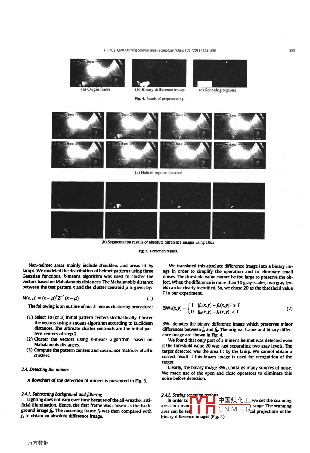 Mining Science and Technology( China)21(2011)553-556Contents lists available at Science Direct氵M(jìn)ining Science and Technology( China)ELSEVIERjournalhomepagewww.elsevier.com/locate/mstcA method for detecting miners based on helmets detection in undergroundcoal mine videosCai Limei" Qian JianshengSchool of Information and Electrical Engineering. China University of Mining 8 Technology, Xuzhou 221116, ChinaARTICLE INFOA BSTRACTIn order to monitor dangerous areas in coal mines automatically, we propose to detect helmets fromReceived in revised form 18 January 2011underground coal mine videos for detecting miners. This method can overcome the impact of similarityAccepted 16 February 2011between the targets and their background. We constructed standard images of helmets, extracted fourAvailable online 10 August 2011directional features, modeled the distribution of these features using a Gaussian function and separatedlocal images of frames into helmet and non-helmet classes, Out experimental results show that thismethod can detect helmets effectively. The detection rate was 83.7%Human detectiono 2011 Published by Elsevier B V on behalf of China University of Mining TechnologyHelmet detectionmage pattern recognition1 Introductionwith videos. This problem is difficult to deal with when the targetsare occluded or similar to the background, conditions prevalent inThere are several dangerous areas in coal mines, such as areas underground coal mines [31with harmful gas, inclined laneways in which winches are moving The characteristics of coal mine videos are affected by all-or equipment rooms, where miners are not allowed. But the lane- weather artificial illumination and the conditions of undergroundways crisscross and are like a maze. warnings in the form of signs laneways, such as: (1)low illumination: artificial illumination difor alarm bells are insufficient. It is important to monitor these fers from the natural light and is clearly low(2)uneven lightingareas effectively. Infrared methods to detect the direction and where illumination is strong near the object to be illuminatednumber of miners are available [1]. But, the technique of identifi- but obviously insufficient far away from it, hence the outline ofcation and human positioning must also be used if we want to an object is indistinct (3)a lack of color information in imageknow the identity and location of miners [2 ). The application of a processing: there are only black, white or gray tones in coal minesmonitoring system is restricted because of its complexity. These except for some equipment; (4)the color of mine clothing is darkdays, most coal mines have been equipped with video monitor sys- blue or dark gray which is similar to the background in low illumi-tems. If miners can be detected using videos and the system can nation. Sometimes, we need to pay more attention to the videos forsound the alarm on time and control linkages automatically. many recognizing miners: (5)cameras are usually installed on lanewayaccidents can be avoided. At the same time, we can obtain much walls, often only a little higher than the height of a person, whereuseful and important information for safety in production. There videos of miners usually do not show them whole-length orare many methods for detection of people which in general can upright, hence the methods described by various authors cannotbe divided into two categories: approaches based on motion detec- be used directly [4-8, 11-14]tion such as background subtraction, frame difference or opticahese conditions make it more difficult to detect miners in coaflow techniques, and approaches that detect people directly from mine videos and cause the results of traditional detection methodsstatic images (3]. The second category approaches are designed to be unsatisfactoryto classify and distinguish people from inanimate objects [4-8)We propose a method to detect the helmet of miners. MinersThese approaches can also be used with videos [9, 10]. Although are obliged to wear a helmet when working underground whichthey have been studied for a long time, there are no robust and fast because of their material, reflect light. the upper parts of a helmetmoving target detection methods because of various interferences in images are usually different from their background. If a helmetding author. Tel. +86 13775892667Our presentection 2 our methodE-mailaddress:Imcai1977@163.com(LCai).to detect mine中國(guó)煤化工ribed and analyzedCNMHG1674-5264/s-see front matter 0 2011 Published by Elsevier B V, on behalf of China University of Miningdoi:10.1016 J.mstc.2011.06016L Cai, J. Qian/Mining Science and Technology( China)21(2011)553-556△o●DQo●畫·畫A(a)Helmet images(b) Non-helmet imagesFig. 1. Examples of images used in training.Section 3 shows our experimental results and we present our conclusions in Section 4PreprocessingSubtract2. Method to detect minersFilterocal imagWe constructed standard images of helmets, extracted fourdirectional features. modeled the distribution of these featuresusing a Gaussian function, designed the classifier, and separated lo-Extraccal images of frames into a helmet and a non-helmet class fromOutputfeatureswhich we detected the miners2.1. Collecting training samplesFig 3. Detection flowchart.The helmets used in coal mines are mainly of two shapes: those non-helmet training data In the end, there were 961 non-helmetwith a small visor and those without. We constructed two kinds ofhelmet images from different viewpoints. The helmet was inclined Images in the training sample set. Some images used in trainingwere0°,±10°,±20°,±30°and±90. The vertical directions of thesepoints changed from 0o to 90 by 3. These directions contained all 2.2. Extracting featurespossible situations in the actual environment. We constructed2100 standard helmet images in all. They were normalizedIllumination is always placed on the top of laneways. the uppercoal mine videos using the b