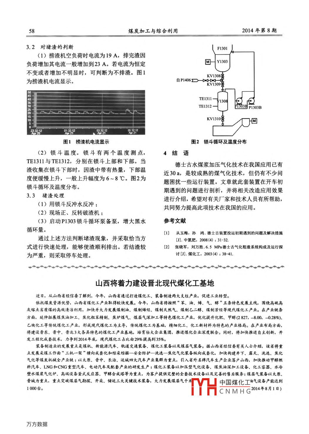 煤炭加工與綜合利用COAL PROCESSING & COMPREHENSIVE UTILIZATIONNo.8, 2014德士古氣化爐開(kāi)車初期出現(xiàn)的問(wèn)題及解決方法孟宏偉(中國(guó)石化長(zhǎng)城能源化工(寧夏)有限公司甲醇運(yùn)行部,寧夏銀川750411 )摘要:中國(guó)石化長(zhǎng)城能源化工(寧夏)有限公司德士古氣化裝置開(kāi)車初期出現(xiàn)了一些問(wèn)題,嚴(yán)重影響整個(gè)系統(tǒng)的安全、穩(wěn)定、長(zhǎng)周期運(yùn)行。就所存在的問(wèn)題進(jìn)行分析,并給出解決方法,在實(shí)際生產(chǎn)中收到良好效果。關(guān)鍵詞:德士古;氣化爐: 開(kāi)車;技術(shù)措施中圖分類號(hào): TQ545文獻(xiàn)標(biāo)識(shí)碼: A文章編號(hào): 1005-8397 (2014) 08-0056-03中國(guó)石化長(zhǎng)城能源化工(寧夏)有限公司甲入口管線被堵死,葉輪處卡有較大塊的渣,粒度醇運(yùn)行部有3套德士古氣化裝置,采用美國(guó)GE約為10~ 15 mm。,公司水煤漿氣化工藝,激冷流程生產(chǎn)粗煤氣。該1.2 原因及措施工藝中將原料煤與水在濕式棒磨機(jī)中研磨成固含粗渣粒度較大的原因主要受煤質(zhì)的影響,灰量58% ~ 62%的水煤漿,用高壓煤漿泵加壓后送渣粒度較大。另外,操作溫度較低,熔渣的流動(dòng)入氣化爐,與空分裝置生產(chǎn)的氧氣混合,在加壓性較差,在激冷室冷卻時(shí)形成塊渣,經(jīng)破渣機(jī)破的狀態(tài)下發(fā)生部分氧化反應(yīng),生成H2、 CO、CO2碎后形成粒度較大的粗渣。為此提出以下解決方和H2O以及H2S、CH等氣體。由于氣化溫度較法:①在渣水側(cè)管線入口焊接篦子板,過(guò)濾掉高(1250 "C左右),大部分煤灰渣呈熔融態(tài)流出,較大粒度的灰渣,并由撈渣機(jī)撈出;②將溢流閥在氣化爐底部用激冷水降溫后凝固,經(jīng)過(guò)鎖斗排的打開(kāi)時(shí)間由原來(lái)的5min延長(zhǎng)到10min,延長(zhǎng)入渣池,粗渣用撈渣機(jī)撈出后送出廠外,黑水系了渣在渣水側(cè)的沉降時(shí)間;③提高操作溫度,甲統(tǒng)經(jīng)過(guò)四級(jí)閃蒸進(jìn)行回收。此套裝置于2014年1烷含量由原來(lái)的800ug/g降低至300ug/g。經(jīng)采月17日- -次性投料試車成功, 在運(yùn)行初期暴露出取以上措施后,效果較明顯,大大提高了渣池泵來(lái)的問(wèn)題較多,開(kāi)停車頻繁,勞動(dòng)量較大,運(yùn)行穩(wěn)定運(yùn)行周期,在停車檢修時(shí)再打開(kāi)清理就能滿周期短?,F(xiàn)就開(kāi)車初期遇到的影響連續(xù)生產(chǎn)的問(wèn)足生產(chǎn)。題進(jìn)行分析及探討。2鎖斗沖洗水管線震動(dòng)1渣池泵入口管線 易堵2.1現(xiàn)象及危害1.1 現(xiàn)象及危害鎖斗沖洗水在鎖斗排渣閥打開(kāi)前啟動(dòng),在排灰渣經(jīng)鎖斗收集后排到渣池,粗渣由撈渣機(jī)渣過(guò)程中起到?jīng)_洗的作用,有助于排渣。而沖洗撈出,黑水經(jīng)物理沉降后由渣池泵送出。但經(jīng)過(guò)水閥在關(guān)閉時(shí),鎖斗沖洗水流瞬間停止,造成水較短的運(yùn)行時(shí)間后即發(fā)現(xiàn),渣池液位逐漸升高,擊及單向閥回坐,引起沖洗水管線震動(dòng)。 在實(shí)際直至溢流,渣池泵不打量。經(jīng)檢查發(fā)現(xiàn),渣池泵生產(chǎn)中,減慢沖洗水閥關(guān)閉速度此現(xiàn)象會(huì)有所好轉(zhuǎn),但既影響閥門(mén)壽命,也不能完全消除管線震收稿日期: 2014-08-05作者簡(jiǎn)介:孟宏偉(1986- -),男,內(nèi)蒙古鄂爾多斯人,2006年動(dòng)。很多裝置在沖洗水管線增加了金屬軟管或膨畢業(yè)于內(nèi)蒙古石油化工學(xué)院化學(xué)工程與工藝專業(yè),中國(guó)石化長(zhǎng)域能脹節(jié),起中國(guó)煤化工:了金屬軟管、源化工(寧夏)有限公司助理工程師。膨脹節(jié)也會(huì)MYHCN MH G原化工(寧夏)2014 年第8期孟宏偉:德士古氣化爐開(kāi)車初期出現(xiàn)的問(wèn)題及解決方法57有限公司自裝置運(yùn)行以來(lái),A、B爐的金屬軟管煤種,否則很容易堵渣。當(dāng)煤種更換時(shí),要先摻燒,均已更換過(guò)。緩慢過(guò)度到新煤種,做好分析,及時(shí)調(diào)整。其次,2.2原因及措施煤漿濃度、煤漿粒度、煤漿粘度也會(huì)影響到氣化在鎖斗出口管線末端做縮徑處理,在不影響爐的穩(wěn)定運(yùn)行。所以,煤漿濃度應(yīng)保持穩(wěn)定,大排渣的前提下減緩了沖洗水的流動(dòng)速度,有效緩約在58%一~ 62%。要及時(shí)、準(zhǔn)確分析濃度,并及解了管線震動(dòng),提高了金屬軟管的使用壽命。時(shí)調(diào)整氧/煤比,否則爐溫、產(chǎn)氣量都會(huì)發(fā)生變化,造成工況不穩(wěn)定,從而堵渣。3關(guān)于 堵渣的理解與解決煤漿粒度的影響:煤漿粒度要均勻,要求煤自裝置開(kāi)車以來(lái),因堵渣而被迫停車共計(jì)4漿制備的鋼棒及時(shí)調(diào)配更換。如果煤漿粒度不均,次。進(jìn)而縱觀全國(guó)德士古煤化工企業(yè),發(fā)現(xiàn)影響會(huì)加大燒嘴的磨蝕,形成偏噴或霧化不好,渣中長(zhǎng)周期運(yùn)行的一個(gè)最經(jīng)常的問(wèn)題就是堵渣問(wèn)題。既有沒(méi)反應(yīng)的殘?zhí)浚灿泻噶鰻畹拇髩K,渣的狀所以,了解渣堵的機(jī)理及原因,如何避免渣堵,態(tài)比較復(fù)雜。如何處理堵渣,是擺在煤化工企業(yè)面前的一個(gè)非3.1.2爐溫、 氧/煤比對(duì)堵渣的影響?,F(xiàn)實(shí)的課題。.(1)爐溫控制太低,達(dá)不到熔融溫度,霧3.1渣堵的影響因素化效果不好,渣的流動(dòng)性就會(huì)太差,并有很多