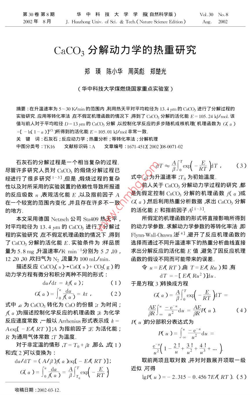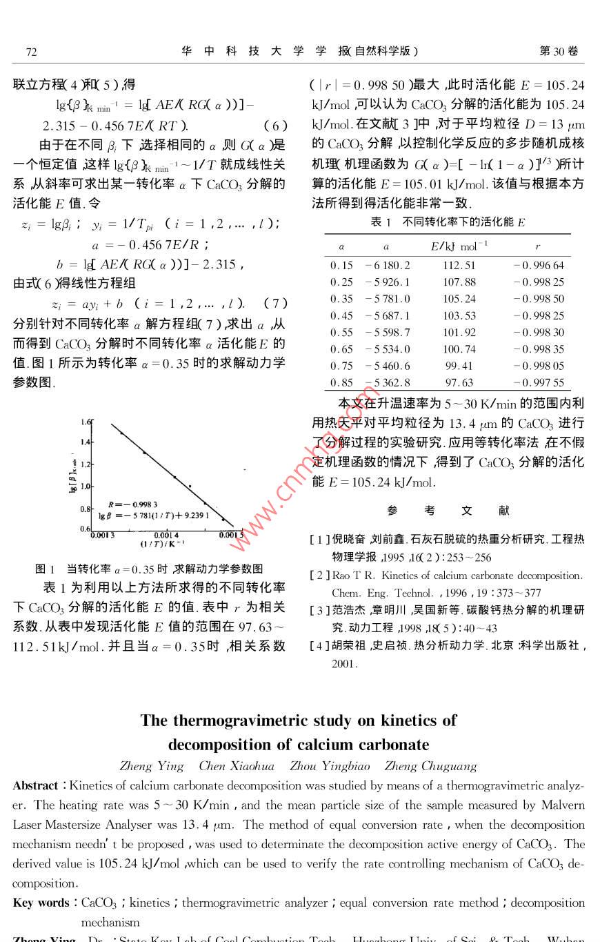 第30卷第8期華中科技大學(xué)學(xué)報(自然科學(xué)版)Vol.30 No.82002年8月J. Huazhong Univ. of Sei. & Tech.( Nature Science Edition)Aug.2002CaCO;分解動力學(xué)的熱重研究鄭瑛陳小華周英彪鄭楚光(華中科技大學(xué)煤燃燒國家重點實驗室)摘要:在升溫速率為5~ 30 K/min的范圍內(nèi)利用熱天平對平均粒徑為13. 4 pm的CaCO;進行了分解過程的實驗研究.應(yīng)用等轉(zhuǎn)化率法在不假定機理函數(shù)的情況下得到了CaCO,分解的活化能E= 105.24 kJ/mol.該值與前人對于平均粒徑D=13pum的CaCO;分解,以控制化學(xué)反應(yīng)的多步隨機成核機理(機理函數(shù)為G(a)=[ -( 1-a )]'3 )所得到的活化能E= 105.01 kJ/mol非常一 致.關(guān)鍵 詞:石灰石;反應(yīng)動力學(xué);熱重分析;等轉(zhuǎn)化率法;分解機理中圖分類號:TK16文獻標識碼:A文 章編號:1671-4512 2002 )8-0071-02石灰石的分解過程是--個相當復(fù)雜的過程.盡管許多研究人員對CaCO,的煅燒分解過程已dT≈4,x(- 最)r,(3)經(jīng)進行了很多研究1~3] ,但是煅燒過程的復(fù)雜式中,β為升溫速率;To為初始溫度.性以及對所采用的實驗裝置的依賴性導(dǎo)致所報道前人關(guān)于CaCO3分解動力學(xué)過程的研究都的反應(yīng)級數(shù)n ,表觀活化能E ,以及指前因子A是先假定控制CaCO3分解的機理函數(shù)f(a)或在一個較寬的范圍內(nèi)變化,并且存在許多不-致G( a )然后利用熱重分析數(shù)據(jù),求出CaCO;分解.的地方.的活化能E和指前因子A[1-3].本文采用德國Netzsch 公司Sta409 熱天平,所假定的機理函數(shù)的形式將直接影響所得到對平均粒徑為13. 4 pm的CaCO,進行了分解過的動力學(xué)參數(shù).求解動力學(xué)參數(shù)的等轉(zhuǎn)化率法即程的實驗研究在不假定機理函數(shù)的情況下得到Flynn-Wall-Ozawa法4] ,避開了反應(yīng)機理函數(shù)的了CaCO;分解的活化能E.實驗條件為:樣品質(zhì)選擇而通過不同升溫速率下的熱重分析曲線直接量為5.8mg升溫速率/K min 分別為5,7 ,10,求出分解反應(yīng)的活化能E值避免了因反應(yīng)機理12 20 30吹掃氣為N2流量為100 mL/min.函數(shù)的假設(shè)不同而可能帶來的誤差.描述反應(yīng)CaCO3(s)→CaO(s)+ CO2(g)的令u=E/(RT),由T=E/(Ru)知有動力學(xué)方程有微分和積分兩種不同的形式:dT =-[ E/( Ru2 )]u.da/dt = kf(a );(1)于是方程( 3轉(zhuǎn)換成方程G(a)=JoJ(a)(2)G(a)=4含]exr( -最)r=式中a為CaCO;轉(zhuǎn)化為CaO的份額;t為時間;( a )為描述控制化學(xué)反應(yīng)的機理函數(shù)k為化學(xué)-du = RPu).(4)反應(yīng)速度常數(shù), -般以Arrhenius形式表示成k=P( u )的分部積分表達式為Aexp[ - EK RT )];A為指前因子E為活化能;P(u)=|"二號-du=R為通用氣體常數(shù);T為溫度.對于非定溫的情形,T= To+βt那么式1)品( I2!+ 3!+ 4!和式2 )可以變換為:da/dT =( A/β)( a )exp[- E/( RT )];取前兩項且取對數(shù),并對對數(shù)展開項取一級了。出= x( -i”. da= A|品}近似,可得.IgP( u)=- 2.315- 0.4567E/( RT). (5)收稿8期:2002-03-12.72華中科技大學(xué)學(xué)報(自然科學(xué)版)第30卷聯(lián)立方程(4 )和5)得.(|r|=0.998 50 )最大,此時活化能E= 105.24lg{β} min' = lg[ AE/( RG(a ))]-kJ/mol可以認為CaCO,分解的活化能為105.242.315 - 0.456 7E/( RT ).(6)kJ/mol.在文獻[ 3 ]中,對于平均粒徑D= 13 pum由于在不同B;下選擇相同的a則G(a)是的CaCO3分解以控制化學(xué)反應(yīng)的多步隨機成核- -個恒定值這樣lg{βkmin-1~1/ T就成線性關(guān)機理機理函數(shù)為G(a)=[ -Ir( 1-a )]/3 )所計系從斜率可求出某一轉(zhuǎn)化率 a下CaCO;分解的算的活化能E = 105. 01 kJ/mol.該值與根據(jù)本方活化能E值.令:法所得到得活化能非常- - 致.z;=lgB;;y;1/Tpi (i= 1 ,2.... ,l);表1不同轉(zhuǎn)化率下的活化能Ea =-0.4567E/R ;E/kJ mol : 1b = ld AE/( RG(a ))]- 2.315 ,0.15 - 6 180.2112.51-0. 996 64由式6得線性方程組0.25一5926.1107. 88-0. 998 25z;= ay;+b (i= 1 ,2... ,l). (7)0.35一 5781.0105.24-0.998500.45 - 5 687.1103. 53-0.99825分別針對不同轉(zhuǎn)化率a解方程組(7),求出a,從0.55一 5598.7101. 92-0.99830而得到CaCO3分解時不同轉(zhuǎn)化率a活化能E的0.65 -5534.0100. 74-0.998 35值.圖1所示為轉(zhuǎn)化率a= 0.35時的求解動力學(xué)0.75-5460.699.41-0.99805參數(shù)圖.0.85-5362.897.63-0.99755本文在升溫速率為5~30K/min的范圍內(nèi)利用熱天平對平均粒徑為13.4 um的CaCO3進行14了分解過程的實驗研究.應(yīng)用等轉(zhuǎn)化率法在不假定機理函數(shù)的情況下得到了CaCO;分解的活化10-能E= 105.24 kJ/mol.0.8+. R=-0.9983參考文獻lgB =- 5781/7)+ 9.239 10.0013-0.00140.005[1 ]倪曉奮劉前鑫.石灰石脫硫的熱重分析研究.工程熱(1/7)/K物理學(xué)報,1995 16( 2):253 ~256圖1當轉(zhuǎn)化率a=0.35時求解動力學(xué)參數(shù)圖.[2]RaoT R. Kinetics of calcium carbonate deomposition.表1為利用以上方法所求得的不同轉(zhuǎn)化率Chem. Eng. Technol. , 1996 , 19 :373~ 377下CaCO;分解的活化能E的值.表中r為相關(guān)[3]范浩杰章明川,吳國新等.碳酸鈣熱分解的機理研系數(shù).從表中發(fā)現(xiàn)活化能E值的范圍在97.63~究.動力工程,1998 185):40~43112.51kJ/mol.并且當a=0.35時,相關(guān)系數(shù)[4]胡榮祖,史啟禎.熱分析動力學(xué).北京科學(xué)出版社,2001.The thermogravimetric study on kinetics ofdecomposition of calcium carbonateZheng YingChen XiaohuaZhou YingbiaoZheng ChuguangAbstract : Kinetics of calcium carbonate decomposition was studied by means of a thermogravimetric analyz-er. The heating rate was 5 ~ 30 K/min , and the mean particle size of the sample measured by MalvernLaser Mastersize Analyser was 13.4 pum. The m