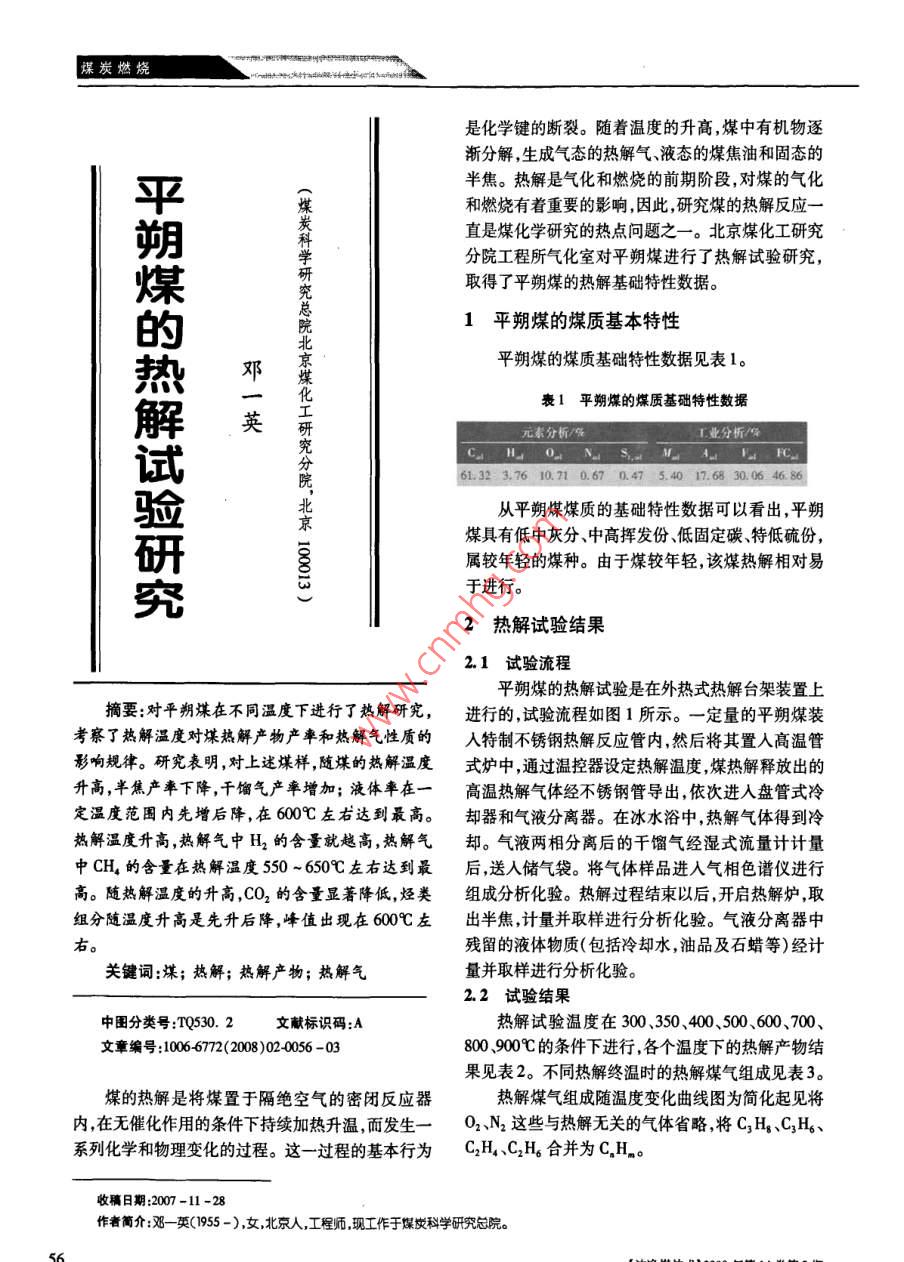 是化學(xué)鍵的斷裂。隨著溫度的升高煤中有機(jī)物逐漸分解,生成氣態(tài)的熱解氣、液態(tài)的煤焦油和固態(tài)的半焦。熱解是氣化和燃燒的前期階段,對(duì)煤的氣化和燃燒有著重要的影響,因此,研究煤的熱解反應(yīng)直是煤化學(xué)研究的熱點(diǎn)問(wèn)題之一。北京煤化工研究平朔煤的熱解試驗(yàn)研究分院工程所氣化室對(duì)平朔煤進(jìn)行了熱解試驗(yàn)研究,鄧煤炭科學(xué)研究總院北京煤化工研究分院北京取得了平朔煤的熱解基礎(chǔ)特性數(shù)據(jù)。1平朔煤的煤質(zhì)基本特性平朔煤的煤質(zhì)基礎(chǔ)特性數(shù)據(jù)見(jiàn)表1。表1平朔煤的煤質(zhì)基礎(chǔ)特性數(shù)據(jù)英元素分析%工業(yè)分析61.323.7610.710.670.475.4017.6830.064686從平朔煤煤質(zhì)的基礎(chǔ)特性數(shù)據(jù)可以看出,平朔煤具有低中灰分、中高揮發(fā)份、低固定碳、特低硫份,屬較年輕的煤種。由于煤較年輕,該煤熱解相對(duì)易進(jìn)行2熱解試驗(yàn)結(jié)果2.1試驗(yàn)流程平朔煤的熱解試驗(yàn)是在外熱式熱解臺(tái)架裝置上摘要:對(duì)平朔煤在不同溫度下進(jìn)行了熱解研究,進(jìn)行的試驗(yàn)流程如圖1所示。一定量的平朔煤裝考察了熱解溫度對(duì)煤熱解產(chǎn)物產(chǎn)率和熱解氣性質(zhì)的入特制不銹鋼熱解反應(yīng)管內(nèi),然后將其置入高溫管影響規(guī)律。研究表明對(duì)上述煤樣隨煤的熱解溫度式爐中,通過(guò)溫控器設(shè)定熱解溫度,煤熱解釋放出的升高,半焦產(chǎn)奉下降,干餾氣產(chǎn)率增加;液體率在一高溫?zé)峤鈿怏w經(jīng)不銹鋼管導(dǎo)出,依次進(jìn)入盤(pán)管式冷定溫度范圍內(nèi)先增后降,在600℃左右達(dá)到最高。卻器和氣液分離器。在冰水浴中熱解氣體得到冷熱解溫度升高,熱解氣中玨2的含量就越高,熱解氣卻。氣液兩相分離后的干餾氣經(jīng)濕式流量計(jì)計(jì)量中CH4的含量在熱解溫度550~650左右達(dá)到最后送入儲(chǔ)氣袋。將氣體樣品進(jìn)入氣相色譜儀進(jìn)行高。隨熱解溫度的升高,CO2的含量顯著降低,烴類組成分析化驗(yàn)。熱解過(guò)程結(jié)束以后,開(kāi)啟熱解爐,取組分隨溫度升高是先升后降,峰值出現(xiàn)在600℃左出半焦,計(jì)量并取樣進(jìn)行分析化驗(yàn)。氣液分離器中右。殘留的液體物質(zhì)(包括冷卻水,油品及石蠟等)經(jīng)計(jì)關(guān)鍵詞:煤;熱解;熱解產(chǎn)物;熱解氣量并取樣進(jìn)行分析化驗(yàn)。2.2試驗(yàn)結(jié)果中圖分類號(hào):TQ530.2文獻(xiàn)標(biāo)識(shí)碼:A熱解試驗(yàn)溫度在300350、400、500、600、700文章編號(hào):10066772(2008)020056-03800、900℃的條件下進(jìn)行,各個(gè)溫度下的熱解產(chǎn)物結(jié)果見(jiàn)表2。不同熱解終溫時(shí)的熱解煤氣組成見(jiàn)表3煤的熱解是將煤置于隔絕空氣的密閉反應(yīng)器熱解煤氣組成隨溫度變化曲線圖為簡(jiǎn)化起見(jiàn)將內(nèi)在無(wú)催化作用的條件下持續(xù)加熱升溫,而發(fā)生一O2、N2這些與熱解無(wú)關(guān)的氣體省略將C3H3、C3H6系列化學(xué)和物理變化的過(guò)程。這一過(guò)程的基本行為C2H4、C2H合并為CH。收稿日期:2007-11-28作者簡(jiǎn)介:鄧一英(955-),女北京人,工程師現(xiàn)工作于煤s科學(xué)研究總院。煤炭燃燒全國(guó)中文核心期刊礦業(yè)類核心期刊 (CAHCD規(guī)范)執(zhí)行優(yōu)秀期刊ⅤENT圖1熱解實(shí)驗(yàn)裝置流程一高壓氣瓶;2—穩(wěn)壓減壓閥;3—?dú)怏w流量計(jì);4—熱解反應(yīng)管;5—加熱電爐;6控溫儀;7—冷凝冷卻器;8—冰浴;9—濕式氣體流量計(jì);10—儲(chǔ)氣袋;1l—?dú)庀嗌V儀高,650℃以上會(huì)發(fā)生二次分解隨著溫度的升高焦表2平朔煤不同溫度熱解產(chǎn)物結(jié)果油產(chǎn)率會(huì)逐漸下降,熱解水的產(chǎn)率也會(huì)隨著溫度的升高而下降。3000.00492.210.o060.870.111.2585922.8350078.395.67液體產(chǎn)率半焦產(chǎn)率0.08216.2476.17759煤氣產(chǎn)率17.1272.6615.174502.3平朔煤熱解基本特性分析圖2平朔煤不同溫度熱解產(chǎn)物2.3.1熱解溫度對(duì)煤熱解產(chǎn)物的影響→CO,·CH?!鶴溫度是影響煤熱解特性的最重要的外在因素之A-+H+CO。平朔煤不同熱解溫度熱解產(chǎn)物產(chǎn)率變化曲線和熱解氣組成變化曲線分別如圖2和圖3所示。從圖斷細(xì)爾2中曲線可以看出,隨熱解溫度升高,半焦產(chǎn)率下降熱解氣產(chǎn)率增加液體產(chǎn)率在700℃之前隨溫度020-406508501050升高而增加,在700℃之后,溫度升高,液體產(chǎn)率隨之下降。研究發(fā)現(xiàn)熱解過(guò)程中產(chǎn)生的液體主要是焦圖3平朔煤熱解煤氣組成隨溫度變化曲線油和熱解水,一般焦油會(huì)在600~700℃左右達(dá)到最表3平朔煤不同溫度熱解氣結(jié)果低位熱值1270.717.51810.833015.223.715217.219.82221.90.830.3731.721.625.81.224.63290.613.521.48026900530.30.50.34.321.5.16.4燃燒2.3.2熱解溫度對(duì)熱解氣組成的影響變化曲線均在600℃左右達(dá)到最高值,即600℃前隨熱解氣組成隨溫度變化也呈現(xiàn)出一定的規(guī)律溫度升高而增加,600℃后溫度升高而降低由圖4性。隨熱解溫度升高熱解氣組成中H2組分含量還可看到,烴類組分含碳越高熱解氣中含量越少,上升,CH4組分含量在550~60℃之間達(dá)到最高,這與烴類的熱穩(wěn)定性強(qiáng)弱和二次熱解直接相關(guān)CO組分含量略有下降烴類組分CnHn隨溫度升高是