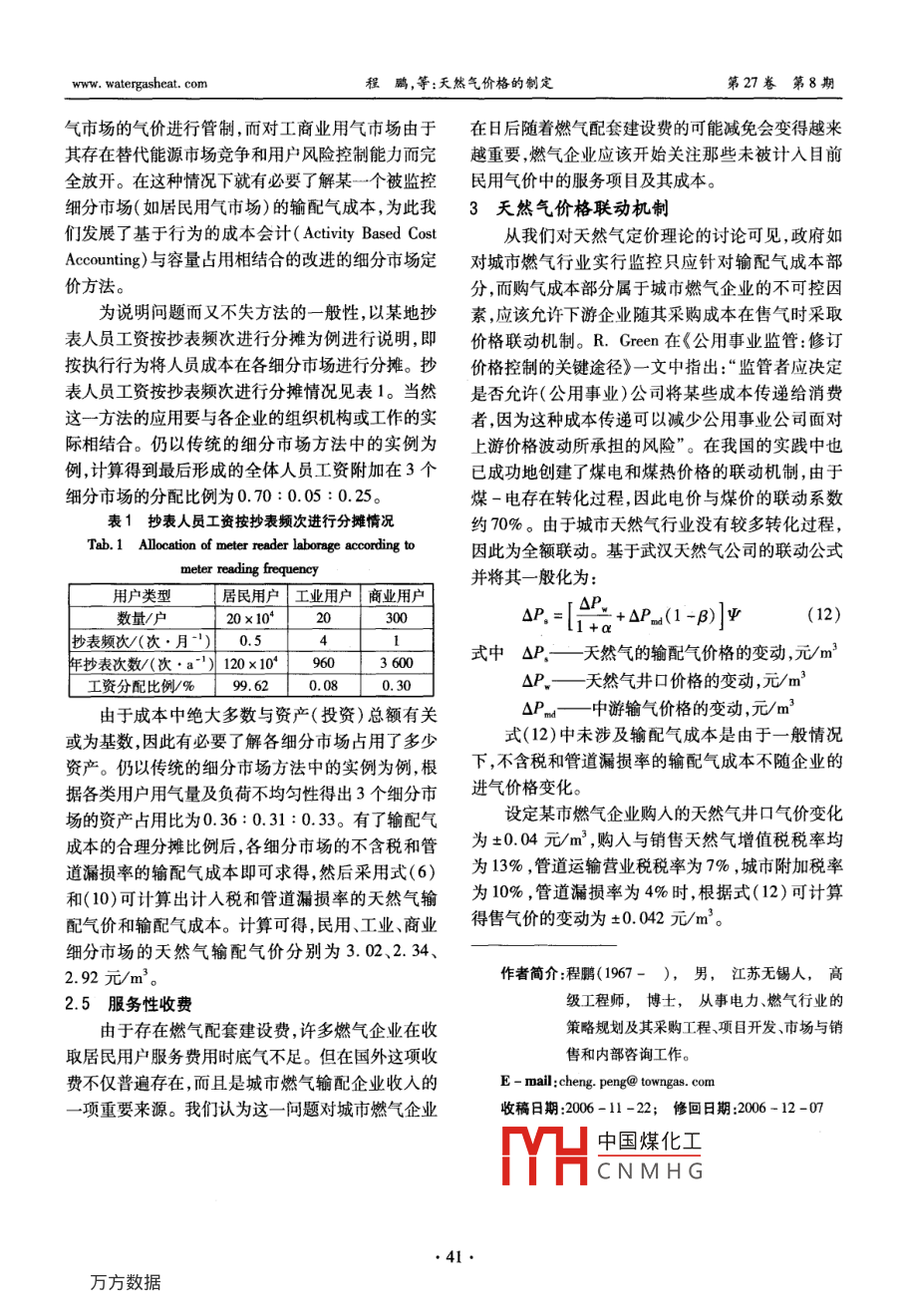 第27卷第8期煤氣與熱力Vol 27 No 82007年8月gas heat天然氣價格的制定程鵬,郭艷麗(港華投資有限公司,廣東深圳518008)摘要:介紹了通常采用的天然氣定價方法,根據(jù)我國的實(shí)際情況探討了成本加成定價方法的運(yùn)用。探討了基于成本加成定價公式的兩種表述方法適用的場合,分析了輸配氣成本的影響因素。提出了基于行為的成本會計與容量占用相結(jié)合的改進(jìn)的細(xì)分市場的天然氣定價方法,給出了天然氣價格聯(lián)動的一般公式關(guān)鍵詞:天然氣;定價;成本加成;細(xì)分市場;聯(lián)動機(jī)制中圖分類號:TU996文獻(xiàn)標(biāo)識碼:A文章編號:1000-416(2007)08-0036-06Determination of Natural gas priceCHENG Peng, GUO Yan-liGanghua Gas Investment Limited, Shenzhen 518008, China)Abstract: Some commonly used methods for pricing natural gas are introduced, and the application of the cost-plus pricing system is discussed according to the Chinese practical situation. The occa-sions applicable for two expressions based on the cost-plus pricing formula are also discussed, and thefactors influencing the cost of gas transmission and distribution are analyzed. A segmented market pricingnatural gas method modified by combining the activity-based cost accounting with system capacity allocation is put forward, and the general formula for natural gas cost pass-through mechanism is providedKey words: naturalcing; cost-plus; segmented market; pass-through mechanism國際上對城市天然氣等公用事業(yè)行業(yè)的放寬和在成本的弱增性以及應(yīng)規(guī)模經(jīng)濟(jì)的要求,無法或不取消管制雖始于近20年,但這一趨勢已經(jīng)對天然氣適宜引入競爭而使自然壟斷不可避免,因此天然氣行業(yè)的市場化和競爭產(chǎn)生了深遠(yuǎn)影響。我國在公用產(chǎn)業(yè)鏈的完全市場化不易實(shí)現(xiàn)。目前,較市場化的事業(yè)行業(yè)也放寬了準(zhǔn)入條件和投資限制,并通過引做法為“X+1+X”模型,即將天然氣作為商品,使上入多種投資主體和資金來源取得了城市燃?xì)庑袠I(yè)的游天然氣生產(chǎn)和下游的銷售完全市場化,而中游的巨大發(fā)展,但各地城市燃?xì)庑袠I(yè)的定價和價格管理輸氣和下游的配氣由于自然壟斷仍然受政府的管水平仍有待提高。定價是消費(fèi)者、企業(yè)和政府關(guān)注制。西方經(jīng)濟(jì)學(xué)認(rèn)為,對存在自然壟斷的市場失靈的重要問題,而且必然與目前的行業(yè)政策和企業(yè)發(fā)的領(lǐng)域,實(shí)行價格管制是合理的。英國為了保證天展水平相關(guān)聯(lián)。研究定價理論和方法可為定價實(shí)踐然氣產(chǎn)業(yè)鏈上的最大市場化,在1995年將原高度提供指導(dǎo)思路及操作方法,另外了解并借鑒世界上體化的英國天然氣公司拆分成兩家,一家主要負(fù)責(zé)其他國家的做法也有利于我們做好天然氣的定價工國際勘探開發(fā)以及輸配和儲存,另一家主營零售、服作。本文對天然氣價格制定的方法進(jìn)行探討務(wù)及日前英國尸經(jīng)沒有燃?xì)馍唐泛?天然氣定價方法輸配中國煤化工①市場定價法CNMHG由于天然氣中游管道輸送和下游的城市輸配存由于相對其他可替代能源,天然氣的大規(guī)模應(yīng)www.watergasheat.com程鵬,等:天然氣價格的制定第27卷第8期用較晩,市場開拓從置換其他能源市場開始,因此天貼、平均成本定價、兩部制定價等方法??紤]在國際然氣作為商品根據(jù)替代能源定價就不足為奇了。歐上燃?xì)庑袠I(yè)的使用普遍程度,這里主要討論平均成洲國家的政府在管制天然氣配氣價格時也一定程度本定價和兩部制定價兩種方法上考慮加入配氣價格后天然氣總價格與可替代能源目前,我國城市燃?xì)庑袠I(yè)采用最多的是平均成的市場價格相當(dāng)。其實(shí),國家發(fā)改委也在力推這一本定價方法。在定價時將企業(yè)供氣服務(wù)作為整體考思想,在2005年底對天然氣出廠價調(diào)整時指出:我慮,得到對所有用戶服務(wù)的加權(quán)平均成本。由企業(yè)國天然氣價過低,為原油的30%左右;成熟的市場和政府在保持平均成本不變的前提下,確定各細(xì)分經(jīng)濟(jì)國家天然氣與原油比價通常為0.84~1.21。市場的價格。必須指出的是如何確定各成本組成項(xiàng)由于整個天然氣產(chǎn)業(yè)鏈并非由同一級政府管制,這目的費(fèi)率,尤其是各類資金的回報率與利率,這對合思想并未被各地定價部門領(lǐng)會。理定價十分必要。認(rèn)識到自然壟斷行業(yè)企業(yè)所在經(jīng)③最高限價法營地域的運(yùn)作情況缺乏可比性,而一個企業(yè)自身的認(rèn)識到自然壟斷的存在并考慮到對公眾利益的歷史數(shù)據(jù)對未來最有預(yù)示性,美國聯(lián)邦能源監(jiān)管委保護(hù),1994年后,英國對輸氣和儲氣業(yè)務(wù)采取了最員會(FERC)規(guī)定服務(wù)總成本按以往12個月的歷高限價的方式實(shí)行政府的價格干預(yù),定價原則為史成本對隨后9個月的可預(yù)見變化做調(diào)整。對于壟P,=(1+/-x)P1,mx+K(1)斷行業(yè)只可微利的觀點(diǎn),美國聯(lián)邦最高法院早在式中P—第t年天然氣的最高能源價格,英鎊/1944年的聯(lián)邦動力委員會對希望天然氣公司一案中即判定:“(被監(jiān)管企業(yè)的)股東回報應(yīng)與有相似兩年間天然氣零售價格指數(shù)的變化率險的其他行業(yè)內(nèi)企業(yè)的投資回報相當(dāng)”,從而明x—管制者制定的一定時期
