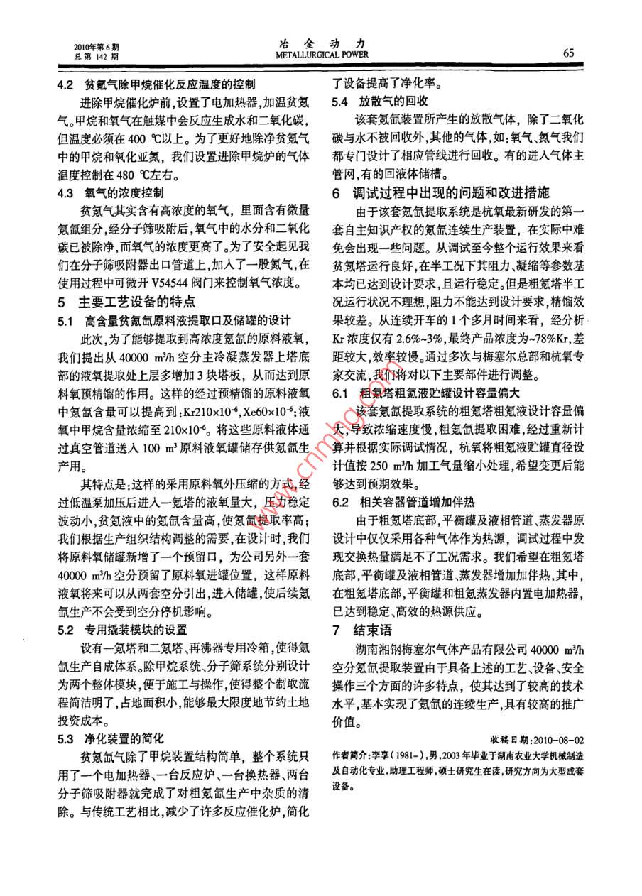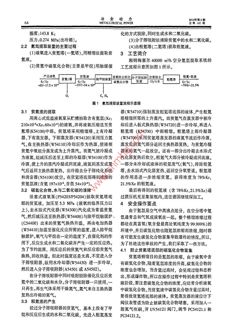2010年第6期冶金動(dòng)力METALLURGICAL POWER63制氧40000m/h空分氪氙提取裝置問題分析及整改李享(中南大學(xué)湖南長(zhǎng)沙410083)【摘要】簡(jiǎn)介了湘鋼梅塞爾40000mh空分氪氙提取裝置工藝,分析了設(shè)備、安全操作的特點(diǎn)及在調(diào)試過程中出現(xiàn)的問題提出了進(jìn)一步整改措施【關(guān)鍵詞】空分設(shè)備;氪氣;氙氣;安全操作系統(tǒng)【中圖分類號(hào)】TB6577【文獻(xiàn)標(biāo)識(shí)碼】B【文章編號(hào)】1006676402010060063-03Problems Analysis and Improvement of 40000 m/h Air Separation Unitfor Recovery of Krypton and Xenon[Abstract) The process of Messer 40000 m/h air separation unit for recovery of kryp-ton and xenon of Xiangtan Iron and Steel Co. is described briefly. The characteristics of theunit and safety operation as well as the problems in commissioning are analyzed. In addition,[Key words] air separation unit; krypton; xenon; safety operation system1前言XkrXe-0Y型氪氙提取裝置,共有原料氧儲(chǔ)存及輸湖南湘鋼梅塞爾氣體產(chǎn)品有限公司(以下簡(jiǎn)稱送系統(tǒng)、一氮塔成套設(shè)備、除甲烷成套系統(tǒng)、分子篩“湘鋼梅塞爾”)4000mnh空分氪氙提取裝置,是吸附成套系統(tǒng)、粗氮塔(又稱“二氮塔”)成套設(shè)備、充2009年從杭州杭氧與40000h空分設(shè)備配套引裝系統(tǒng)、儀控及分析系統(tǒng)、電控系統(tǒng)等八大系統(tǒng)組進(jìn)的。可以多臺(tái)空分設(shè)備共用一套氮氙生產(chǎn)系統(tǒng)是成杭氧公司最新研制的第一套氮氙連續(xù)生產(chǎn)裝置,21氪氙提取裝置技術(shù)參數(shù)2009年下半年進(jìn)行現(xiàn)場(chǎng)調(diào)試至今。該套氮氙提取裝(1)原料(取自其他空分):置與20世紀(jì)末期的氪氙提取系統(tǒng)相比:工藝流程簡(jiǎn)液氧進(jìn)貧氪塔的流量:1600m}h;單合理;設(shè)備布局緊湊性能優(yōu)越;采用了DCS控液氧進(jìn)貧氪塔的壓力:0155MPa;制,自動(dòng)化程度高,操作簡(jiǎn)單,工況穩(wěn)定。其最大特點(diǎn)液氧進(jìn)貧氮塔的溫度:-180℃;是將氮氙間隙生產(chǎn)工藝改為了連續(xù)生產(chǎn)工藝,產(chǎn)品液氧中氮/氙含量:~65-175×10;質(zhì)量好。該套氪氙裝置可生產(chǎn)純度為78%(含氪氣)液氧中甲烷含量:-75×106的粗氪氣01mh。再把78%(含氪氣)的粗氪氣通(2)產(chǎn)量:過瓶裝發(fā)往歐洲進(jìn)行下一步提純。該套氪氙提取裝工況I:置投運(yùn)后將為梅塞爾創(chuàng)造良好的經(jīng)濟(jì)效益?,F(xiàn)主要產(chǎn)品氪氙產(chǎn)量:0.1mh(1600mh液氧輸入);從設(shè)備、工藝、DCS控制系統(tǒng)等方面,對(duì)湖南湘鋼梅純度:-78%Kr,-2149Xe;塞爾氣體產(chǎn)品有限公司40000mh空分氮氙提取溫度:143.8K裝置的特點(diǎn)進(jìn)行分析,并對(duì)調(diào)試中出現(xiàn)的問題及改壓力:0274MPa(出冷箱)。進(jìn)措施做一介紹工況Ⅱ:2裝置概況產(chǎn)品氮氙產(chǎn)量:005mh(800mh液氧輸入)湘鋼梅塞爾40000mh空分氪氙提取系統(tǒng)為純度:-78%Kr,-2149Xe;冶金動(dòng)力10年第6期METALLURGICAL POWER總第142期溫度:143.8K化的方式脫除同時(shí)生成水和二氧化碳?jí)毫?0.74MPa(出冷箱)。(3)分子篩吸附法清除貧氪中的水和二氧化碳。22氪氙提取裝置的主要過程(4)由粗氪塔(二氮塔)提取粗氪液。(1)液氧進(jìn)入貧氮塔(一氪塔),用精餾法提取貧3工藝簡(jiǎn)介氪液湘鋼梅塞爾40000m/h空分氪氙提取系統(tǒng)的(2)貧氪中碳?xì)浠衔?主要是甲烷)用觸媒催工藝流程示意圖如圖1所示。產(chǎn)品液氧貧氮1塔Kr/Xe]除甲烷裝割貧氪除去部分際子簡(jiǎn)貧氪除去粗氪+饑液粗氪塔碳?xì)浠衔颣r/Xe65/175×10197/-54x10478%/-21.5%C, H.圖1氪氙提取裝置流程示意圖3.1貧氪液的提取器(W54710)強(qiáng)制蒸發(fā)粗氪塔底部的液體,產(chǎn)生粗氪用離心式低溫液氧泵從貯槽抽取含有氪氙(Kr:塔精餾所需的上升蒸汽。而貧氪氣在蒸發(fā)器中被冷210×104+Xe:60×10°)的液氧,并將液氧壓編送至貧卻后進(jìn)入板式換熱器(W54720)進(jìn)一步冷卻再進(jìn)入氪塔(K54100中部。貧氪塔采用精餾塔,上有冷凝粗氮塔(K54700)中部精餾。粗氪塔上部冷凝器器、下有蒸發(fā)器。下部蒸發(fā)器(W54120)采用壓力氮(W54700)采用貧氪塔蒸發(fā)器的液氮節(jié)流后作冷源氣,在主換熱器(W54110)冷卻后作為熱源,使液相蒸發(fā)后的氮?dú)獠糠址祷刂鲹Q熱器復(fù)熱,與貧氪冷凝貧氪中氧組分蒸發(fā)成為上升蒸汽。而氮?dú)獗焕淠善鱽?lái)的氮?dú)庖黄鸱趴?。還有一部分出冷箱去水浴式為液氮,經(jīng)減壓后送至上部的冷凝器(W54100)作為汽化器復(fù)熱后放空。粗氪氣大部分被冷凝成回流液。冷源使上升的蒸汽冷凝成回流液液氮?jiǎng)t蒸發(fā)成氮部分未冷卻成液體的粗氮廢氣(氧氣),排除粗氪氣后返回主換熱器復(fù)熱,出冷箱去分子篩純化系統(tǒng)塔,去水浴式汽化器復(fù)熱,返回空分氧管道。粗氪塔和消音器(N54100)放空。在貧氪塔底部得到濃縮的的作用是進(jìn)一步濃縮貧氪,獲得濃度為78%Kr,貧氪氙液(含氮197×106,含氙54×104)。215%Xe的粗氪液。32碳?xì)浠衔?、水與二氧化碳的清除最后將得到的粗氮液(含78%Kr,21.5%Xe)通活塞式液氧泵(P54203P54204)抽取貧氪塔底過膜壓機(jī)充至集裝瓶?jī)?nèi),送往德國(guó)繼續(xù)深加工部的貧氮液,加壓至53MPa(液氧的臨界壓力以4安全操作要點(diǎn)上),去水浴式汽化器(W54300汽化成為常溫貧氪由于氪氙是空氣中高沸點(diǎn)組分,在空分塔中氪氣,然后減壓送