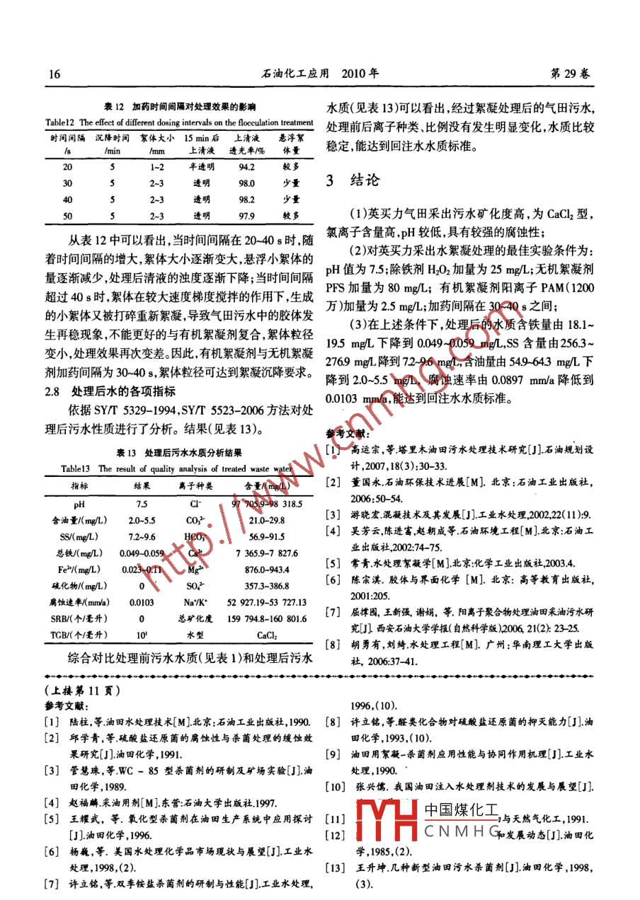 第29卷第6期石油化工應(yīng)用Vol.29 No.62010年6月PETROCHEMICAL INDUSTRY APPLICATIONJune 2010英買力氣田污水絮凝處理試驗研究任青云',屈撐囤',劉武",晁宏洲2(1.西安石油大學(xué)化學(xué)化工學(xué)院,陜西省環(huán)境污染控制技術(shù)與儲層保護重點實驗室,陜西西安710065;2.中國石油塔里木油田分公司,新疆庫爾勒841000)摘要:針對英買 力作業(yè)區(qū)氣田采出污水礦化度高、腐蝕性強、總鐵含量高硫化物含量低、細菌含量較低.pH值低的特點,通過研究調(diào)整pH值、除鐵劑種類及其用量、無機和有機絮凝劑種類及其用量以及加藥間隔時間等的研究,對英買力氣田污水進行絮凝處理。結(jié)果表明:當pH值為7.5、除鐵劑加量為25 mg/L、無機絮凝劑加量為80 m/L.有機絮凝劑加量為2.5 mg/L,有機絮凝劑與無機絮凝劑加藥間隔控制在30- 40s時,處理后的污水的含鐵量、含油量.SS含量、腐蝕速率由處理前的18.1-19.5 mg/L.54.9 -64.3 mg/L .256.3-276.9 mgL.0.0897 mm/a分別下降到0.049-0.059 mg/L.2.0~5.5 mg/L. 7.2~9.6 mg/L.0.0103 mn/ao關(guān)鍵詞:氣田污水;絮凝;回注;除鋏中圖分類號:TE99文獻標識碼:A文章編號:1673- -5285( 2010 )06 -0012-05Flocculent treatment study on yingmaili gasfieldproducted -waterREN Qingyun' ,QU Chengtun',LU Wur,CHAO Hongzhou2(1.Key Laboratory of Shanxi Province for Enrironment Pollution Control Technology &Reservoir Protection of 0ifield , College of Chemistry and Chemical Engineering, XianShiyou Uniwersiy, Xian Shanxi 710065 ,China; 2.Terimu 0ifield Company of Petrochina,Korla Xinjiang 841000, China)Abstract: The sewage of yingmaili gasfield producted-water has hypersalinity、putrescence、high total iron conter、low conten of sulfides and bacteria Jower pH value. The pH, de-ironagent and amount, inorganic and organic flocculating agent and interval of agent additive wereoptimized in the yingmaili gas field -producted water, the results indicated that pH 7.5, the :additive amounts of de -iron agent 25 mg/L,inorganic flocculating agent 80 mgL, organicflocculating agent 2.5 mg/L, and the interval of agent additive was 30- 40 s. The quality of thetreated water was stable,and iron content dropped from 18.1~19.5 mg/L to 0.049~0.059 mg/L,ss content dropped from 256.3~276.9 mg/L to 7.2~9.6 mg/L,oil dropped from 54.9~64.3 mg/L to 2.0~5.5 mg/L, corrosion rate dropped from 0.0897 mm/a to 0.0103 mm/a, andmet the re- -injection water standards of recommended injection water quality.Key words: gasfield producted-water;flocculation;reinjection; de -ironing中國煤化工HCNMHG*收稿日期:2010 -04-21基金項目:陜西省"13115”科技創(chuàng)新工程項目(20092DKC 61);西安市創(chuàng)新支撐計劃-產(chǎn)學(xué)研合作促進工程[CXY09013(3)]。作者簡介:任青云,女,西安石油大學(xué)在讀碩士研究生,主要從事石油環(huán)境污染與控制技術(shù)方面的研究工作。第6期任青云等英買 力氣田污水絮凝處理試驗研究13塔里木油田英買力地區(qū)屬于寒武一奧陶系地層.表1英買力氣田采出水性質(zhì)分析結(jié)果Tablel The result of quality analysis of waste water produced in碳酸鹽巖縫洞型儲層,其氣田污水具有以下特點",Yingmaili gas field礦化度高、含鐵高和腐蝕速率高,pH值低和細菌含指標結(jié)果離子種類舍量/(mg/L)量低。對于氣田污水,國內(nèi)外多采用回注方式進行處水溫/C42-43clr96 664.5~102 912.8理,處理工藝主要是采用混凝沉降、氣浮、過濾、精細)H.0過濾等單元技術(shù)組合的處理流程,并使氣田污水中含油量/(mg/L) 54.9-64.3HCO,79.3-146.4懸浮物含量、含油量等含量達到《氣田水回注方法》(SY/T 6596 -2004)的要求21。在上述處理工藝中存.S/(mg/L)256.3-276.9Ca7 443.8-8 080.1在以下問題:投加藥品劑種類多(主要有混凝劑、殺總鐵(mg/L)18.1-19.5Mg*925.0-1 678.6菌劑、清洗劑.脫氧劑、阻垢劑、緩蝕劑等)而且加量Fe*(m/L)13.8-18.5So2-363.2- 4003大,藥劑之間的相互作用導(dǎo)致處理后水質(zhì)的穩(wěn)定性硫化物/( mgL)Na'K*51 203.3-55 913.1差。為了確保處理后水水質(zhì)達標,解決氣田污水腐蝕腐蝕逯率(mm/a)0.0897總礦化魔157 531.7-168 259.4結(jié)垢問題,文章通過優(yōu)選pH值.除鐵劑、無機和有TCB/(個/毫升)0'水型機絮凝劑復(fù)合使用,對英買力氣田污水進行了絮凝SRB/(個毫升)處理。從表1中可以看出,污水含油量為549-643 mgL,總鐵為181~195 mgL,SS含量為2563-2 769 mgL,TCB為101實驗部分個/毫升,總礦化度為157 531.7-168 259.4 mg/L, 屬于1.1 儀器及試劑高礦化度的CaCl2型水。主要試劑:聚合氯化鋁(PAC)、聚合硫酸鐵(PPS)、2.2 pH 值的優(yōu)選聚丙烯酰氯(PAM)( 黏均相對分子質(zhì)量為1 200萬、在含油污水預(yù)處理過程中,pH 值的確定是關(guān)鍵”,800萬、400萬)為工業(yè)品;無水乙醇、石油醚硝酸銀、通過加入合適的 pH值調(diào)節(jié)劑,既可以達到提高污水H2O2等均為AR試劑。pH值的目的,又可以除去污水中溶解的少量CO2和主要儀器:分析天平、UV2100型分光光度計、無菌HS 等腐蝕性氣體。用NaOH將污水pH值調(diào)節(jié)至7.0~注射器微量加藥器、六連攪拌器恒溫箱。8.5,pH與調(diào)整后水的透光率間的關(guān)系(見表2)。污水:采自英買力氣田聯(lián)合站。表2不同pH對絮凝處理效果的影響1.2 試驗方法Table2 The efet of diferent pH on the focculation1.2.1懸浮物 含量、含油量按《碎屑巖油藏注水水質(zhì)推pH值上清液砂濾后遘光率/% 懸浮小絮體量沉降速度薦指標及分析方法》(SY/T 5329-1994)規(guī)定進行;水中7.74.2較少較慢離子含量分析按照《油田水分析方法》(SYT5523-788.6較多較快2006 )規(guī)定進行。8.8931.2.2污水 絮