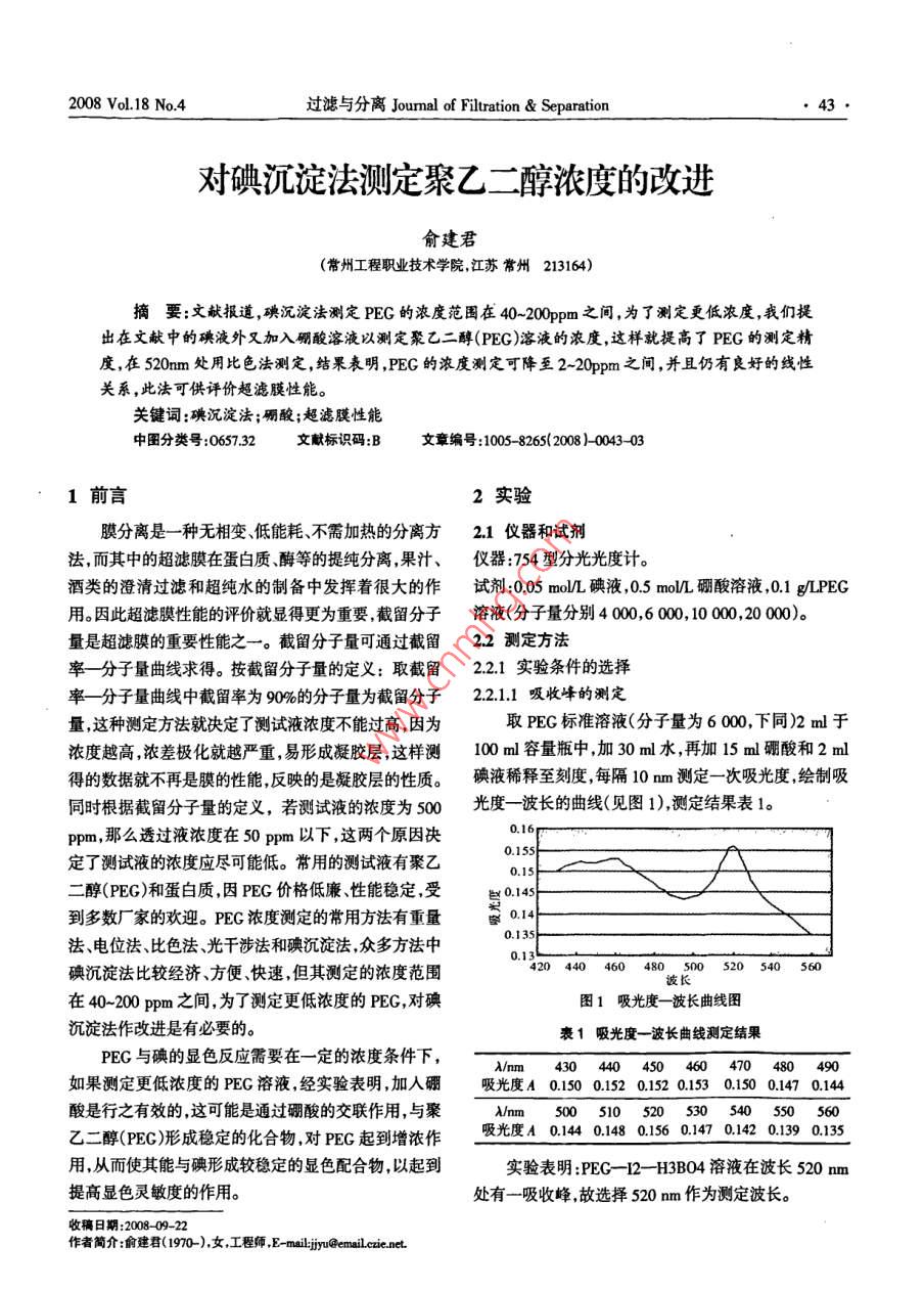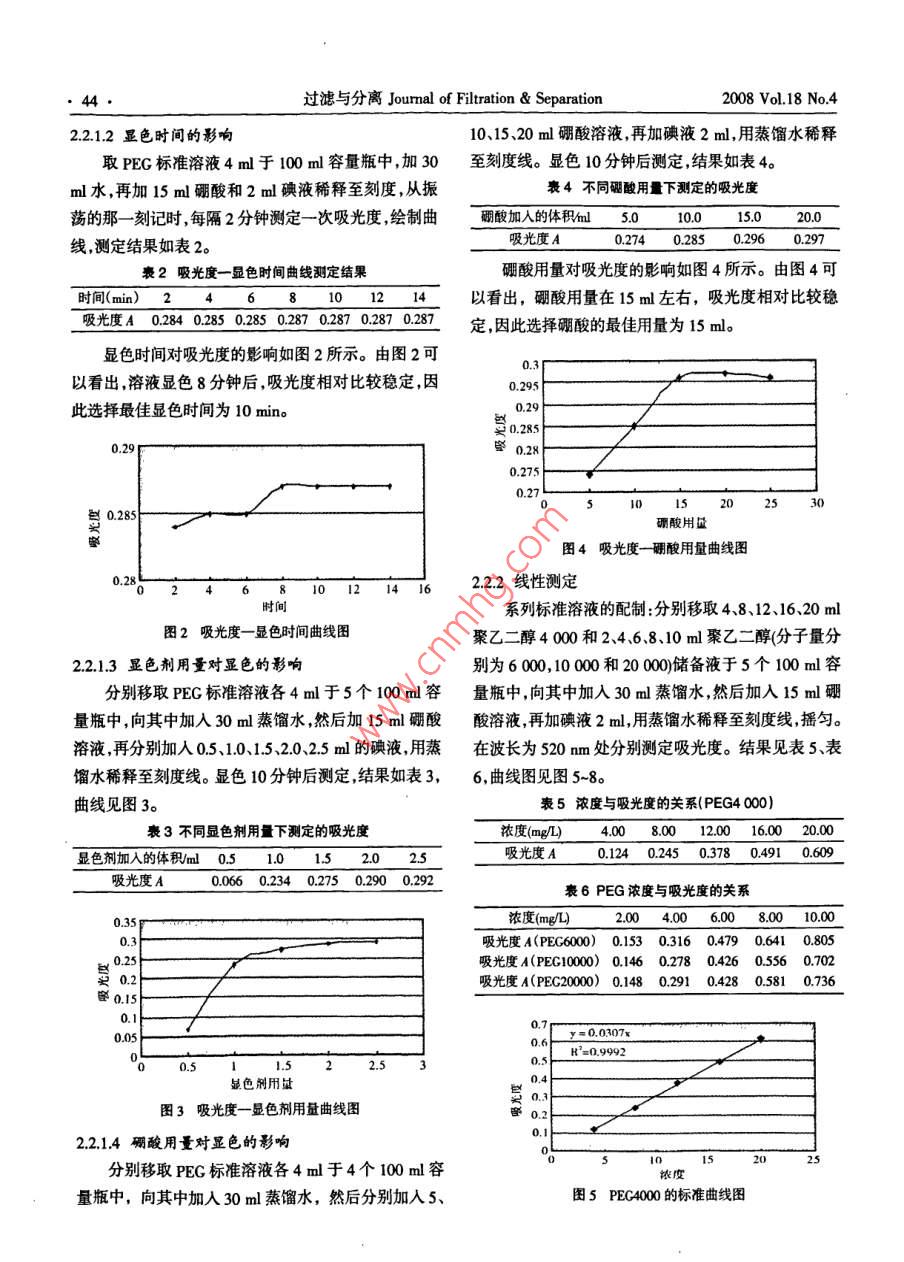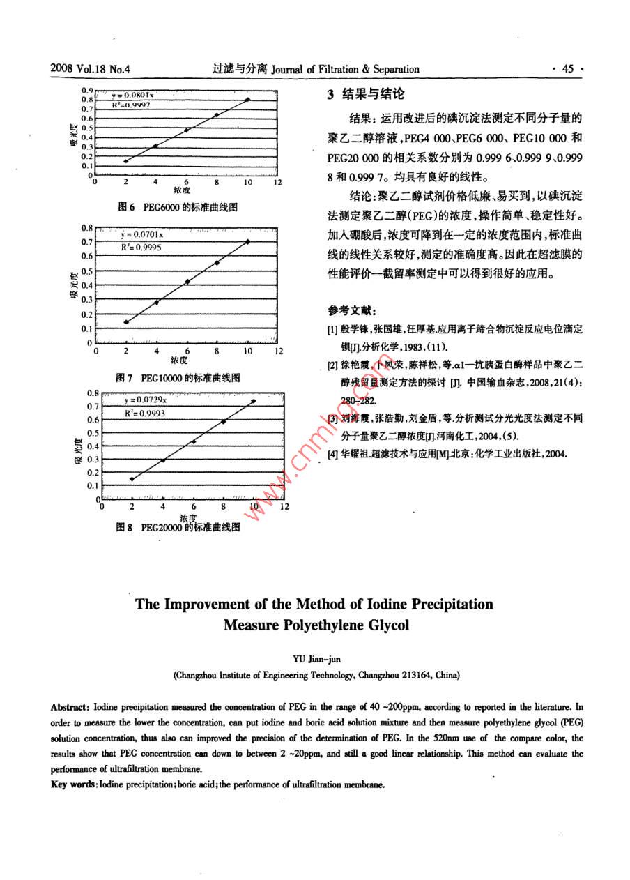 2008ol.18No.4過濾與分離 Joumal of Filtration&Separation43對碘沉淀法測定聚乙二醇濃度的改進俞建君(常州工程職業(yè)技術學院,江蘇常州213164)摘要:文獻報道,碘沉淀法測定PEG的濃度范圍在40-2pm之間,為了測定更低濃度,我們提出在文獻中的碘液外又加入硼酸溶液以測定聚乙二醇(PEG)溶液的濃度,這樣就提高了PEG的測定精度,在520nm處用比色法測定,結果表明,PEG的濃度測定可降至2-20ppm之間,并且仍有良好的線性關系,此法可供評價超濾膜性能。關鍵詞:碘沉淀法;硼酸;超濾膜性能中圖分類號:0657.32文獻標識碼:B文章編號:1005-8265(2008)-0043-031前言2實驗膜分離是一種無相變、低能耗、不需加熱的分離方2.1儀器和試劑法,而其中的超濾膜在蛋白質(zhì)酶等的提純分離果汁、儀器:754型分光光度計。酒類的澄清過濾和超純水的制備中發(fā)揮著很大的作試劑:0.05mol碘液,0.5mol/L硼酸溶液,0.1g/LPEG用。因此超濾膜性能的評價就顯得更為重要,截留分子溶液(分子量分別4000,600,00,20000量是超濾膜的重要性能之一。截留分子量可通過截留22測定方法率一分子量曲線求得。按截留分子量的定義:取截留2.2.1實驗條件的選擇率一分子量曲線中截留率為90%的分子量為截留分子2.2.1.1吸收峰的測定量,這種測定方法就決定了測試液濃度不能過高,因為取PEG標準溶液(分子量為6000,下同)2ml于濃度越高,濃差極化就越嚴重,易形成凝膠層,這樣測100ml容量瓶中,加30ml水,再加15ml硼酸和2ml得的數(shù)據(jù)就不再是膜的性能,反映的是凝膠層的性質(zhì)。碘液稀釋至刻度,每隔10m測定一次吸光度,繪制吸同時根據(jù)截留分子量的定義,若測試液的濃度為500光度一波長的曲線(見圖1),測定結果表1ppm,那么透過液濃度在50ppm以下,這兩個原因決0.16定了測試液的濃度應盡可能低。常用的測試液有聚乙0.1550.15二醇(PEG)和蛋白質(zhì),因PEG價格低廉、性能穩(wěn)定,受0.145到多數(shù)廠家的歡迎。PEG濃度測定的常用方法有重量0.14法、電位法、比色法、光干涉法和碘沉淀法,眾多方法中0.130.13碘沉淀法比較經(jīng)濟、方便、快速,但其測定的濃度范圍420440460480500520540560波長在40~200ppm之間,為了測定更低濃度的PEG,對碘圖1吸光度一波長曲線圖沉淀法作改進是有必要的。表1吸光度一波長曲線測定結果PEG與碘的顯色反應需要在一定的濃度條件下,如果測定更低濃度的PEG溶液,經(jīng)實驗表明,加入硼m430440450460470480490吸光度A0.1500.1520.1520.1530.1500.1470.144酸是行之有效的,這可能是通過硼酸的交聯(lián)作用,與聚nm500510520530540550560乙二醇(PEC)形成穩(wěn)定的化合物,對PEG起到增濃作吸光度A0.1440.1480.1560.1470.1420.1390.135用,從而使其能與碘形成較穩(wěn)定的顯色配合物,以起到實驗表明:PEG12—H3B04溶液在波長520nm提高顯色靈敏度的作用。處有一吸收峰,故選擇520nm作為測定波長。收稿日期:2008-09-22作者簡介:建君(1970-),女,工程師,- -mail jyuemailezie.nt44過濾與分離 Journal of Filtration&Separation2008ol.18no.42.2.1.2顯色時間的影響10、15、20ml硼酸溶液,再加碘液2ml,用蒸餾水稀釋取PEG標準溶液4ml于100ml容量瓶中,加30至刻度線。顯色10分鐘后測定,結果如表4ml水,再加15ml硼酸和2ml碘液稀釋至刻度,從振表4不同硼酸用量下測定的吸光度蕩的那一刻記時,每隔2分鐘測定一次吸光度,繪制曲硼酸加人的體積l5.010.015.020.0線,測定結果如表2。吸光度A0.2740.2850.2960.297表2吸光度一顯色時間曲線測定結果硼酸用量對吸光度的影響如圖4所示。由圖4可時間mi)2468101214以看出,硼酸用量在15m左右,吸光度相對比較穩(wěn)吸光度A0.2840.285.2850.2870.2870.2870.287定,因此選擇硼酸的最佳用量為15ml顯色時間對吸光度的影響如圖2所示。由圖2可0.3以看出,溶液顯色8分鐘后,吸光度相對比較穩(wěn)定,因0.295此選擇最佳顯色時間為10min。0.290.2850.290.20.2750.270.285051015202530硼酸用量圖4吸光度一硼酸用量曲線圖0.282468101214162.2.2線性測定時間系列標準溶液的配制:分別移取4、8、12、16、20ml圖2吸光度一顯色時間曲線圖聚乙二醇4000和2、4、6、8、10ml聚乙二醇(分子量分2.2.1.3顯色劑用量對顯色的影響別為600,10000和20000)儲備液于5個100ml容分別移取PEG標準溶液各4ml于5個100ml容量瓶中,向其中加入30ml蒸餾水,然后加入15ml硼量瓶中,向其中加入30ml蒸餾水,然后加15ml硼酸酸溶液,再加碘液2ml,用蒸餾水稀釋至刻度線,搖勻。溶液,再分別加入0.5、1.0、1.5、2.0、2.5ml的碘液用蒸在波長為520nm處分別測定吸光度。結果見表5、表餾水稀釋至刻度線。顯色10分鐘后測定,結果如表3,6,曲線圖見圖5~8曲線見圖3。表5濃度與吸光度的關系(PEG4000)表3不同顯色劑用量下測定的吸光度濃度(mg/L)4.008.0012.0016.0020.00顯色劑加入的體積m0.51.01.52.02.5吸光度A0.1240.2450.3780.4910.609吸光度A0.0660.2340.2750.2900.292表6PEG濃度與吸光度的關系0.35濃度(mg/2.004.006.008.0010.000.3吸光度A(PE600)01530.3160.4790.6410.8050.25吸光度A(PE1000)01460.2780.4260.5560.7020.2吸光度APE2000.0.2910.4280.5810.7360.150.10.050.7y0.0307x000.511.522.530620.990.顯色劑用量0.4圖3吸光度一顯色劑用量曲線圖0.32.2.1.4硼酸用量對顯色的影響0.10分別移取PEG標準溶液各4ml于4個100ml容510152025濃度量瓶中,向其中加入30ml蒸餾水,然后分別加入5、圖5PEC4000的標準曲線圖2008ol.18no.4過濾與分離 Joumal of Filtration& Separation450.00800.83結果與結論0.70.9970.6結果:運用改進后的碘沉淀法測定不同分子量的0.50.40.3聚乙二醇溶液,PE4000、PE6000、PEG10000和0.2PEG20000的相關系