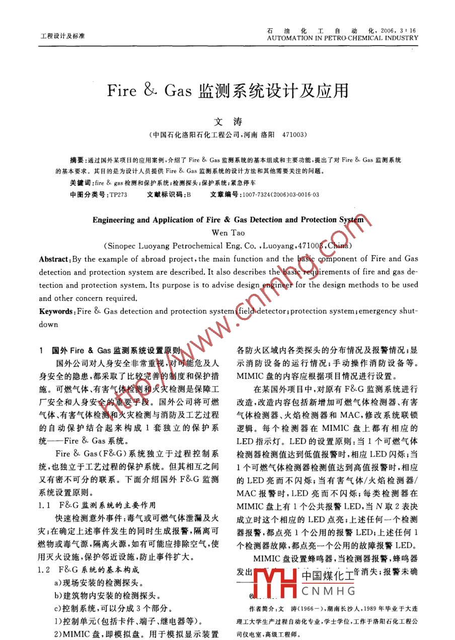 工程設(shè)計(jì)及標(biāo)準(zhǔn)AUTOMATION IN PETRO-CHEMICAL INDUSTRYFire8.Gas監(jiān)測(cè)系統(tǒng)設(shè)計(jì)及應(yīng)用文濤(中國(guó)石化洛陽(yáng)石化工程公司,河南洛陽(yáng)471003)摘要:通過(guò)國(guó)外某項(xiàng)目的應(yīng)用案例,介紹了Fre&Gas監(jiān)測(cè)系統(tǒng)的基本組成和主要功能提出了對(duì)Fre&Gas監(jiān)測(cè)系統(tǒng)的基本要求。其目的是為設(shè)計(jì)人員提供Fire&.Gas監(jiān)測(cè)系統(tǒng)的設(shè)計(jì)方法和其他需要關(guān)注的問(wèn)題關(guān)鍵詞;fire&gas檢測(cè)和保護(hù)系統(tǒng);檢測(cè)探頭;保護(hù)系統(tǒng);緊急停車中圖分類號(hào):TP273文獻(xiàn)標(biāo)識(shí)碼:B文章編號(hào):1007-7324(2006)03001603Engineering and Application of Fire Gas Detection and Protection System(Sinopec Luoyang Petrochemical Eng Co. Luoyang, 471003, China)Abstract: By the example of abroad project, the main function and the basic component of Fire and Gasdetection and protection system are described. It also describes the basic requirements of fire and gas detection and protection system. Its purpose is to advise design engineer for the design methods to be usedand other concern required.Keywords: Fire Gas detection and protection system; field detector protection system; emergency shut1國(guó)外Fire&Gas監(jiān)測(cè)系統(tǒng)設(shè)置原則各防火區(qū)域內(nèi)各類探頭的分布情況及報(bào)警情況;顯國(guó)外公司對(duì)人身安全非常重視,對(duì)可能危及人示消防設(shè)備的運(yùn)行情況;手動(dòng)操作消防設(shè)備等。身安全的隱患都采取了比較完善的制度和保護(hù)措MMIC盤(pán)的內(nèi)容應(yīng)根據(jù)項(xiàng)目情況進(jìn)行設(shè)置。施??扇?xì)怏w、有害氣體檢測(cè)和火災(zāi)檢測(cè)是保障工在某國(guó)外項(xiàng)目中,對(duì)原有F&G監(jiān)測(cè)系統(tǒng)進(jìn)行廠安全和人身安全的重要手段。國(guó)外公司將可燃改造,改造內(nèi)容包括新增加可燃?xì)怏w檢測(cè)器、有害氣體、有害氣體檢測(cè)和火災(zāi)檢測(cè)與消防及工藝過(guò)程氣體檢測(cè)器、火焰檢測(cè)器和MAC,修改系統(tǒng)聯(lián)鎖的自動(dòng)保護(hù)結(jié)合起來(lái)構(gòu)成1套獨(dú)立的保護(hù)系邏輯。每個(gè)檢測(cè)器在MIMC盤(pán)上都有相應(yīng)的統(tǒng)—Fire&Gas系統(tǒng)。LED指示燈。LED的設(shè)置原則:當(dāng)1個(gè)可燃?xì)怏wFire8.Gas(F8G)系統(tǒng)獨(dú)立于過(guò)程控制系檢測(cè)器檢測(cè)值達(dá)到低值報(bào)警時(shí),相應(yīng)LED閃爍;當(dāng)統(tǒng),也獨(dú)立于工藝過(guò)程的保護(hù)系統(tǒng)。但其相互之間1個(gè)可燃?xì)怏w檢測(cè)器檢測(cè)值達(dá)到高值報(bào)警時(shí),相應(yīng)又有密不可分的聯(lián)系。下面介紹國(guó)外F8G監(jiān)測(cè)的LED亮而不閃爍;當(dāng)有害氣體/火焰檢測(cè)器系統(tǒng)設(shè)置原則MAC報(bào)警時(shí),LED亮而不閃爍;每類檢測(cè)器在1.1F&G監(jiān)測(cè)系統(tǒng)的主要作用MIMIC盤(pán)上有1個(gè)公共報(bào)警LED,當(dāng)N取2表決快速檢測(cè)意外事件:毒氣或可燃?xì)怏w泄漏及火成立時(shí)這個(gè)相應(yīng)的LED點(diǎn)亮;上述任何一個(gè)檢測(cè)災(zāi);在確定上述事件發(fā)生的同時(shí)生成報(bào)警,隔離可器報(bào)警都點(diǎn)亮1個(gè)公用的報(bào)警LED;上述任何1燃物或毒氣源,隔離火源,如有可能應(yīng)排除空氣,使個(gè)檢測(cè)器故障都點(diǎn)亮一個(gè)公用的故障報(bào)警LED用滅火設(shè)施,保護(hù)鄰近設(shè)施,防止事件擴(kuò)大。MIMIC盤(pán)設(shè)置蜂鳴器,當(dāng)檢測(cè)器報(bào)警,蜂鳴器1.2F8G系統(tǒng)的基本構(gòu)成發(fā)出中國(guó)煤化工消失;報(bào)警未確a)現(xiàn)場(chǎng)安裝的檢測(cè)探頭。b)建筑物內(nèi)安裝的檢測(cè)探頭。CNMHGc)控制系統(tǒng),可以分成3個(gè)部分作者簡(jiǎn)介:文濤(1966-),湖南長(zhǎng)沙人,1989年畢業(yè)于大連1)控制單元(包括卡件、端子、繼電器等)。理工大學(xué)生產(chǎn)過(guò)程自動(dòng)化專業(yè),學(xué)士學(xué)位,工作于洛陽(yáng)石化工程公2) MIMIC盤(pán),即模擬盤(pán)。用于模擬顯示裝置同儀電室高級(jí)工程師。文濤.Fire&.Gas監(jiān)測(cè)系統(tǒng)設(shè)計(jì)及應(yīng)用認(rèn),但現(xiàn)場(chǎng)報(bào)警消失,則蜂鳴報(bào)警消失表1報(bào)膏顏色要求現(xiàn)場(chǎng)設(shè)置報(bào)警指示燈,當(dāng)現(xiàn)場(chǎng)檢測(cè)器檢測(cè)到報(bào)畫(huà)面要素相關(guān)顏色警信號(hào),現(xiàn)場(chǎng)的報(bào)警指示燈閃亮。當(dāng)所有報(bào)警消失褐色并按“ Reset”后,現(xiàn)場(chǎng)報(bào)警燈熄滅。MIMC盤(pán)上故障白色LED指示燈的熄滅順序與現(xiàn)場(chǎng)指示燈的熄滅順序火災(zāi)報(bào)警紅色致。 MIMIC盤(pán)和現(xiàn)場(chǎng)指示燈的報(bào)警和熄滅順序可燃?xì)怏w檢測(cè)器洋紅(紅紫色)由控制單元實(shí)現(xiàn)。高報(bào)警(N取1)報(bào)警清單應(yīng)白字洋紅色底) By- Pass盤(pán),也稱為 Override盤(pán)。盤(pán)上設(shè)有可燃?xì)怏w報(bào)警外框顏色變成洋紅色By-Pass.關(guān),用于旁路系統(tǒng)的輸入信號(hào)。啟動(dòng)旁高報(bào)警(N取2)報(bào)警清單應(yīng)黑字洋紅色底路開(kāi)關(guān)不需要確認(rèn)。(確認(rèn)后的報(bào)警)在某國(guó)外石油公司,旁路開(kāi)關(guān),它有2種設(shè)置可燃?xì)怏w