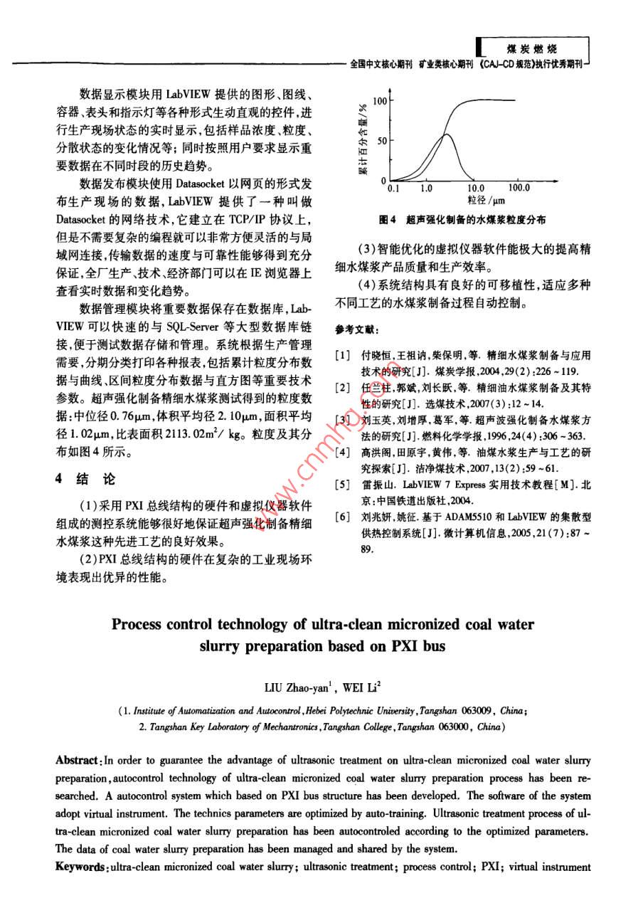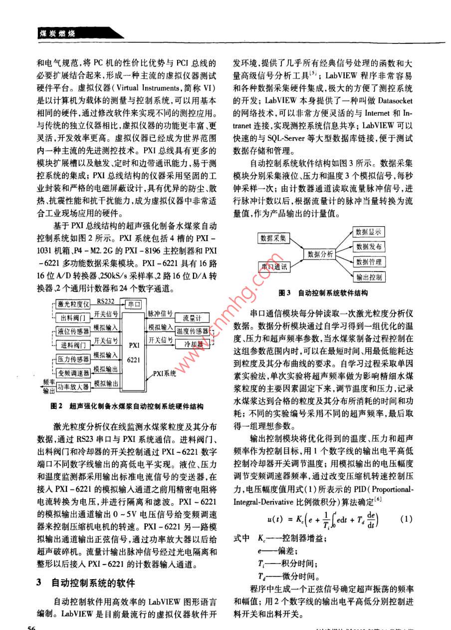 煤炭燃燒全國中文核心期刊礦業(yè)類核心期刊《cAcD規(guī)范》執(zhí)行優(yōu)秀期刊基于PⅪI總線的精細(xì)水煤漿制備過程控制技術(shù)劉兆妍',魏麗(1.河北理工大學(xué)自動化與自動控制學(xué)院河北唐山063009;2.唐山學(xué)院唐山市機電一體化重點實驗室,河北唐山063000摘要:為了保證超聲強化制備精細(xì)水煤漿先進(jìn)工藝的良好效果,研究了精細(xì)水煤漿制備過程自動控制技術(shù)。開發(fā)了一種PⅪI總線結(jié)構(gòu)的自動控制系統(tǒng)。系統(tǒng)采用虛擬儀器軟件,能夠經(jīng)過自學(xué)習(xí)優(yōu)化生產(chǎn)工藝參數(shù),按照優(yōu)化目標(biāo)實時自動控制超聲制備過程,并具有自動數(shù)據(jù)管理和發(fā)布等功能。關(guān)鍵詞:精細(xì)水煤漿;超聲處理;過程控制;PⅪI;虛擬儀器中圖分類號:TQ536;TP206·.1文獻(xiàn)標(biāo)識碼:A文章編號:100646772(2008)040055-03水煤漿做為一種成本低、見效快和成熟度高的桶中的液位,當(dāng)液位不足時打開閥門輸入原料水煤代油產(chǎn)品用于鍋爐燃燒已經(jīng)進(jìn)入全面推廣應(yīng)用階原料段。目前水煤漿技術(shù)研究的熱點是精細(xì)水煤漿的制→液位信號備與應(yīng)用。精細(xì)水煤漿一般粒度小于10μm,灰分在1%-2%,濃度為50%-55%1,加入柴油和添頻率控制聲化麥精細(xì)濃裝的六內(nèi)先楚藝亮-0.m@mPXI( PCI extensions for Instrumentation—-PCI在儀器領(lǐng)域的擴展)總線體系結(jié)構(gòu)的儀器在超聲強化水溫度開關(guān)數(shù)據(jù)信號控制控制煤漿制備過程自動控制中的應(yīng)用,對于提高精細(xì)水圖1超聲制備精細(xì)水煤漿工藝流程煤漿的品質(zhì),改進(jìn)精細(xì)水煤漿的應(yīng)用效果具有重要意義。漿;壓縮機將原料輸入超聲破碎機,壓力傳感器監(jiān)1超聲強化制備精細(xì)水煤漿工藝過程及監(jiān)測壓縮機的壓力,通過調(diào)節(jié)電機轉(zhuǎn)速來控制壓縮機壓力;溫度傳感器監(jiān)測水煤漿溫度,通過開關(guān)冷卻測要求器調(diào)節(jié)溫度;超聲破碎機是核心設(shè)備,超聲波的頻目前國內(nèi)常用的水煤漿制備工藝主要是磨制和率、水煤漿的溫度等因素都會影響水煤漿的質(zhì)量機械攪拌方法,超聲強化制備水煤漿是利用超聲波用激光粒度儀測量水煤漿的粒度,當(dāng)粒度達(dá)到要求作用于初磨攪拌后的水煤漿形成100μm左右直時開啟閥門輸出成品;成品用流量計計量;粒度達(dá)徑的泡沫,利用泡沫在Iμs時間內(nèi)產(chǎn)生的強烈爆破,到要求以前水煤漿返回進(jìn)料桶再次加工。使煤粉細(xì)化并分散。這種方法與常規(guī)的水煤漿2自動控制系統(tǒng)的硬件結(jié)構(gòu)制備方法相比設(shè)備結(jié)構(gòu)簡單能耗低、易于實現(xiàn)自動控制制備的水煤漿級配更合理流變性和穩(wěn)定性更自動控制系統(tǒng)硬件采用PXI總線結(jié)構(gòu)。PXI是好,因此燃燒效率更高、不易堵塞噴嘴。美國國家儀器( National Instruments Corp.簡稱N)超聲強化制備水煤漿的工藝流程和自動控制系發(fā)布的一種開放性、模塊化儀器總線規(guī)范,它將PCI統(tǒng)輸入輸出信號如圖1所示。液位傳感器監(jiān)測進(jìn)料總線技術(shù)發(fā)展成適合于測量與控制場合應(yīng)用的機械牧稿日期:2008-03-05作者簡介:劉兆妍(1960-)女河北唐山人高級實驗師主要從事測試和自動控制教學(xué)與研究工作。炭燃燒和電氣規(guī)范將PC機的性價比優(yōu)勢與PCI總線的發(fā)環(huán)境提供了幾乎所有經(jīng)典信號處理的函數(shù)和大必要擴展結(jié)合起來形成一種主流的虛擬儀器測試量高級信號分析工具3; LabVIEW程序非常容易硬件平臺。虛擬儀器( Virtual Instruments,簡稱Ⅵ)和各種數(shù)據(jù)采集硬件集成,極大的方便了測控系統(tǒng)是以計算機為載體的測量與控制系統(tǒng),可以用基本的開發(fā);LabⅤEW本身提供了一種叫做 Datasocket相同的硬件,通過修改軟件來實現(xiàn)不同的測控應(yīng)用。的網(wǎng)絡(luò)技術(shù),可以非常方便靈活的與 Internet和In與傳統(tǒng)的獨立儀器相比,虛擬儀器的功能更豐富、更 tranet連接,實現(xiàn)測控系統(tǒng)信息共享; LabVIEW可以靈活,開發(fā)效率更髙。虛擬儀器已經(jīng)成為世界范圍快速的與 SQL-Server等大型數(shù)據(jù)庫鏈接,便于測試內(nèi)一種主流的先進(jìn)測控技術(shù)。PXI總線具有更多的數(shù)據(jù)存儲和管理。模塊擴展槽以及觸發(fā)、定時和邊帶通訊能力,易于測自動控制系統(tǒng)軟件結(jié)構(gòu)如圖3所示。數(shù)據(jù)采集控系統(tǒng)的集成;PXI總線結(jié)構(gòu)的儀器采用堅固的工模塊分別采集液位、壓力和溫度3個模擬信號,每秒業(yè)封裝和嚴(yán)格的電磁屏蔽設(shè)計,具有優(yōu)異的防塵散鐘采樣一次;由計數(shù)器通道讀取流量脈沖信號,進(jìn)熱、抗震性能和抗干擾能力,成為虛擬儀器中非常適行脈沖計數(shù)以后,根據(jù)流量計的脈沖當(dāng)量轉(zhuǎn)換為流合工業(yè)現(xiàn)場應(yīng)用的硬件。量值,作為產(chǎn)品輸出的計量值?;赑XI總線結(jié)構(gòu)的超聲強化制備水煤漿自動數(shù)據(jù)顯控制系統(tǒng)如圖2所示。PⅪI系統(tǒng)包括4槽的PXI數(shù)據(jù)采集1031機箱、P4-M2.2G的PXI-8196主控制器和PXI數(shù)據(jù)發(fā)布622l1多功能數(shù)據(jù)采集模塊。PXI-6221具有16路據(jù)分析串口通散據(jù)管理16