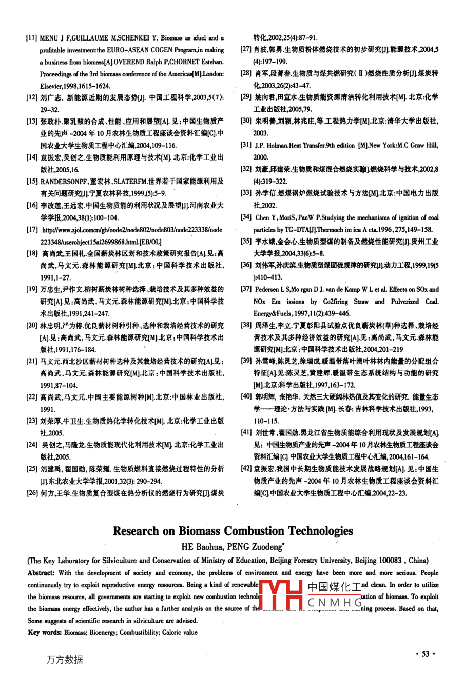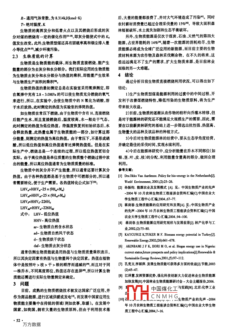 江西林業(yè)科技2007年第3期生物質(zhì)直接燃燒利用現(xiàn)狀何寶華,彭祚登(北京林業(yè)大學(xué)省部共建森林培育與保護教育部重點實驗室,北京100083)摘要:隨著社會經(jīng)濟的發(fā)展,環(huán)境問題和能源問題日益嚴重,人類開始加緊尋找可再生能源的步伐。在眾多的能源中,生物質(zhì)能以其清潔、可再生性等優(yōu)點受到了世界各國的廣泛關(guān)注,人們開始研究采用不同的方法及技術(shù)來燃燒生物質(zhì),以其獲取尋找最佳的燃燒利用方法,提高生物質(zhì)的喇用率。為了更有效地開發(fā)生物質(zhì)能源,本文詳細分析了目前生物質(zhì)的來源組成及直接燃燒的過程。在此基礎(chǔ)上,本文提出了今后在生物質(zhì)利用方面林業(yè)工作的研究內(nèi)容關(guān)鍵詞:生物質(zhì);生物質(zhì)能;燃燒特性;熱值分類號S216:TQ351文獻標識碼B文章編號:10062505(200703-0050-04隨著社會的發(fā)展,煤炭、石油等一次性能源不斷減少,世國的基本國情和生物質(zhì)利用開發(fā)水平而言生物質(zhì)直接燃燒技界面臨能源危機,生物質(zhì)、生物質(zhì)能越來越廣泛地被各國所術(shù)無疑是最簡便可行的高效利用生物質(zhì)資源的方式之重視從最初的認識生物質(zhì)是城市有機垃圾進而擴展到任1生物質(zhì)量何可再生的或可循環(huán)的有機物質(zhì)(不包括多年生長的用材生物質(zhì)是生物質(zhì)能的載體巨大的生物量為生物質(zhì)能利林)叫。生物質(zhì)能就是蘊藏在生物中的太陽能,是綠色植物通用的前提條件,世界上約有250000種生物每秒鐘獲得的太過光合作用將太陽能轉(zhuǎn)化為化學(xué)能而貯存在生物質(zhì)內(nèi)部的陽能相當于500萬t優(yōu)質(zhì)煤發(fā)出的能量,每年經(jīng)光合作用生能量明。成的生物質(zhì)能總量約為1440億~1800億,相當于3×10kJ生物質(zhì)能為直接或間接可利用的太陽能如何開發(fā)這種的能量,這大約相當于2000億t的標煤嗎是現(xiàn)在世界能源消能源國外許多國家都相繼制定了各自的生物質(zhì)能源研究開耗總量的10倍左右。地球上生物質(zhì)的潛力可達到現(xiàn)實能源發(fā)計劃。,如美國的能源農(nóng)場、日本的陽光計劃、巴西的酒精消費的180-200倍。BASF(德國的化學(xué)巨人)提供的材料表能源計劃以及印度的綠色能源工程等。目前生物質(zhì)利用方式明,我們用的生物質(zhì)能只占每年綠色植物固定的7%,尚有上有固化、汽化液化以及將生物質(zhì)直接燃燒等但是目前將93%還未利用。而地球上的綠色植物儲存的總能量大約相當生物質(zhì)轉(zhuǎn)化為酒精、石油替代物可燃氣等還停留在試驗階于8×10標準煤,比目前地殼內(nèi)已知可供開采的煤炭總儲段,并且成本較高如1970年代后期美國卡爾文為代表的科量還多11倍。所以開發(fā)利用生物質(zhì)能具有很大的潛力。巴西研小組,從世界上眾多的植物中篩選出了其液體成分類似于科學(xué)家 Josh miller提供的統(tǒng)計資料表明全球每年由光合作石油的植物(如續(xù)隨子、綠玉樹等),在南加州242hm2的土地用產(chǎn)生的生物質(zhì)(諸如樹葉、枝椏等)達1440-11800億四上試種獲得了年產(chǎn)50植物石油的成果阿,但目前直接利用目前世界上塑料垃圾以2500萬a的速度在自然界積累,這種類石油的產(chǎn)品還是很少。同時我國在1958年從前蘇聯(lián)這些有機物如果合理利用,也將是一筆巨大的能源財富,而引進了植物纖維水解技術(shù)設(shè)備在196年也停止了使用門。且能夠解決環(huán)境污染問題。直接燃燒釋放出的能量,為植物所固定的所有能薪材為陸地生物質(zhì)的主體,今后利用生物質(zhì)大多來源于量如何提高能量的利用率并將其更為有效地轉(zhuǎn)化為電能,薪材,所以計算薪材對于今后開發(fā)生物質(zhì)能源有重要意義。是目前最為有效的方式。歐美一些國家在處理秸稈的問題薪材生物量計算方法如下上,已經(jīng)做過大量的研究,并已經(jīng)應(yīng)用于生產(chǎn)。如丹麥Enstedye&rket's電廠,用生物質(zhì)替代煤作為燃料,每年少消耗(F y, Q+TX,YW8000煤媒因此每年減排CO1920p0我國第一個由龍基式中Sx-統(tǒng)計地域范圍的薪資量源,萬t電力公司投資建設(shè)的秸桿生物發(fā)電和超超臨界鍋爐設(shè)備研發(fā)生產(chǎn)基地正在北京市平谷區(qū)籌建同時龍基電力公司已i-范圍內(nèi)的區(qū)域數(shù),1,2,3…;于2006年11月在山東單縣投資建成了生物質(zhì)發(fā)電廠。就我i區(qū)域內(nèi)有薪炭林、防護林……共m種林地中國煤化工收稿日期2007-03-26CNMHG基金項目:十一五國家科技支撐計劃課題“能源林培育技術(shù)”編號:00BAD18B0;兩等⊥性服人壩H培育資金項目。作者簡介何寶華,男,碩士,主要研究方向:生物質(zhì)直接燃燒利用。通訊作者:彭祚登男博士,副教授主要研究方向:能源林培育,E-mailzuodeng@sina.com501,2,3,…,m;性的研究表明,生物質(zhì)燃料與化石燃料在燃燒過程中的燃燒F-在i區(qū)域內(nèi)m種林地各占不同的面積萬hm2;機理、反應(yīng)速度以及燃燒產(chǎn)物存在較大差別,生物質(zhì)燃料具y-某種林地的產(chǎn)材率(每公頃一年產(chǎn)材量),kg/h有不同于化石燃料的燃燒特性。Q4-該種林地可取薪材面積系數(shù);21生物質(zhì)燃料特點T-在i區(qū)域內(nèi)m種四旁林產(chǎn)材率(每株一年產(chǎn)材量)作為最早的一種能源載體生物質(zhì)燃料具