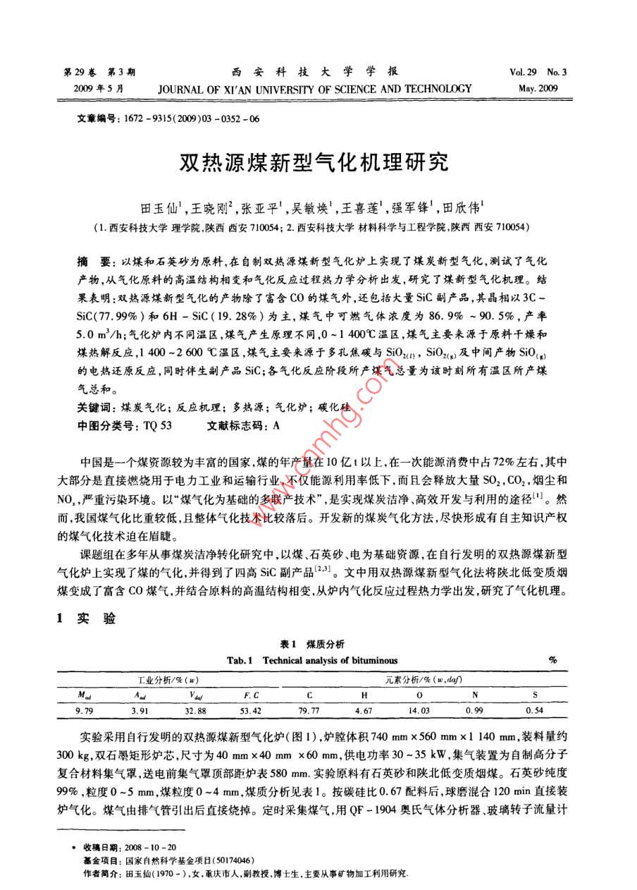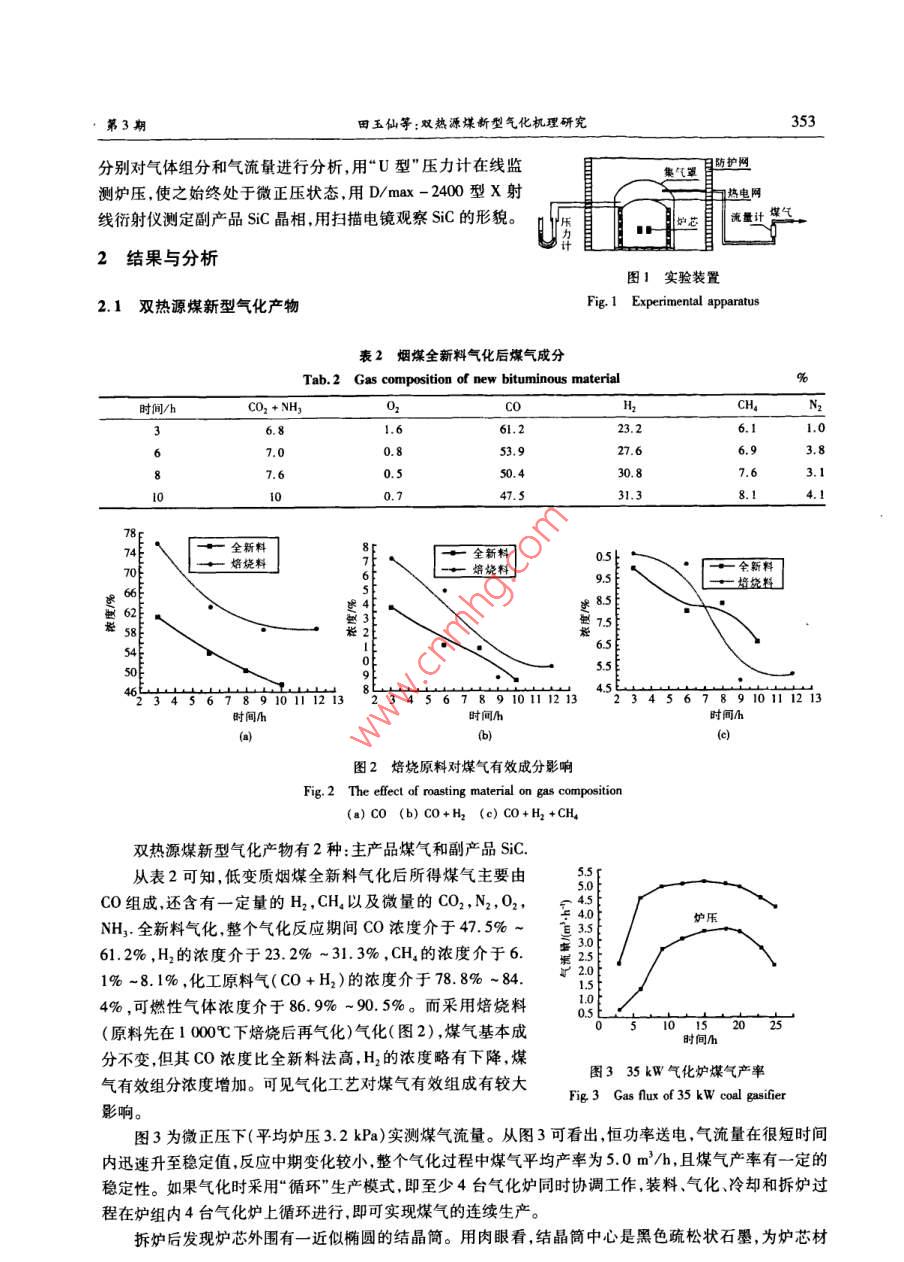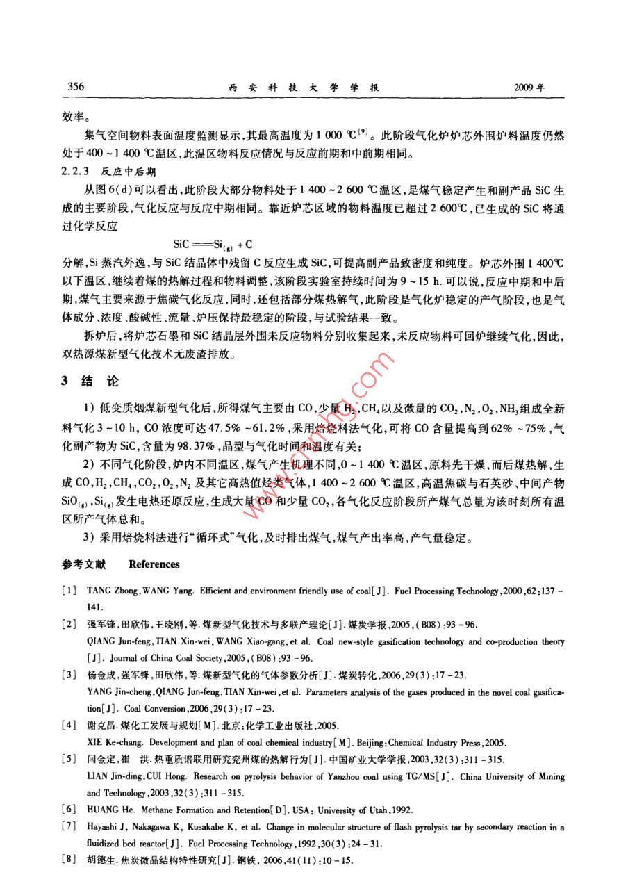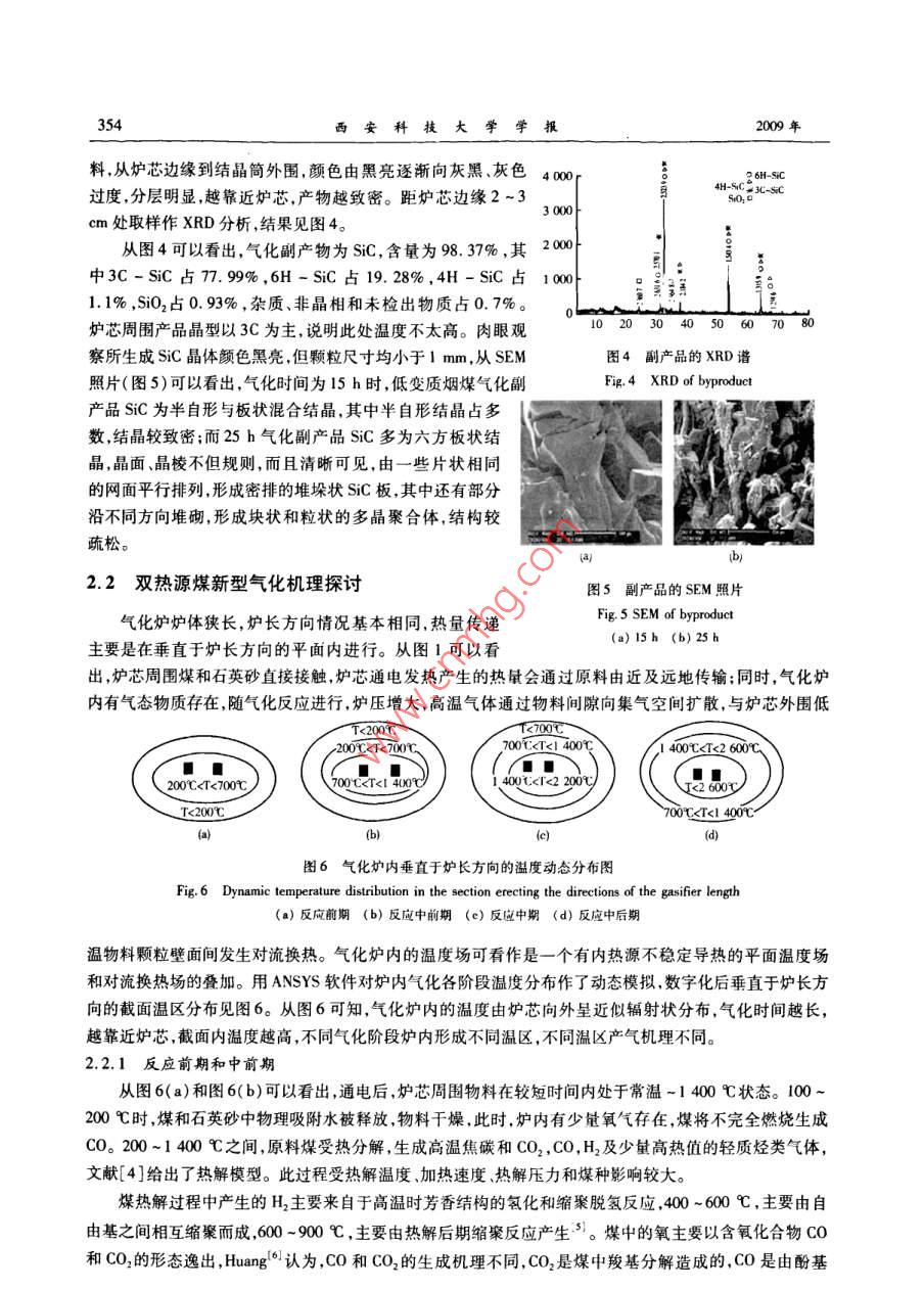 第29卷第3期西安科技大學(xué)學(xué)報Vol.29 No.32009年5月JOURNAL OF XI'AN UNIVERSITY OF SCIENCE AND TECHNOLOCYMay. 2009文章編號: 1672 -9315(2009)03 -0352 -06雙熱源煤新型氣化機理研究田玉仙' ,王曉剛”,張亞平',吳敏煥',王喜蓮' ,強軍鋒' ,田欣偉'(1.西安科技大學(xué)理學(xué)院.陜西西安710054; 2.西安科技大學(xué)材料科學(xué)與工程學(xué)院,陜西西安710054)商要:以煤和石英砂為原料,在自制雙熱源煤新型氣化爐上實現(xiàn)了煤炭新型氣化,測試了氣化產(chǎn)物,從氣化原料的高溫結(jié)構(gòu)相變和氣化反應(yīng)過程熱力學(xué)分析出發(fā),研究了煤新型氣化機理。結(jié)果表明:雙熱源煤新型氣化的產(chǎn)物除了富含CO的煤氣外,還包括大量SiC副產(chǎn)品,其晶相以3C -SiC(77. 99%)和6H - SiC(19. 28%)為主,煤氣中可燃?xì)怏w濃度為86. 9% ~90. 5%,產(chǎn)率5.0 m'/h;氣化爐內(nèi)不同溫區(qū),煤氣產(chǎn)生原理不同,0~1 400C溫區(qū),煤氣主要來源于原料干燥和煤熱解反應(yīng),1 400-2600 C溫區(qū),煤氣主要來源于多孔焦碳與SiO2u), SiOze及中間產(chǎn)物Si0。的電熱還原反應(yīng),同時伴生副產(chǎn)品SiC;各氣化反應(yīng)階段所產(chǎn)煤氣總量為該時刻所有溫區(qū)所產(chǎn)煤氣總和。關(guān)鍵詞:煤炭氣化;反應(yīng)機理;多熱源;氣化爐;碳化硅中圖分類號: TQ 53文獻(xiàn)標(biāo)志碼: A中國是一個煤資源較為豐富的國家,煤的年產(chǎn)量在10億t以上,在一次能源消費中占72%左右,其中大部分是直接燃燒用于電力工業(yè)和運輸行業(yè),不僅能源利用率低下,而且會釋放大量SO2,CO2,煙塵和NO,,嚴(yán)重污染環(huán)境。以“ 煤氣化為基礎(chǔ)的多聯(lián)產(chǎn)技術(shù)”,是實現(xiàn)煤炭潔凈高效開發(fā)與利用的途徑"。然而,我國煤氣化比重較低,且整體氣化技術(shù)比較落后。開發(fā)新的煤炭氣化方法,盡快形成有自主知識產(chǎn)權(quán)的煤氣化技術(shù)迫在眉睫。課題組在多年從事煤炭潔凈轉(zhuǎn)化研究中,以煤、石英砂、電為基礎(chǔ)資源,在自行發(fā)明的雙熱源煤新型氣化爐上實現(xiàn)了煤的氣化,并得到了四高SiC副產(chǎn)品23。文中用雙熱源煤新型氣化法將陜北低變質(zhì)煙煤變成了富含Co煤氣,并結(jié)合原料的高溫結(jié)構(gòu)相變,從爐內(nèi)氣化反應(yīng)過程熱力學(xué)出發(fā),研究了氣化機理。1實驗表1煤質(zhì)分析Tab.1 Technical analysis of bituminous%工業(yè)分析/%(u),元素分析/% (w,du)MatAaF.CNS9.793.9153.424.6714.030.99實驗采用自行發(fā)明的雙熱源煤新型氣化爐(圖1) ,爐膛體積740 mm x560 mmx1 140 mm,裝料量約300 kg.雙石墨矩形爐芯,尺寸為40 mm x40 mm x60 mm,供電功率30~35 kW,集氣裝置為自制高分子復(fù)合材料集氣罩,送電前集氣罩頂部距爐表580mm.實驗原料有石英砂和陜北低變質(zhì)煙煤。石英砂純度99% ,粒度0~5 mm,煤粒度0~4 mm,煤質(zhì)分析見表1。按碳硅比0.67配料后,球磨混合120 min直接裝爐氣化。煤氣由排氣管引出后直接燒掉。定時采集煤氣,用QF - 1904奧氏氣體分析器、玻璃轉(zhuǎn)子流量計收稿日期: 2008-10-20基金項目:國家自然科學(xué)基金項日(50174046)作者簡介:田玉仙( 1970- ).女,重慶市人,副教授,博士生,主要從事礦物加工利用研究.第3期田玉仙等:雙熱源煤新型氣化機理研究353分別對氣體組分和氣流量進(jìn)行分析,用“U型"壓力計在線監(jiān)集氣罩防護(hù)網(wǎng)測爐壓,使之始終處于微正壓狀態(tài),用D/max-2400型X射]熱電網(wǎng)線行射儀測定副產(chǎn)品SiC晶相,用掃描電鏡觀察SsiC的形貌。流量計2結(jié)果與分析圖1 實驗裝置2.1雙熱源煤新型氣化產(chǎn)物Fig. 1 Experimental apparatus表2煙煤全新料氣化后煤氣成分Tab.2 Gas composition of new bituminous material時間/hCO2 + NH,02_CHCHV236.81.661.223.26.1.07.00.827.63.87.60.5s0.430.83.100.747.58.4.178ε74E \一全新料+全新料]70E一-焙燒料熔燒料」9.S+全新料:培燒料; 66i 62Ee 58包7.5s4soE46253456789101213823456789101112132345678910111213時間ha)(bc)圖2焙燒原料對煤氣有 效成分影響Fig.2 The ffet of roasting material on gas composition(a)CO (b) C0+H2 (c) CO+H2 +CH,雙熱源煤新型氣化產(chǎn)物有2種:主產(chǎn)品煤氣和副產(chǎn)品SiC.從表2可知,低變質(zhì)煙煤全新料氣化后所得煤氣主要由CO組成,還含有一定量的H2,CH。以及微量的CO2,N2,02,。455爐樂NH,.全新料氣化,整個氣化反應(yīng)期間CO濃度介于47.5% ~61.2% ,H2的濃度介于23.2% ~31. 3% , CH.的濃度介于6.中3.0E果25F1% ~8. 1% ,化工原料氣(CO + H2)的濃度介于78.8% ~ 84.4%,可燃性氣體濃度介于86. 9% ~ 90. 5%。而采用焙燒料(原料先在1 000C下焙燒后再氣化)氣化(圖2),煤氣基本成05105205分不變,但其co濃度比全新料法高,H2的濃度略有下降,煤圖3 35 kW氣化爐煤氣產(chǎn)率氣有效組分濃度增加??梢姎饣に噷γ簹庥行ЫM成有較大Fig3 Gas flux of 35 kW coal gasifier影響。圖3為微正壓下(平均爐壓3.2 kPa)實測煤氣流量。從圖3可看出,恒功率送電,氣流量在很短時間內(nèi)迅速升至穩(wěn)定值,反應(yīng)中期變化較小,整個氣化過程中煤氣平均產(chǎn)率為5.0 m'/h,且煤氣產(chǎn)率有一-定的穩(wěn)定性。如果氣化時采用“循環(huán)”生產(chǎn)模式,即至少4臺氣化爐同時協(xié)調(diào)工作,裝料、氣化、冷卻和拆爐過程在爐組內(nèi)4臺氣化爐上循環(huán)進(jìn)行,即可實現(xiàn)煤氣的連續(xù)生產(chǎn)。拆爐后發(fā)現(xiàn)爐芯外圍有一-近似橢圓的結(jié)晶簡。用肉眼看,結(jié)晶筒
