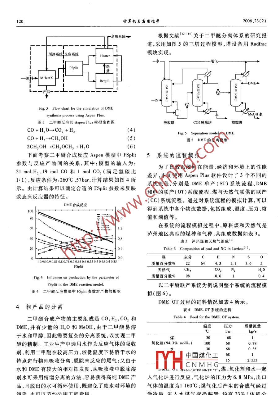第23卷第2期計(jì)算機(jī)與友用化學(xué)Vol 23. No. 22006年2月28日Computers and Applied ChemistryFebruary, 2006基于合成氣的聯(lián)供聯(lián)產(chǎn)系統(tǒng)仿真周齊宏,胡山鷹,陳定江,李有潤,周麗(清華大學(xué)化學(xué)工程系,北京,100084)摘要:在分析構(gòu)成聯(lián)供聯(lián)產(chǎn)系統(tǒng)中關(guān)鍵技術(shù)的基礎(chǔ)上,利用 Aspen Plus軟件對系統(tǒng)的單元操作過程進(jìn)行了建模仿真工作。通過不同技術(shù)的組合,得到了二甲醚單產(chǎn)系統(tǒng)、二甲醚與電力的聯(lián)產(chǎn)系統(tǒng)、煤與天然氣聯(lián)供的二甲醚電力聯(lián)產(chǎn)系統(tǒng),并通過模型的仿真計(jì)算,計(jì)算出各自系統(tǒng)中關(guān)鍵節(jié)點(diǎn)的物流和能流數(shù)據(jù),為后續(xù)的3E研究提供了可靠的數(shù)據(jù)。關(guān)鍵詞:聯(lián)產(chǎn)聯(lián)供;模擬;煤;天燃?xì)?二甲醚中圖分類號(hào):TQ021.8文獻(xiàn)標(biāo)識(shí)碼:A文章編號(hào):10014160(2006)02-118-122System simulation of Co-feed and Co-generation system based on the syngasZHOU QiHong, HU Shan Ying, CHEN DingJiang, LI YouRun and ZHOU LiDepartment of Chemical Engineering, Tsinghua University, Beijing, 100084, China)Abstract: The advanced technologies of coal or NG gasification, the synthesis of DME in the liquid phase and IGCC are key to the in-egration involved in the standalone system for DME, co-generation system for DME and electricity, and the co-feed( from coal andNG)& co-production system for DME and electricity. Several unit process models have been built with the aid of the software Aspen-Plus on the basis of analyzing those key technologies. Through the designs, simulations and calculations of the standalone system, co-generation system and Co-Co system, simulation results concerning material flows and energy flows of the systems are obtained, whichare the base for the subsequent study on energy, economy and environment.Key words: co-feed and co-generation, simulation coal, natural gas, DMEZhou QH, Hu SY, Chen DJ, Li YR and Zhou L. System simulation of Co-feed and Co-generation system based onthe syngas. Computers and applied Chemistry, 2006, 23(2): 118-1221引言干可能的聯(lián)供聯(lián)產(chǎn)系統(tǒng)構(gòu)成,利用 Aspen plus仿真工具對上述可能的系統(tǒng)構(gòu)成進(jìn)行建模仿真。根據(jù)建我國是一個(gè)以煤炭為主要能源的國家,其在國模仿真的數(shù)據(jù)結(jié)果,在本文的下篇中將分析系統(tǒng)的民經(jīng)濟(jì)中具有重要的意義:煤炭的清潔利用不但是能量利用情況、經(jīng)濟(jì)性能和對環(huán)境的影響。國民經(jīng)濟(jì)持續(xù)高速發(fā)展的必要保證,同時(shí)也是改善自然生態(tài)環(huán)境的關(guān)鍵。在四川瀘州地區(qū)有大量尚未2氣化過程開發(fā)利用的煤炭資源和已開發(fā)使用的天然氣資聯(lián)供聯(lián)產(chǎn)系統(tǒng)的核心是合成氣(主要成分CO源口,在未來20年內(nèi)這些化石能源的利用不但會(huì)促和H1),不同原料通過不同的氣化技術(shù)路線變?yōu)楹线M(jìn)地方經(jīng)濟(jì)的發(fā)展同時(shí)也會(huì)帶動(dòng)周邊地區(qū)的發(fā)展,成氣,繼而進(jìn)行下游產(chǎn)品的生產(chǎn)。并為長江中下游城市提供可靠的能源供給。2.1煤氣化以煤、天然氣等化石燃料為原料,通過氣化技術(shù)在眾多煤氣化技術(shù)中2,噴流床技術(shù)是聯(lián)得到合成氣,并利用合成氣生產(chǎn)多種產(chǎn)品的復(fù)合系供——聯(lián)產(chǎn)系統(tǒng)的最佳選擇,這主要是因?yàn)?(1)該統(tǒng)稱為基于合成氣的聯(lián)供聯(lián)產(chǎn)系統(tǒng),這些產(chǎn)品包括:類技術(shù)設(shè)備的單位容積的生產(chǎn)能力高;(2)沒有焦電、液體燃料(FT液體燃料、二甲醚、甲醇等)、城市油和酚類物質(zhì),后處理過程較簡單;(3)產(chǎn)生惰性熔用的有女2之參先支在數(shù)析構(gòu)傲產(chǎn)系碳轉(zhuǎn)化率高(可達(dá)99%)。張斌中國煤化工對噴流床氣化爐進(jìn)行統(tǒng)的關(guān)鍵技術(shù)基礎(chǔ)上,將這些技術(shù)進(jìn)行組合,得到若了模CNMH建立了煤氣化模塊收稿日期:200508-16;修回日期:2005-10-24基金資助:國家自然科學(xué)基金重點(diǎn)資助項(xiàng)目(20436040)作者簡介:周齊宏(1979—),男,北京人,碩士研究生,系統(tǒng)工程專業(yè).聯(lián)系人:胡山鷹2006,23(2)周齊宏等:基于合成氣的聯(lián)供聯(lián)產(chǎn)系統(tǒng)仿真119(圖1):將煤定義為非常規(guī)物質(zhì)COAL,同時(shí)還定義在模型的燃燒室中進(jìn)行甲烷燃燒反應(yīng), Chris了ASH(灰)和UBC(未燃燼碳)兩種非常規(guī)(NC)物 tensen(6推薦采用亞化學(xué)計(jì)量燃燒反應(yīng)式(式1)來質(zhì),在 Yield模塊中將COAL分解為指定產(chǎn)量的物簡化,這可用 Aspen Plus中的反應(yīng)器模塊 SToic實(shí)流Comp,其包括H2、N2、S、O2、C單質(zhì)、ASH和UBC,現(xiàn);氧化完全轉(zhuǎn)化后,過量的甲烷和生成物一起進(jìn)入由煤的元素分析和指定的碳轉(zhuǎn)化率確定物流Comp催化劑床層進(jìn)行絕熱重整反應(yīng);重整反應(yīng)的主要反的組成,然后再將物流Comp與分解放出的熱量和應(yīng)有強(qiáng)吸熱的蒸汽重整(式2)和弱放熱的水煤氣變氧氣、水等物流一起通入到 RGibbs模塊中,由煤氣換反應(yīng)(式3),通過 Aspen Plus中的反應(yīng)器模塊化過程化學(xué)反應(yīng)特性的分析來確定產(chǎn)物(包括CO、 requir實(shí)現(xiàn)。H2、CO2、H2O、CH4、H2S、COS、Ar和N2),并考慮CH,+1.50,→C0+2