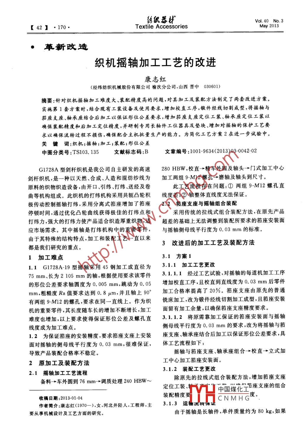 織器材Vol 40 No. 3【42】·170Textile AccessoriesMay 2013革新政造織機搖軸加工工藝的改進康志紅(經(jīng)緯紡織機械股份有限公司榆次分公司,山西晉中030601)摘要:針對織機搖軸加工難度大、裝配精度高的問題,對其加工及裝配方法制定了兩套改進方案。實施第1套方案時,結(jié)合現(xiàn)有工裝設(shè)備及使用要求,增加校直工序,鍛件經(jīng)線切割成型,將搖軸與筘座支座、軸承座結(jié)合后加工以保證形位公差要求,增加筘座支座定位工裝、軸承座定位工裝以確保裝配精度和后加工定位精度,并研制專用長軸件工位器具及墊塊、增加對搖軸的保護工藝要求以確保流轉(zhuǎn)過程不損傷,確保配合主機批量生產(chǎn)的能力。為簡化工藝方案2在進一步試驗中。關(guān)鍵詞:織機;搖軸;加工;裝配;形位公差中圖分類號:TS103.135文獻標志碼B文章編號:1001-9634(201303004202G1728A型劍桿織機是我公司自主研發(fā)的高速280HBW,校直→精車外圓及軸頭→門式加工中心劍桿織機,是一種以天然、合成、人造和混紡紗線為加工兩組9M12螺孔→磨軸及軸頭到尺寸原料的織物織造設(shè)備,由開口、引緯、打緯、送經(jīng)及卷此工藝流程存在問題:①兩組9M12螺孔直曲等機構(gòu)組成。此織機的打緯機構(gòu)采用共軛凸輪積線度差;②軸整體直線度無法保證。極傳動控制搖軸打緯,采用分離式筘座增加了筘座2.2筘座支座與搖軸組合裝配停頓時間,通過優(yōu)化凸輪曲線獲得極佳的打緯點和采用傳統(tǒng)的拉線式組合裝配方法,在原先產(chǎn)品打緯力,強大的打緯力使產(chǎn)品適合織造厚重織物,適超差的基礎(chǔ)上無法調(diào)整到裝配所要求的筘座安裝面應(yīng)市場需求。其中搖軸是打緯機構(gòu)中的重要零件,與搖軸側(cè)母線平行度為0.03mm的標準由于其特殊的結(jié)構(gòu)特點,加工和裝配工藝一直以來3改進后的加工工藝及裝配方法都是我們研究的重點。1加工難點3.1方案11.1G1728A19型搖軸采用45鋼加工成直徑為3.11加工工藝更改75mm、長為2105mm的軸,根據(jù)使用要求該零件3.1.1.1經(jīng)過工藝試驗,對播軸的每道機加工工序的形位公差要求軸圓度為0.005mm,跳動為0.05增加校直工序,且校直到直線度為0.03mm后零件mm,粗糙度Ra值要求達到08pm,并且軸上90°加工合格率提高了20%。筘座支座由原先的普通有兩組9M12的螺孔,要求在同一直線上。作為織銑床加工,改為鍛件經(jīng)線切割加工成型,且筘座安裝機的重要零件,其長度隨車長的增加不斷增長,加工面留有加工余量,以確保筘座支座精度要求難度也增加,以上要求使得保證形位公差及螺孔直3.1.12將原需靠加工保證的筘座安裝面與搖軸線度成為加工難點。側(cè)母線平行度為0.03mm的要求,改為將播軸與筘1.2為保證筘座的安裝精度,要求筘座支座上安裝座支座、軸承座結(jié)合后加工以保證形位公差要求,具面對搖軸的側(cè)母線平行度為0.03mm,很難保證,體工藝流程如下導(dǎo)致產(chǎn)品裝配合格率不穩(wěn)定。搖軸與筘座支座軸承座組合→校直→立式加2原加工及裝配方法工中心加工筘座安裝面。3.1.2裝配工藝更改2.1搖軸加工工藝流程備料→車外圓到76mm調(diào)質(zhì)處理240HBW除原先的拉線式組合裝配方法,增加筘座支座定位工裝、中國煤化了節(jié)座支座的組合度收稿日期:201301-04裝配精度CNMHG作者簡介:康志紅(1970-),女,河北井陘人,工程師,主3.1.3運輔休證要從事機械設(shè)計及工藝方面的研究。由于搖軸是長軸件,單件質(zhì)量約為80kg,如果第40卷第3期紡織器2013年5月Textile Accessories171·【43】流轉(zhuǎn)運輸過程不進行相應(yīng)保護,即使加工后精度得先的軸承座定位工裝不變,可保證筘座安裝前筘座以保證,但其經(jīng)過廠內(nèi)流轉(zhuǎn)后直線度精度也會被損支座的平面度及直線度要求,提高了梭道的安裝精失,最嚴重的出現(xiàn)了直線度0.6mm,超差近0.55度,減少了外出安裝的工作量。mm,以致于組合后無法調(diào)整;為此,增加單件保護工藝,研制了專用于長軸件的工位器具和專用墊塊,結(jié)語并用3塊墊塊將搖軸墊起后流轉(zhuǎn)。通過工藝試驗及與相關(guān)工藝、裝配、設(shè)計人員討32方案2論,在盡可能使用現(xiàn)有工裝設(shè)備保證使用要求的基3.2.1加工工藝更改礎(chǔ)上,采用了方案1進行改進,增加相關(guān)設(shè)備、刀具3.2.1.1為了降低兩組9M12螺孔的加工難度,工藝、工裝確保其配合主機批量生產(chǎn)的能力;工藝通過對產(chǎn)品性能的研究,取消原播軸上螺孔,改為銑設(shè)計人員對方案2在做進一步的試驗,對工藝、設(shè)計個平面以便于加工和定位,使加工難度降低。中產(chǎn)生的問題逐個解決,下階段將進入小批量試制3.2.1.2筘座支座圓配合面增加一平面,只需要按階段,待上車試驗成熟后進行批量生產(chǎn),在保證產(chǎn)品要求加工成型;取消了方案1中增加的組合后對筘使用功能的基礎(chǔ)上將更加簡化工藝。座安裝面的加工要求,這樣既解放了加工中心及組合后校直工序,達到工藝優(yōu)化流程簡化的目的,又參考文獻:可以保證產(chǎn)品圖紙公差要求,且進一步減少了長軸1]成大先周國慶張紅兵,等.機械設(shè)計手冊[M].北京:件在廠內(nèi)流轉(zhuǎn)帶來的精度損失,達到了降低零件制化學(xué)工業(yè)出版社,2004造成本的目的。具體見圖1[2]楊傅泉,馬九榮.機械工人切削手冊[M].北京:機械工業(yè)出版社,2003[3]聶毓