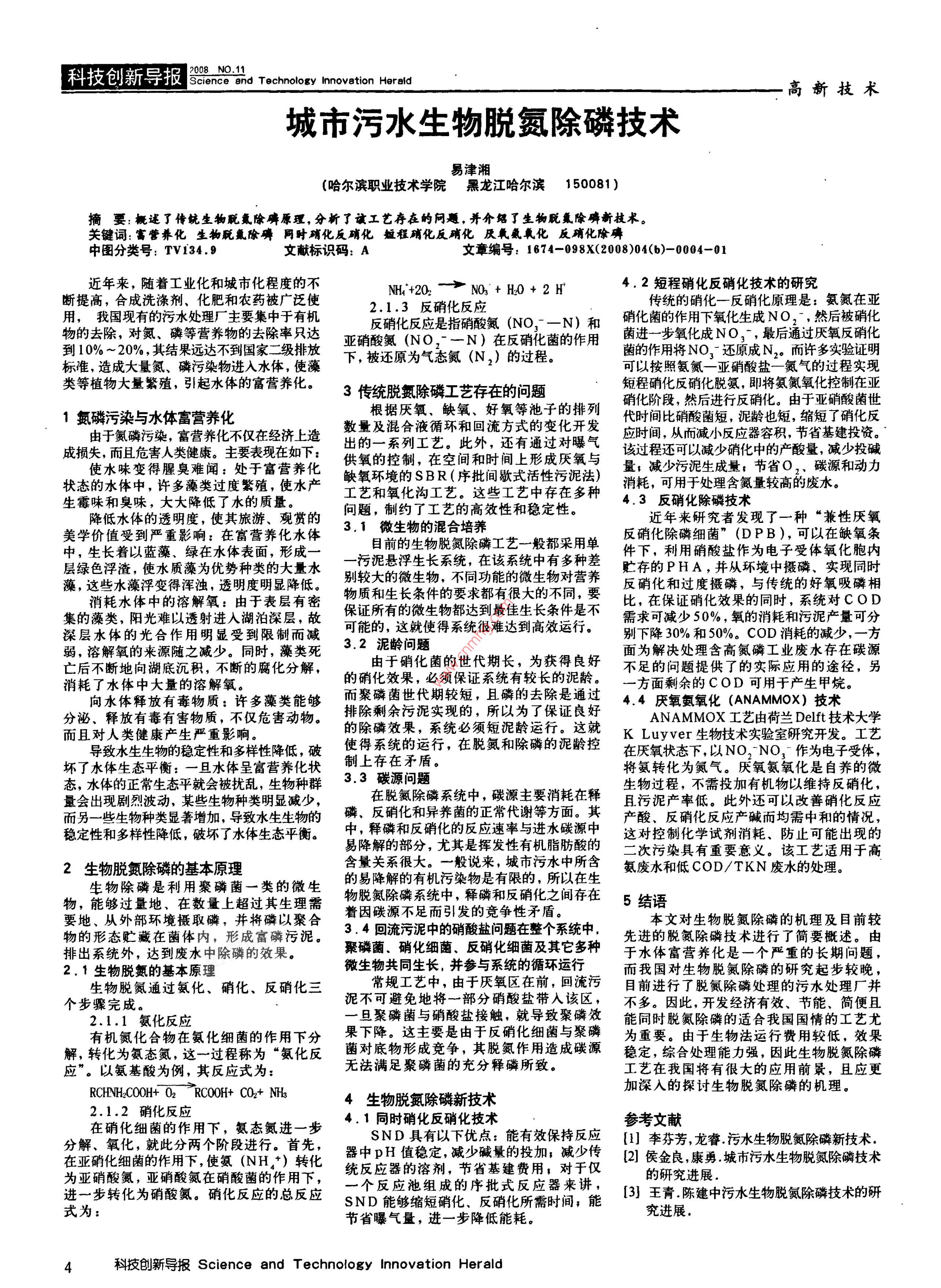 科技創(chuàng)新導(dǎo)報dmny Innov ation Herald高新技術(shù)城市污水生物脫氮除磷技術(shù)易津湘〔哈爾濱職業(yè)技術(shù)學(xué)院黑龍江哈爾濱150081)摘要:概逑了傳魷生物脫除齊原理,分析了放工藝存在的問題,并介紹了生物駝煮除新技術(shù)關(guān)鍵詞:富訾養(yǎng)化生物脫氯除瘴冏時蹲化反硝化短程硝化反硝化厭氧氨化反蹦化除膺中圖分類號:Tv134.9文獻(xiàn)標(biāo)識碼:A文章編號:1674-098X(2008)04(b)-004-01近年來,隨著工業(yè)化和城市化程度的不NH+20:M3+H0+2H4.2短程硝化反硝化技術(shù)的研究斷提髙,合成洗滌劑、化肥和農(nóng)藥被廣泛使2.1.3反硝化反應(yīng)傳統(tǒng)的硝化一反硝化原理是:氨氮在亞用,我國現(xiàn)有的污水處理廠主要集中于有機物的去除,對氮、磷等營養(yǎng)物的去除率只達(dá)反硝化反應(yīng)是指硝酸氮(NO,-N)和硝化菌的作用下氧化生成No2,然后被硝化亞硝酸氮(NON)在反硝化菌的作用菌進(jìn)步氧化成NO,最后通過厭氧反硝化到10%~20%,其結(jié)果遠(yuǎn)達(dá)不到國家二級排放標(biāo)準(zhǔn),造成大量氮、磷污染物進(jìn)入水體,使藻下,被還原為氣態(tài)氮(N2)的過程。菌的作用將NO還原成N2。而許多實驗證明可以按照氨氮一亞硝酸鹽一氮氣的過程實現(xiàn)類等植物大量繁殖,引起水體的富營養(yǎng)化。3傳統(tǒng)脫氮除磷工藝存在的問題短程硝化反硝化脫氨,即將氨氮氧化控制在亞硝化階段,然后進(jìn)行反硝化。由于亞硝酸菌世由于氮磷污染,富營養(yǎng)化不僅在經(jīng)濟上造數(shù)量及混合液循環(huán)和回流方式的變化開發(fā)代時間比硝酸菌短,泥齡也短,縮短了硝化反氮磷污染與水體富營養(yǎng)化成損失,而且危害人類健康。主要表現(xiàn)在如下該過程還可以減少硝化中的產(chǎn)酸量,減少投堿使水味變得臭難聞:處于富營養(yǎng)化氫的控制,在空間和時間上形成厭氧與量,誠少污泥生成量,節(jié)省02碳源和動力狀態(tài)的水體中,許多藻類過度紫殖,使水產(chǎn)缺氧環(huán)境的SBR(序批間歇式活性污泥法)消耗,可用于處理含氮量較商的廢水。生霉味和臭味,大大降低了水的質(zhì)量。工藝和氧化溝工藝。這些工藝中存在多種降低水體的透明度,使其旅游、觀賞的問題,制約了工藝的高效性和穩(wěn)定性。4.3反硝化除磷技術(shù)美學(xué)價值受到嚴(yán)重影響:在富營養(yǎng)化水體3.1微生物的混合培養(yǎng)近年來研究者發(fā)現(xiàn)了一種“兼性厭氧中,生長著以藍(lán)藻、綠在水體表面,形成目前的生物脫氮除磷工藝一般都采用單件下,利用硝酸鹽作為電子受體氧化胞內(nèi)層綠色浮渣,使水質(zhì)藻為優(yōu)勢種類的大景水一污泥懸浮生長系統(tǒng),在該系統(tǒng)中有多種差貯存的PHA,并從環(huán)境中磷、實現(xiàn)同時藻,這些水藻浮變得渾濁,透明度明顯降低。別較大的微生物,不同功能的微生物對營養(yǎng)反硝化和過度概磷,與傳統(tǒng)的好氧吸磷相消耗水體中的溶解氧:由于表層有密物質(zhì)和生長條件的要求都有很大的不同比,在保證硝化效果的同時,系統(tǒng)對COD集的藻類,陽光難以透射進(jìn)入湖泊深層,敞保證所有的微生物都達(dá)到最佳生長條件是不需求可減少50%,氧的消耗和污泥產(chǎn)量可分深層水體的光合作用明顯受到限制而減可能的,這就使得系統(tǒng)很難達(dá)到高激運行別下降30%和50%。COD消耗的減少,一方弱,溶解氧的來源隨之減少。同時,藻類死3.2泥嶺問題由于硝化菌的世代期長,為獲得良好不足的問題提供了的實際應(yīng)用的途徑,另亡后不斷地向湖底沉積,不斷的腐化分W,的硝化效果,必須保證系統(tǒng)有較長的泥齡向水體釋放有毒物質(zhì):許多藻類能夠而聚磷菌世代期較短,且磷的去除是通過44厭氧氨氧化( ANAMMOX)技術(shù)分泌、釋放有毒有害物質(zhì),不僅危害動物。排除剩余污泥實現(xiàn)的,所以為了保證良好ANAMMOX工藝由荷蘭Delt術(shù)大學(xué)而且對人類健康產(chǎn)生嚴(yán)重影響。的除磷效果,系統(tǒng)必須短泥齡運行。這就 K Luyver生物技術(shù)實驗室研究開發(fā)。工藝導(dǎo)致水生生物的穩(wěn)定性和多樣性降低,破使得系統(tǒng)的運行,在脫氮和除磷的泥齡控在厭氧狀態(tài)下,以NO2NO2作為電子受體,壞了水體生態(tài)平衡:一旦水體呈富營養(yǎng)化狀制上存在矛盾將氨轉(zhuǎn)化為氮氣。厭氧氨氧化是自養(yǎng)的微在脫氫除磷系統(tǒng)中,碳源主要消耗在釋生物過程,不需投加有機物以維持反硝化,而另一些生物種類顯著增加,導(dǎo)致水生生物的磷,反硝化和異養(yǎng)菌的正常代謝等方面。其產(chǎn)酸、反硝化反應(yīng)產(chǎn)堿而均需中和的情況穩(wěn)定性和多樣性降低,破壞了水體生態(tài)平衡。中,釋磷和反硝化的反應(yīng)速率與進(jìn)水碳源中這對控制化學(xué)試劑消耗、防止可能出現(xiàn)的易降解的部分,尤其是揮發(fā)性有機脂肪酸的二次污染具有重要意義。該工藝適用于高2生物脫氮除磷的基本原理含量關(guān)系很大。般說來,城市污水中所含氨廢水和低COD/TKN廢水的處理。生物除磷是利用聚磷菌一類的微生的易降解的有機污染物是有限的,所以在生物,能夠過量地、在數(shù)量上超過其生理需物脫氮除磷系統(tǒng)中,釋磷和反硝化之間存在5結(jié)語要地、從外部環(huán)境嶶取磷,并將磷以聚合著因碳源不足而引發(fā)的競爭性矛盾。物的