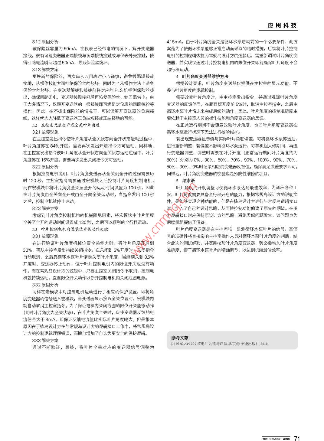 爛料技瓜循環(huán)水泵葉片角度變送器在三門核電的應(yīng)用袁鳳學(xué)(浙江三門核電有限公司,浙江臺(tái)州317112)嘀摘要三門核電循環(huán)水泵葉片角度可調(diào),可使循環(huán)水泵在各種運(yùn)行工況下均能獲得最大的效率,而葉片角度變送器在調(diào)莖循環(huán)水泵葉片過(guò)程中起到至關(guān)重要的作用,本文介紹了循環(huán)水泵葉片角度調(diào)節(jié)的原理,并結(jié)合葉片角度變送器在調(diào)試過(guò)程中遇到的問(wèn)題和解決方案,為同行提供借鑒。[關(guān)鍵詞三門核電;循環(huán)水泵;葉片角度;變送器三門核電循環(huán)水泵葉片角度可調(diào),在季節(jié)變化引起海水溫度變動(dòng)或者機(jī)組功率改變時(shí),可以通過(guò)調(diào)整循環(huán)水泵的葉片角度,以提高機(jī)組的冷卻效率,降低耗能。同時(shí)葉片角度可調(diào)使循環(huán)水泵在各種運(yùn)行工況下均能獲得最大的效率,而葉片角度變送器在循環(huán)水泵葉片調(diào)節(jié)過(guò)程中起到了至關(guān)重要的作用。1葉片角度調(diào)節(jié)原理葉片角度的調(diào)節(jié)主要通過(guò)葉片控制電機(jī)的旋轉(zhuǎn)帶動(dòng)先導(dǎo)閥上下移動(dòng),進(jìn)而改變控制液壓油流向,液壓油驅(qū)動(dòng)伺服汽缸中的活塞動(dòng)作,活塞帶動(dòng)整個(gè)控制杄和操作架上移,操作架通過(guò)球窩接頭與葉片連接,促使葉片沿葉片軸線旋轉(zhuǎn),即改變?nèi)~片角度。下面簡(jiǎn)要介紹葉片角度增大的調(diào)節(jié)過(guò)程。1)葉片控制電機(jī)向開啟方向轉(zhuǎn)動(dòng),如圖1中1所示。2)先導(dǎo)閥通過(guò)連桿裝置向上開啟,如圖1中2所示。3)控制油依次通過(guò)導(dǎo)閥和油管路進(jìn)入伺服汽缸活塞的下部腔室,同時(shí)伺服汽缸活塞的上部腔室控制油依次通過(guò)油管路和先導(dǎo)閥排出,如圖1中3所示。4)控制油推動(dòng)活塞和控制杄向上移動(dòng),如圖2中4所示。5)控制杄帶動(dòng)操作桿移動(dòng),使葉片向開啟方向運(yùn)動(dòng),如圖2中5所示。6控制桿的上移通過(guò)連桿裝置帶動(dòng)先導(dǎo)閥下移,最終使先導(dǎo)閥關(guān)閉,阻止控制油流動(dòng),葉片角度保持,如圖3中6所示。2葉片角度變送器的原理控制桿的上下位移通過(guò)連桿裝置轉(zhuǎn)換成軸向桿的角位移,進(jìn)而帶動(dòng)葉片角度變送器內(nèi)電阻值的變化,內(nèi)部電阻值的改變通過(guò)電路轉(zhuǎn)換成標(biāo)準(zhǔn)電流信號(hào),送到主控室用于顯示QQQ①①⑤⑥1基唑、2外殼、3調(diào)節(jié)螺釘、4定位指針、5軸向桿、6屏蔽殼7刻度盤、8轉(zhuǎn)換元件、9PCB板、10連接軸、11申撞接頭理3葉片角度變送器調(diào)試過(guò)程中出現(xiàn)的問(wèn)題和解決方案葉片角度變送器在調(diào)試過(guò)程中出現(xiàn)了很多問(wèn)題,但是,最后通過(guò)調(diào)整或采取臨時(shí)措施都使問(wèn)題得到了很好的解決,保證了循環(huán)水泵的按時(shí)啟動(dòng)下面介紹主要的問(wèn)題和處理措施1變送器輸入AI卡件前保險(xiǎn)死燒壞311故障現(xiàn)象PLS機(jī)柜已經(jīng)帶電,就地測(cè)量變送器電壓為24VDC,解開變送器接線,將萬(wàn)用表打到電流檔,并串入電流反饋回路,顯示電流為0mA,再次測(cè)量變送器兩端接線電壓為0DC。經(jīng)在PLS機(jī)柜側(cè)檢查發(fā)現(xiàn)A卡件前變送器輸入通道保險(xiǎn)絲燒壞應(yīng)用科技312原因分析415mA。由于葉片角度全關(guān)是循環(huán)水泵啟動(dòng)前的一個(gè)必要條件,此方該保險(xiǎn)絲容量為5omA,在儀表已經(jīng)帶電的情況下,解開變送器案是為了使循環(huán)水泵能夠正常啟動(dòng)而采取的臨時(shí)措施,后續(xù)將葉片控制接線,很有可能變送器正端接線與負(fù)端接線接觸或與儀表外殼接蝕,使電機(jī)的控制邏輯恢復(fù)為常規(guī)島設(shè)計(jì)方的邏輯后,需重新調(diào)試葉片角度變得回路電流瞬間超過(guò)50mA,導(dǎo)致保險(xiǎn)絲燒壞。送器,并實(shí)現(xiàn)僅通過(guò)葉片控制電機(jī)內(nèi)的限位開關(guān)即能確保葉片角度不會(huì)313解決方案超行程運(yùn)動(dòng)。更換新的保險(xiǎn)絲,再次串入萬(wàn)用表時(shí)小心謹(jǐn)慎,避免線路短接或4葉片角度變送器維護(hù)方法接地,從操作技能方面杜絕保險(xiǎn)絲的燒壞;同時(shí)為了從操作方法上避免根據(jù)設(shè)計(jì)要求,葉片角度變送器僅提供在主控室的顯示功能保險(xiǎn)絲的燒壞,在變送器解線和接線前將對(duì)應(yīng)的PLS機(jī)柜側(cè)保險(xiǎn)絲拔參與葉片角度的邏輯控制。出,確?;芈窡o(wú)電,變送器線纜接好后再恢復(fù)保險(xiǎn)絲,給回路供電;由需要改變?nèi)~片角度時(shí),由主控室發(fā)出指令,并通過(guò)觀測(cè)葉片角度于大多情況下,僅解開變送器的一根接線即可滿足對(duì)儀表的回路校驗(yàn)等變送器的反饋信號(hào),在距目標(biāo)開度前5%時(shí),取消主控室指令,之后由操作,因此,在不拔出保險(xiǎn)絲的情況下,可以僅解開變送器的負(fù)端接循環(huán)水泵葉片惰走來(lái)完成后續(xù)的動(dòng)作,因此,葉片角度的控制準(zhǔn)確度主線,這樣就大大降低了變送器正負(fù)端短接或正端接地的可能。要依賴于主控室人員的操作技能和角度變送器的反饋。32主控室無(wú)法全開或全關(guān)葉片角度在正常運(yùn)行期間不
