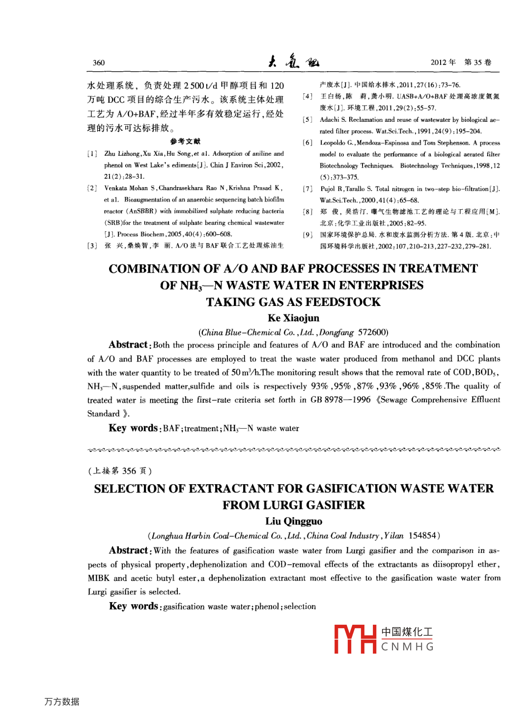 2012年10月Oct2012第35卷第5期Large Scale Nitrogenous Fertilizer IndustryVol 35 Ne魯奇氣化爐氣化廢水萃取劑的選擇劉青國(guó)(中煤龍化哈爾濱煤化工有限公司,黑龍江依蘭154854)摘要:針對(duì)魯奇氣化爐氣化廢水的特點(diǎn),通過(guò)對(duì)二異丙基醚、甲基異丁基酮和醋酸丁酯等萃取劑的物理性質(zhì)、脫酚效果和COD脫除效果的比較,選擇出一種對(duì)魯奇氣化爐氣化廢水最有效的脫酚萃取劑。關(guān)鍵詞:氣化廢水酚萃取劑選擇1氣化廢水的組成極性物理萃取劑,這幾種脫酚萃取劑的物理性質(zhì)魯奇加壓氣化所產(chǎn)生的廢水是高濃度含酚、如表2所示。含氨廢水,水質(zhì)成分復(fù)雜,主要含有游離氨、固定表2幾種萃取劑的物理性質(zhì)21氨、二氧化碳、單元酚、多元酚、脂肪酸、少量硫化萃取劑二異丙基醚甲基異丁基酮酯酸丁酯氫、焦油、中油等能否對(duì)廢水中酚類(lèi)物質(zhì)的有效密度/(g·cm3)0.88沸點(diǎn)℃68.271156511565脫除,是處理氣化廢水達(dá)標(biāo)排放的關(guān)鍵,而脫酚萃黏度/(×10-3Pa·s)0.330.69取劑的性質(zhì)直接影響著脫酚的效果,所以煤氣化表面張力/(×10N·m3)173423.6424.6廢水達(dá)標(biāo)處理排放的前提條件是必須選擇一種高水中溶解度%0.87效的脫酚萃取劑。由表1可知,二異丙基醚、醋酸丁酯和甲基異丁基酮對(duì)苯酚的萃取分配系數(shù)都比較高,都是萃2萃取劑的初步選定取能力良好的脫酚萃取劑。表2的物性數(shù)據(jù)則表脫酚萃取劑的種類(lèi)很多,如中性含氧萃取劑明,二異丙基醚、醋酸丁酯和甲基異丁基酮可以直醋酸丁酯、二異丙基醚等,在工業(yè)上已有應(yīng)用。根接作為萃取劑使用。因此,經(jīng)過(guò)以上的理論分析據(jù)萃取理論,萃取劑脫酚效果的好壞,通??梢詮某醪竭x定二異丙基醚、醋酸丁酯和甲基異丁基酮,萃取劑對(duì)被萃取物質(zhì)的分配系數(shù)大小上做出大致作為煤氣化廢水萃取脫酚體系的萃取劑。的判斷。分配系數(shù)是指一定溫度下,當(dāng)萃取體系處于平衡狀態(tài)時(shí),萃取物組分(酚類(lèi))在萃取劑中的3脫酚效果的比較濃度和在原料液(廢水)中的濃度之比。一般來(lái)說(shuō)將根據(jù)萃取分配系數(shù)的大小初步選定的二異分配系數(shù)越大,萃取的效果越好2丙基醚、醋酸丁酯和甲基異丁基酮作為萃取劑,對(duì)表Ⅰ是幾種效果較好的萃取劑及其對(duì)苯酚的煤氣化廢水分別進(jìn)行3級(jí)錯(cuò)流萃取脫酚實(shí)驗(yàn)。實(shí)分配系數(shù)。驗(yàn)時(shí)萃取劑按相比R=16比例進(jìn)行,萃取溫度為表1幾種萃取劑對(duì)酚類(lèi)化合物萃取分配系數(shù)3625℃。幾種萃取劑對(duì)煤氣化廢水的萃取效果比較酚類(lèi)物質(zhì)二異丙基醚甲基異丁基酮醋酸丁酯見(jiàn)圖1。由圖1可知,除了二異丙基醚的萃取脫酚效鄰苯二酚13.2間苯二酚收稿日期:2012-03-12;收到修改稿日期:2012-08-23。對(duì)苯二酚作者簡(jiǎn)介:劉青園中國(guó)煤化工幣,本科學(xué)偏苯三酚01850-煤克化哈爾底煤化工有CNMHG,現(xiàn)在中⊥乙王目岡齔⊥。聯(lián)系電二異丙基醚、醋酸丁酯和甲基異丁基酮同屬話(huà):0451-5720035:mal121g163com。356去五2012年第35卷果比較差以外,另兩種萃取劑對(duì)煤氣化廢水的萃氣化廢水的萃取效果較二異丙基醚好。取脫酚效果相當(dāng),在25℃,相比R=1:6的條件下,經(jīng)3級(jí)錯(cuò)流萃取后,可以把煤氣化廢水的總酚濃4COD脫除效果度從5500mg/L左右,降低到400mgL左右。工業(yè)有機(jī)廢水萃取處理過(guò)程的理想萃取劑,除了滿(mǎn)足一般工業(yè)萃取過(guò)程的萃取劑要求外,還必須具備溶解損失小、可生化性高等條件,以盡量二異丙基醚←甲基異」基酮避免二次污染。對(duì)于物理萃取劑來(lái)說(shuō),酚類(lèi)物質(zhì)是醋酸配極性物質(zhì),因此,極性溶劑比非極性溶劑對(duì)酚類(lèi)物質(zhì)有較大的萃取分配系數(shù)。然而,由于水和酚類(lèi)都是極性物質(zhì),選擇極性大的溶劑,可以提高其對(duì)酚類(lèi)物質(zhì)的萃取分配系數(shù),但萃取溶劑在水中的溶萃取階段解度也隨著增大。從表1和表2可知,幾種物理萃圖1幾種萃取劑對(duì)煤氣化廢水的萃取效果比較取劑中,甲基異丁基酮對(duì)苯酚的萃取分配系數(shù)最分析二異丙基醚對(duì)煤氣化廢水萃取脫酚效果大,它在水中的溶解度也最大。因此,用它做萃取較差的原因發(fā)現(xiàn),這是由于煤氣化廢水的特殊水劑萃取后的煤氣化廢水COD值最高,二異丙基醚質(zhì)造成的。煤氣化廢水中除了單元酚外,不揮發(fā)酚次之,醋酸丁酯最小,見(jiàn)表3含量也相當(dāng)高,幾乎占總酚含量的一半,這些不揮煤氣化廢水萃取脫酚預(yù)處理的目的是盡可能發(fā)酚幾乎都是含二元及二元以上的多元酚。二異回收廢水中的有用組分,以降低廢水COD值,減丙基醚對(duì)單元酚有較好的萃取能力,但對(duì)于多元輕生化處理的負(fù)荷。因此,廢水萃取脫酚后,還必酚并不是一種很好的萃取劑,其分配系數(shù)很低,用須回收溶解在水中的殘留溶劑,以降低COD值,來(lái)作為煤氣化廢水的脫酚萃取劑并不合適。而醋避免二次污染。表3是殘留溶劑回收前后幾種溶酸丁酯和甲基異丁基酮等萃取劑,對(duì)多元酚的萃劑處理廢水后廢水COD值的比較,萃取條件為25取分配系數(shù)比二異丙基醚大得多,因此,它們對(duì)煤℃,相比R=16。表3幾