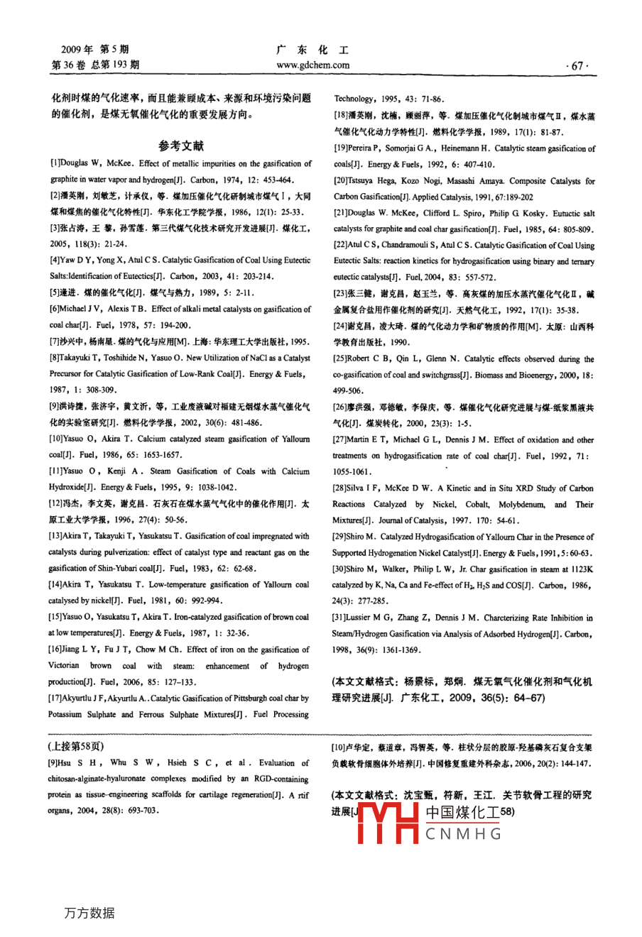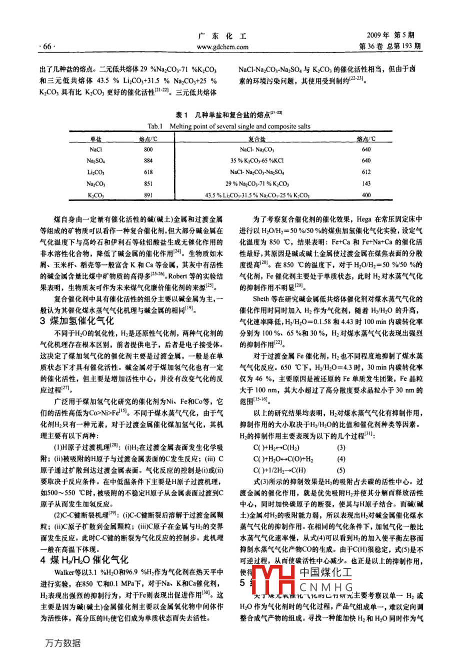 廣東化工2009年第5期64www.gdchem.com第36卷總第193期煤無氧氣化催化劑和氣化機理研究進展楊景標,鄭炯(廣東省特種設備檢測院,廣東廣州510655)摘要]文章綜述了堿金屬、堿土金屬和過渡金屬等催化劑對煤無氧氣化的催化活性以及催化劑的添加方式對催化效果的影響。同時重點分析了不同金屬作為催化劑時煤無氧催化氣化的反應機理[關鍵詞煤媒催化氣化;催化劑;氣化機理中圖分類號]TQ426文獻標識碼]A文章編號】1007-1865(200905006404Review of Catalysts and gasification Mechanisms for Anaerobie catalyzedCoal GasificationYang Jingbiao, Zheng JiongGuangdong Institute of Special Equipment Inspection, Guangzhou 510655, China)Abstract: The effect of alkali, alkaline earth and transition metals on the coal gasification reactivity and the effect of addition mode of catalysts on the catalyticperformance were reviewed. Furthermore, the anaerobic catalyzed coal gasificaiton mechanisms with different catalysts were analyzeKeywords: catalyzed coal gasification; catalysts; gasification mechanism煤的無氧氣化即對煤進行氣化時所用的氣化劑中不采述。用氧氣,一般采用氫氣或水蒸氣作為氣化劑,其主要研究始2煤水蒸氣催化氣化于上世紀70年代,通過提高氣體產物中甲烷的濃度,獲得中煤水蒸氣氣化的催化劑主要有堿金屬、堿土金屬和過渡高熱值的合成氣(煤氣或代用天然氣。生成甲烷的兩個主要金屬等,按照其組合成分又可細分為單一金屬、復合鹽(包反應為括各種礦物質)和低共熔體等催化劑C+2H2=CH42.1堿金屬催化煤水蒸氣氣化2H20-+2C=CH4+CO其催化活性的研究最為廣泛。潘英剛等人研究表明,在為了提高甲烷的濃度,主要是受動力學而非熱力學的限850℃和11~2MPa下,Na2CO3是煤水蒸氣氣化生產中熱制,低溫高壓下有利于甲烷的生成。在800℃和0.01MPa下,值城市煤氣的有效催化劑2。常見幾種單組分堿金屬鹽的催H2、CO2、H2O、O2分別作為氣化劑時的相對氣化速率之比化活性順序為Li2CO3>K2CO3>NaCO3。已有多種堿金屬碳為3×103:1:3:1041。要達到工業(yè)應用所要求的反應速酸鹽催化煤水蒸氣氣化機理被提出,被普遍接受的氧轉移機率,一個很重要的解決辦法是添加催化劑2,由于氣化過程理即氧化-還原過程為2不存在氧氣,煤無氧氣化多采用高溫、高壓氣化反應器來獲M2CO3+2C→2M+3C0得較快的反應速率和較高的碳轉化率。正處于實驗室研究階2M+2H2O→2MOH+H2段的煤催化氣化工藝能使氣化溫度降低200~300℃、并保2MOH+CO→M2CO3+H2持較快的氣化速度和較高的碳轉化率,可望有效解決煤氣化C+H2O=CO+H3過程存在的反應溫度高、能耗大、對設備要求苛刻等不利因文章中M代表某種金屬。但以上的機理未能解釋產物氣中含有相當數量的CO2,潘英剛等人對以上機理進行補充后關于石墨、活性碳和模型焦等碳原料的催化氣化有大量提出了更合理地解釋的機理的研究報道。由于煤的組成復雜,且其自身還含有礦物質M2CO3+2C→2M+3C0對于煤的無氧氣化,無論是催化劑的催化活性,還是催化氣化機理,其相關研究遠沒有碳的催化氣化深入,技術上還未中國煤化工達到商業(yè)化應用的要求。文章主要對以H2O和H2作為氣化劑CNMHG的煤無氧催化氣化中催化劑的活性和催化氣化機理進行綜C+2H20=C02+2H2收稿日期]200903-04[作者簡介楊景標(1978),男,廣東電白人,博士,主要研究方向為潔凈煤聯合循環(huán)發(fā)電及多聯產及燃煤電站鍋爐節(jié)能減排2009年第5期廣東化工第36卷總第193期www.gdchem.com以上的機理表明,堿金屬催化活性的高低主要取決于活過渡金屬一般在單質狀態(tài)下才具有催化活性,所以過渡性中間體MOH生成的難易。KOH和KCO2具有一樣的金屬被還原的易難決定了其催化活性的高低。當金屬對氧的催化活性得到證實。催化過程涉及很多中間過程,活性中親和力越強,氧的傳遞速率就越快,從而該金屬的催化活性間體以瞬間狀態(tài)存在,是動力學平衡形成的循環(huán)。K2CO3越高,幾種常見過渡金屬對氧的親和力的順序為Fe>Co>Ni的熔點較低,在氣化過程中與煤形成液一固界面,很容易從然而,在650℃下,使Fe、Ni還原的H2H2O比分別為3煤的外表面進入煤顆粒的內表面,或從一個煤顆粒傳遞到和0.005,所以N的催化活性比Fe的高山。過渡金屬催化外一個顆粒,所以催化劑的添加方式對催化效果影響不大煤水蒸氣氣化機理為氧轉移機理:20世紀70年代所研發(fā)的 Exxon催化氣化工藝實現了以3M+H2O→M(O+2M(H)K2CO3作為催化劑的煤水蒸氣氣化生產替代天然氣過程,由M()+C→M+CO)于K2CO3催化劑成本高、揮發(fā)流失嚴重以及回收利用困難C(O}→Co等問題而最終沒有工業(yè)化應用。式中()代表活性中心。當溫度低于800℃時,水在過渡堿金屬的鹵化物和硫酸鹽很穩(wěn)定,幾乎沒有催化活性,金屬表面很快分解,生產M(O)表面絡合物,這時吸附氧向但通過離子交換法把陰離子除去可以發(fā)揮堿金屬的催化作碳表面的過渡決定了整個氣化速率。 Tomita等利用用。 Takarada等人利用NaCl作為催化劑的前驅體,在 NaCl Ni(NH,)CO3作為催化劑,在流化床中首次實現了500℃下浸漬溶液中添加氨水以改變溶液的pH,C陰離子最終以褐煤的水蒸氣氣化,30min內碳轉化率達80%,這是目前NHC的形式經過過濾洗滌后從煤中分離出來,從而實現了褐煤水蒸氣催化氣化中能達到的最好效果4。據報道嗎,Na對褐煤水蒸氣氣化的催化作用;但離子交換法一般只適在煤水蒸氣氣化過程中,Fe金屬催化劑的催化活性組分主用于羧基和羥基含量高的低階