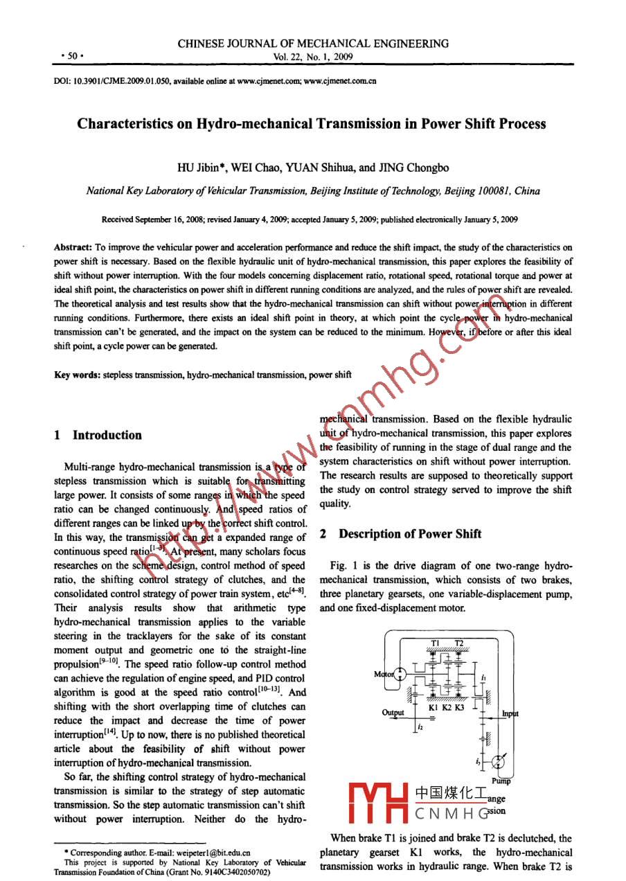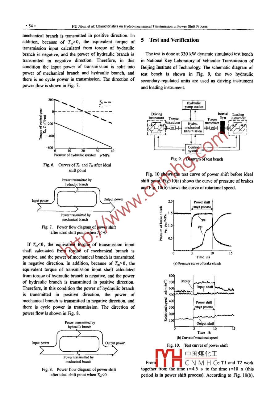 CHINESE JOURNAL OF MECHANICAL ENGINEERING●50●Vol. 22, No. 1, 2009DOI: 10.3901/CME.2009.01.050, available online at ww.jmenet.com www.cjmcnet.com.cnCharacteristics on Hydro-mechanical Transmission in Power Shift ProcessHU Jjibin*, WEI Chao, YUAN Shihua, and JING ChongboNational Key Laboratory of Vehicular Transmission, Beijing Institute of Technology, Bejing 100081, ChinaReceived September 16, 2008; revised January 4, 2009; accepted January 5, 2009; published lectronically January 5, 2009Abstract: To improve the vehicular power and acceleration performance and reduce the shift impact, the study of the characteristics onpower shift is necessary. Based on the flexible hydraulic unit of hydro-mechanical transmission, this paper explores the feasibility ofshift without power interuption. With the four models concerning displacement ratio, rotational speed, rotational torque and power atideal shift point, the characteristics on power shift in dfferent running conditions are analyzed, and the rules of power shift are revealed.The theoretical analysis and test results show that the hydro- mechanical transmission can shift without power interuption in differentnunning conditions. Furthermore, there exists an ideal shift point in theory, at which point the cycle power in hydro- mechanicaltransmission can't be generated, and the impact on the system can be reduced to the minimum. However, if before or afier this idealshift point, a cycle power can be generated.mechanical transmission. Based on the flexible hydraulicIntroductionunit of hydro-mechanical transmission, this paper exploresthe feasibility of running in the stage of dual range and thesystem characteristics on shift without power interruption.stepless transmission which is suitable for transmittingThe research results are supposed to theoretically supportlarge power. It consists of some ranges in which the speedthe study on control strategy served to improve the shiftratio can be changed continuously. And speed ratios ofquality.different ranges can be linked up by the correct shift control.In this way, the transmission can get a expanded range of2 Description of Power Shiftcontinuous speed ratiol-. At present, many scholars focusresearches on the scheme design, control method of speedFig. 1 is the drive diagram of one two range hydro-ratio, the shifing control strategy of clutches, and the mechanical transmission, which consists of two brakes,consolidated control strategy of power train system, etcl+ . three planetary gearsets, one variable- displacement pump,Their analysis results show thaarithmetic type and one fixed displacement motor.hydro-mechanical transmission applies to the variablesteering in the tracklayers for the sake of its constant.T2moment output and geometric one to the straight-linepropulsion! t0. The speed ratio follow-up control methodcan achieve the regulation of engine speed, and PID controlh[10-13] Aalgorthm is good at the speed ratio control。 Andshiting with the short overlapping time of clutches canKI K2K3Outputreduce the impact and decrease the time of powerinterruption"4. Up to now, there is no published theoretical影article about the feasibility of shift without powerinterruption of hydro-mechanical transmission.So far, the shifting control strategy of bhydro-mechanical. Puimtransmission is similar to the strategy of step automatic中國煤化工ngetransmission. So the step automatic transmission can't shiftwithout power interruption. Neither do the hydro-YHCNMHGsionWhen brake T1 is joined and brake T2 is declutched, theplanetary gearset Kl works, the hydro-mechanicalThis project is supported by National Key LaboratorTasission Foundaion of China (Grant No. 9140C3402050702)Chicular transmission works in hydraulic range. When brake T2 isCHINESE JOURNAL OF MECHANICAL ENGINEERING●51●joined and brake T1 is declutched, the planetary gearset K2 respectively.and K3 work, and the hydro-mechanical transmissionworks in hydro-mechanical range.3.2 Model of rotational speed in power shift processIf the brake T2 is joined firstly and then brake T1 isThe rotational speeds of motor nm and transmissiondeclutched in the shift process from hydraulic range to output shaft m are got according to the rotational speedhydro-mechanical range, there is a short stage in which the relation as follows:two brakes work together. Because the brake TI is joined inthis stage, the power is transmitted by planetary gearset KI."_=nmy=(1+k)(1+k)n。(2)And when brake T2 is joined, the planetary gearset K2(1+kj)(1+k +左)片'begins to transmit power. When brake T1 is declutched,planetary gearset KI doesn't transmit power any longer,1+khowever, the whole power is transmitted by planetary"q° (+k)1+h+k)后”。(3)gearset K2. In this process, the power is transmittedwithout any interruption. This kind of shift method is calledpower shift. The flexible hydraulic unit of hydro-Where nu and 1:1 are the rotational speeds of sun gear andmechanical transmission is applied to resolve mechanicalplanet carrier of K1, ne is the rotational speed ofconstrain in the process of power shift. Thus excessivetransmission input shaft, in is the speed ratio from planetendogenetic force can be avoided, mechanical componentscan be protected and at last the shift without powercarrier of K1 to the transmission output shaft.interruption can be realized in hydro-mechanicalSo the speed ratio of hydro-mechanical transmission istransmission. The component running situation in differentmodes is shown in Table.,= (1+h+k)X1+4)位(4)1+k2Table. Running table of hydro .mechanical transmissionRunning stateK2_ K3These analyses show that the speed ratio of hydro-Hydraulic range (H)mechanical transmission is constant in power shift processHydro-mechanical range (HM)even if displacement ratio of pump is changed. No matterPower shift processwhat the rotational speeds of transmission output shaft andmotor are in hydraulic range, the rotational speeds of3 Model of the Characteristics in