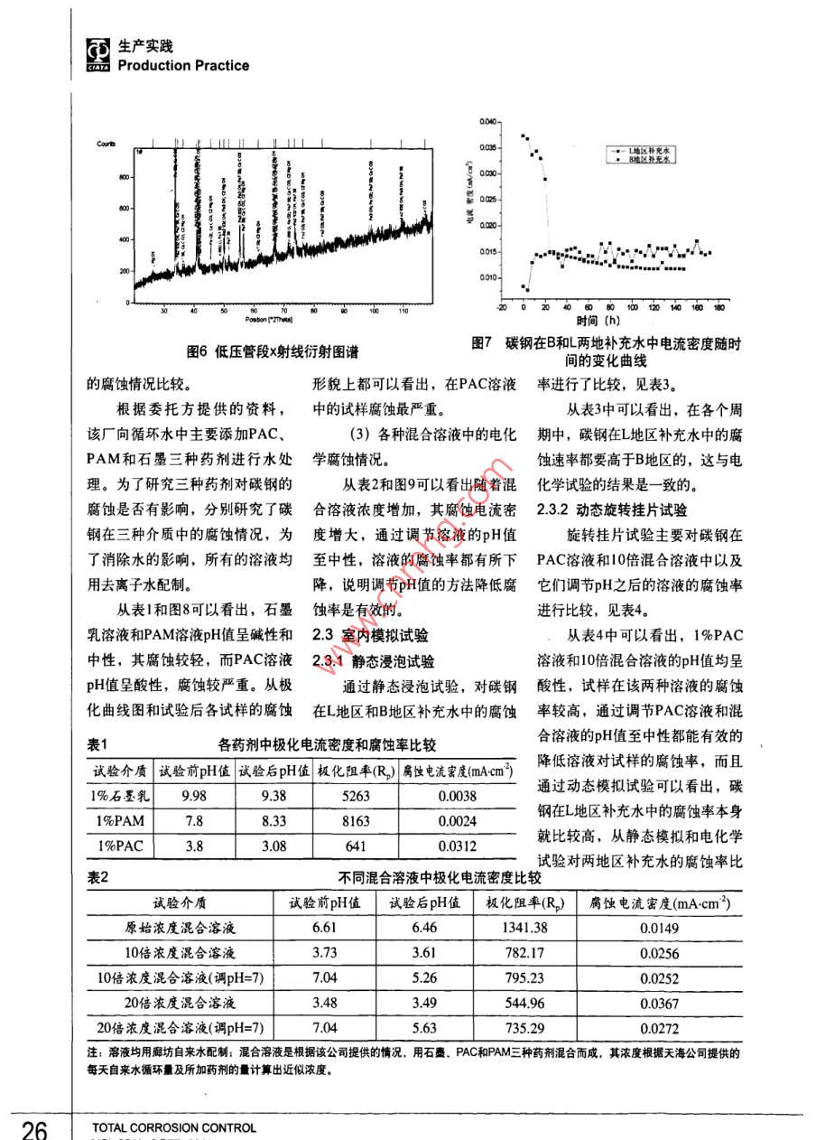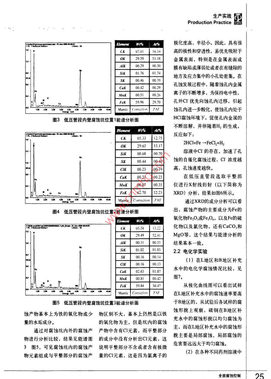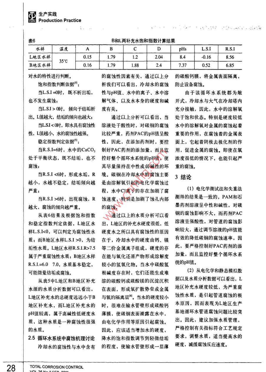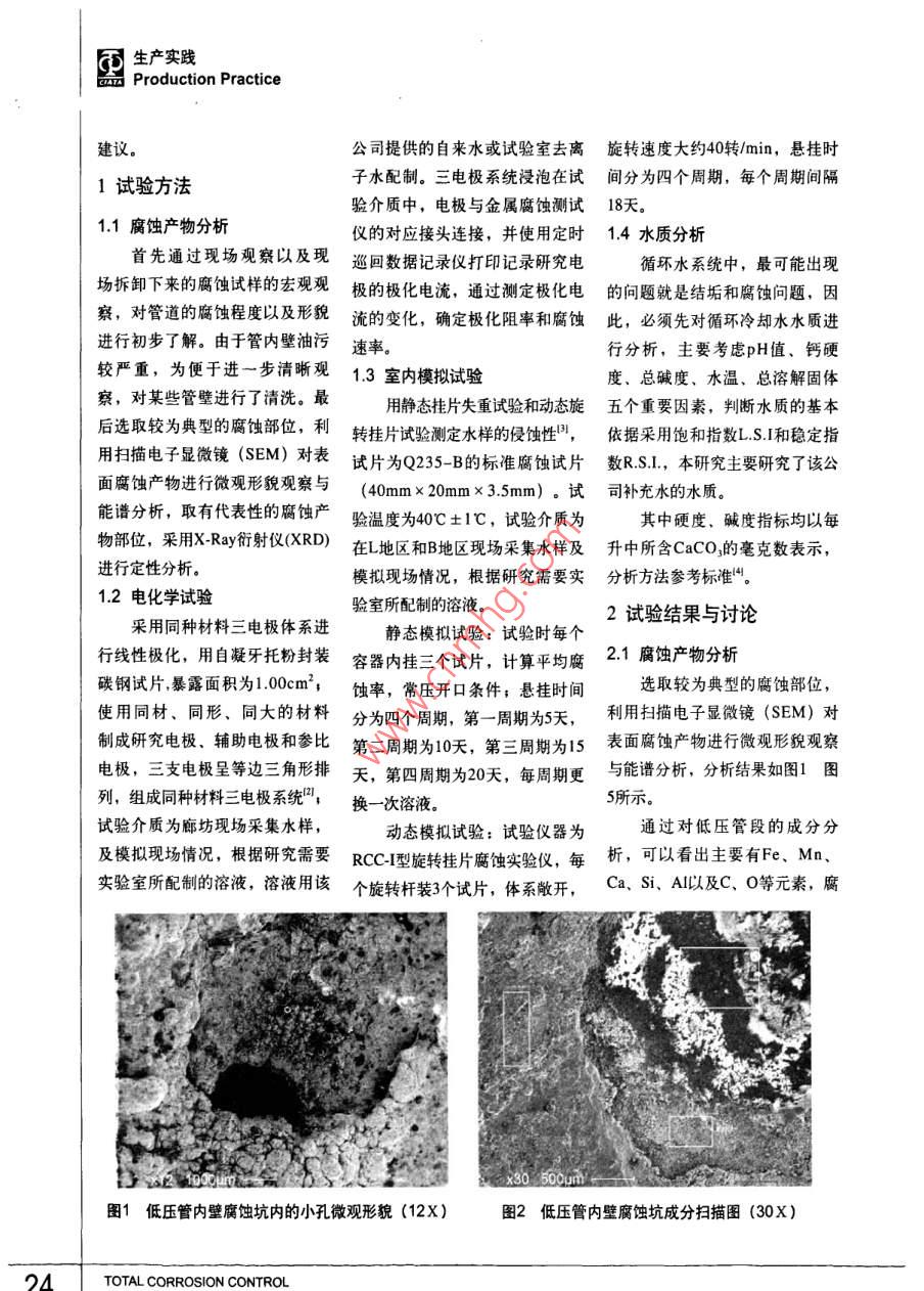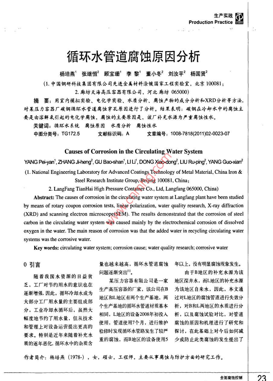 生產實踐Production Practice循環(huán)水管道腐蝕原因分析:楊培燕'張繼恒’顧寶珊’李黎’董小冬2劉汝平?楊國賢(1.中國鋼研科技集團有限公司先進金屬材料涂鍍國家工程實驗室,北京100081;2.廊坊天海高壓容器有限公司,河北廊坊065000)摘要:用室內模擬實驗、電化學實驗、水質分析、腐蝕產物的成分分析和XRD分析等方法,對某壓力容器廠碳鋼循環(huán)水管道腐蝕穿孔原因進行了分析。結果表明:碳鋼在冷卻水中的腐蝕主要是由溶解氧引起的電化學腐蝕,腐蝕的主要原因是,該廠補充水源為嚴重腐蝕性水。關鍵詞:循環(huán)水系統(tǒng)腐蝕原因水質分析 腐蝕性水中圖分類號: TG172.5文獻標識碼: A文章編號: 1008-7818(2011)02-0023-07Causes of Corrosion in the Circulating Water SystemYANG Peiyan', ZHANG J-heng, GU Bao-shan',uu', DONG Xiao dong', LIU Ru-ping, YANG Guo-xian?(1. National Engineering Laboratory for Advanced Coatings Technology of Metal Material, China lron &Steel Research Institute Group, Bejjing 100081, China;2. LangFang TianHai High Pressure Container Co., Ltd, Langfang 065000 China)Abstract: The causes of corrosion in the circulating water system at Langfang plant have been studiedby means of rotary coupon corrosion tests, linear polarization, water quality research, X -ray diffraction(XRD) and scanning electron microscope(SEM). The results demonstrated that the corrosion of steelcarbon in the circulating water system was caused mainly by the electrochemical corrosion of dissolvedoxygen in the water. The main reason of corrosion was that the added water in recycling circulating watersystems was the corrosive water.Key words: circulating water system; corrosion cause; water quality research; corrosive water0引言量也越來越高,循環(huán)水管道腐蝕年以上, 沒有明顯腐蝕現(xiàn)象發(fā)生。問題逐漸突出"。由于B地區(qū)的補充水源為該隨著我國水資源的日益貧某壓力容器有限公司是一家地區(qū)深井水, 而地區(qū)的補充水源乏,工廠對節(jié)約用水的意識也在生產高壓容器的廠家,該公司在B為該地區(qū)自來水, 因此,本文通逐漸增強,因此,循環(huán)冷卻水成為;地區(qū)和L地區(qū)有兩個生產基地,兩過對L地區(qū) 的腐蝕管道進行失效分大部分工廠用水量的主要組成部個生產基地的循環(huán)水管道材質基本析, 對B和L兩地區(qū)的水質進行分分,工業(yè)冷卻水循環(huán)后,雖然大相同,L地區(qū)的設備2008年初投入析, 以及腐蝕試驗對比,對管道幅度地節(jié)約了用水量,但從技術使用,管道使用7個月,進行維護腐蝕的原因和機理進行 了研究和和管理上對設備運營提出更高的檢修時發(fā)現(xiàn)循環(huán)水管路發(fā)生了較嚴探討, 在此基礎上對今后如何減要求。特別是近年來隨著補充水重的腐蝕,而B地區(qū)的設備使用5少或防 止此類腐蝕的發(fā)生提出了質的逐年惡化,循環(huán)水中的雜質含作者簡介:楊培燕(1978-) ,女,碩士,工程師,主要從事腐蝕與防護方面的研究工作。全面腐蝕控制23同生產實踐品Production Practice公司提供的自來水或試驗室去離旋轉 速度大約40轉/min,懸掛時子水配制。三電極系統(tǒng)浸泡在試間分 為四個周期,每個周期間隔1試驗方法驗介質中,電極與金屬腐蝕測試18天。1.1腐蝕產物分析儀的對應接頭連接,并使用定時1.4 水質分析首先通過現(xiàn)場觀察以及現(xiàn)巡回數(shù)據(jù)記錄儀打印記錄研究電循環(huán)水系統(tǒng)中,最可能出現(xiàn)場拆卸下來的腐蝕試樣的宏觀觀極的極化電流,通過測定極化電的問題 就是結垢和腐蝕問題,因.察,對管道的腐蝕程度以及形貌流的變化,確定極化阻率和腐蝕此, 必須先對循環(huán)冷卻水水質進進行初步了解。由于管內壁油污速率。行分析,主要考慮pH值、鈣硬較嚴重,為便于進一步清晰觀1.3室內模擬試驗度、總堿度、水溫、總溶解固體察,對某些管壁進行了清洗。最用靜態(tài)掛片失重試驗和動態(tài)旋五個重 要因素,判斷水質的基本后選取較為典型的腐蝕部位,利轉掛片試驗測定水樣的侵蝕性",依 據(jù)采用飽和指數(shù)L.S.I和穩(wěn)定指用掃描電子顯微鏡(SEM)對表試片為Q235-B的標準腐蝕試片數(shù)R.S.1I, 本研究主要研究了該公面腐蝕產物進行微觀形貌觀察與(40mm x 20mm x3.5mm)。試司補充水的水質。能譜分析,取有代表性的腐蝕產驗溫度為40C+1C,試驗介質為其中硬度、堿度指標均以每物部位,采用X-Ray衍射儀(XRD)在L地區(qū)和B地區(qū)現(xiàn)場采集水樣及升中 所含CaCO,的毫克數(shù)表示,進行定性分析。模擬現(xiàn)場情況,根據(jù)研究需要實分析方法參 考標準"。1.2電化學試驗驗室所配制的溶液。2試驗結果與討論采用同種材料三電極體系進靜態(tài)模擬試驗:試驗時每個行線性極化,用自凝牙托粉封裝容器內掛三個試片,計算平均腐2.1腐蝕產物分析碳鋼試片,暴露面積為1.00cm2,蝕率,常壓開口條件;懸桂時間;選取較為典型的腐蝕部位,使用同材、同形、同大的材料分為四個周期, 第-周期為5天,利用掃描電子顯微鏡(SEM)對制成研究電極、輔助電極和參比第二周期為10天,第三周期為15表面腐蝕產物進行微觀形貌觀察電極,三支電極呈等邊三角形排天,第四周期為20天,每周期更與能譜分析,分析結果如圖1圖列,組成同種材料三電極系統(tǒng)”,換一次溶液。5所示。試驗介質為廊坊現(xiàn)場采集水樣,動態(tài)模擬試驗:試驗儀器為通過對低壓管段的成分分及模擬現(xiàn)場情況,根據(jù)研究需要RCC-I型旋轉掛片腐蝕實驗