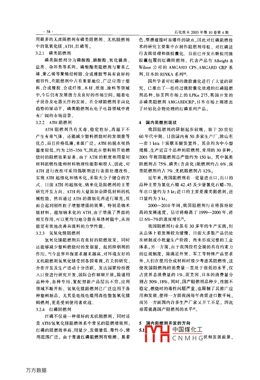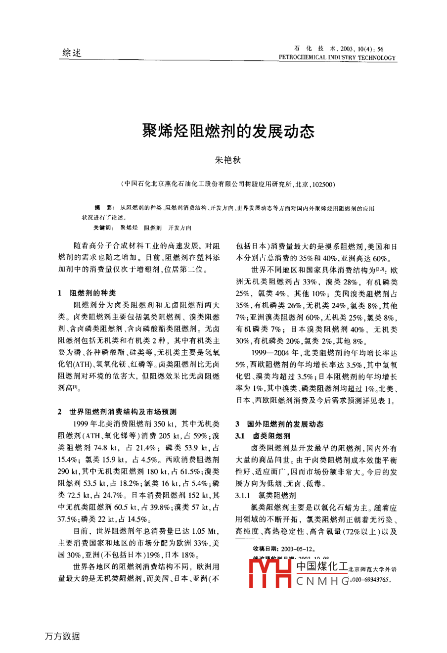 石化技術(shù),2003, 10(4):56綜述PETROCIEMICAL INDLSTRY TECHNOLOGY聚烯烴阻燃劑的發(fā)展動態(tài)朱艷秋(中國石化北京燕化石油化工股份有限公司樹脂應(yīng)用研究所,北京,102500)摘要:.從陽燃前的種類.阻燃前消費結(jié)構(gòu).開發(fā)向世界發(fā)展動態(tài)等力面對國內(nèi)外聚烯烴用阻燃劑的應(yīng)用狀況進(jìn)行了論述。關(guān)鍵詞:聚嬌烴限熱劑開發(fā)力向隨著高分子合成材料T.業(yè)的高速發(fā)展,對阻包括日本)消費量最大的是溴系阻燃劑,美國和日燃劑的需求也隨之增加。目前.阻燃劑在塑料添本分別占總消費的35%和40%,業(yè)洲高達(dá)60%。加劑中的消費量僅次于增塑劑,位居第1位。世界不同地區(qū)和國家具體消費結(jié)構(gòu)為.3:歐洲無機(jī)類阻燃劑占33%,溴類28%,有機(jī)磷類1阻燃劑的種類25%,氣類4%,其他10%;美國溴類阻燃劑占阻燃劑分為鹵類阻燃劑和無鹵阻燃劑兩大35% ,有機(jī)磷類26%,無機(jī)類24%,氯類8% ,其他類。鹵類阻燃劑主要包括氯類阻燃劑、溴類阻燃7%;亞洲溴類阻燃劑60% ,尤機(jī)類25% ,氯類8%,劑、含鹵磷類阻燃劑、含鹵磷酸酯類阻燃劑。無鹵有機(jī)磷類7%;日本溴類阻燃劑40%,無機(jī)類阻燃劑包括無機(jī)類和有機(jī)類2種,其中有機(jī)類主30%,有機(jī)磷類20%,氯類2% ,其他8%。要為磷、各種磷酸酯.硅類等,無機(jī)類主要是氫氧1999- -2004 年,北美阻燃劑的年均增長率達(dá)化鋁(ATH)、氨氧化鎂、紅磷等。鹵類阻燃劑比無鹵5%,西歐陽燃劑的年均增長率達(dá)3.5%,其中氫氧阻燃劑對環(huán)境的危害大,但阻燃效果比無鹵阻燃化鋁、 溴類均超過3.5%; 日本阻燃劑的年均增長劑高凹。率為1%,其中溴類磷類阻燃劑均超過1%。北美、日本、西歐阻燃劑消費及今后需求預(yù)測詳見表1。2世界阻燃劑消費結(jié)構(gòu)及市場預(yù)測1999年北美消費阻燃劑350 kt,其中無機(jī)類3國外阻燃劑的發(fā)展動態(tài)阻燃劑(ATH、氧化銻等)消費205 kt,占59%;澳3.1鹵類阻燃劑類阻燃劑74.8 kt,占21.4%;磷類53.9 kt,占鹵類陽燃劑是開發(fā)最早的阻燃劑,國內(nèi)外有15.4%;氯類15.9kt,占4.5%。西歐消費阻燃劑大量的商品問世。由于鹵類阻燃劑成本效能平衡290 kt,其中無機(jī)類阻燃劑180 kt,占61.5%;溴類性好、適應(yīng)面廣,囚而市場份額非常大。今后的發(fā)阻燃劑53.5 kl,占18.2%;氯類16 kt,占5.4%;磷展方向為低煙、無鹵、低毒。類72.5 kt,占24.7%。日本消費阻燃劑152 kt,其3.1.1氯類阻 燃劑中無機(jī)類阻燃劑60.5 kt,占39.8%;澳類57 kt,占氯類阻燃劑主要是以氯化石蠟為主。隨著應(yīng)37.5%;磷類22 kt,占14.5%。用領(lǐng)域的不斷開拓,氯類阻燃劑正朝著無污染、目前,世界阻燃劑年總消費量已達(dá)1.05 Mt,高純度、高熱穩(wěn)定性、高含氯暈(72%以上)以及.主要消費國家和地區(qū)的市場分配為歐洲33%,美收稿日期: 2003-05-12。國30% ,亞洲(不包括H木)19%,日本18%。世界各地區(qū)的阻燃劑消費結(jié)構(gòu)不同,歐洲用中國煤化工北京師范大學(xué)外語.量最大的是無機(jī)類阻燃劑,而美國、日本、亞洲(不YHC N M H G:010-69343765.朱艷秋,聚烯烴阻燃劑的發(fā)展動態(tài).57.表1北美.日本、西歐阻燃劑消費預(yù)測4kl1999- -2004 年地區(qū)名稱.1996年1999年2004年年均增長率,%北美ATH43.8165.1210.05.0氧化銻20.421.824.5.0其他無機(jī)類14.918.124.0溴類63.074.899.8,9添加型5340.353.1s.s反應(yīng)型27.734.046.7,.5磷鄉(xiāng)45.852.968.9非鹵化物20.929.0鹵代物24.929.939.9氯類15.015.917.21.5合計03.0349.7444.5日本ATHI42.019.018.519.3澳化物57.060.01.0氯化物5.32.11.8-3.0磷酸酸類7.025.5其他2.010.510.8).5146.5.152.1159.4西歐80.0105.0130.0.516.018.00.010.428.940.57n/Ba化合物.22.52.9聚瞬酸銨2.2.42.6紅磷.11.15二策氰胺)94.517.43.5氫氧化鎂4.08.044.553.63.s13.5-3.5有札磷酸酯67.072.531.S鹵化物36.539.0非鹵代物33.036.合i45.0294.0347.0裝置規(guī)模大型化等方向發(fā)展,其代表產(chǎn)品是氯化不起霜,因而被廣泛的應(yīng)用于各種熱塑性塑料及石蠟-70。塑料合金中。氯化石蠟-70作為添加型鹵類阻燃劑,質(zhì)優(yōu)目前,國外溴類阻燃劑的開發(fā)重點是:開發(fā)揮價廉,原料易得,舊途廣泛,與磷類阻燃劑和金屬發(fā)性低、熱穩(wěn)定性好的阻燃增效劑;開發(fā)能與熱塑氯化物阻燃劑等具有良好的協(xié)同作用,市場需求性塑料反應(yīng)形成交聯(lián)結(jié)構(gòu)的阻燃劑,使其發(fā)揮阻較大,具有良好的開發(fā)利用前景,值得大力開發(fā)。燃作用的同時,還能改善塑料的機(jī)械性能;開發(fā)性3.1.2溴類阻燃劑能獨特、毒性低、揮發(fā)性低的高溴含量的阻燃劑。在溴類阻燃劑中,溴化環(huán)氧樹脂作為一種新3.2無鹵阻燃劑型聚合物阻燃劑已開始在國內(nèi)外市場上日益受到無鹵阻燃劑不僅叮以起到稀釋可燃材料濃度重視。由于溴化環(huán)氧樹脂具有優(yōu)良的熔體流動速的作用,更重要的是可以通過自身吸熱、脫水或促率、較高的阻燃效率、優(yōu)異的熱穩(wěn)定性和光穩(wěn)定使材中國煤化工路低燃燒材料性,又能使被阻燃材料具有良好的物理機(jī)械性能、表面!YHCN MH G目的。目前使.58石化技術(shù)2003年第10卷第4期用最多的無鹵阻燃劑有磷類阻燃劑、無機(jī)阻燃劑色、摩擦碰撞時易爆炸的缺點,因此對紅磷阻燃技中的氫氧化鎂、ATH、紅磷等。術(shù)的研究主要集中在制作阻燃劑母粒、對紅磷進(jìn)3.2.1磷 類阻燃劑行表面處理和微膠囊化。目前已開發(fā)出