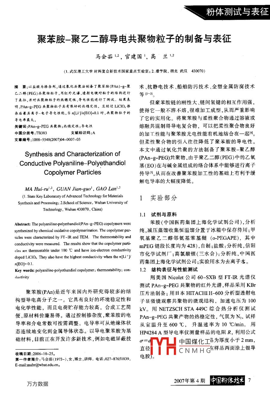 粉體測試與表征聚苯胺-聚乙二醇導(dǎo)電共聚物粒子的制備與表征馬會茹1.2,官建國',高、蘭12(1.武漢理工大學(xué)材料復(fù)合新技術(shù)國家重點(diǎn)交驗(yàn)室;2理學(xué)院,湖北武漢430070)摘要:以鹽峻為摻雜荊,通過氧化共聚法制備 了聚苯胺(PAn)-g-聚術(shù)、抗靜電技術(shù)船舶防污技術(shù)、全塑金屬防腐技術(shù)乙二醇(PEG)共聚物粒子,用紅外光譜、遺射電鏡對粒子的結(jié)構(gòu)進(jìn)行等0~31。了表征,并對共聚物粒子的熱穗定性、導(dǎo)電性能進(jìn)行了測試、結(jié)果表.但案苯胺鏈的剛性大、鏈間氫鍵的相互作用強(qiáng),明,PAn-g- PEG共聚物粒子具有很好的熱穩(wěn)定性。且經(jīng)過LiCIO摻使得它一般不溶不熔,很難加工成型,從而嚴(yán)重影響雜后兼其離子-電子導(dǎo)電性能,當(dāng)rLi}]n[E0)=0.1時,共聚物粒子的.了它的實(shí)用化。將聚苯胺與柔性聚合物通過溶液或?qū)щ娐首畲蟆jP(guān)鍵詞:PAn-g- -PEG共聚物;熱穩(wěn)定性;導(dǎo)電性熔融共混制得導(dǎo)電復(fù)合物,可以把柔性聚合物良好中團(tuán)分類號:TB383文獻(xiàn)標(biāo)識碼:A的加工性能與聚苯胺光電性能有機(jī)地結(jié)合在一起門。文章編號: 108-5548200)04-0007-03但柔性聚合物的引人往往降低了聚舉胺的導(dǎo)電性。本文中通過氧化共聚的方法制備了聚苯胺-聚乙醇Synthesis and Characterization of(PAn-g- -PEG)共聚物,由于聚乙二醇(PEG)中的乙氧Conductive Polyaniline- Polyethandiol基(EO)在與堿金屬組成的絡(luò)合體系中能夠進(jìn)行離子Copolymer Particles傳導(dǎo)圖,從而在改善聚苯胺加工性的基礎(chǔ)上有利于緩解電導(dǎo)率的大幅度降低。MA Hui-rul-2, CUAN Jian-guo' , GAO Lanl.2(1. State Key Laboratory of Advanced Technology for Materials1實(shí)驗(yàn)部分Synthesis and Processing; 2.School of Science , Wuhan University ofTechnology, Wuhan 430070, China)1.1 試劑與原料Abstract: The polyaniline-polyethandiol(PAn-g PEG) copolymers werc苯胺(中國醫(yī)藥集團(tuán)上?;瘜W(xué)試劑公司),分析sythesized by chemical oxdative coplymerztion. The copolymer par-純 ,減壓蒸餾收集恒溫餾分置于冰箱中保存待用;甲ticles were charaterized by FT-IR and TEM. The thermostability and氧基聚乙二醇鄰氨基苯基醚(o-PEGAPE), 其中conductivity were measured. The results show that the copolymer parti-mPEG鏈段長度均為428),自制;鹽酸:分析純,信陽cles are thermnostable under 100 C and have ion-electron conductivity市化學(xué)試劑廠;高氯酸鋰(三水合):分析純,中國醫(yī)doped LiClO。They also have the highest conductivity when the r[Li+]藥集團(tuán)上?;瘜W(xué)試劑公司;實(shí)驗(yàn)用水為去離子水。n[EO]= 0.1.Key words: polyaniline-polyethandiol copolymer; thrmostability; con-1.2 結(jié)構(gòu)表征與性能測試duetivity用美國Nicolet公司60- -SXB型FT-IR光譜儀測試PAn-g- PEG共聚物的紅外光譜,樣品采用KBr聚苯胺(PAn)是近年來國內(nèi)外研究得較多的結(jié)壓片法制備;用日本HITACHIH-600分析型透射電構(gòu)型導(dǎo)電高分子之一。它具有良好的環(huán)境穩(wěn)定性和子顯微鏡觀察共聚物的微觀結(jié)構(gòu),加速電壓為100電化學(xué)性能,而且電荷貯存能力較高,合成工藝簡kV。用NETZSCHSTA449C綜合熱分析儀測試便,原材料價廉易得。通過控制摻雜度聚苯胺的電PAn-g- PEG共聚產(chǎn)物的熱穩(wěn)定性,氣氛為N2,試樣導(dǎo)率和介電常數(shù)可按需調(diào)整。電導(dǎo)率可從絕緣體狀從室溫升至600 C,升溫速率為10 C/min。用態(tài)連續(xù)地變化到金屬導(dǎo)體狀態(tài)。以導(dǎo)電聚苯胺為基HP4284A型導(dǎo)電率儀測量樣品的電阻R,利用公式礎(chǔ)材料,目前正在開發(fā)許多新技術(shù),例如電磁屏蔽技σ=中國煤化工活為厚度小于2mm,直徑Y(jié)HCNMHG連樣品兩面涂上銀導(dǎo)收稿日期:2006-10-25。第一作者簡介:馬會茹(1973-),女,博士,講師。電話:027-87651839,電膠)。E-mail:mahr@wbut.edu.cn。2007年第4期中國粉體技術(shù)7粉體測試與表征24n224 q1.3 共聚物的制備在500mL三口燒瓶中,加人100mL溶有甲氧基聚乙二醇鄰氨基苯基醚的1 molL HCI溶液,將其置于冰水浴中,保持溶液溫度低于5 C,加入100 mL溶有過硫酸銨的1mol/LHCI溶液。將反應(yīng)瓶抽真空充氮,強(qiáng)烈攪拌下20min后,緩慢滴加溶有苯胺的1mol/L HCl溶液。然后在冰水浴中反應(yīng)24h,將反應(yīng)圖2 PAn-g- -PEG共聚物的TEM照片產(chǎn)物用布氏漏斗抽濾,用去離子水多次洗滌,得到鹽Fig.2 TEM image of PAn-g PEG copolymer particles酸摻雜的PAn- g -PEG共聚物。在一定量的PAn-g- -PEG共聚物水溶液中加入2.3熱穩(wěn)定性圖3為PAn-g-PEG共聚物的TG及DSC曲適量的LiCIO,攪拌24h進(jìn)行Lit摻雜后過濾.真空線。由DG曲線可見,在180、285和571 C出現(xiàn)3個干燥24 h,得到LiClO,與鹽酸共摻雜的PAn-g-PEG吸熱峰。對應(yīng)于TG曲線,可以看出共聚物在100 C共聚物(表示為PAn-g- PEG/HCI+ LiClO4)。以前幾乎沒有失重,表現(xiàn)出較好的熱穩(wěn)定性,在100~200 C之間的質(zhì)量損失主要米自于樣品中少量2結(jié)果與討論水分和HCl的散失。200~300 C之間質(zhì)量損失主要來自于樣品中PEG鏈段的斷裂,300C以后由于樣2.1 紅外光譜品中PAn鏈段也開始斷裂,所以樣品失重逐漸加劇。由圖1可以看出,1 591.1 497cm'分別為醌環(huán)和苯環(huán)的C=C伸縮振動峰;800、1 030 cm'處分別100|*0.3540.30為1,2-二取代和1,2,4-三取代苯環(huán)上的一C-H的&面外彎曲振動峰,2 920.2 881 cm'處分別為- -CH2-0{[0.20[0.15或一CH3 中的C- -H伸縮振動峰;1
