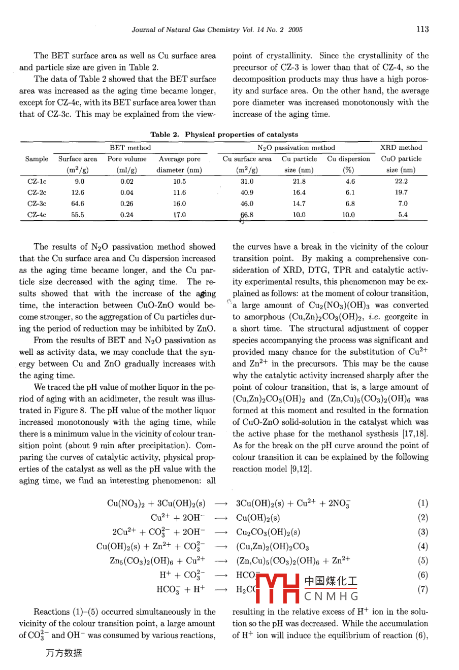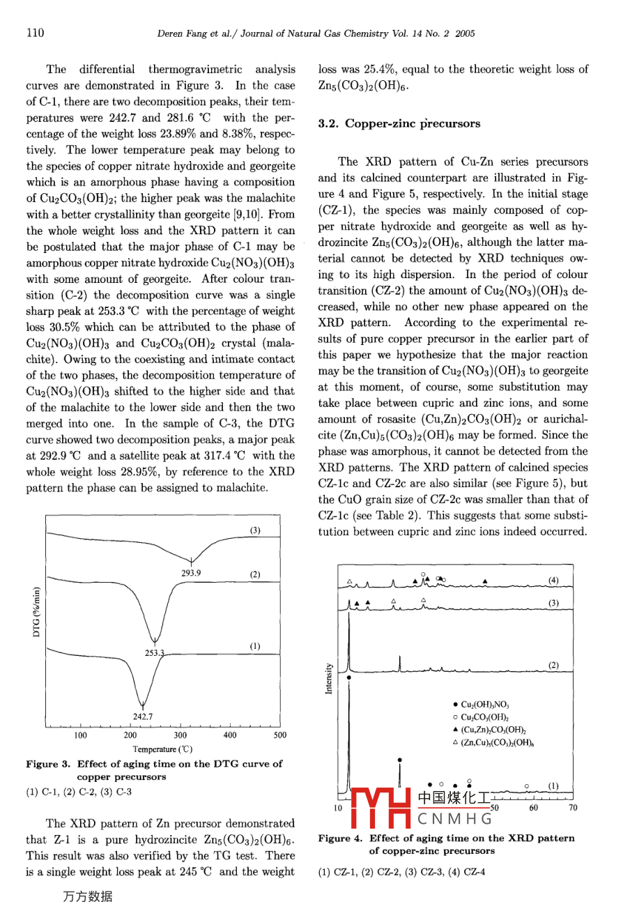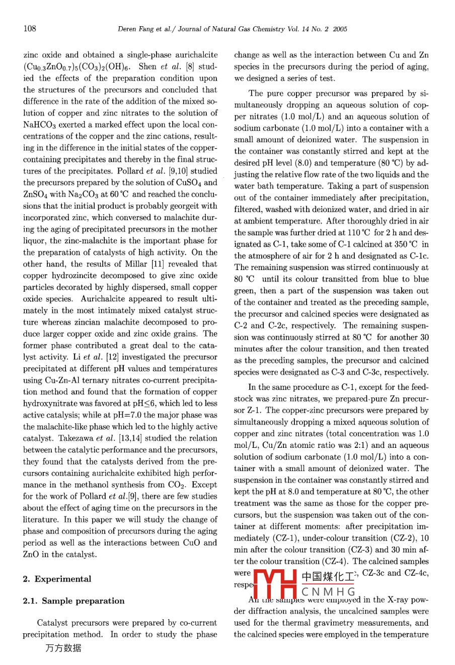 Journal of Natural Gas Chemistry 14(2005)107- 114SCIENCE PRESSInfluence of Aging Time on the Properties of Precursorsof CuO/ZnO Catalysts for Methanol SynthesisDeren Fang-;2,Zhongmin Liul*,Shuanghe Meng',Ligang Wang',Lei Xu',Hua Wang'1. Dalian Institute of Chermical Physics, Chinese Academy of Sciences, Dalian 116023, China;2. Institute of Applied Catalysis, Yantai University, Yantai 264005, China[Manuscript reeived May 08, 2005; revised May 16, 2005]Abstract: The aging process of pure copper precursors and copper. zinc binary precursors were studiedby XRD, TG-DTG and TPR techniques. The catalytic activity and stability of CuO/ZnO were testedusing fixed-bed flow reactor, and the physical properties of the catalysts and Cu species were charac-terized with N2 adsorption and N2O passivation method, respectively. For the Cu-Zn binary systemprepared at the precipitating condition of pH=8.0 and temperature= =80 °C, the initial phase was a mixtureof copper nitrate hydroxide Cu2(NO3)(OH)3, georgeite and bhydrozincite Zns(CO3)2(OH)6. By increas-ing the duration of its aging time, the phase of Cu2(NO3)(OH)2 first transited to georgeite, and theninterdiffused into Zns(CO3)2(OH)6 and resulted in two new phases: rosasite (Cu,Zn)2CO3(OH)2 and au-richalcite (Zn,Cu)s(CO3)2(OH)6. The former phase was much easier to be formed than the latter one,while the latter phase was more responsible for the activity of methanol synthesis than the former one. Itis found that the composition and structure of the precursors altered obviously alfter the colour transitionpoint. The experimental results showed that methanol synthesis is a structure-sensitive catalytic reaction.Key words: Cu/Zn oxide, methanol synthesis, precursor, aging time, colour transition, structure-sensitivereaction1. IntroductionThe phase and composition of the precursor caused asignificant effect on the performance of the catalyst,The copper/zinc/ aluminum oxides catalysts werewhile the preparation method and condition was thewidely used in many industrial process includ-vital factor to the precursors. Many researchers haveing the low-pressure methanol synthesis, CO low-investigated the precursors based on different viewstemperature shift reaction and dehydrogenation ofand so far achieved controversial conclusions [4- 14].alcohols, etc [1], and moreover, it will be the ma-Okamoto et al. [4] have studied the precursorjor catalyst in the fuel cell for the production of hy-and calcined CuO-ZnO catalysts prepared by copre-drogen from oxidative steam reforming of methanolcipitation method using X-ray photoelectron spec-[2,3]. The commercial catalyst was prepared by co-troscopy and X-ray diffraction analysis, they foundprecipitation technique using the nitrate salts of cop-中國煤化工nds in the precursorsper, zinc and aluminum reacting with basic material,forfeedstock. Whilesuch as sodium carbonate to form the precursor ofHimeMYHC N M H Gi the coprecipitatedthis catalyst- mixture of CuZnAl hydroxycarbonates,hydroxycarbonate precursor of the CuO-ZnO cat-then calcining the precursor to give CuZnAl-oxides.alyst based on at. 30% copper and at. 70%* Corresponding author. Tel: +86-411-84685510; Fax: +86-411-84379289. E mail address: zml@dicp.ac.cn.108Deren Fang et al./ Journal of Natural Gas Chemistry Vol. 14 No.2 2005zine oxide and obtained a single-pbase aurichalitechange as well as the interaction between Cu and Zn(Cuo. zn0:.7)(CO3)2(OH)6. Shenet al. [8] stud-species in the precursors during the period of aging,ied the efects of the preparation condition uponwe designed a series of test.the structures of the precursors and concluded thatThe pure copper precursor was prepared by si-difference in the rate of the addition of the mixed 80-multanously dropping an aqueous solution of cop-lution of copper and zinc nitrates to the solution ofper nitrates (1.0 mol/L) and an aqueous solution ofNaHCO3 exerted a marked effect upon the local con-sodium carbonate (1.0 mol/L) into a container with acentrations of the copper and the zinc cations, result-small amount of deionized water. The suspension ining in the difference in the initial states of the copper-the container was constantly stirred and kept at thecontaining precipitates and thereby in the final struc-desired pH level (8.0) and temperature (80°C) by ad-tures of the precipitates. Pollard et al. [9,10] studiedjusting the relative flow rate of the two liquids and thethe precursors prepared by the solution of CuSO4 andwater bath temperature. Taking a part of suspensionZnSO4 with Na2CO3 at 60 °C and reached the conclu-out of the container immediately after precipitation,sions that the initial product is probably georgeit withfiltered, washed with deionized water, and dried in airincorporated zinc, which conversed to malachite dur-at ambient temperature. After thoroughly dried in airing the aging of precipitated precursors in the motherthe sample was further dried at 110C for 2 h and des-liquor, the zinc-malachite is the inportant phase forignated as C-1, take some of C-1 calcined at 350°C inthe preparation of catalysts of high activity. On thethe atmosphere of air for 2 h and designated as C-1c.other hand, the results of Millar [11] revealed thatThe remaining suspension was stirred continuously atcopper hydrozincite decomposed to give zinc oxide80 °C until its colour transitted from blue to blueparticles decorated by highly dispersed, small coppergreen, then a part of the suspension was taken outoxide species. Aurichalcite appeared to result ulti-of the container and treated as the preceding sample,mately in the most intimately mixed catalyst struc-the precursor and calcined specices were designated asture whereas zincian malachite decomposed to pro-C-2 and C-2c, respectively. The remaining suspen-duce larger copper oxide and zinc oxide grains. Thesion was continuously strred at 80°C for another 30former phase contributed a great deal to the cata-minutes after the colour transition, and then treatedlyst 