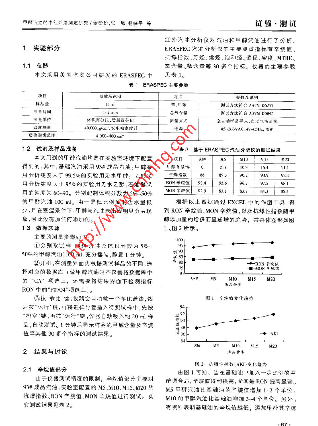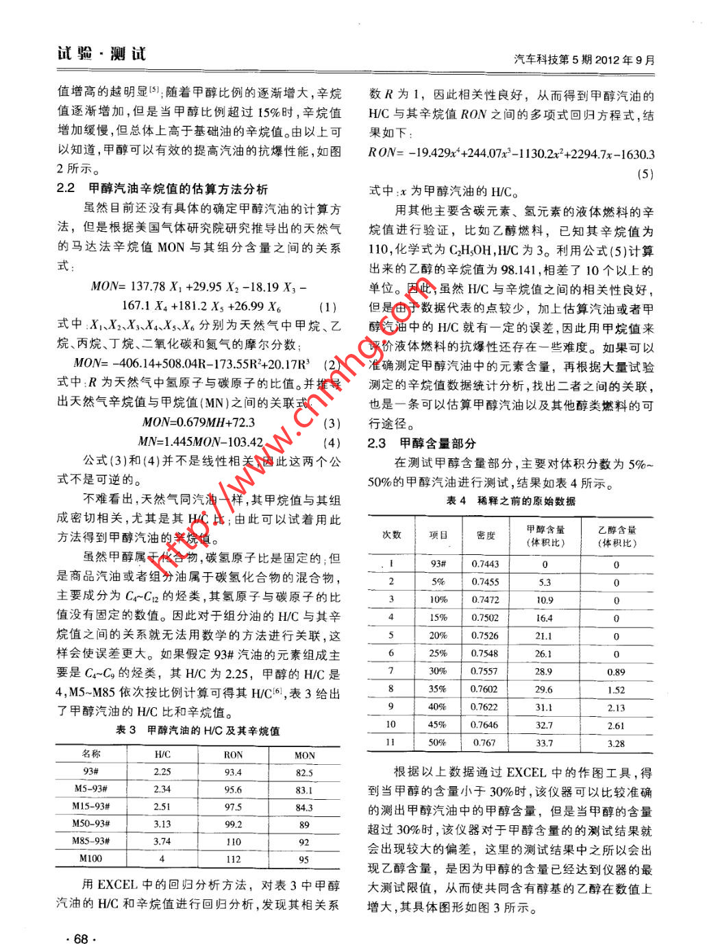 試驗.測試汽車科技第5期2012年9月doi:10.3969/.issn. 1005- -2550.2012.05.015甲醇汽油的中紅外法測定研究金盼盼',張騰', 楊曉平2,孫志春'(1.長安大學(xué)西安710064;2.延川明珠集團 延安717208)摘要:利用美國培安公司生產(chǎn)的ERASPEC中紅外汽油分析儀,對5%-50%的甲醇汽油中的甲醇含量進行了測量,試圖找到一種有效的甲醇含量測量方法;同時,將93#汽油及甲醇含量在5%-20%的甲醇汽油的辛烷值進行了對比分析;實驗結(jié)果表明:當(dāng)甲醇含量超過30%時;使用該儀器所測得甲醇含量與實際的甲醇含量有較大的偏差;若采用稀.釋測量的辦法,使用石油醚或汽油對甲醇汽油稀釋后的測量結(jié)果比使用無水乙醇的稀釋結(jié)果好;另外,隨著甲醇含量的增加,甲醇汽油的辛烷值及抗爆性均呈增大的趨勢,但是當(dāng)甲醇含量超過15%時,將對辛烷值沒有太大的影響。關(guān)鍵詞:中紅外分析儀;甲醇汽油:甲醇含量;辛烷值中圖分類號:TK418.9文獻標(biāo)志碼:A文章編號: 1005- -2550( 2012 )05-0066- 05Mid- infrared Analyzers for the Determination of Methanol FuelsJIN Pan-pan' , ZHANG Teng',YANG Xiao -ping2,SUN Zhi-chun'(1.Chang' an University ,Xian 710064 ,China :2.Yan Chuan Ming Zhu Comupany , Yanan 717208 ,China)Abstract: In order to hes a better understanding of methanol fuel, we use the ERASPEC Fully Automated mid-infraredanalyzer which is produced by the PYNN Corporation of America to measure the methanol fuel that the proportion ofmethanol are 5%~50% ,trying to find an efctive method to measure the content of methanol.As the same time ,comparedand analyzed the 93# gasoline and the methanol fuel that the proportion of methanol are 5% ~20% .The results show that:when the content of methanol more than 30% ,this instrument measured content of methanol has a large deviation from theactual content of methanol;If take the measurement of dilution,the result of use the petroleum ether or the gasoline isbetter than use of absolute alcohol. In addition with the increase of content of methanol ,the octane number and the anti-knock of methanol fuel show an increasing lrend, but when the content of methanol more than 15%, it will not havemuch impact on the octane number.Key words: mid-infrared analyzer ; methanol fuel ; methanol content ; octane number隨著汽車產(chǎn)業(yè)的快速發(fā)展、石油儲量的減少以簡便、快捷的檢測方法。及對環(huán)保要求的提高,甲醇汽油作為一種可替代車現(xiàn)行的甲醇含量的方法"主要有:氣相色譜法問、用燃料得到越來越多的關(guān)注。以煤或天然氣為原料氣相色譜-質(zhì)譜法相結(jié)合法、毛細(xì)管氣相色譜-氫制取的甲醇具有排放低、辛烷值高、抗爆性好、資源火焰離子化檢測器(CGC- -FID)[3)等。目前國內(nèi)頒相對比較豐富等優(yōu)點,以一定比例的甲醇與標(biāo)準(zhǔn)汽布并實施的辛烷值測定方法[4] 有:CB/T5487-油通過助溶劑配置,得到的各種甲醇汽油在汽車中1995<汽油辛烷值測定法(研究法)》,GB/T503-的使用日益成熟,且得到了較為廣泛的應(yīng)用,具有-1995《汽油辛烷值測定法(馬達法)》,GB/定的推廣潛力。T18339- 2001《車 用汽油辛烷值測定法(介電常數(shù)目前,市場上流通的各種型號的甲醇汽油,都是.法))以及氣相色譜法。但是,以上的這些檢測方法通過汽油與一定比例的甲醇通過添加適量的添加劑均存在分析時間長、操作較繁瑣、攜帶不便等缺調(diào)配而成的。其中的甲醇含量配比大小不均,而且已點。與此相對的,本文所采用的美國培安公司研發(fā)經(jīng)頒布實施的M85甲醇汽油國家標(biāo)準(zhǔn)中也只是規(guī)的ERASPEC中紅外汽油分析儀,不僅攜帶方便、范了甲醇體積含量為85%時的甲醇含量檢測方法。操作簡單,而且還能快速準(zhǔn)確的測定甲醇汽油中因此,有必要找到一種應(yīng)對各種比例的甲醇汽油的甲醇含量、辛烷值等30多個指標(biāo),是測定甲醇汽油的一種很好的選擇。收稿日期:2012-04 09,66.甲醇汽油的中紅外法測定研究/金盼盼,張騰,楊曉平等試驗.測試紅外汽油分析儀對汽油和甲醇汽油進行了分析。1實驗部分ERASPEC汽油分析儀的主要測試指標(biāo)有辛烷值、抗爆指數(shù)、芳烴、烯烴、飽和烴、餾程、密度、MTBE、1.1 儀器氧含量、錳含量等30多個指標(biāo)。儀器的主要參數(shù)本文采用美國培安公司研發(fā)的ERASPEC中見表1。表1 ERASPEC 主要參數(shù)項目參數(shù)及說明參數(shù)及說明.樣品量15 ml苯,甲苯測試方法符合ASTM D6277測量時間.1~2 min總氧含量測試方法符合ASTM D5845測量單位體積百分比,質(zhì)量百分比測量方式全自動樣品導(dǎo)入.自動氣液清洗密度測量+0.0001g/cm',安東帕密度計電源85~263VAC ,47~63Hz, 70W吸收譜線范圍4 000~400 cm-'1.2 試劑及樣品準(zhǔn)備表2基于ERASPEC汽油分析儀的測試結(jié)果本文用到的甲醇汽油均是在實驗室環(huán)境下配置93#M5M10M15M20得到的,其中,基礎(chǔ)汽油采用93#成品汽油;甲醇采.甲醇含量/% C5.310.916.41.1用分析純度大于99.5%的實驗用無水甲醇;乙醇采抗爆指數(shù)889.30.290.992.2用分析純度大于95%的實驗用無水乙醇;石油醚采RON辛烷值| 93.495.696.797.598.1用的純度為60~90。分別配制體積分?jǐn)?shù)為5%~50%MON辛烷值82.583.183.784.385.3的甲醇汽油100ml。由于是低比例配制含水量極根據(jù)以上數(shù)據(jù)通過EXCEL中的作圖工具,得少,且在室溫條件下,甲醇與汽油未出現(xiàn)明顯分層現(xiàn).到RON辛烷值、MON辛烷值,以及抗爆性指數(shù)隨甲象,因此沒有加任何添加劑。醇添加量的增多而呈遞增