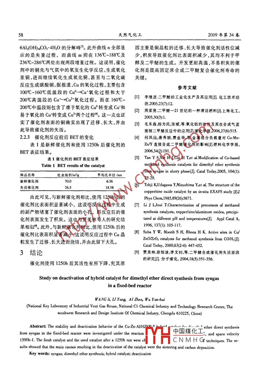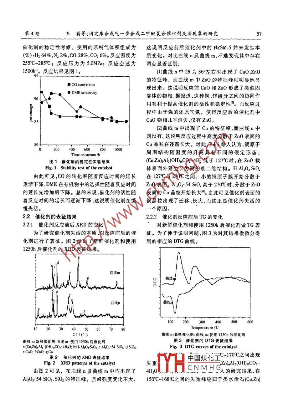 固定床合成氣一步合成二甲醚復(fù)合催化劑失活現(xiàn)象的研究