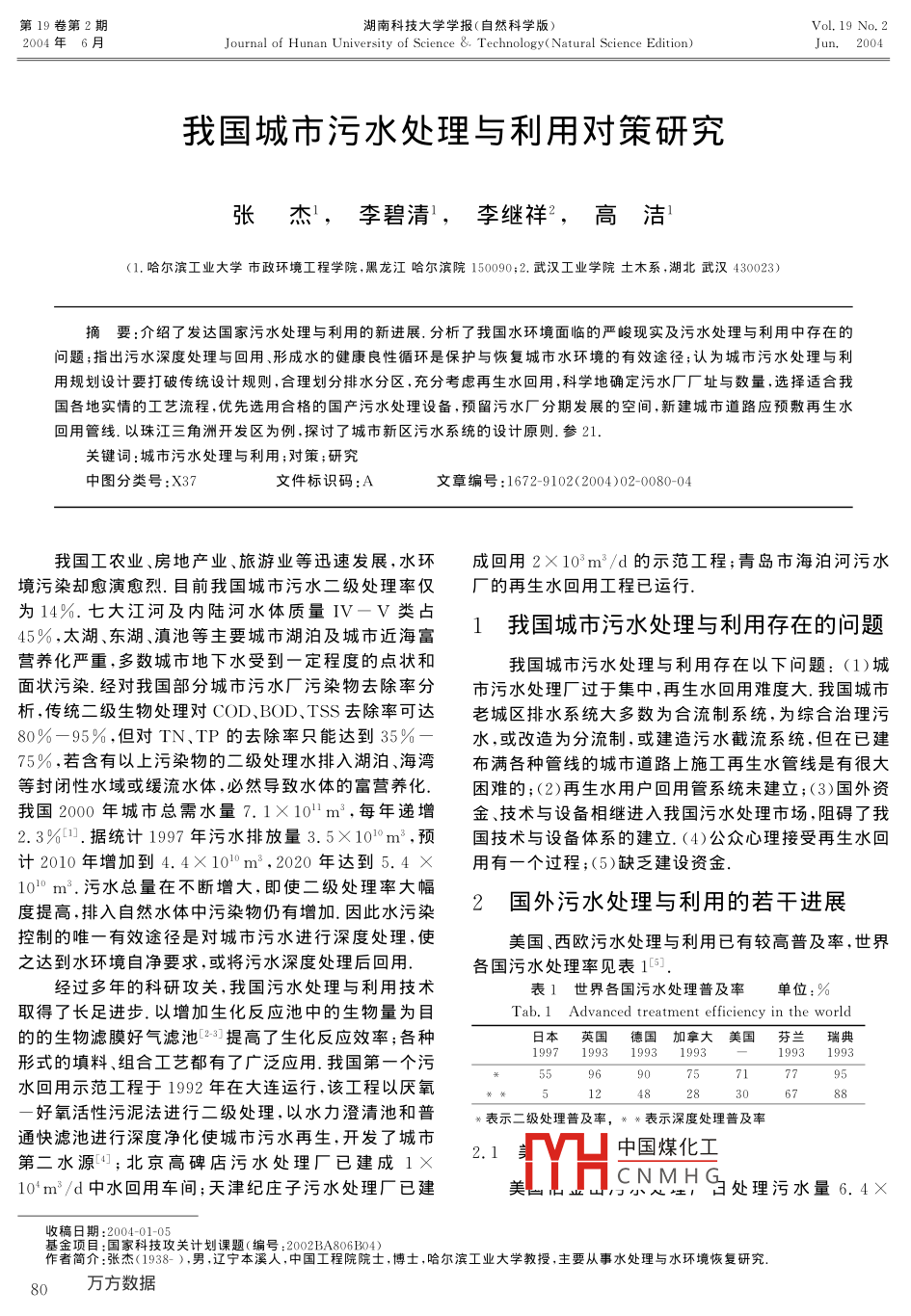 第19卷第2期湖南科技大學(xué)學(xué)報(bào)(自然科學(xué)版)Vol, 19 No. 22004年6月Journal of Hunan University of Science &. Technology( Natural Science Edition)Jun, 2004我國(guó)城市污水處理與利用對(duì)策研究張杰', 李碧清',李繼祥’,高潔'(1.哈爾濱工業(yè)大學(xué)市政環(huán)境工程學(xué)院,黑龍江哈爾濱院150090;2. 武漢工業(yè)學(xué)院土木系,湖北武漢430023)摘要:介紹了發(fā)達(dá)國(guó)家污水處理與利用的新進(jìn)展.分析了我國(guó)水環(huán)境面臨的嚴(yán)峻現(xiàn)實(shí)及污水處理與利用中存在的問(wèn)題;指出污水深度處理與回用、形成水的健康良性循環(huán)是保護(hù)與恢復(fù)城市水環(huán)境的有效途徑;認(rèn)為城市污水處理與利用規(guī)劃設(shè)計(jì)要打破傳統(tǒng)設(shè)計(jì)規(guī)則,合理劃分排水分區(qū),充分考慮再生水回用,科學(xué)地確定污水廠廠址與數(shù)量,選擇適合我國(guó)各地實(shí)情的工藝流程,優(yōu)先選用合格的國(guó)產(chǎn)污水處理設(shè)備,預(yù)留污水廠分期發(fā)展的空間,新建城市道路應(yīng)預(yù)敷再生水回用管線.以珠江三角洲開(kāi)發(fā)區(qū)為例.探討了城市新區(qū)污水系統(tǒng)的設(shè)計(jì)原則.參21.關(guān)鍵詞:城市污水處理.與利用;對(duì)策;研究中圖分類號(hào):X37文件標(biāo)識(shí)碼:A.文章編號(hào):1672 -9102(2004)02-0080-04我國(guó)工農(nóng)業(yè)、房地產(chǎn)業(yè)、旅游業(yè)等迅速發(fā)展,水環(huán)成回用2X 10*m*/d的示范工程;青島市海泊河污水境污染卻愈演愈烈.目前我國(guó)城市污水二級(jí)處理率僅廠的再生水回用工程已運(yùn)行.為14%.七大江河及內(nèi)陸河水體質(zhì)量IV-V類占1我國(guó)城市污水處理與利用存在的問(wèn)題45%,太湖、東湖.滇池等主要城市湖泊及城市近海富營(yíng)養(yǎng)化嚴(yán)重,多數(shù)城市地下水受到-定程度的點(diǎn)狀和我國(guó)城市污水處理與利用存在以下問(wèn)題: (1)城.面狀污染.經(jīng)對(duì)我國(guó)部分城市污水廠污染物去除率分市污水處理廠過(guò)于集中,再生水回用難度大.我國(guó)城市析,傳統(tǒng)二級(jí)生物處理對(duì)COD、BOD、TSS去除率可達(dá)老城區(qū)排水系統(tǒng)大多數(shù)為合流制系統(tǒng),為綜合治理污80% -95%,但對(duì)TN.TP的去除率只能達(dá)到35% -水,或改造為分流制,或建造污水截流系統(tǒng),但在已建75% ,若含有以,上污染物的二級(jí)處理水排入湖泊、海灣布滿各種管線的城市道路上施工再生水管線是有很大等封閉性水域或緩流水體,必然導(dǎo)致水體的富營(yíng)養(yǎng)化.困難的;(2)再生水用戶回用管系統(tǒng)未建立;(3)國(guó)外資我國(guó)2000年城市總需水量7.1X10m3,每年遞增金、技術(shù)與設(shè)備相繼進(jìn)入我國(guó)污水處理市場(chǎng),阻礙了我2.3%1.據(jù)統(tǒng)計(jì)1997年污水排放量3.5X101°m',預(yù)國(guó)技術(shù)與設(shè)備體系的建立.(4)公眾心理接受再生水回計(jì)2010年增加到4. 4X 101m3 ,2020年達(dá)到5.4 X用有一個(gè)過(guò)程;(5)缺乏建設(shè)資金.100m*.污水總量在不斷增大,即使二級(jí)處理率大幅2國(guó)外污水處理與利用的若干進(jìn)展度提高,排入自然水體中污染物仍有增加.因此水污染控制的唯-有效途徑是對(duì)城市污水進(jìn)行深度處理,使美國(guó)、西歐污水處理與利用已有較高普及率,世界之達(dá)到水環(huán)境自凈要求,或?qū)⑽鬯疃忍幚砗蠡赜?各國(guó)污水處理率見(jiàn)表經(jīng)過(guò)多年的科研攻關(guān),我國(guó)污水處理與利用技術(shù)表1世界各國(guó)污水處理普及率單位:%取得了長(zhǎng)足進(jìn)步.以增加生化反應(yīng)池中的生物量為目Tab.1 Advanced treatment efficiency in the world的的生物濾膜好氣濾池[23提高了生化反應(yīng)效率;各種日本英國(guó)德國(guó)加拿大美國(guó)芬蘭瑞典19971993,1993“ 19931993形式的填料、組合工藝都有了廣泛應(yīng)用.我國(guó)第一個(gè)污5:96)0771779水回用示范工程于1992年在大連運(yùn)行,該工程以厭氧48_28878好氧活性污泥法進(jìn)行二級(jí)處理,以水力澄清池和普*表示二級(jí)處理普及率,* *表示深度處理普及率通快濾池進(jìn)行深度凈化使城市污水再生,開(kāi)發(fā)了城市第二水源[4];北京高碑店污水處理廠已建成1 X2.1中國(guó)煤化工10*m'/d中水回用車間;天津紀(jì)莊子污水處理廠已建.MHCNMH G白處理污水量6.4 X美凹山業(yè)山門小心吐I收稿日期:2004-01-05基金項(xiàng)目:國(guó)家科技攻關(guān)計(jì)劃課題(編號(hào):2002BA806B04)作者簡(jiǎn)介:張杰(1938- ).男,遼寧本溪人,中國(guó)工程院院士,博士,哈爾濱工業(yè)大學(xué)教授,主要從事水處理與水環(huán)境恢復(fù)研究.8010°m2 ,服務(wù)130萬(wàn)人口,污水經(jīng)初沉池、兩段活性污廠出水,再生水水質(zhì)均達(dá)到附近工廠用水水質(zhì)標(biāo)準(zhǔn),臭泥法、三層濾料(煤.石榴石、砂)、氯消毒工藝后,出水氧.活性碳對(duì)COD去除效率較高,超濾對(duì)病毒與細(xì)菌指標(biāo)接近飲用水標(biāo)準(zhǔn),總含鹽量為800 mg/L.但舊金的去除率較高.Simonel14]等利用生物反應(yīng)器.超濾膜山灣濕地潮汐水含鹽濃度為10000~20000mg/L,為處理海洋輪船上的生活污水,去除COD95%,保護(hù)濕地上的海生動(dòng)物,美國(guó)國(guó)家環(huán)保局與舊金山水BOD98% ,出水COD20~ 40 mg/L, BOD5~10 mg/L.質(zhì)控制中心