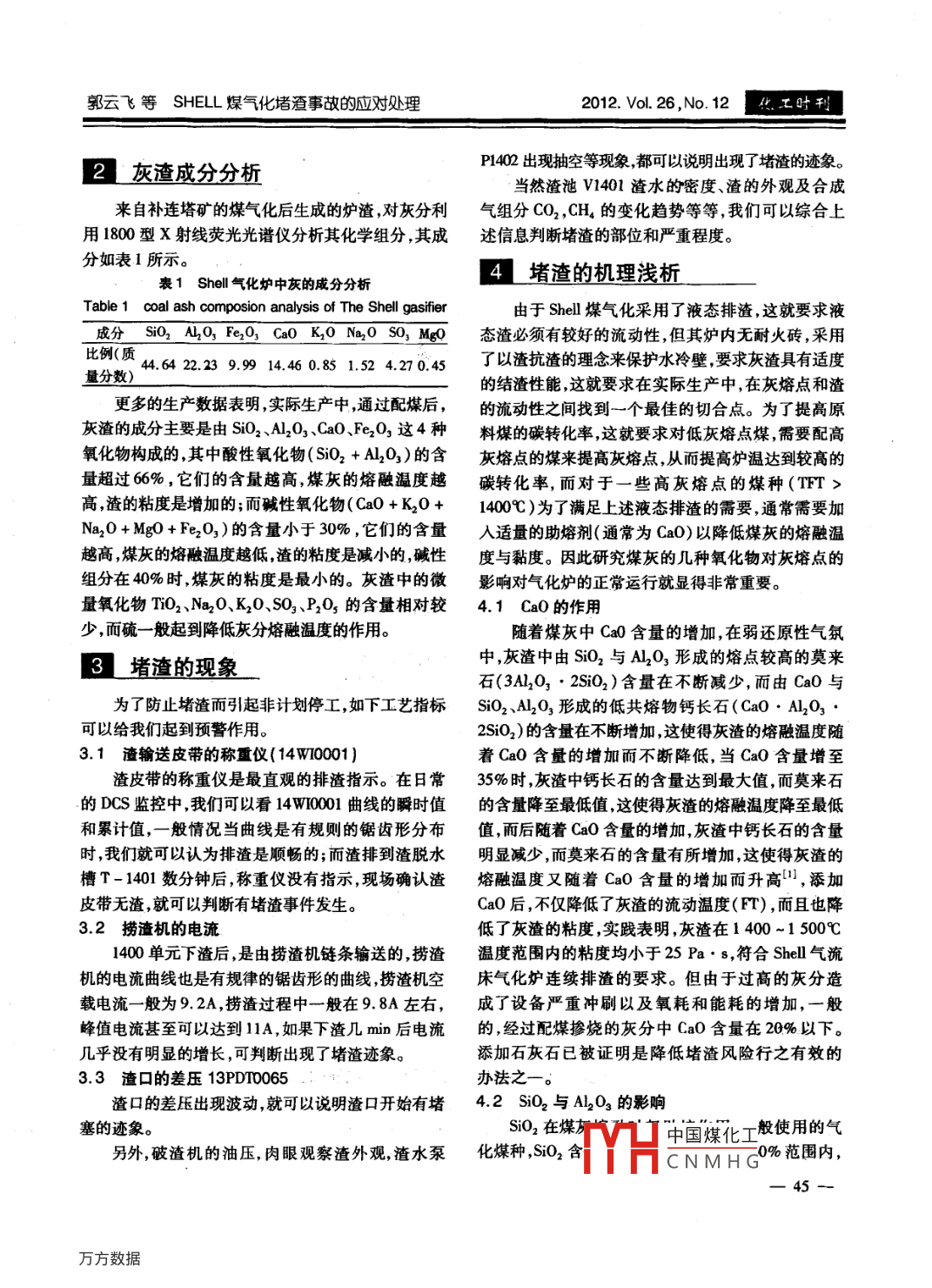 第26卷第12期化工時(shí)刊Vol. 26 ,No. 122012 年12月Chemical Industry TimesDec.12.2012doi:10. 3969/j. issn. 1002 -154X.2012. 12.012SHELL煤氣化堵渣事故的應(yīng)對(duì)處理郭云飛高原(神華鄂爾多斯煤制油分公司,內(nèi)蒙古鄂爾多斯017200)摘要主要簡(jiǎn)述了 shell煤氣化堵渣的現(xiàn)象分析了幾種主要的氧化物對(duì)灰熔點(diǎn)的影響,基于對(duì)煤灰的分析確定操作溫度,適度添加助熔劑改變灰組分,達(dá)到穩(wěn)定運(yùn)行的目的。關(guān)鍵詞堵渣現(xiàn)象 配煤灰熔點(diǎn)Analysis and Treatment for Sluicing Problemsand Slag Blockages in Shell Pulverized Coal Gasification PlantGuo YunfeiGao Yuan( Shenhua Erdos Coalliquefaction Corporation LTD. Neimengu Erdos 017200)Abstract Author has Introduced The phenomenon of Slag blockages in Shell Pulverized Coal Gasification Plant ,The Affction on several main oxides to ash meling point,depending on Coal Ash analysis to determine the proper Casi-fier temperature, Determine fux addition by modifying the ash composition, to achieve the purpose of stable operation.Keywords the phenomenon of slag blockages blended - coal ash melting point氣流床加壓氣化因其煤種適應(yīng)性寬,碳轉(zhuǎn)化率Shell氣化爐排渣流程高、有效氣組分(C0 + H2)含量高而備受人們關(guān)注,已成為煤氣化的首選技術(shù)之一,而Shell氣化爐是其在殼牌煤氣化中,除渣單元-般命名為1400單中的典型爐型。Shell 氣化爐的操作溫度要求高于煤元。煤粉進(jìn)入氣化爐后與氧氣發(fā)生不完全氧化反應(yīng),灰的熔融溫度,采用液態(tài)排渣法。爐子內(nèi)件為膜式水合成氣向上經(jīng)輸氣導(dǎo)管,合成氣冷卻器去下游工序,冷壁,僅在向火面有少量耐火材料涂層,采取以渣抗反應(yīng)形成熔融態(tài)的渣向下通過(guò)氣化爐內(nèi)的渣口流入渣保護(hù)內(nèi)件。為使Shell氣化爐能順利排渣,其灰渣渣池V1401 ,被來(lái)自P1401的50C的灰水激冷為玻璃在氣化爐中的粘度應(yīng)在2 ~25Pa●s之間,通常將粘態(tài)固體顆粒狀細(xì)渣,流人V1402進(jìn)行渣的收集,此時(shí)度為25 Pa●s所對(duì)應(yīng)的溫度稱為氣化爐的最低排渣V-1402與渣鎖斗V- 1403相連通。其中,V - 1402溫度。為適應(yīng)液態(tài)排渣的操作要求,對(duì)于一些熔點(diǎn)較的渣水會(huì)經(jīng)P-1401進(jìn)人水力旋流器S- 1403分離高的煤種通常需要加入適量的助熔劑(通常為CaO)出-部分濃度較高的渣漿水排入水處理單元。收集或者配煤以降低煤灰的熔融溫度。在實(shí)際的運(yùn)行過(guò)20分鐘后,V-1403與V- 1402隔離泄壓。當(dāng)泄到程中,由于灰分的變化,爐溫控制不當(dāng),安慶,洞氮,神常壓后V- 1403內(nèi)的渣排入渣脫水槽T- 1401 ,由撈華煤制油Shell氣化爐先后出現(xiàn)了氣化爐渣口嚴(yán)重堵渣機(jī)送上渣皮帶。而后渣鎖斗V - 1403通過(guò)低壓水渣而被迫停車,造成了較大的經(jīng)濟(jì)損失,促使技術(shù)人進(jìn)行注水,再由高壓氮?dú)鈱?duì)其充壓,當(dāng)V-1402與V員對(duì)爐子形成大渣塊的機(jī)理做出進(jìn)-步的研究和探-1403壓差很小時(shí)開(kāi)始連通收渣,如此反復(fù)形成--討,在實(shí)踐中積累了豐富的經(jīng)驗(yàn),現(xiàn)闡述如下:個(gè)完整的除渣循環(huán)。收稿日期:2012-11-30.中國(guó)煤化工作者簡(jiǎn)介:郭云飛(1982 -),男,本科,工程師,從事煤氣化技術(shù)攻關(guān)和經(jīng)濟(jì)核算工作,E - mail:.YHCNMH G-44-.郭云飛等SHELL 煤氣化堵渣事故的應(yīng)對(duì)處理2012. Vol. 26,No. 12化 工時(shí)刊P1402出現(xiàn)抽空等現(xiàn)象,都可以說(shuō)明出現(xiàn)了堵渣的跡象。2灰渣成分分析當(dāng)然渣池V1401渣水的密度、渣的外觀及合成來(lái)自補(bǔ)連塔礦的煤氣化后生成的爐渣,對(duì)灰分利氣組分CO2 ,CH,的變化趨勢(shì)等等,我們可以綜合上用1800型X射線熒光光譜儀分析其化學(xué)組分,其成述信息判斷堵渣的部位和嚴(yán)重程度。分如表1所示。4堵渣的機(jī)理淺析Shell氣化爐中灰的成分分析Table1 coal ash composion analysis of The Shell gasifier由于Shell煤氣化采用了液態(tài)排渣,這就要求液成分SiO2ALO,Fe20,CaOK,ONa,OSQ,MgO態(tài)渣必須有較好的流動(dòng)性,但其爐內(nèi)無(wú)耐火磚,采用比例(質(zhì)44.64 22.23 9.99 14.46 0.85 1.52 4.27 0.45了以渣抗渣的理念來(lái)保護(hù)水冷壁,要求灰渣具有適度量分?jǐn)?shù))的結(jié)渣性能,這就要求在實(shí)際生產(chǎn)中,在灰熔點(diǎn)和渣更多的生產(chǎn)數(shù)據(jù)表明,實(shí)際生產(chǎn)中,通過(guò)配煤后,的流動(dòng)性之間找到一個(gè)最佳的切合點(diǎn)。為了提高原灰渣的成分主要是由SiO2、Al203、CaO、Fe2O,這4種料煤的碳轉(zhuǎn)化率,這就要求對(duì)低灰熔點(diǎn)煤,需要配高氧化物構(gòu)成的,其中酸性氧化物(SiO2 + A1203)的含灰熔點(diǎn)的煤來(lái)提高灰熔點(diǎn),從而提高爐溫達(dá)到較高的量超過(guò)66% ,它們的含量越高,煤灰的熔融溫度越碳轉(zhuǎn)化率,而對(duì)于一些高灰熔點(diǎn)的煤種(TFT >高,渣的粘度是增加的;而堿性氧化物(CaO + K20 +1400C)為了滿足上述液態(tài)排渣的需要,通常需要加Na2O + MgO + Fe203)的含量小于30% ,它們的含量人適量的助熔劑(通常為CaO)以降低煤灰的熔融溫越高,煤灰的熔融溫度越低,渣的粘度是減小的,堿性度與黏度。因此研究煤灰的幾種氧化物對(duì)灰熔點(diǎn)的組分在40%時(shí),煤灰的粘度是最小的?;以械奈⒂绊憣?duì)氣化爐的正常運(yùn)行就顯