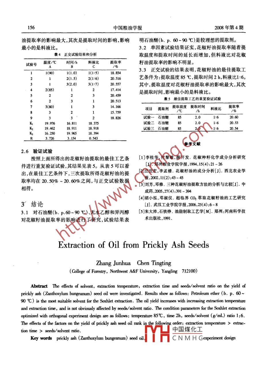 2008年7月中國糧油學(xué)報(bào)Vol. 23. No, 4第23卷第4期Joumal of the Chinese Cereals and Oils associationJul.2008花椒籽油提取工藝研究張軍華陳汀汀(西北農(nóng)林科技大學(xué)林學(xué)院楊凌712100摘要以花椒籽為原料,考察了提取劑、提取溫度、提取時(shí)間和料液比對索氏提取法提取花椒籽油提取率的影響。試驗(yàn)結(jié)果表明,石油醚是最適宜的提取劑,單因素試驗(yàn)還表明,花椒籽油提取率隨著提取溫度和時(shí)間的延長而增加,但料液比對花椒油提取率的影響并不明顯。正交試驗(yàn)的結(jié)果表明,花椒籽油的最佳提取工藝條件為:提取溫度85℃,提取時(shí)間2h,料液比1:6,其中提取溫度對花椒籽油提取率的影響最大,其次是提取時(shí)間,影響最小的是料液比關(guān)鍵詞花椒籽油索氏提取正交試驗(yàn)設(shè)計(jì)花椒( Zanthoxylum bungeanum)為蕓香科多年生表1花椒籽的脂肪蛋白質(zhì)含量落葉灌木或小喬木,高3~7m,在我國已有兩千多年成分水分及揮發(fā)物脂肪蛋白質(zhì)灰分的栽培歷史。我國是花椒第一生產(chǎn)大國,其主要產(chǎn)區(qū)有陜西、四川、山東、山西、河南、河北等?;ń吠夤ひ话阌米髡{(diào)味料,花椒籽作為生產(chǎn)調(diào)味料的副12預(yù)處理產(chǎn)物則常被當(dāng)作肥料或燃料。據(jù)李桂華和莊世宏將花椒籽置于60℃的烘箱中干燥4h,將干燥過等1-2分析,花椒籽含有20%以上的花椒籽油。由的花椒籽置于粉碎機(jī)中粉碎至過40目。于花椒籽油酸值高、蠟質(zhì)多、色澤深導(dǎo)致其精煉成1.3花椒籽油索氏提取本較高,不適宜用來生產(chǎn)可食用的花椒籽油。用分析天平稱取質(zhì)量為M(精確至0.0001g,下隨著人們對研究生物柴油替代石化柴油興趣的同)的花椒籽仔細(xì)轉(zhuǎn)入濾紙筒內(nèi)將濾紙筒置于索與日劇增,尋找來源豐富、成本低廉的動植物油脂成氏提取器抽提筒內(nèi)按所需料液比加入一定量的提為新的研究熱點(diǎn)?;谏鲜霰尘?以花椒籽為原料取劑將冷凝器與抽提筒連接好,打開冷凝器進(jìn)水管制取生物柴油顯示出良好的前景。因此探討花椒的水龍頭,開始在設(shè)定溫度下抽提到達(dá)所需提取時(shí)籽油的高效提取技術(shù)也十分必要。目前已有采用超間后,減壓蒸餾抽提液,烘至恒重(M)?;ń纷延偷呐R界CO2萃取法提取花椒籽油的研究3-4,雖然此提取率按下式進(jìn)行計(jì)算法具有萃取溫度低、時(shí)間短和收率高等優(yōu)點(diǎn),但其生提取率=M2二M產(chǎn)成本較高。采用索氏提取法提取花椒籽油,考察MX100%溶劑種類提取溫度提取時(shí)間及料液比對提取率的式中M一花椒籽的質(zhì)量,g影響,并采用正交試驗(yàn)優(yōu)化提取工藝M1一空瓶質(zhì)量,g;M2空瓶和花椒籽油的質(zhì)量,go1材料與方法1試驗(yàn)材料2結(jié)果與討論花椒籽陜西韓城,其脂肪、蛋白質(zhì)等的含量見2.1提取劑的選擇表1中國煤化工取劑的重要參考指標(biāo)基金項(xiàng)目:西北農(nóng)林科技大學(xué)人才基金項(xiàng)目(0140403)CNMHG來源、污染等因素。見小呼升盱和石油醚(b,p.60~收稿日期:2007-0-05作者簡介:張軍華,男,197年出生,講師博土林產(chǎn)生物化學(xué)加90℃)三種不同提取劑對花椒籽油提取率的影響試驗(yàn)結(jié)果見表2。第23卷第4期張軍華等花椒籽油提取工藝研究1552不同溶劑對油提取率的影響提取試劑價(jià)格/(元/瓶)提取率/%無水乙醇異內(nèi)醇石油醚(b,p6.52.53表2表明,以石油醚(b.p.60~90℃)作為提取圖2提取時(shí)間對花椒籽油得率的影響劑,從花椒籽中提取花椒籽油的提取率最好而以異24料液比對提取率的影響丙醇來提取花椒籽油的效果最不理想,由于石油醚以石油醚為(b.p.60~90℃)提取劑提取溫度(b.p.60-90℃)相對于無水乙醇和異丙醇來說價(jià)為90℃,提取時(shí)間為2h,考察了不同料液比對花椒格也較為合理故采用石油醚(b.p.60~90℃)作為籽油提取率的影響其試驗(yàn)結(jié)果如圖3所示。提取劑來提取花椒籽油。2.2提取溫度對提取率的影響以石油醚為(b.p.60~90℃)提取劑提取時(shí)間為2h,料液比為1:6,考察了不同提取溫度對花椒籽油提取率的影響。其試驗(yàn)結(jié)果如圖1所示。1:51:6l:7l:81:91:10圖3料液比對花椒籽油提取率的影響從圖3可以看出,料液比對花椒籽油提取率的影響不是很明顯。隨著料液比的變化,花椒籽油的提取率變化并不大。在索氏提取法中,提取溫度和提取時(shí)間能影響提取劑和花椒籽接確的時(shí)間,從而提取溫度/℃影響提取率。而此法中料液比的變化并不能影響提圖1提取溫度對花椒籽油得率的影響取劑與花椒籽接確的時(shí)間或溫度,從而無法影響花提取溫度是增大分子擴(kuò)散系數(shù)降低溶劑及油椒籽油的浸出傳質(zhì)系數(shù),最終導(dǎo)致料液比對花椒籽脂粘度的途徑,同時(shí)提高提取溫度也能使花椒籽表油提取率的影響并不明顯。面的滯流層厚度減小,從而加快油脂分子擴(kuò)散的速2.5正交試驗(yàn)率最終提高油脂提取率S。圖1顯示,提取溫度對為了進(jìn)一步考察提取工藝對花椒籽油提取率的花椒籽油提取率的影響較明顯。在試驗(yàn)所設(shè)置的溫影響,本試驗(yàn)采用正交試驗(yàn)對花椒籽油提取的工藝度范圍內(nèi)隨著提取溫度的升高,花椒籽油的提取率進(jìn)行優(yōu)化。由于本試驗(yàn)中提取次數(shù)對提取率的影響增大特別是在70~85℃的范圍內(nèi),隨著溫度