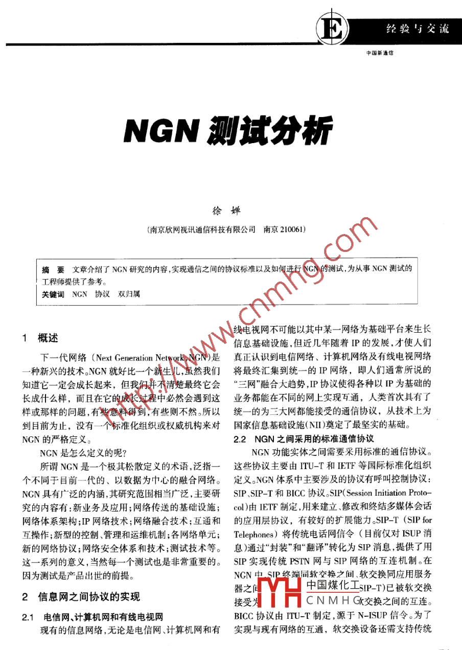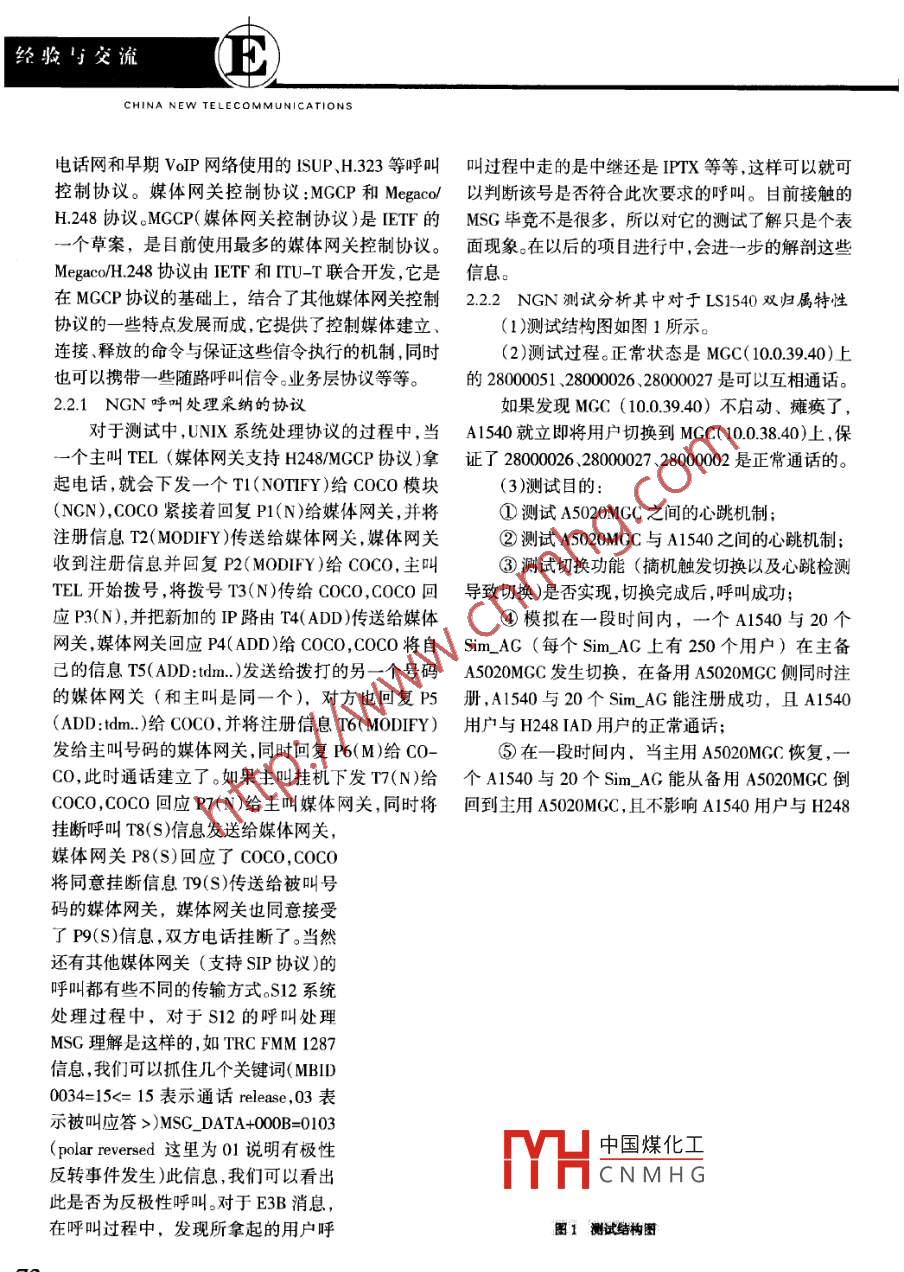 E經(jīng)驗(yàn)交流中國新通信NGN測試分析徐嬋(南京欣網(wǎng)視訊通信科技有限公司南京 210061)摘要文章介紹了NGN研究的內(nèi)容,實(shí)現(xiàn)通信之間的協(xié)議標(biāo)準(zhǔn)以及如何進(jìn)行NGN的測試,為從事NGN測試的工程師提供了參考。關(guān)鍵詞NGN 協(xié)議雙歸屬線電視網(wǎng)不可能以其中某- -網(wǎng)絡(luò)為基礎(chǔ)平臺來生長1概述信息基礎(chǔ)設(shè)施,但近幾年隨著IP的發(fā)展,才使人們下一代網(wǎng)絡(luò)(Next Generation Network ,NGN)是真正認(rèn)識到電信網(wǎng)絡(luò)、計(jì)算機(jī)網(wǎng)絡(luò)及有線電視網(wǎng)絡(luò)-種新興的技術(shù)。NGN就好比一一個新生兒, 雖然我們將最終匯集到統(tǒng) - .的IP網(wǎng)絡(luò),即人們通常所說的知道它一定會成長起來, 但我們并不清楚最終它會“三網(wǎng)”融合 大趨勢,IP協(xié)議使得各種以IP為基礎(chǔ)的長成什么樣,而且在它的成長過程中必然會遇到這業(yè)務(wù)都能在不同的網(wǎng)上實(shí)現(xiàn)互通,人類首次具有了樣或那樣的問題,有些意料得到,有些則不然。所以統(tǒng)- 的為三大網(wǎng)都能接受的通信協(xié)議,從技術(shù)上為到目前為止,沒有一個標(biāo)準(zhǔn)化組織或權(quán)威機(jī)構(gòu)來對國家信息基礎(chǔ)設(shè)施(NII )奠定了最堅(jiān)實(shí)的基礎(chǔ)。NGN的嚴(yán)格定義。2.2 NGN 之間采用的標(biāo)準(zhǔn)通信協(xié)議NCN是怎么定義的呢?NGN功能實(shí)體之間需要采用標(biāo)準(zhǔn)的通信協(xié)議。所謂NGN是--個極其松散定義的術(shù)語,泛指一這些協(xié)議主要由ITU-T和IETF等國際標(biāo)準(zhǔn)化組織個不同于目前一代的、以數(shù)據(jù)為中心的融合網(wǎng)絡(luò)。定義。NGN體系中主要涉及的協(xié)議有呼叫控制協(xié)議: .NGN具有廣泛的內(nèi)涵,其研究范圍相當(dāng)廣泛,主要研SIP、SIP-T和BICC協(xié)議.SIP( Session Initiation Proto-究的內(nèi)容有:新業(yè)務(wù)及應(yīng)用;網(wǎng)絡(luò)傳送的基礎(chǔ)設(shè)施;col)由IETF制定,用來建立、修改和終結(jié)多媒體會話網(wǎng)絡(luò)體系架構(gòu);IP網(wǎng)絡(luò)技術(shù);網(wǎng)絡(luò)融合技術(shù);互通和的應(yīng)用層協(xié)議, 有較好的擴(kuò)展能力。SIP-T (SIP for互操作;新型的控制、管理和運(yùn)維機(jī)制;各網(wǎng)絡(luò)單元;Telephones)將傳統(tǒng)電話網(wǎng)信令(目前僅對ISUP消新的網(wǎng)絡(luò)協(xié)議;網(wǎng)絡(luò)安全體系和技術(shù);測試技術(shù)等。息)通過“封裝”和“翻譯”轉(zhuǎn)化為SIP消息,提供了用這一系列的意義,當(dāng)然每-一個測試也是非常重要的。SIP實(shí)現(xiàn)傳統(tǒng)PSTN網(wǎng)與SIP網(wǎng)絡(luò)的互連機(jī)制。在因?yàn)闇y試是產(chǎn)品出世的前提。NCN中SIP終端同軟交換之間軟交換同應(yīng)用服務(wù)器之間中國煤化工sIP -T)已被軟交換2信息網(wǎng)之間協(xié)議的實(shí)現(xiàn)接受為TYHC N M H G交換之間的互連。2.1 電信網(wǎng)、計(jì)算機(jī)網(wǎng)和有線電視網(wǎng).BICC協(xié)議由ITU-T制定,源于N-ISUP信令。為了現(xiàn)有的信息網(wǎng)絡(luò),無論是電信網(wǎng)、計(jì)算機(jī)網(wǎng)和有實(shí)現(xiàn)與現(xiàn)有網(wǎng)絡(luò)的互通,軟交換設(shè)備還需支持傳統(tǒng)- 71中國新通32805 .經(jīng)驗(yàn)交流ECHINA NEW TELECOMMUNICATIONS電話網(wǎng)和早期VoIP網(wǎng)絡(luò)使用的ISUP、H.323等呼叫叫過程中走 的是中繼還是IPTX等等,這樣可以就可控制協(xié)議。媒體網(wǎng)關(guān)控制協(xié)議:MGCP和Megaco/以判斷該號是否符合此次要求的呼叫。目前接觸的H.248協(xié)議。MGCP(媒體網(wǎng)關(guān)控制協(xié)議)是IETF的MSG畢竟不是很多,所以對它的測試了解只是個表一個草案,是目前使用最多的媒體網(wǎng)關(guān)控制協(xié)議。面現(xiàn)象。在以后的項(xiàng)目進(jìn)行中,會進(jìn)一步的解剖這些Megac/H.248協(xié)議由IETF和ITU-T聯(lián)合開發(fā),它是信息。在MGCP協(xié)議的基礎(chǔ)上,結(jié)合了其他媒體網(wǎng)關(guān)控制2.2.2 NGN 測試分析其中對于LS1540雙歸屬特性協(xié)議的一些特點(diǎn)發(fā)展而成,它提供了控制媒體建立.(1)測試結(jié)構(gòu)圖如圖1所示。連接、釋放的命令與保證這些信令執(zhí)行的機(jī)制,同時(2)測試過程。正常狀態(tài)是MGC( 10.0.39.40)上也可以攜帶-些隨路呼叫信令。業(yè)務(wù)層協(xié)議等等。的28000051、2000026、28000027是可以互相通話。2.2.1 NGN 呼叫處理采納的協(xié)議如果發(fā)現(xiàn)MGC (10.0.39.40) 不啟動、癱瘓了,對于測試中,UNIX系統(tǒng)處理協(xié)議的過程中,當(dāng)A1540 就立即將用戶切換到MCC( 10.0.38.40)上,保一個主叫TEL (媒體網(wǎng)關(guān)支持H248/MGCP協(xié)議)拿證 了28000026 28000027、8000002是正常通話的。起電話,就會下發(fā)一個T1(NOTFY)給CoCO模塊(3)測試目的:(NGN),COCO緊接著回復(fù)P1(N )給媒體網(wǎng)關(guān),并將①測試A5020MCC之間的心跳機(jī)制;注冊信息T2(MODIFY )傳送給媒體網(wǎng)關(guān),媒體網(wǎng)關(guān)②測試A5020MGC與A1540之間的心跳機(jī)制;收到注冊信息并回復(fù)P2(MODIFY )給COCO,主叫③測試切換功能( 摘機(jī)觸發(fā)切換以及心跳檢測TEL開始撥號,將撥號T3(N)傳給C0C0,COCO回導(dǎo)致切換 )是否實(shí)現(xiàn),切換完成后,呼叫成功;應(yīng)P3(N),并把新加的IP路由T4( ADD )傳送給媒體④模擬在