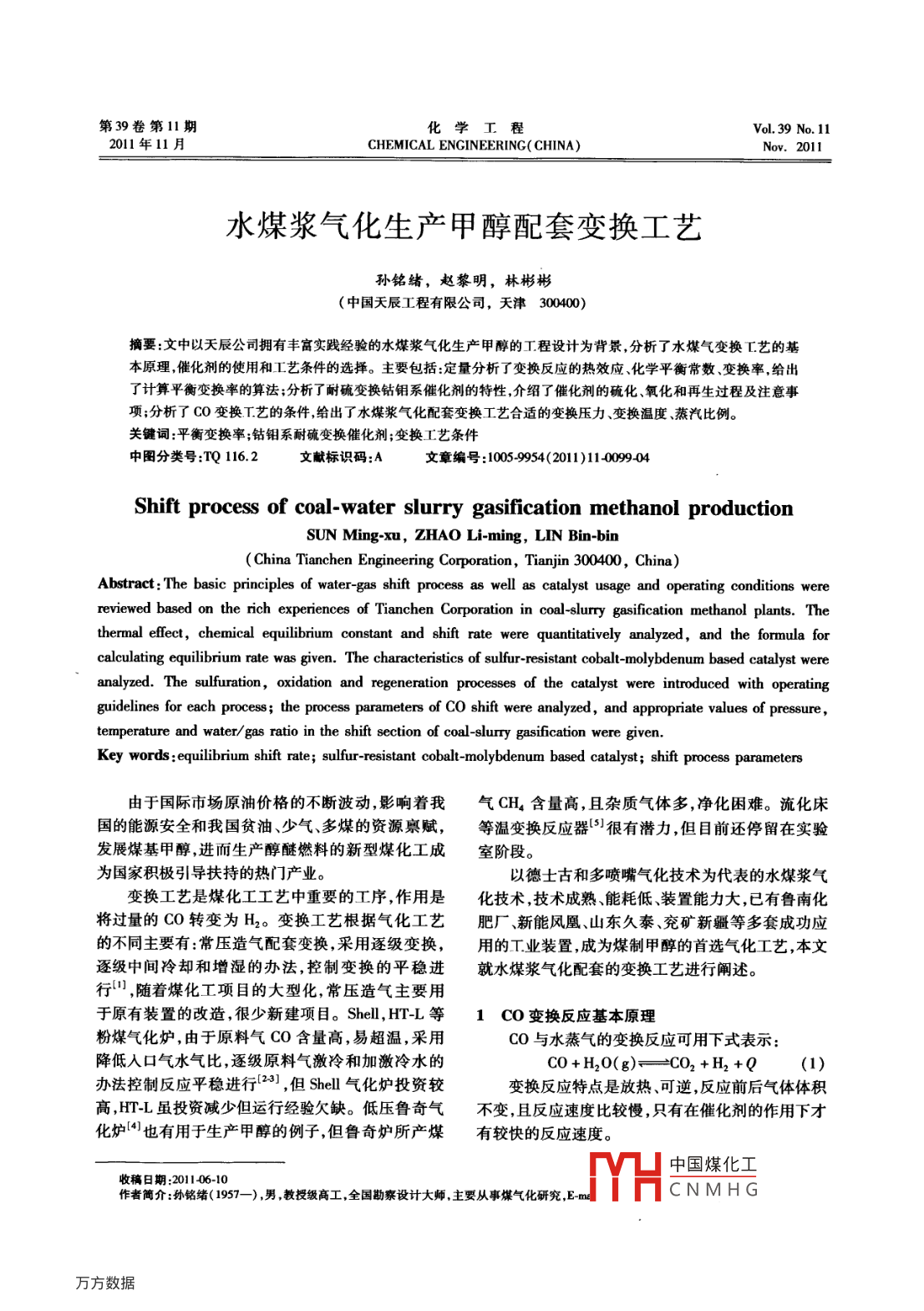 第39卷第11期化學(xué)工程vo.39No.112011年11月CHEMICAL ENGINEERING( CHINA)Nov, 2011水煤漿氣化生產(chǎn)甲醇配套變換工藝孫銘緒,趙黎明,林彬彬(中國天辰工程有限公司,天津300400摘要:文中以天辰公司擁有豐富實(shí)踐經(jīng)驗(yàn)的水煤漿氣化生產(chǎn)甲醇的工程設(shè)計(jì)為背景,分析了水煤氣變換工藝的基本原理,催化劑的使用和工藝條件的選擇。主要包括:定量分析了變換反應(yīng)的熱效應(yīng)、化學(xué)平衡常數(shù)變換率,給出了計(jì)算平衡變換率的算法;分析了耐硫變換鉆鉬系催化劑的特性介紹了催化劑的硫化氧化和再生過程及注意事項(xiàng);分析了CO變換工藝的條件,給出了水煤漿氣化配套變換工藝合適的變換壓力、變換溫度、蒸汽比例。關(guān)鍵詞:平衡變換率;鉆鉬系耐硫變換催化劑;變換工藝條件中圖分類號(hào):TQ116.2文獻(xiàn)標(biāo)識(shí)碼:A文章編號(hào):10059954(2011)11009904Shift process of coal-water slurry gasification methanol productionSUN Ming-xu, ZHAO Li-ming, LIN Bin-binChina Tianchen Engineering Corporation, Tianjin 300400, China)Abstract: The basic principles of water-gas shift process as well as catalyst usage and operating conditions wereeviewed based on the rich experiences of Tianchen Corporation in coal-slurry gasification methanol plants.Thethermal effect, chemical equilibrium constant and shift rate were quantitatively analyzed, and the formula forcalculatinibrium rate was given. The characteristics of sulfur-resistant cobalt-molybdenum based catalyst wereanalyzed. The sulfuration, oxidation and regeneration processes of the catalyst were introduced with operatingguidelines for each process; the process parameters of CO shiftwere analyzeI,and appropriate values of pressuretemperature and water/gas ratio in the shift section of coal-slurry gasification were giverKey words: equilibrium shift rate; sulfur-resistant cobalt-molybdenum based catalyst; shift process parameters由于國際市場原油價(jià)格的不斷波動(dòng)影響著我氣CH4含量高,且雜質(zhì)氣體多,凈化困難。流化床國的能源安全和我國貧油、少氣、多煤的資源稟賦,等溫變換反應(yīng)器很有潛力,但目前還停留在實(shí)驗(yàn)發(fā)展煤基甲醇,進(jìn)而生產(chǎn)醇醚燃料的新型煤化工成室階段。為國家積極引導(dǎo)扶持的熱門產(chǎn)業(yè)。以德士古和多噴嘴氣化技術(shù)為代表的水煤漿氣變換工藝是煤化工工藝中重要的工序,作用是化技術(shù),技術(shù)成熟、能耗低裝置能力大,已有魯南化將過量的CO轉(zhuǎn)變?yōu)镠2。變換工藝根據(jù)氣化工藝肥廠新能風(fēng)凰、山東久泰、兗礦新疆等多套成功應(yīng)的不同主要有:常壓造氣配套變換采用逐級(jí)變換,用的工業(yè)裝置成為煤制甲醇的首選氣化工藝,本文逐級(jí)中間冷卻和增濕的辦法,控制變換的平穩(wěn)進(jìn)就水煤漿氣化配套的變換工藝進(jìn)行闡述。行,隨著煤化工項(xiàng)目的大型化,常壓造氣主要用于原有裝置的改造,很少新建項(xiàng)目。Shel,HL等1Co變換反應(yīng)基本原理粉煤氣化爐,由于原料氣CO含量高,易超溫,采用cO與水蒸氣的變換反應(yīng)可用下式表示降低入口氣水氣比,逐還級(jí)原料氣激冷和加激冷水的CO+H2o(g)CO2+H2+Q辦法控制反應(yīng)平穩(wěn)進(jìn)行23,但Shel化爐投資較變換反應(yīng)特點(diǎn)是放熱、可逆,反應(yīng)前后氣體體積高,HTL雖投資減少但運(yùn)行經(jīng)驗(yàn)欠缺。低壓魯奇氣不變,且反應(yīng)速度比較慢,只有在催化劑的作用下才化爐4也有用于生產(chǎn)甲醇的例子,但魯奇爐所產(chǎn)煤有較快的反應(yīng)速度。中國煤化工收稿日期:201106-10作者簡介:孫銘緒(1957一),男,教授級(jí)高工,全國勘察設(shè)計(jì)大師,主要從事煤氣化研究EYHCNMHG100化學(xué)工程2011年第39卷第11期11變換反應(yīng)的熱效應(yīng)等時(shí),反應(yīng)即達(dá)到平衡狀態(tài),其平衡常數(shù)為變換反應(yīng)是放熱反應(yīng),反應(yīng)熱隨溫度升高有所p(CO2)·pP(H2)y(CO2)·y(H2)減少,其關(guān)系式為Kpp(CO)·p(H2o)y(Co)·y(H2O)(3)Q=44.66-6.02×10-3T式中:p(CO2),p(H2),p(CO),p(H2O)為各組分的67×1072+0.33×10T3(2)平衡分壓,kPa;y(CO2),y(H2),y(CO),y(H2O)為式中:Q為反應(yīng)熱,k/mol;T為溫度,K。各組分的平衡組成(摩爾分?jǐn)?shù))。工藝設(shè)計(jì)中常用溫度下的反應(yīng)熱如表1所示。平衡常數(shù)Kp表示反應(yīng)達(dá)到平衡時(shí),生成物與反應(yīng)物之間的數(shù)量關(guān)系,因此,它是化學(xué)反應(yīng)進(jìn)行完表1變換反應(yīng)的反應(yīng)熱全程度的衡量標(biāo)志。從式(3)可以看出,K,值愈大,Table 1 Reaction heat of water-gas shift reaction即y(CO2)與y(H2)的乘積愈大,說明原料氣中COTK298.1640060080010001200140轉(zhuǎn)化愈完全,達(dá)到平衡時(shí)變換氣中殘余CO量愈少。42.942.241.039.738.537.235.9由于變換反應(yīng)是放熱反應(yīng),降低溫度有利于平mol衡向右移動(dòng),因此平衡常數(shù)隨溫度的降低而增大。平衡常數(shù)與溫度的關(guān)系式很多。通常采用下列簡在T業(yè)生產(chǎn)中,一旦變換爐升溫完畢轉(zhuǎn)入正?;缴a(chǎn)后,即可利用其反應(yīng)熱以維持生產(chǎn)過程的連續(xù)2059進(jìn)行。lg1.5904lgT+1.817×10T1.2變換反應(yīng)的化學(xué)平衡565×10T2+8.24×10-T+1.5143(4)1.2.1平衡常數(shù)工藝設(shè)計(jì)中常用溫度下CO變換反應(yīng)的平衡常在一定條件下,當(dāng)變換反應(yīng)的正逆反應(yīng)速度相數(shù)值如表2所示。表2變換反應(yīng
