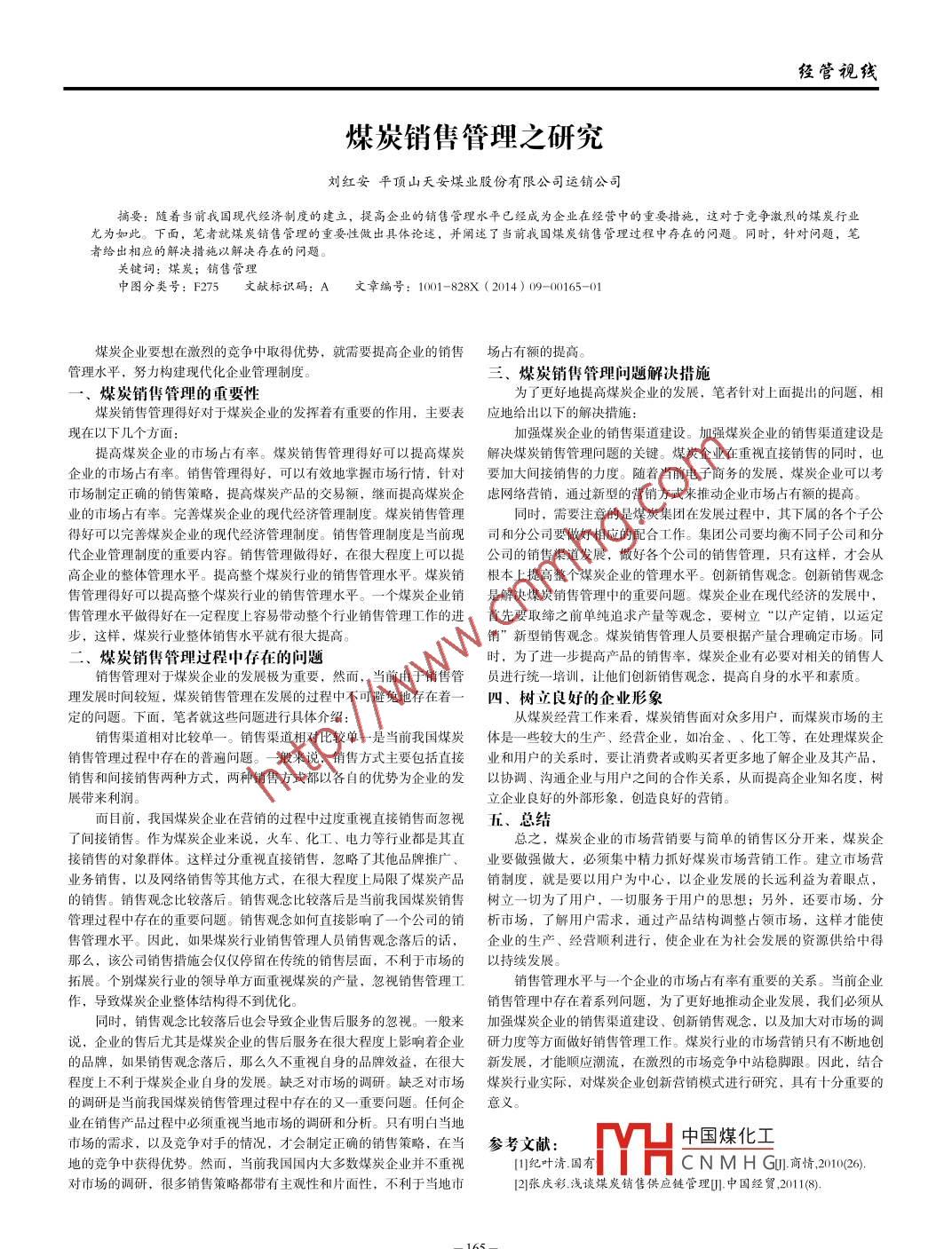 經(jīng)管視線煤炭銷售管理之研究劉紅安平頂山天安煤業(yè)股份有限公司運銷公司摘要:隨著當(dāng)前我國現(xiàn)代經(jīng)濟(jì)制度的建立,提高企業(yè)的銷售管理水平已經(jīng)成為企業(yè)在經(jīng)營中的重要措施,這對于競爭激烈的煤炭行業(yè)尤為如此。下面,筆者就煤炭銷售管理的重要性做出具體論述,并闡述了當(dāng)前我國煤炭銷售管理過程中存在的問題。同時,針對問題,筆者給出相應(yīng)的解決措施以解決存在的問題。關(guān)鍵詞:煤炭;銷售管理中圖分類號: F275文獻(xiàn)標(biāo)識碼: A文章編號: 1001-828X ( 2014) 09-00165-01煤炭企業(yè)要想在激烈的競爭中取得優(yōu)勢,就需要提高企業(yè)的銷售場占有額的提高。管理水平,努力構(gòu)建現(xiàn)代化企業(yè)管理制度。三、煤炭銷售管理問題解決措施煤炭銷售管理的重要性為了更好地提高煤炭企業(yè)的發(fā)展,筆者針對上面提出的問題,相煤炭銷售管理得好對于煤炭企業(yè)的發(fā)揮著有重要的作用,主要表應(yīng) 地給出以下的解決措施:現(xiàn)在以下幾個方面:加強(qiáng)煤炭企業(yè)的銷售渠道建設(shè)。加強(qiáng)煤炭企業(yè)的銷售渠道建設(shè)是提高煤炭企業(yè)的市場占有率。煤炭銷售管理得好可以提高煤炭解決煤炭銷售管理問題的關(guān)鍵。煤炭企業(yè)在重視直接銷售的同時,也企業(yè)的市場占有率。銷售管理得好,可以有效地掌握市場行情,針對要 加大間接銷售的力度。隨著當(dāng)前電子商務(wù)的發(fā)展,煤炭企業(yè)可以考市場制定正確的銷售策略,提高煤炭產(chǎn)品的交易額,繼而提高煤炭企慮網(wǎng)絡(luò)營銷, 通過新型的營銷方式來推動企業(yè)市場占有額的提高。業(yè)的市場占有率。完善煤炭企業(yè)的現(xiàn)代經(jīng)濟(jì)管理制度。煤炭銷售管理同時,需要注意的是煤炭集團(tuán)在發(fā)展過程中,其下屬的各個子公得好可以完善煤炭企業(yè)的現(xiàn)代經(jīng)濟(jì)管理制度。銷售管理制度是當(dāng)前現(xiàn)司 和分公司要做好相應(yīng)的配合工作。集團(tuán)公司要均衡不同子公司和分代企業(yè)管理制度的重要內(nèi)容。銷售管理做得好,在很大程度上可以提公 司的銷售渠道發(fā)展,做好各個公司的銷售管理,只有這樣, 才會從高企業(yè)的整體管理水平。提高整個煤炭行業(yè)的銷售管理水平。煤炭銷根本 上提高整個煤炭企業(yè)的管理水平。創(chuàng)新銷售觀念。創(chuàng)新銷售觀念售管理得好可以提高整個煤炭行業(yè)的銷售管理水平。一個煤炭企業(yè)銷是解決煤 炭銷售管理中的重要問題。煤炭企業(yè)在現(xiàn)代經(jīng)濟(jì)的發(fā)展中,售管理水平做得好在一-定 程度上容易帶動整個行業(yè)銷售管理工作的進(jìn)首 先要取締之前單純追求產(chǎn)量等觀念,要樹立“以產(chǎn)定銷,以運定步,這樣,煤炭行業(yè)整體銷售水平就有很大提高。銷”新型銷售觀念。煤炭銷售管理人員要根據(jù)產(chǎn)量合理確定市場。同煤炭銷售管理過程中存在的問題時,為了進(jìn)一步提高產(chǎn)品的銷售率,煤炭企業(yè)有必要對相關(guān)的銷售人銷售管理對于煤炭企業(yè)的發(fā)展極為重要,然而,當(dāng)前由于銷售管員進(jìn)行統(tǒng)- -培訓(xùn),讓他們]創(chuàng)新銷售觀念,提高自身的水平和素質(zhì)。理發(fā)展時間較短,煤炭銷售管理在發(fā)展的過程中不可避免地存在著一四、 樹立良好的企業(yè)形象定的問題。下面,筆者就這些問題進(jìn)行具體介紹:從煤炭經(jīng)營工作來看,煤炭銷售面對眾多用戶,而煤炭市場的主銷售渠道相對比較單一。銷售渠道相對比較單- - 是當(dāng)前我國煤炭體是- - 些較大的生產(chǎn)、經(jīng)營企業(yè),如冶金、、化工等,在處理煤炭企銷售管理過程中存在的普遍問題。- -般來說,銷售方式主要包括直接業(yè) 和用戶的關(guān)系時,要讓消費者或購買者更多地了解企業(yè)及其產(chǎn)品,銷售和間接銷售兩種方式,兩種銷售方式都以各自的優(yōu)勢為企業(yè)的發(fā)以協(xié)調(diào)、 溝通企業(yè)與用戶之間的合作關(guān)系,從而提高企業(yè)知名度,樹展帶來利潤。立企業(yè)良好的外部形象,創(chuàng)造良好的營銷。而目前,我國煤炭企業(yè)在營銷的過程中過度重視直接銷售而忽視五、 總結(jié)了間接銷售。作為煤炭企業(yè)來說,火車、化工、電力等行業(yè)都是其直總之,煤炭企業(yè)的市場營銷要與簡單的銷售區(qū)分開來,煤炭企接銷售的對象群體。這樣過分重視直接銷售,忽略了其他品牌推廣、業(yè) 要做強(qiáng)做大,必須集中精力抓好煤炭市場營銷工作。建立市場營業(yè)務(wù)銷售,以及網(wǎng)絡(luò)銷售等其他方式,在很大程度上局限了煤炭產(chǎn)品銷制度,就是要以用戶為中心,以企業(yè)發(fā)展的長遠(yuǎn)利益為著眼點,的銷售。銷售觀念比較落后。銷售觀念比較落后是當(dāng)前我國煤炭銷售樹立- -切為了用戶,一切服務(wù)于用戶的思想;另外,還要市場,分管理過程中存在的重要問題。銷售觀念如何直接影響了-個公司的銷析市場, 了解用戶需求,通過產(chǎn)品結(jié)構(gòu)調(diào)整占領(lǐng)市場,這樣才能使售管理水平。因此,如果煤炭行業(yè)銷售管理人員銷售觀念落后的話,企業(yè)的生產(chǎn)、經(jīng)營順利進(jìn)行,使企業(yè)在為社會發(f