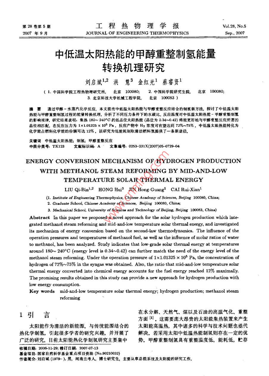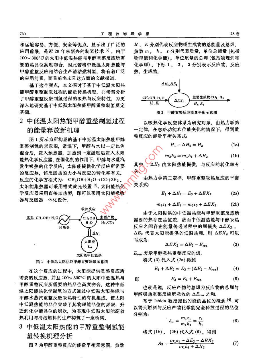 第28卷第5期工程熱物理學(xué)報(bào)Vol 28, No 52007年9月JOURNAL OF ENGINEERING THER.MOPHYSICSSep, 2007中低溫太陽(yáng)熱能的甲醇重整制氫能量轉(zhuǎn)專換機(jī)理研究劉啟斌12洪慧3金紅光1蔡睿賢1(1.中國(guó)科學(xué)院工程熱物理研究所,北京100080;2.中國(guó)科學(xué)院研究生院,北京100080;3.北京科技大學(xué)機(jī)械工程學(xué)院,北京100083)摘要通過(guò)甲醇-水蒸汽化學(xué)反應(yīng),本文提出中低溫太陽(yáng)熱能與甲重整反應(yīng)結(jié)合的制氫新方法,探討了中低溫太陽(yáng)熱能與甲醇重整制氫過(guò)程的能量轉(zhuǎn)換機(jī)理,分析了不同壓力條件下的水碳比、反應(yīng)溫度對(duì)中低溫太陽(yáng)熱能-甲醇重整制氫的影響規(guī)律.研究結(jié)果表明:集熱180~240°c的低品位太陽(yáng)熱能(品位為034~0.42)將能更好地與甲醇重整反應(yīng)所需的品位相匹配.在反應(yīng)壓力為1x×101325×105Pa,反應(yīng)產(chǎn)物中H2濃度可有望達(dá)到72%~75%,中低溫太陽(yáng)熱能轉(zhuǎn)化為化學(xué)能占燃料化學(xué)能的份額可達(dá)12%,該研究為低能耗制取清潔燃料氫提供了一條新途徑關(guān)鍵詞中低溫太陽(yáng)熱能;制氫;甲醇重整反應(yīng)中圖分類號(hào):TK123文獻(xiàn)標(biāo)識(shí)碼:A·文章編號(hào):0253-231x(207)05072904ENERGY CONVERSION MECHANISM OF HYDROGEN PRODUCTIONWITH METHANOL STEAM REFORMING BY MID-AND-LOWTEMPERATURE SOLAR THERMAL ENERGYLIU Qi-Bin,2 HONG Hui3 IN Hong-Guang CAI Rui-Xianl(1. Institute of Engineering Thermophysics, Chinese Academy of Sciences, Beijing 100080, China2. Graduate School, Chinese Academy of Sciences, Beijing 100080, Chinas3. Mechanical School, University of Sciences and Technology of Beijing, Beijing 100083, China)Abstract In thposed a novel approach for the solar hydrogen production which inte-grated methanol steam reforming and mid-and-low temperature solar thermal energy, and investigateds mechanism of energy conversion based on the second-Law thermodynamics. The influence of theoperation pressures and temperatures of methanol fuel, as well as the influence of molar ratios of waterto methanol, has been analyzed. Study indicates that low-grade solar thermal energy at temperaturesaround 180- 240 C (energy level is 0. 34-0.42)can further match the need of the energy level of themethanol steam reforming. Under the operation pressure of 1x1.01325 x 10 Pa, the concentration ofhydrogen of 72%-75% in the syngas was obtained. Also, the ratio that mid-and-low temperature solarthermal energy converted into chemical energy accounts for the fuel energy reached 12% maximallyThe promising results obtained in this study can provide a new approach for hydrogen production withlow energy consumptionKey words mid-and-low temperature solar thermal energy; hydrogen production; methanol steam引言在水分解、天然氣、煤以及石油的高溫氣化、重整方面國(guó)。這需要龐大昂貴的太陽(yáng)能集熱裝置來(lái)產(chǎn)生太陽(yáng)能作為清潔的新能源,與傳統(tǒng)能源結(jié)合的太陽(yáng)能高溫?zé)?其中諸多的科學(xué)與技術(shù)問(wèn)題也亟代熱化學(xué)制氫,引起很多學(xué)者的研究興趣,并開(kāi)展了解決。若采用太陽(yáng)中低溫?zé)崮苤茪鋭t存在一定的優(yōu)廣泛的研究,目前太陽(yáng)能熱化學(xué)制氫研究主要集中勢(shì)。甲醇重整制氫具有重整溫度低,能耗低,貯存收搞日期,200611-29;修訂日期:200707-13基金項(xiàng)目:國(guó)家自然科學(xué)基金重點(diǎn)項(xiàng)目資助(No90210032)作者簡(jiǎn)介劉啟斌(1079-),男,河南蘭考人,研究生,主要從事總能系統(tǒng)及太陽(yáng)能的研究工作工程熱物理學(xué)報(bào)和運(yùn)輸容易、方便、安全等優(yōu)點(diǎn),顯示出了廣泛的H,E分別代表反應(yīng)物或生成物的總能量及總,應(yīng)用前景,是近20年來(lái)新興的制氫技術(shù)岡.由于參數(shù)m,h,ε分別代表質(zhì)量,單位總能量(包括100~300°C的太陽(yáng)中低溫?zé)崮芘c甲醇重整反應(yīng)所需物理能和化學(xué)能),單位質(zhì)量的總(包括物理傭和要的熱品位高度吻合,因此若將中低溫太陽(yáng)熱能與化學(xué)傭).下標(biāo)1,2,3分別表示反應(yīng)物,反應(yīng)甲醇重整反應(yīng)相結(jié)合生產(chǎn)清潔燃料氫,將有著廣泛熱,生成物。的應(yīng)用前景,而目前尚未見(jiàn)這方面的文獻(xiàn)報(bào)道基于這個(gè)觀點(diǎn),本文探討了基于中低溫太陽(yáng)熱△H2△E2能甲醇重整制氫過(guò)程的能量轉(zhuǎn)換機(jī)理,并考察分析了甲醇重整反應(yīng)制氫過(guò)程的吸熱與反應(yīng)特性,為更CH,OH, H,O主要生成物CO2,H△EX深入地研究基于中低溫太陽(yáng)熱能甲醇重整制氫奠定HI, ELH3,e,基礎(chǔ)圖2甲醇重整反應(yīng)能量平衡示意圖2中低溫太陽(yáng)熱能甲醇重整制氫過(guò)程以吸熱化學(xué)反應(yīng)體系為研究對(duì)象,由熱力學(xué)第的能量釋放新機(jī)理一定律,在忽略動(dòng)能和位能變化的情況下,得到重圖1所示為所構(gòu)思的基于中低溫太陽(yáng)熱能甲醇整反應(yīng)的能量平衡關(guān)系式:重整制氫的示意圖,常溫下,甲醇與水以一定比例H1+△H2=H3混合后,進(jìn)入預(yù)熱器,加熱到一定溫度后進(jìn)入太陽(yáng)能熱化學(xué)反應(yīng)器,在催化劑的作用下,甲醇與水蒸汽h3=m1h1+△H2(1b)發(fā)生吸熱的化學(xué)反應(yīng),太陽(yáng)能提供化學(xué)反應(yīng)所需要其中,△H由太陽(yáng)熱能提供,與反應(yīng)的轉(zhuǎn)化率有的反應(yīng)熱,該反應(yīng)熱的大小與反應(yīng)的轉(z