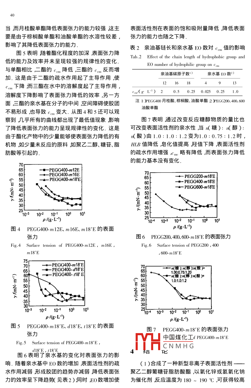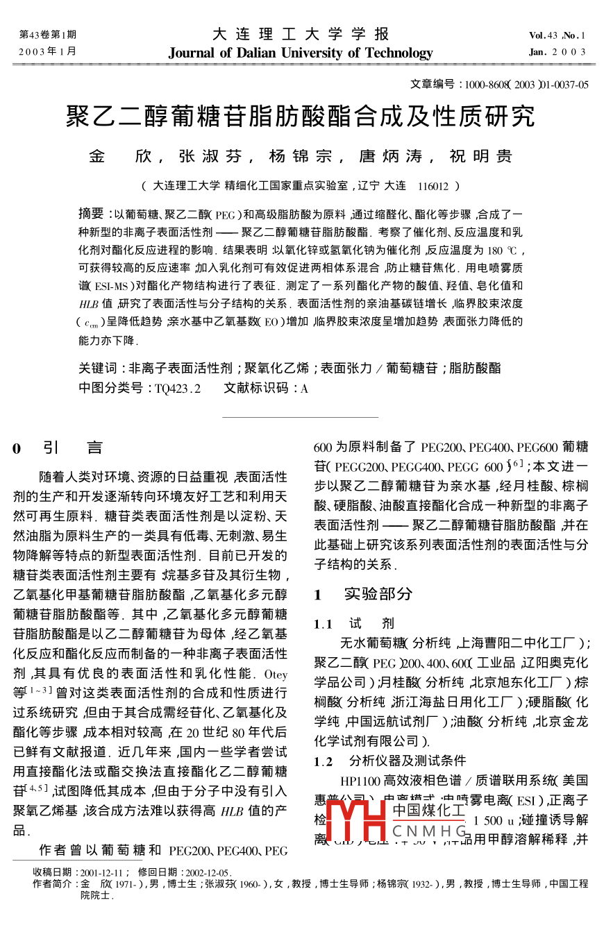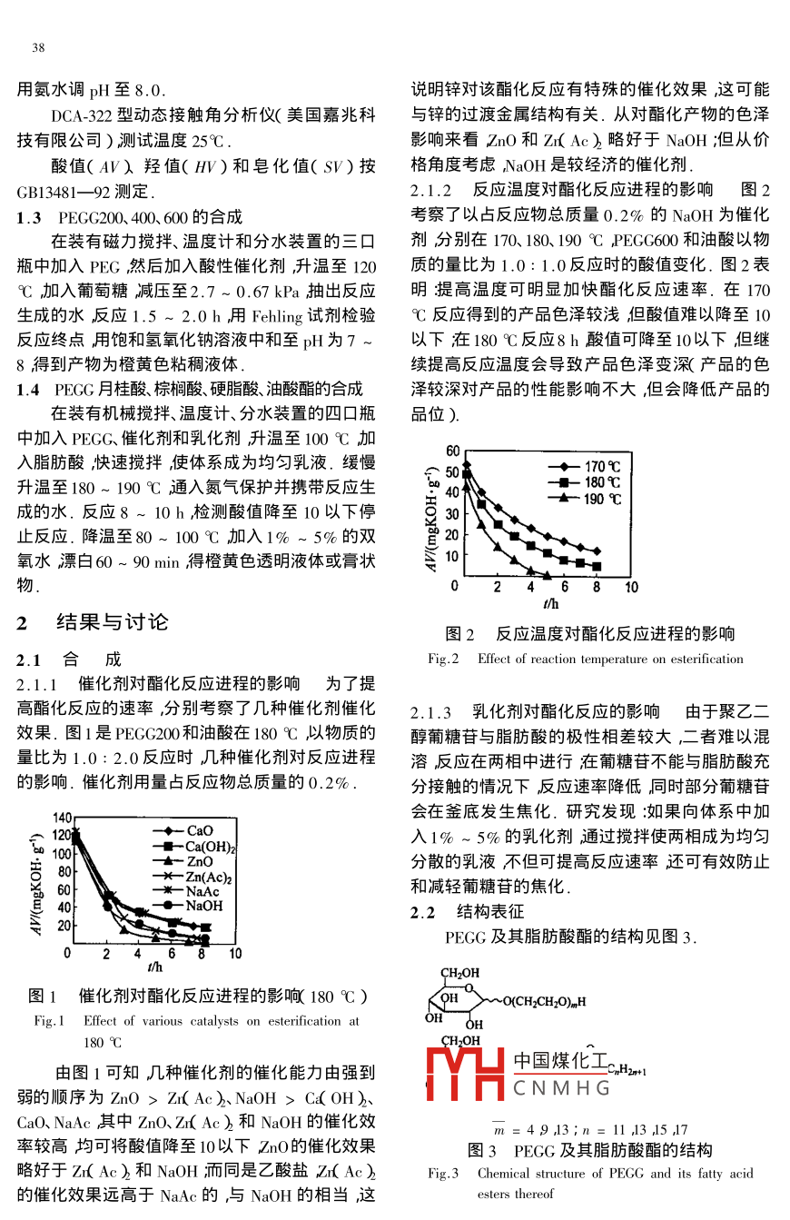 第43卷第1期大連理工大學(xué)學(xué)報Vol.43 ,No.12003年1月Journal of Dalian University of TechnologyJan. 2 003文章編號:1000-8608( 2003 )01-0037-05聚乙二醇葡糖苷脂肪酸酯合成及性質(zhì)研究金欣,張淑芬,楊錦宗,唐炳濤,祝明貴(大連理工大學(xué)精細化工國家重點實驗室,遼寧大連116012 )摘要:以葡萄糖、聚乙二醇( PEG )和高級脂肪酸為原料通過縮醛化、酯化等步驟,合成了一種新型的非離子表面活性劑一聚乙二醇葡糖苷脂肪酸酯.考察了催化劑、反應(yīng)溫度和乳化劑對酯化反應(yīng)進程的影響.結(jié)果表明:以氧化鋅或氫氧化鈉為催化劑反應(yīng)溫度為180 C ,可獲得較高的反應(yīng)速率加入乳化劑可有效促進兩相體系混合,防止糖苷焦化.用電噴霧質(zhì)譜ESI-MS )對酯化產(chǎn)物結(jié)構(gòu)進行了表征.測定了一系列酯化產(chǎn)物的酸值、羥值、皂化值和HLB值研究了表面活性與分子結(jié)構(gòu)的關(guān)系.表面活性劑的親油基碳鏈增長,臨界膠束濃度( Cam )呈降低趨勢親水基中乙氧基數(shù)( EO )增加臨界膠束濃度呈增加趨勢表面張力降低的能力亦下降.關(guān)鍵詞:非離子表面活性劑;聚氧化乙烯;表面張力/葡萄糖苷;脂肪酸酯中圖分類號:TQ423.2文獻標(biāo)識碼:A0引言600為原料制備了PEG200、 PEG400、PEG600葡糖隨著人類對環(huán)境、資源的日益重視表面活性苷( PEGG200、PEGG400、PEGG 60036] ;本文進-劑的生產(chǎn)和開發(fā)逐漸轉(zhuǎn)向環(huán)境友好工藝和利用天步以聚乙二醇葡糖苷為親水基,經(jīng)月桂酸、棕櫚然可再生原料.糖苷類表面活性劑是以淀粉、天酸、硬脂酸、油酸直接酯化合成-種新型的非離子然油脂為原料生產(chǎn)的一類具有低毒、無刺激、易生表面活性劑一聚乙二醇 葡糖苷脂肪酸酯并在物降解等特點的新型表面活性劑.目前已開發(fā)的此基礎(chǔ).上研究該系列表面活性劑的表面活性與分糖苷類表面活性劑主要有烷基多苷及其衍生物,子結(jié)構(gòu)的關(guān)系.乙氧基化甲基葡糖苷脂肪酸酯,乙氧基化多元醇1實驗部分葡糖苷脂肪酸酯等.其中,乙氧基化多元醇葡糖1.1試劑苷脂肪酸酯是以乙二醇葡糖苷為母體,經(jīng)乙氧基無水葡萄糖分析純上海曹陽二中化工廠);化反應(yīng)和酯化反應(yīng)而制備的一種非離子表面活性聚乙二醇PEG )200 400、600工業(yè)品遼陽奧克化劑其具有優(yōu)良的表面活性和乳化性能. Otey學(xué)品公司);月桂酸(分析純北京旭東化工廠)棕等1~3]曾對這類表面活性劑的合成和性質(zhì)進行櫚酸分析純浙江海鹽日用化工廠);硬脂酸(化過系統(tǒng)研究,但由于其合成需經(jīng)苷化、乙氧基化及學(xué)純中國遠航試劑廠) ;油酸(分析純北京金龍酯化等步驟成本相對較高,在20世紀80年代后化學(xué)試劑有限公司).已鮮有文獻報道.近幾年來,國內(nèi)一些學(xué)者嘗試1.2分 析儀器及測試條件用直接酯化法或酯交換法直接酯化乙二醇葡糖HP1 100高效液相色譜/質(zhì)譜聯(lián)用系統(tǒng)(美國苷45] ,試圖降低其成本,但由于分子中沒有引入中囪塔式:中噴霧電離( ESI ) ,正離子聚氧乙烯基,該合成方法難以獲得高HLB值的產(chǎn)中國煤化工1 500u ;碰撞誘導(dǎo)解品.JTHCNMH品用甲醇溶解稀釋,并作者曾以葡萄糖和PEG200、 PEG400、PEG收稿日期: 20-12-11;修回日期:2002-12-05.作者簡介:金欣( 1971-),男,博士生;張淑芬( 1960-),女,教授,博士生導(dǎo)師;楊錦宗( 1932-),男,教授,博士生導(dǎo)師,中國工程院院士.8用氨水調(diào)pH至8.0.說明鋅對該酯化反應(yīng)有特殊的催化效果,這可能DCA-322型動態(tài)接觸角分析儀(美國嘉兆科與鋅的過渡金屬結(jié)構(gòu)有關(guān).從對酯化產(chǎn)物的色澤技有限公司)測試溫度25C.影響來看ZnO和Z( Ac2略好于NaOH ;但從價酸值( AV)羥值( HV)和皂化值( Sv)按格角度考慮,NaOH是較經(jīng)濟的催化劑.CB13481- -92 測定.2.1.2 反應(yīng)溫度對酯化反應(yīng)進程的影響圖21.3 PEGG200、 400、600的合成考察了以占反應(yīng)物總質(zhì)量0.2%的NaOH為催化在裝有磁力攪拌、溫度計和分水裝置的三口劑分別在170、180、190 C PEGG600和油酸以物瓶中加入PEG然后加入酸性催化劑,升溫至120質(zhì)的量比為1.0: 1.0反應(yīng)時的酸值變化.圖2表C加入葡萄糖減壓至2.7 ~ 0.67 kPa抽出反應(yīng)明提高溫度可明顯加快酯化反應(yīng)速率.在170生成的水反應(yīng)1.5 ~ 2.0 h用Fehling試劑檢驗C反應(yīng)得到的產(chǎn)品色澤較淺但酸值難以降至10反應(yīng)終點用飽和氫氧化鈉溶液中和至pH為7~以下在180C反應(yīng)8h酸值可降至10以下但繼8得到產(chǎn)物為橙黃色粘稠液體.續(xù)提高反應(yīng)溫度會導(dǎo)致產(chǎn)品色澤變深(產(chǎn)品的色. 1.4 PEGG月桂酸、棕櫚酸、硬脂酸、油酸酯的合成澤較深對產(chǎn)品的性能影響不大,但會降低產(chǎn)品的在裝有機械攪拌、溫度計、分水裝置的四口瓶品位).中加入PEGG、催化劑和乳化劑,升溫至100 C加入脂肪酸,快速攪拌,使體系成為均勻乳液.緩慢c 50十170升溫至180~ 190 C通入氮氣保護并攜帶反應(yīng)生40a + 180C-190C成的水.反應(yīng)8 ~ 10 h ,檢測酸值降至10以下停g 30止反應(yīng).降溫至80~ 100 C加入1% ~ 5%的雙曾20氧水漂白60~90min得橙黃色透明液體或膏狀1物.246810/h結(jié)果與討論圖2反應(yīng)溫 度對酯化反應(yīng)進程的影響2.1合成Fig.2Efect of reaction temperature on esterification2.1.1催化劑對 酯化反應(yīng)進程的影響為了提高酯化反應(yīng)的速率分