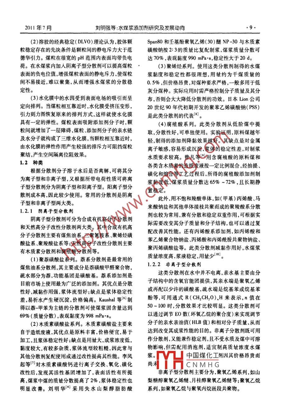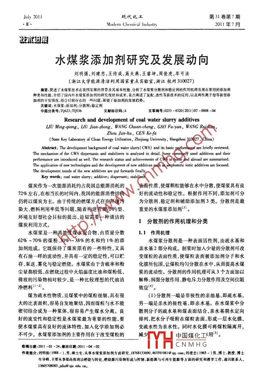 July 2011 .現(xiàn)代化工第31卷第7期●8.Mordem Chemnical Industry2011年7月水煤漿添加劑研究及發(fā)展動(dòng)向劉明強(qiáng),劉建忠,王傳成,高夫燕,王睿坤,周俊虎,岑可法(浙江大學(xué)能源清潔利用國(guó)家重點(diǎn)實(shí)驗(yàn)室,浙江杭州310027)摘要:簡(jiǎn)述了水煤漿技術(shù)在我國(guó)發(fā)展的背最及其基本性能.分析了水煤漿分散劑和穩(wěn)定劑的作用機(jī)理及現(xiàn)在常用的添加劑種類(lèi)和性能.介紹了因內(nèi)外水煤漿掭加劑的研究現(xiàn)狀和成果,取點(diǎn)闡述了復(fù)配、政性等新技術(shù)的應(yīng)用,以及兩性離子型等新型添加劑的開(kāi)發(fā)情況.結(jié)合日前任在的.些問(wèn)題 ,展望S裕加劑的發(fā)展趨勢(shì)。關(guān)鍵詞:水煤漿;添加劑;分散劑;穩(wěn)定劑中圈分類(lèi)號(hào):TQ423;:TQ536文獻(xiàn)標(biāo)識(shí)碼:A文章編號(hào):0253 - 4320(2011)07 -0008 -04Research and development of coal water slurry additivesLIU Ming-qiang, LIU Jian zhong, WANG Chuan-cheng, GAO Fu-yan, WANG Rui-kun,Zhou Jun-hu, CEN Ke-fa(State Key Laboratory of Clean Energy Utilization, Zhejiang University , Hangzhou 310027 , China)Abstract: The development background of coal water slurry( CWS) and its basic perfornance are briefly reviewed.The mechanism of the CWS dispersants and stabilizers is analyzed in detail. Some commonly used additives and theirperformance are introduced as well. The research status and achievements of CWS at home and abroad are summarized.The application of new technologies and the development of new additives such as amphoteric ionic additives are focused.The development trends of the new additives are put forwards finally.Key words: coal water slurry; additive; dispersant; stabilizer煤炭作為一次能源消耗約占我國(guó)總能源消耗的表面性質(zhì),使煤顆粒能夠在水中分散,使煤漿具有良72%左右,在相當(dāng)長(zhǎng)的時(shí)間內(nèi),我國(guó)的能源消費(fèi)結(jié)構(gòu)好的流動(dòng)性和穩(wěn)定性。根據(jù)作用不同,添加劑可分仍將以煤炭為主。由于傳統(tǒng)的燃煤方式存在環(huán)境污為分散劑穩(wěn)定劑和輔助添加劑3類(lèi)。分散劑是最染大燃料利用率低等問(wèn)題,隨著構(gòu)建資源節(jié)約型、重要的水煤漿添加劑”]。環(huán)境友好型社會(huì)目標(biāo)的提出,迫切需要一種清潔的1分散劑的作用機(jī)理和分類(lèi)煤炭利用方式。水煤漿是- -種高濃度煤水混合物,由質(zhì)量分?jǐn)?shù)1.1 作用機(jī)理62%~70%的煤粉、30%~38%的水和約1%的添水煤漿分散劑是--種表面活性劑,由疏水基和加劑組成。它既保持了煤炭原有的一些特性,又具親水基2部分構(gòu)成。制漿時(shí)加入少量的分散劑可改有石油一樣的流動(dòng)性,并具有一定的穩(wěn)定性,可以貯變煤粒的表面性質(zhì),使煤粒表面被添加劑分子和水存、泵送、霧化與穩(wěn)定燃燒。水煤漿由于含硫率和粉化膜所包圍,讓煤粒均勻分散在水中,從而提高水煤塵量都較低,在燃燒過(guò)程中火焰溫度比油和煤粉低,漿的流動(dòng)性。分散劑的作用機(jī)理可從3個(gè)方面加以排放的污染物相對(duì)較少,是一種比較理想的代油潔解釋:潤(rùn)濕分散作用、靜電斥力分散作用及空間位阻凈燃料1-2。效應(yīng)4)。煤為疏水性物質(zhì),且煤漿中的煤粒很細(xì),具有很(1)分散劑一端是非極性的親油基.即疏水基,大的比表面積,容易自發(fā)地聚結(jié),因而煤粒與水不能另一端是親水的極性基,即親水基。在水煤漿中分密切結(jié)合成為- .種漿體,很容易產(chǎn)生煤水分離。良散劑分子的疏水基和煤表面結(jié)合,親水基朝水定向好的流變性和穩(wěn)定性是水煤漿最為重要的性能,要排列,把水分子吸附在煤粒表面,形成- - 層水化膜,使水煤漿具有良好的流體特性,加人化學(xué)添加劑必變疏水性為親水性。同時(shí)水化膜可將煤粒隔離開(kāi),不可少。水煤漿添加劑的主要作用在于改變煤粒的中國(guó)煤化工作用'”。收稿日期:2011 -01 -24:修回日期:2011 -04 -02YHCNMHG作者簡(jiǎn)介:劉明強(qiáng)(1988-),男.碩士生.從事水煤漿添加劑方面研究.18768133690.463591981@ qq. com;劉建忠(1965 -)男,博士.教授.博士生導(dǎo)師.主要從事煤高效清潔燃燒與轉(zhuǎn)化、燃燒源污染物形成與控制、新能源與可再生能源等方面的研究和教學(xué)工作.通訊聯(lián)系人,13605708085 jdiu@ zju. edu. cn。2011年7月.劉明強(qiáng)等:水煤漿添加劑研究及發(fā)展動(dòng)向(2)溶膠的經(jīng)典穩(wěn)定( DLVO)理論認(rèn)為,膠體顆Span80和壬基酚聚氧乙烯(30)醚NP -30與木質(zhì)素粒穩(wěn)定存在的先決條件是顆粒間的靜電斥力大于范磺酸鈉按2:3的質(zhì)量比復(fù)配制漿,煤漿質(zhì)量分?jǐn)?shù)可德華引力。煤粒在很寬的pH范圍內(nèi)表面均帶負(fù)電達(dá)70% ,表觀黏度990 mPa.s,穩(wěn)定性大于20 d。荷。在水煤漿內(nèi)加人陰離子型分散劑可以提高煤?!?3)聚烯烴系列。使用這類(lèi)分散劑制得的水煤表面的負(fù)電位值,增強(qiáng)煤粒表面的靜電斥力,使煤粒漿黏度和穩(wěn)定性都很理想,用量約為干煤質(zhì)量的間不易接近,難以聚集,從而增強(qiáng)水煤漿的分散穩(wěn)0.5% ,但價(jià)格昂貴,對(duì)煤種要求嚴(yán)格,-般多用于低定性?;曳置悍N。實(shí)際應(yīng)用時(shí)需嚴(yán)格控制分子質(zhì)量及其分(3)水化膜中的水因受到表面電場(chǎng)的吸引而呈布,否則會(huì)大大降低分散劑的功效。日本Lio