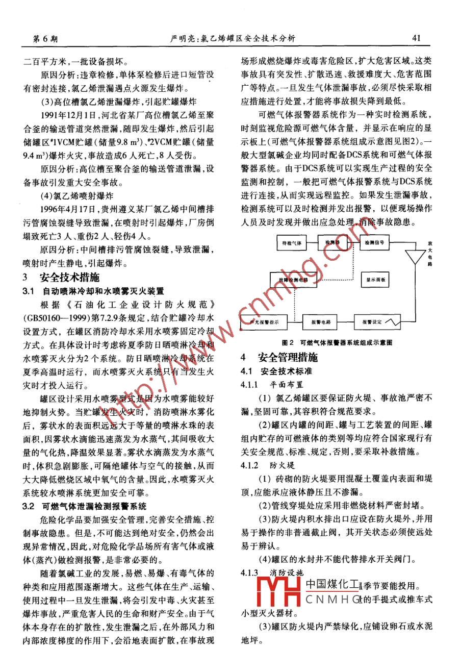 第6期中國氯堿No.6102006年6月China Chlor- AlkaliJun. ,2006氯乙烯罐區(qū)安全技術(shù)分析嚴(yán)明亮(江蘇?;瘓F(tuán)江東化工股份有限公司,江蘇常州213004)摘要:分析了聚氯乙烯生產(chǎn)企業(yè)氯乙烯貯罐區(qū)的危險(xiǎn)性,提出了通常采用的消防、可燃?xì)怏w泄漏報(bào)警系統(tǒng)、安全管理措施以及構(gòu)成重大危險(xiǎn)源的應(yīng)急管理等安全技術(shù)措施。關(guān)鍵詞:氯乙烯;貯罐;泄漏危害;安全技術(shù)中圖分類號(hào):TQ086.2文獻(xiàn)標(biāo)識(shí)碼:B文章編號(hào):1009 -1785(2006)06 -0040- -04Analysis on safe technology of chlorethylene storage areaYAN Ming liang(Jiangdong Chemical Co., Ltd, of Jiangsu Changhua Group, Changzhou 213004, China)Abstract: Dangerous nature of chlorethylene storage area in PVC production enterprises was analysed.Several usual ways of safety technology were put forward, including fire prevention and control, warmingsystem of leakage of combustible gas, safe management and emergency measures for important dangeroussource.Key words: chlorethylene; storage; leakage danger; safe technology事故發(fā)生階覆遣國釋放階度1氯乙烯罐區(qū)的危險(xiǎn)性(VCE)產(chǎn)生拋射碎片隨著我國氣堿企業(yè)向國際化、集約化發(fā)展,為保(火災(zāi))罐體證正常的生產(chǎn)需要,罐區(qū)的罐組總?cè)萘?、單罐容量越局部來越?且貯存的物料都是易燃易爆、有毒有害的,或奕「氧乙烯健康、環(huán)境危害-旦發(fā)生火災(zāi)爆炸事故,就會(huì)釀成災(zāi)難性后果。本文發(fā)性結(jié)合某氯乙烯罐區(qū)的實(shí)際情況,對罐區(qū)應(yīng)采取的安碳撞全部友裂熱輻射.沖擊發(fā)全技術(shù)措施進(jìn)行了初步的分析探討。氯乙烯是生產(chǎn)聚氯乙烯的主要原料,由于它具圉1氯乙烯泄漏事故鏈有易燃、易爆等危險(xiǎn)性,在生產(chǎn)、運(yùn)輸和使用中極易位,運(yùn)輸車駕駛員擅自啟動(dòng)氣相壓縮機(jī),由于2"罐超發(fā)生火災(zāi)和爆炸事故。氯乙烯貯罐周圍- -旦發(fā)生火裝滿液,VCM液體沿氣相管進(jìn)人壓縮機(jī),導(dǎo)致缸蓋災(zāi),在火災(zāi)環(huán)境的影響下,貯罐內(nèi)氯乙烯的溫度和壓爆裂擊破,大量VCM泄漏,經(jīng)在場的接受過安全培力會(huì)迅速升高,同時(shí)貯罐的強(qiáng)度會(huì)迅速下降,在一定訓(xùn)的人員及時(shí)關(guān)閉壓縮機(jī),避免了事故的惡化。條件下貯罐即會(huì)發(fā)生破裂和爆炸,進(jìn)而引起蒸氣云原因分析:違章接卸作業(yè),氯乙烯貯罐超裝,液爆炸(VCE),引起爆炸沖擊波、容器碎片拋出及巨大體沿氣相管進(jìn)人壓縮機(jī),導(dǎo)致壓縮機(jī)缸蓋爆裂,造成的火球熱輻射,對周圍的人員、建筑和設(shè)備造成更大泄漏。的破壞。國內(nèi)外曾多次發(fā)生氯乙烯火災(zāi)并引起連鎖中國煤化工爆炸的事故,造成慘重的損失。氯乙烯貯罐事故及其貯罐區(qū)氯乙烯.單體泵引起的連鎖反應(yīng)的過程如圖1所示。MHCNMH G在開車后約4 500kg檢修口近t啞昌儀月四巧比便,2事故案例氯乙烯泄漏,氣體擴(kuò)散在100~200 m范圍內(nèi),遇點(diǎn)火源(1)氯乙烯貯罐泄漏發(fā)生爆炸,致使4名操作工和8名搶救人員中死亡2002年9月30日,某樹脂廠接卸站操作工離開崗5人、重傷4人。爆炸附近廠房倒塌損毀面積約一千第6期嚴(yán)明亮:氯乙烯罐區(qū)安全技術(shù)分析41二百平方米,- -批設(shè)備損壞。場形成燃燒爆炸或毒害危險(xiǎn)區(qū),擴(kuò)大危害區(qū)域。這類原因分析:違章檢修,單體泵檢修后進(jìn)口短管沒事故具有突發(fā)性、擴(kuò)散迅速.救援難度大危害范圍有密封連接,氯乙烯泄漏遇點(diǎn)火源發(fā)生爆炸。廣等特點(diǎn)。一旦發(fā)生氣體泄漏事故,必須盡快采取相(3)高位槽氯乙烯泄漏爆炸,引起貯罐爆炸應(yīng)措施進(jìn)行處置,才能將事故損失降到最低。1991年12月1日,河北省某廠高位槽氯乙烯至聚可燃?xì)怏w報(bào)警器系統(tǒng)作為一種實(shí)時(shí)檢測系統(tǒng),合釜的輸送管道突然泄漏,隨即發(fā)生爆炸,然后引起.時(shí)刻監(jiān)視危險(xiǎn)源可燃?xì)怏w含量,并顯示在響應(yīng)的顯儲(chǔ)罐區(qū)"1VCM貯罐(儲(chǔ)量9.8 m')、*2VCM貯罐(儲(chǔ)量示板上(可燃?xì)怏w報(bào)警器系統(tǒng)組成示意圖見圖2)。一9.4 m)爆炸火災(zāi),事故造成6人死亡,8人受傷。般大型氣堿企業(yè)均同時(shí)配備DCS系統(tǒng)和可燃?xì)怏w報(bào)原因分析:高位槽至聚合釜的輸送管道泄漏,設(shè)警器系統(tǒng)。由于DCS系統(tǒng)可以實(shí)現(xiàn)生產(chǎn)過程的安全備事故引發(fā)重大安全事故。監(jiān)測和控制,一般把可燃?xì)怏w報(bào)警系統(tǒng)與DCS系統(tǒng)(4)氯乙烯噴射爆炸進(jìn)行連接,從而實(shí)現(xiàn)遠(yuǎn)程監(jiān)控。如果發(fā)生泄漏事故,1996年4月17日,貴州遵義某廠氯乙烯中間槽排檢測系統(tǒng)可以及時(shí)檢測并發(fā)出報(bào)警,以便現(xiàn)場操作污管腐蝕裂縫導(dǎo)致泄漏,在噴射時(shí)引起爆炸,廠房倒人員及時(shí)發(fā)現(xiàn)并做出應(yīng)急處理,消除事故隱患。塌致死亡3人、重傷2人、輕傷4人。待檢氣體檢測器檢測信號(hào)原因分析:中間槽排污管腐蝕裂縫,導(dǎo)致泄漏,噴射時(shí)產(chǎn)生靜電,引起爆炸。路3安全技術(shù)措施故障檢測電路顯示面板3.1自 動(dòng)噴淋冷卻和水噴霧滅火裝置根據(jù)《石油化工企業(yè)設(shè)計(jì)防火規(guī)范》(GB50160-- 1